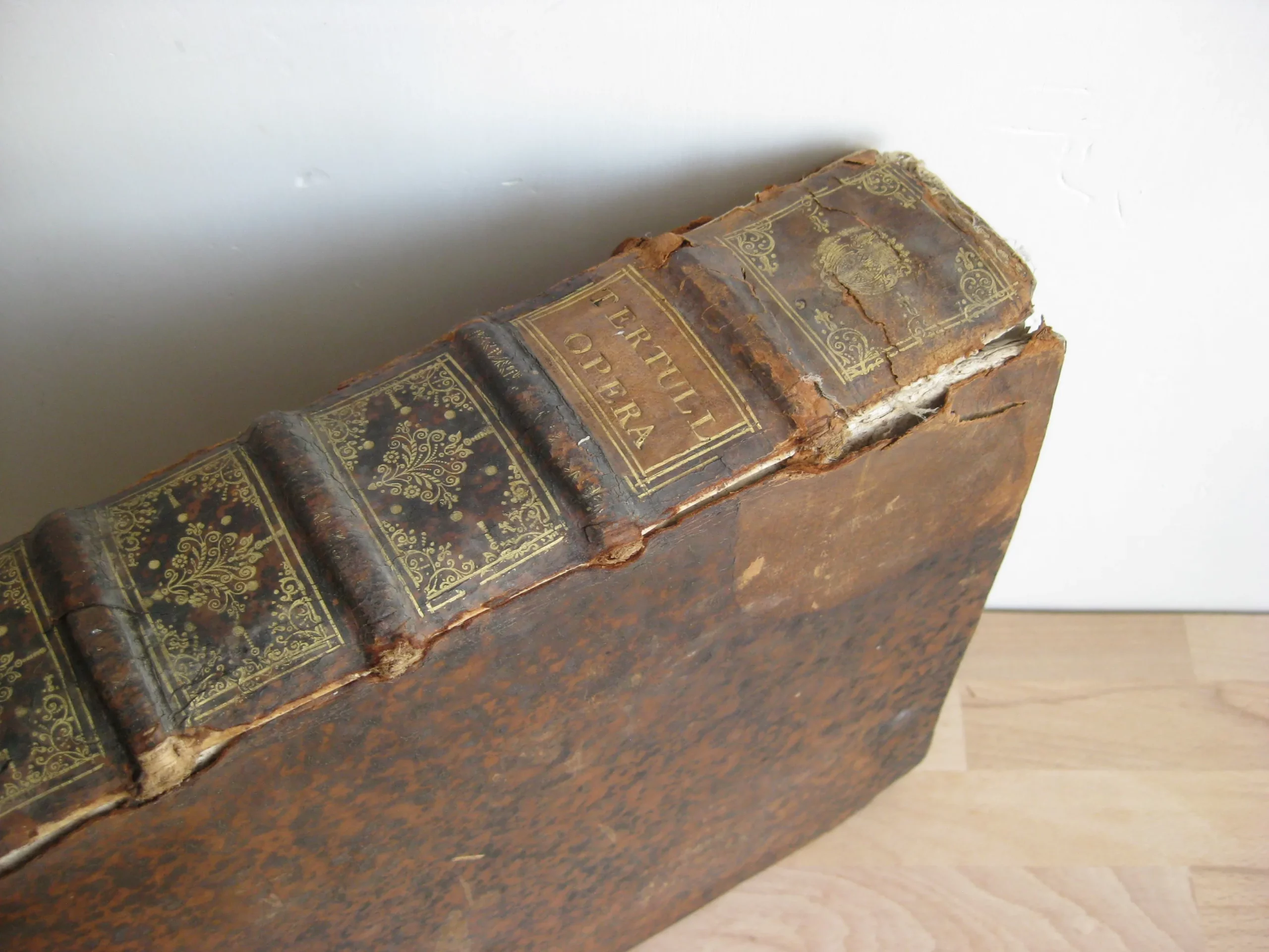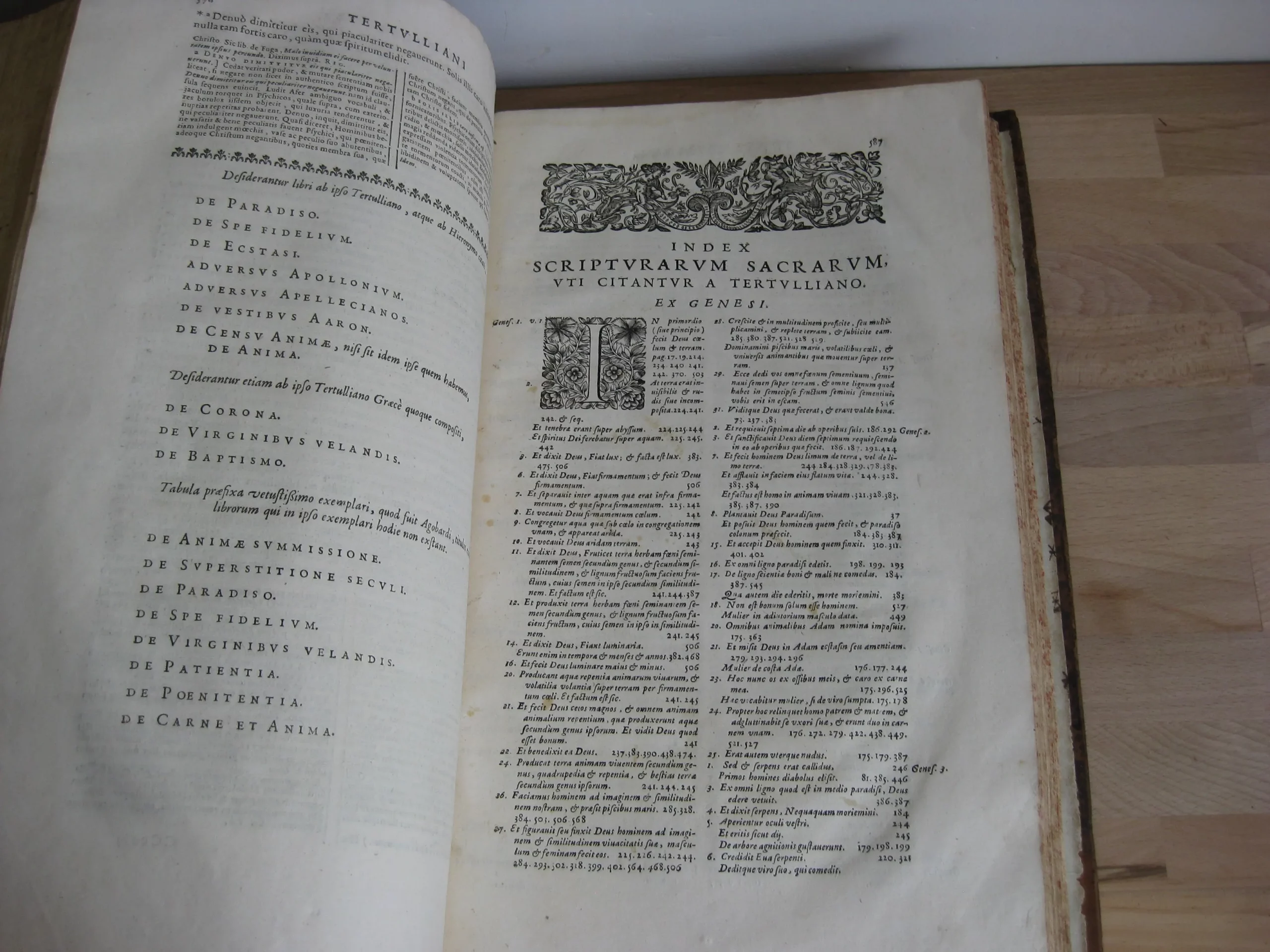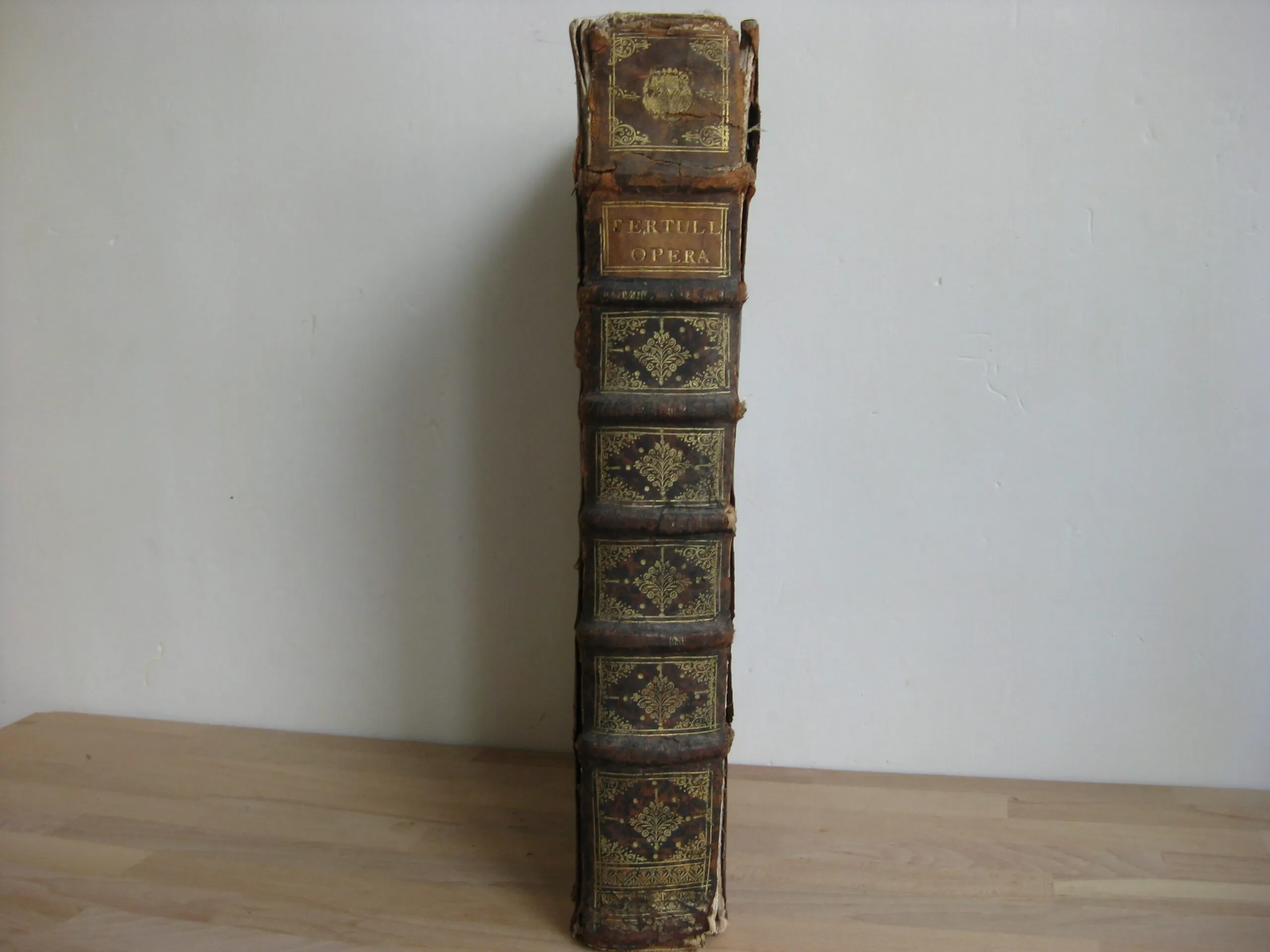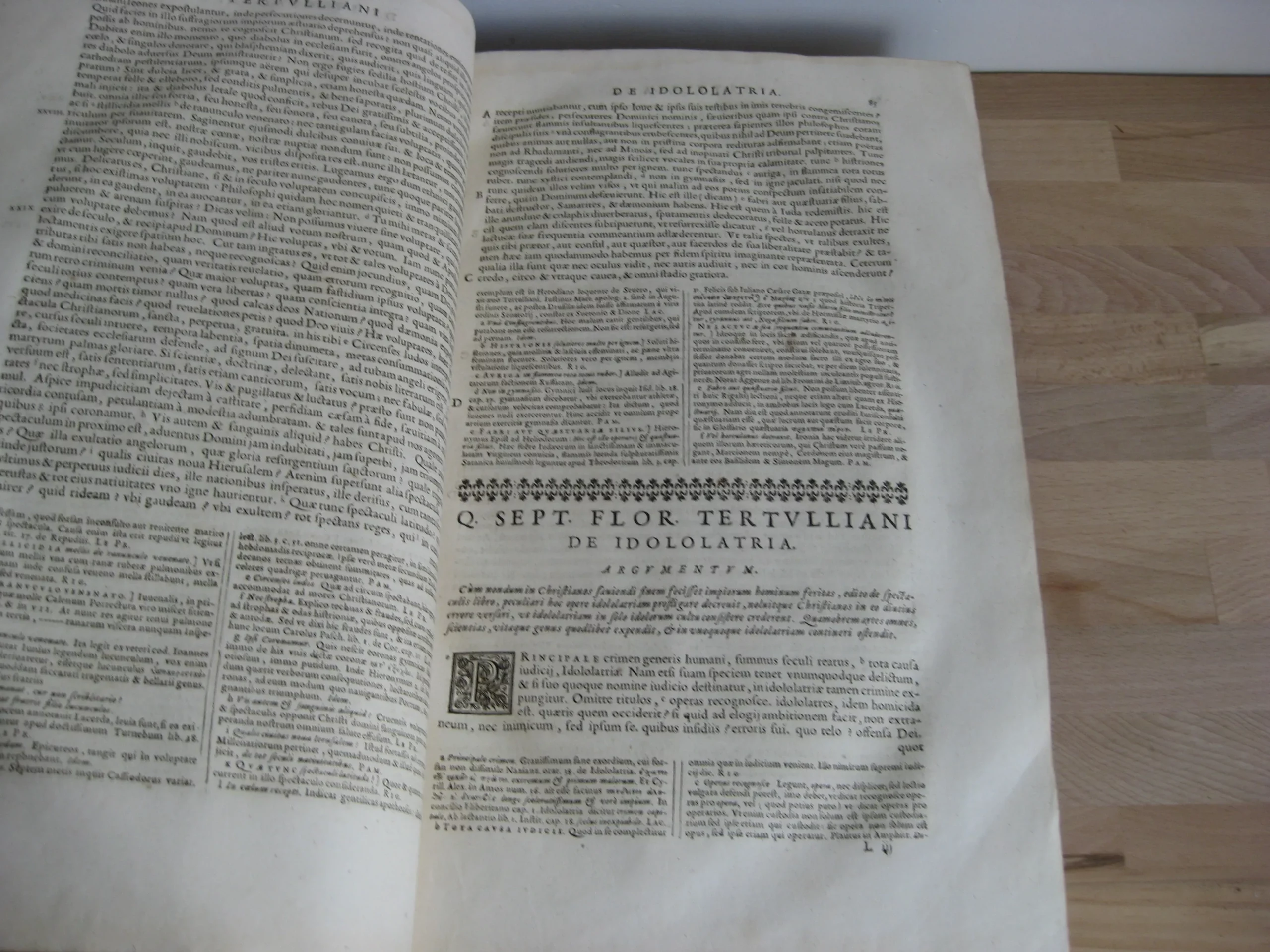 Comprend : Adresse à Petro Segverio, avec une bel entête gravé, ij-iiij ; Adresse au lecteur, avec entête et lettrine, 2p. ; Dissertatio in qua tertulliani vita opiniones, et errores expenduntur, entête, lettrine, 2p. ; De tertulliano et eius scriptis deque variis eorum editionibus nicolai rigaltii iudicium, entête , lettrine, cul-de-lampe, 3p. ; Veterum scriptorum testimonia quaedam… 3p. ; Vita q. septimii florentis tertulliani carthaginiensis presbyteri, auctore Jacobo Pamelio, 17p. Puis Paradoxa tertulliani cum antidoto iacobi pamielii, 14p. ; Proverbiales formulae toto opere e libris tertuli excerptae, 20p. Puis les œuvres : entête, petites lettrines, texte à pleine page, commentaires en pied sur deux colonnes, 576p. Suivi de l’Index (entête, lettrine), pp. 577-628 ; suivi de Incerti auctoris adversus marcionem libri quinque, 630-644, cul-de-lampe. Suivi de : Index memorabilium, pp. 645-665, texte sur trois colonnes, cul-de-lampe ; Index scriptorum, index glossarium, pp. 668-706, texte sur 3 colonnes. Suivi de : Novatiani tractatus de trinitate, et cibis iudaicis com notis, ut in Pamielij, pp. 705-736. texte à pleine page, commentaires en pied sur deux colonnes , cul-de-lampe, privilège.
