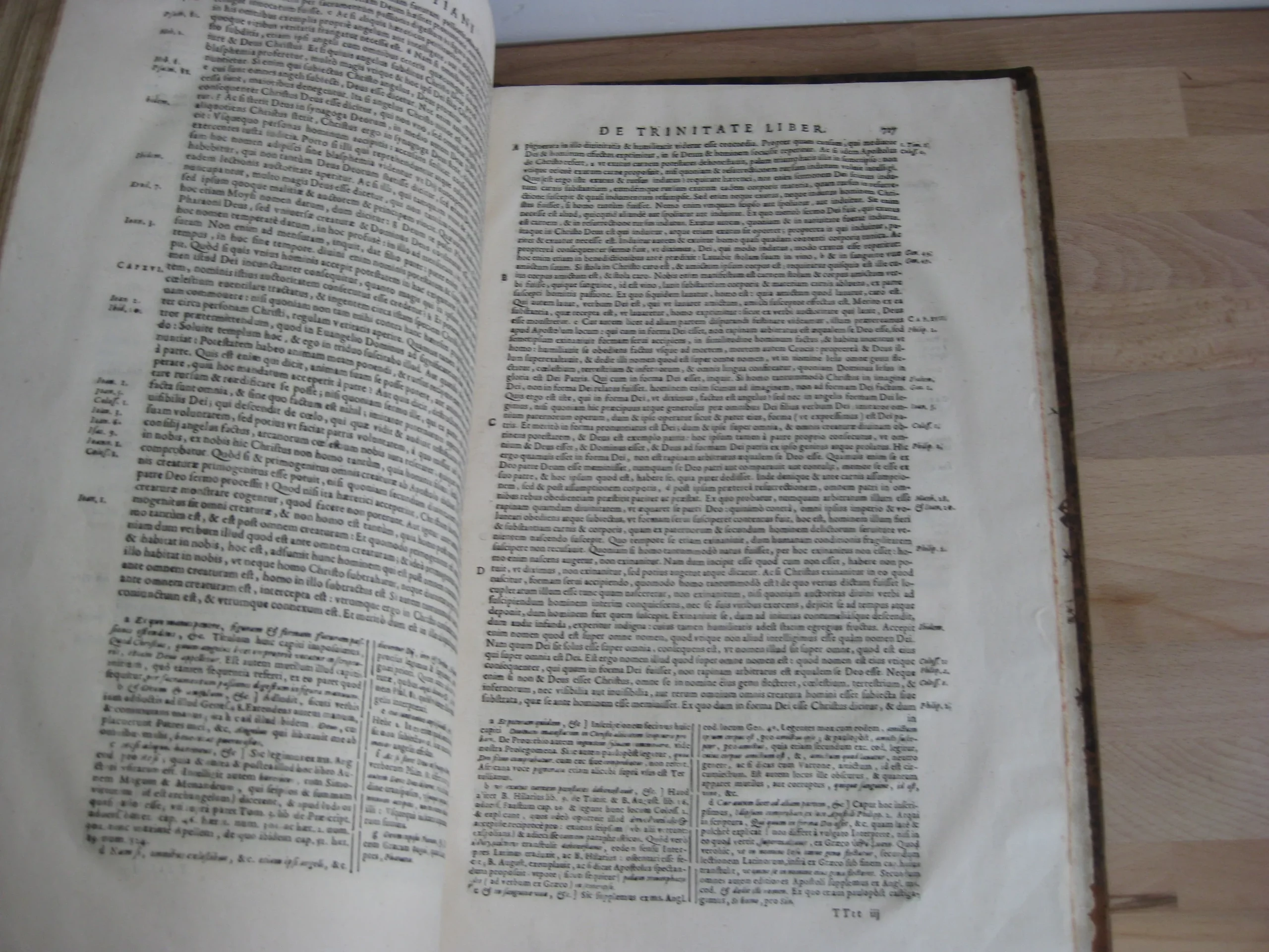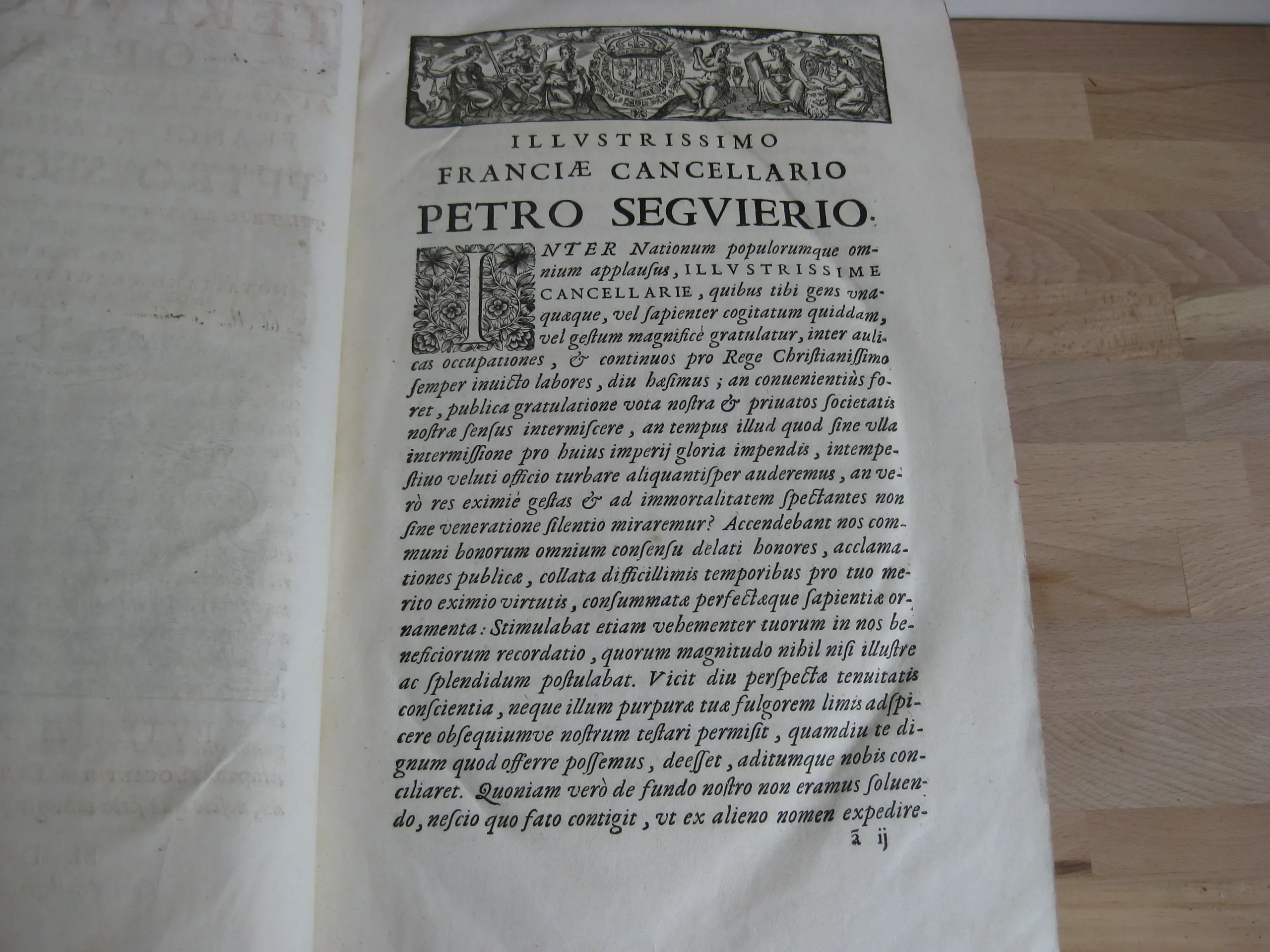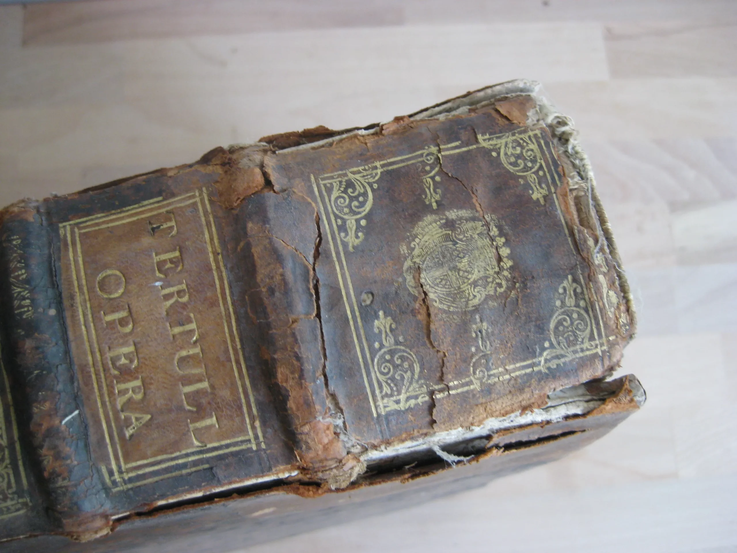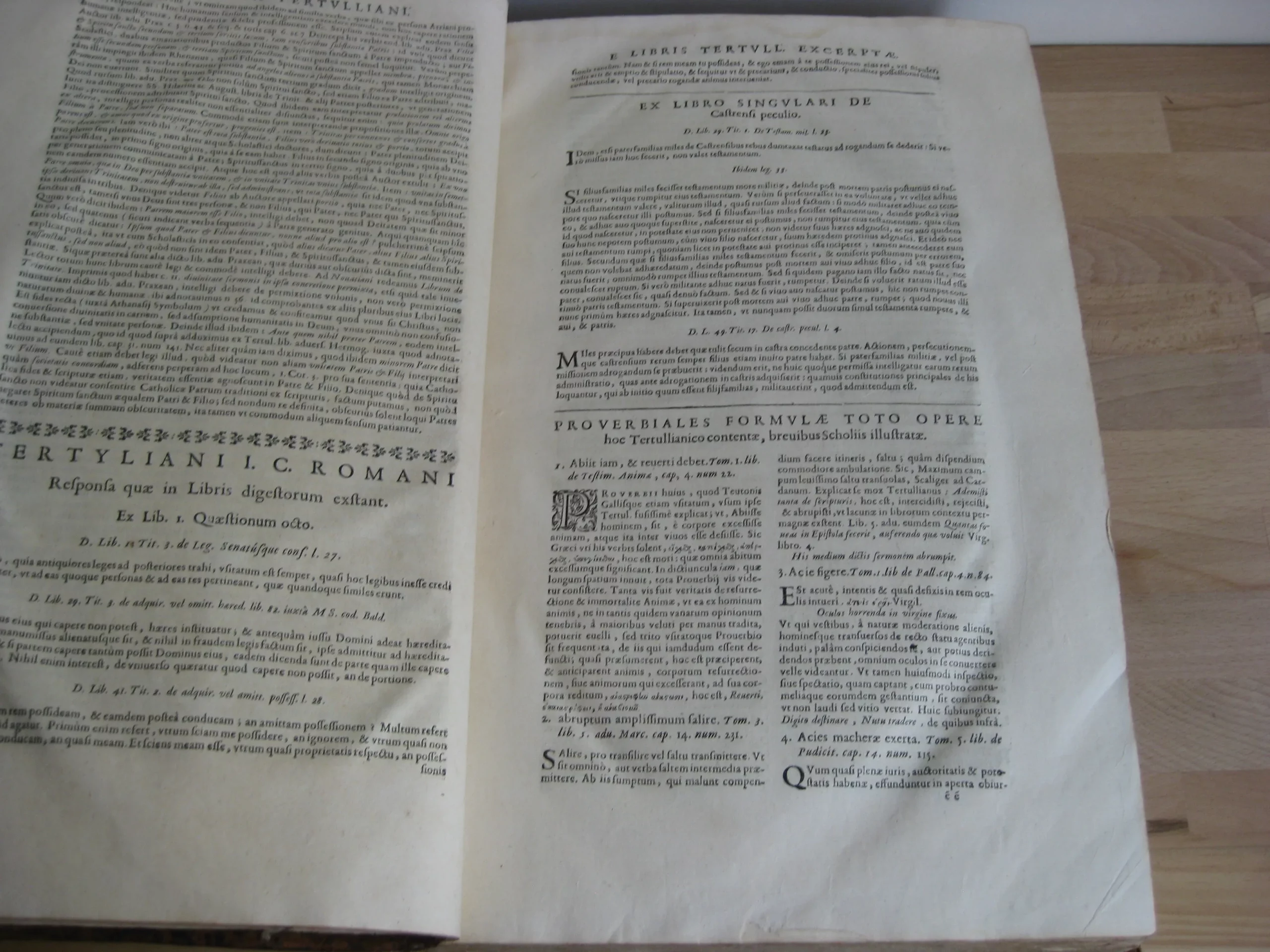Comprend : Adresse à Petro Segverio, avec une bel entête gravé, ij-iiij ; Adresse au lecteur, avec entête et lettrine, 2p. ; Dissertatio in qua tertulliani vita opiniones, et errores expenduntur, entête, lettrine, 2p. ; De tertulliano et eius scriptis deque variis eorum editionibus nicolai rigaltii iudicium, entête , lettrine, cul-de-lampe, 3p. ; Veterum scriptorum testimonia quaedam… 3p. ; Vita q. septimii florentis tertulliani carthaginiensis presbyteri, auctore Jacobo Pamelio, 17p. Puis Paradoxa tertulliani cum antidoto iacobi pamielii, 14p. ; Proverbiales formulae toto opere e libris tertuli excerptae, 20p. Puis les œuvres : entête, petites lettrines, texte à pleine page, commentaires en pied sur deux colonnes, 576p. Suivi de l’Index (entête, lettrine), pp. 577-628 ; suivi de Incerti auctoris adversus marcionem libri quinque, 630-644, cul-de-lampe. Suivi de : Index memorabilium, pp. 645-665, texte sur trois colonnes, cul-de-lampe ; Index scriptorum, index glossarium, pp. 668-706, texte sur 3 colonnes. Suivi de : Novatiani tractatus de trinitate, et cibis iudaicis com notis, ut in Pamielij, pp. 705-736. texte à pleine page, commentaires en pied sur deux colonnes , cul-de-lampe, privilège.