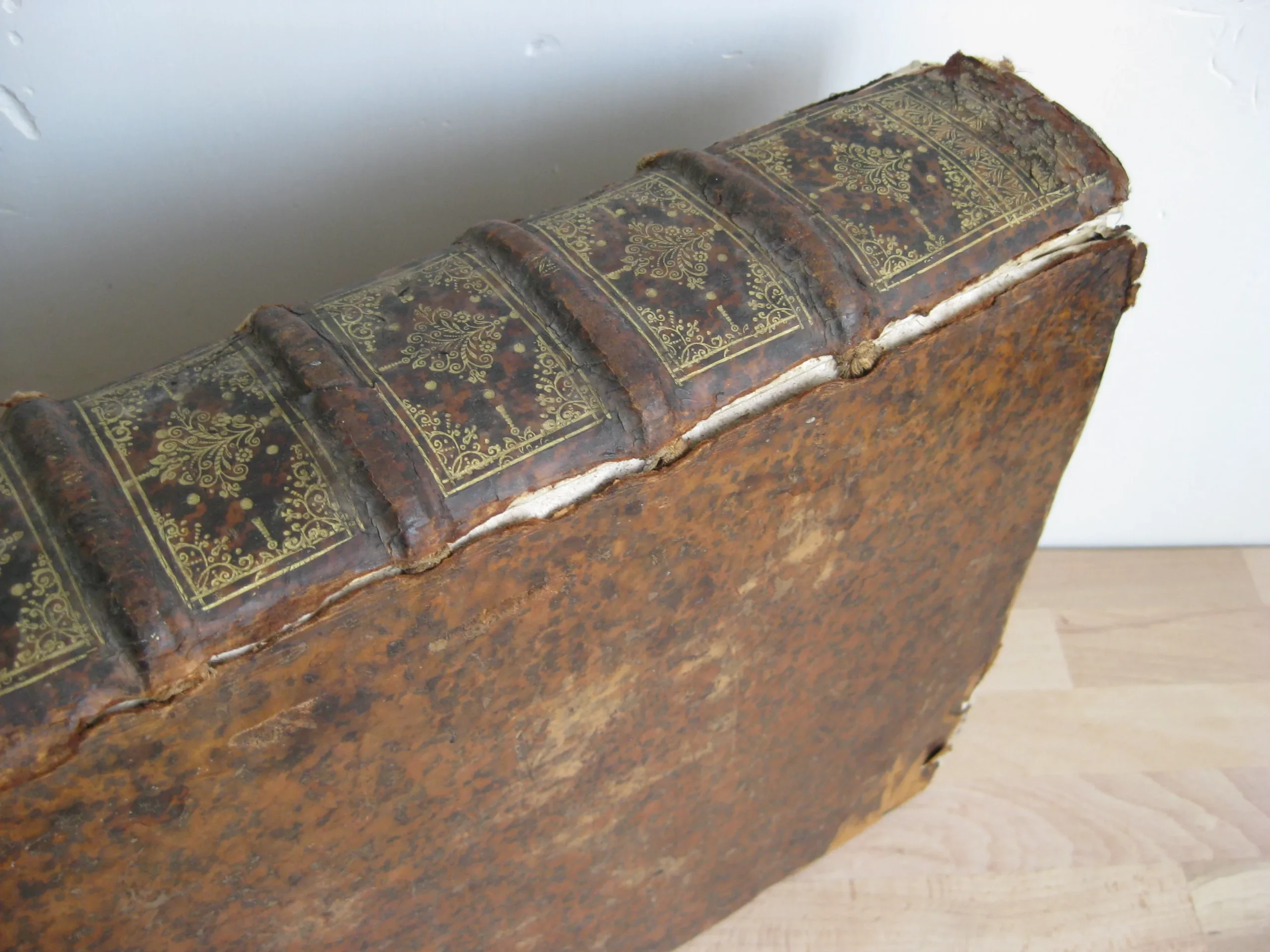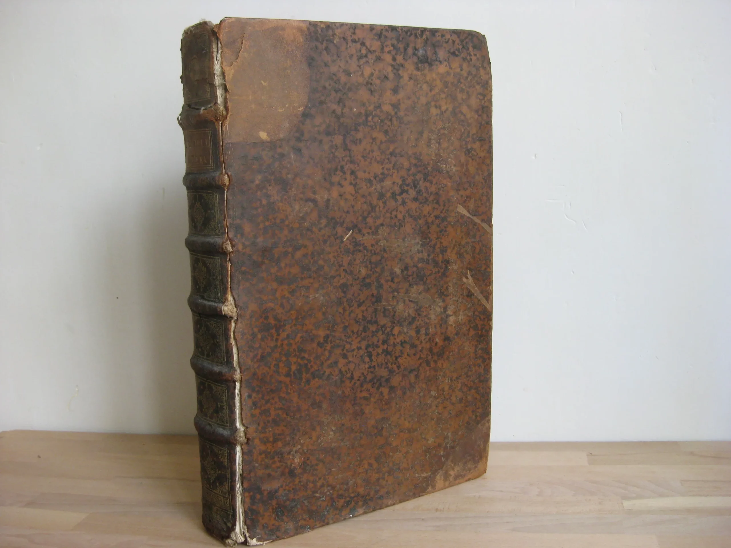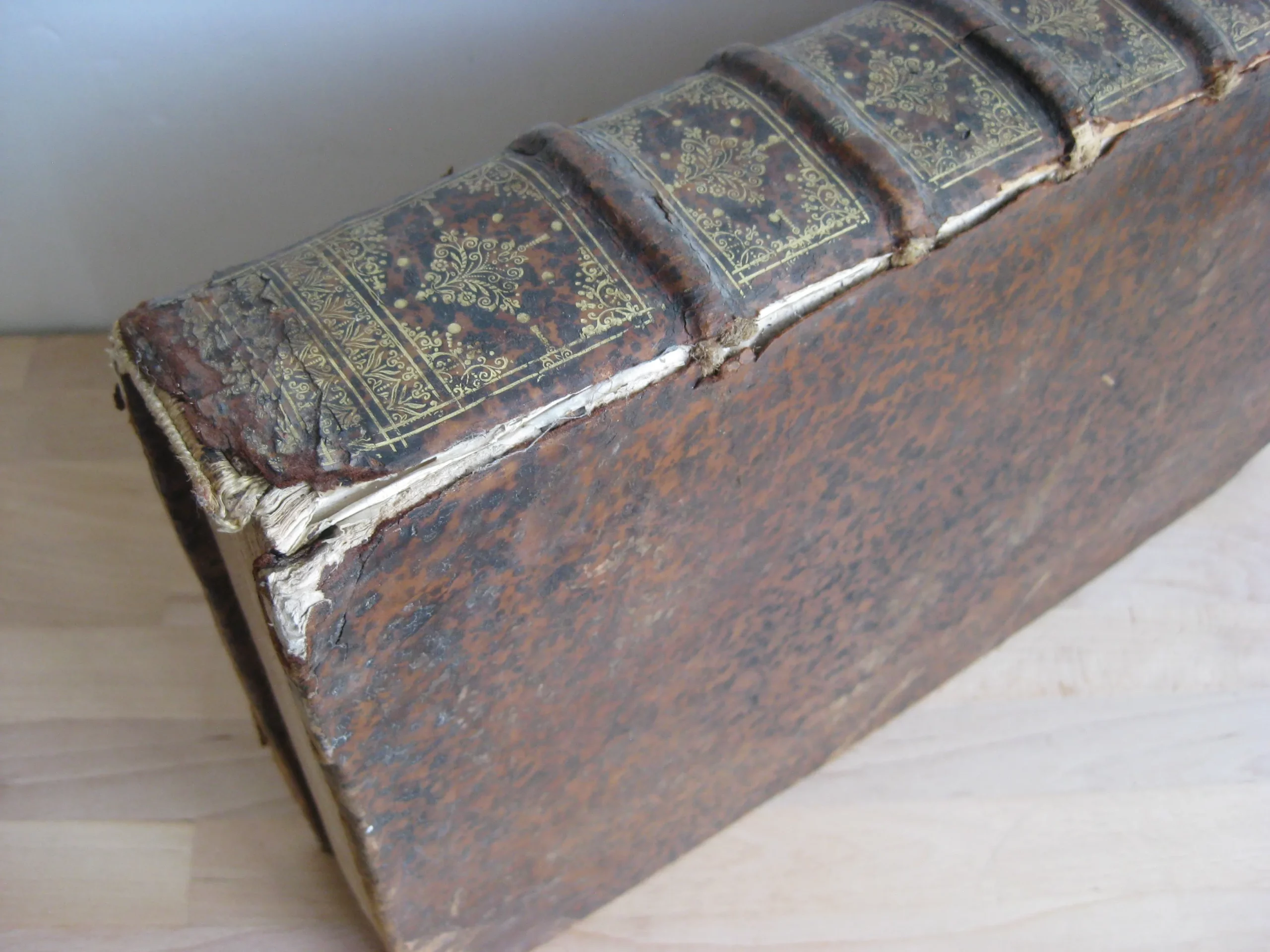Intérieur propre, rares mouillures, une page avec un manque en marge de pied. Reliure : coins et champs très frottés, 3 coins émoussés, champs de pied avec manques de cuir. Plats très frottés avec griffes, épidermures, et manque en pied de plat inférieur ; restauration modeste en têt des plats, près du dos et en pied de plat inférieur. Mors frottés, fendus tout du long. Dos frotté avec manque en pied, coiffe manquante, queue arasée, premier caisson avec fente au premier nerfs, frottements, épidermures