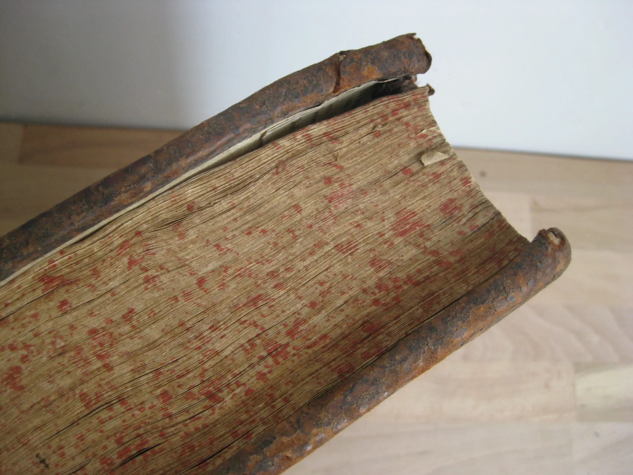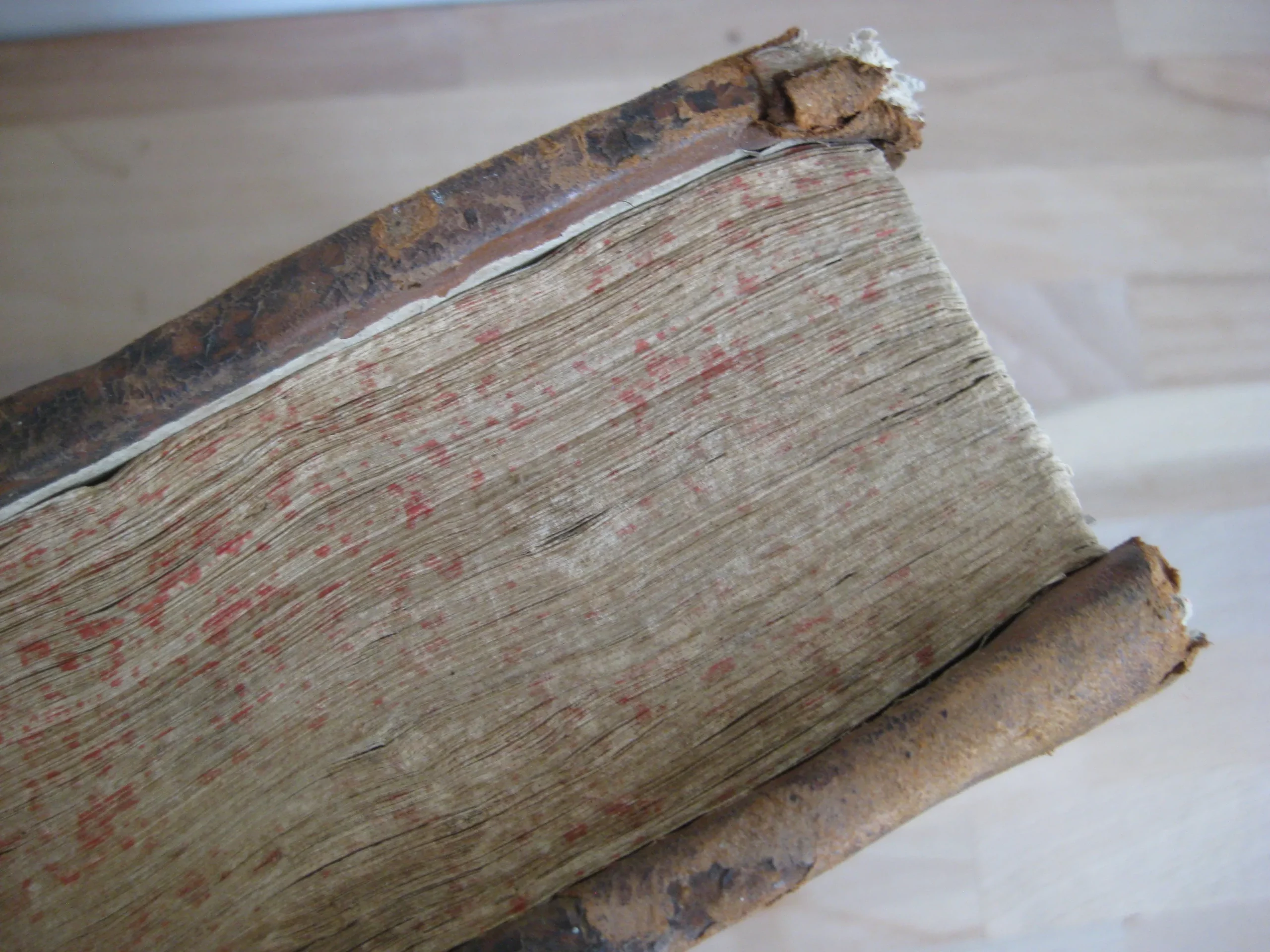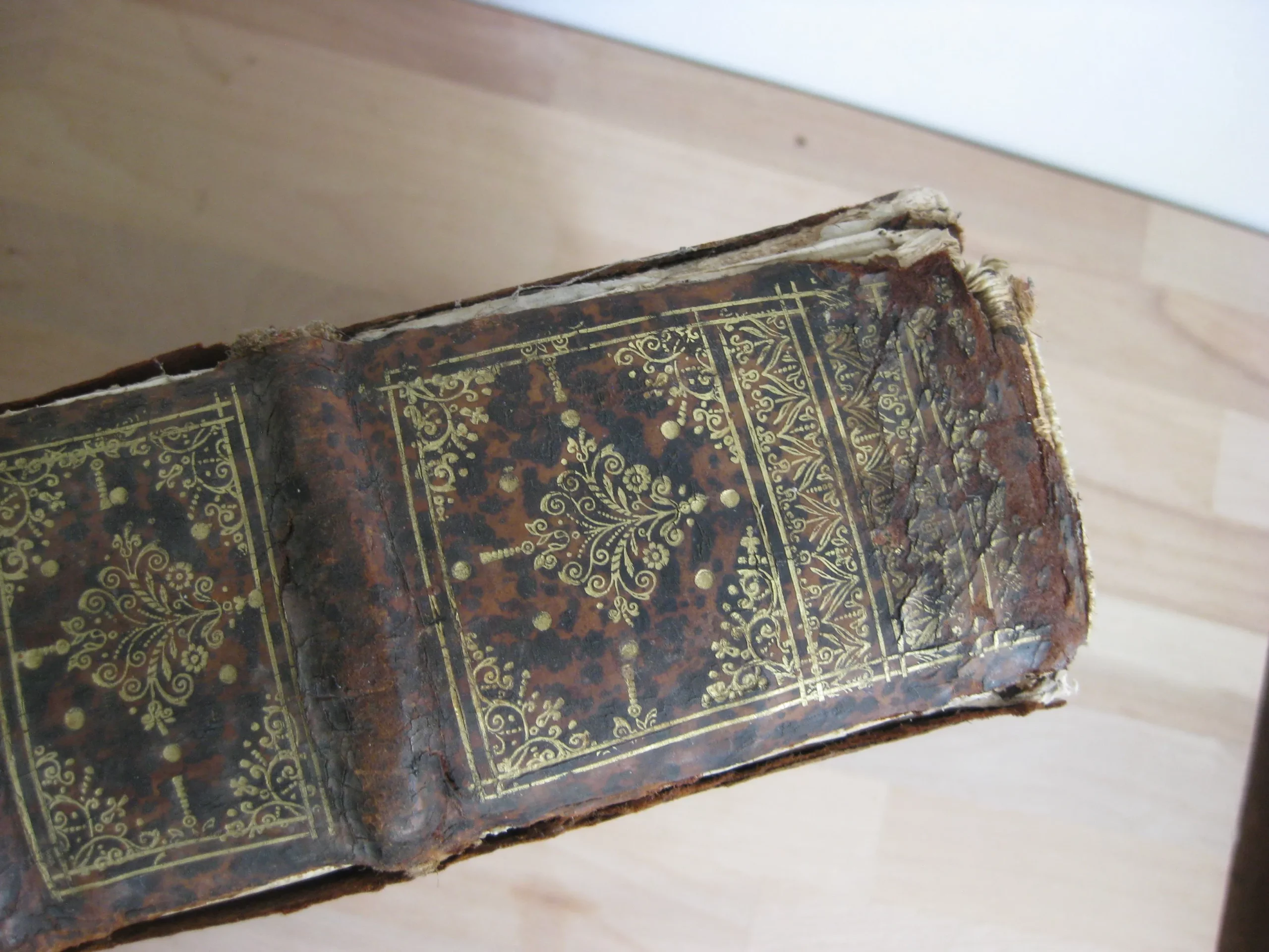 Intérieur propre, rares mouillures, une page avec un manque en marge de pied. Reliure : coins et champs très frottés, 3 coins émoussés, champs de pied avec manques de cuir. Plats très frottés avec griffes, épidermures, et manque en pied de plat inférieur ; restauration modeste en têt des plats, près du dos et en pied de plat inférieur. Mors frottés, fendus tout du long. Dos frotté avec manque en pied, coiffe manquante, queue arasée, premier caisson avec fente au premier nerfs, frottements, épidermures