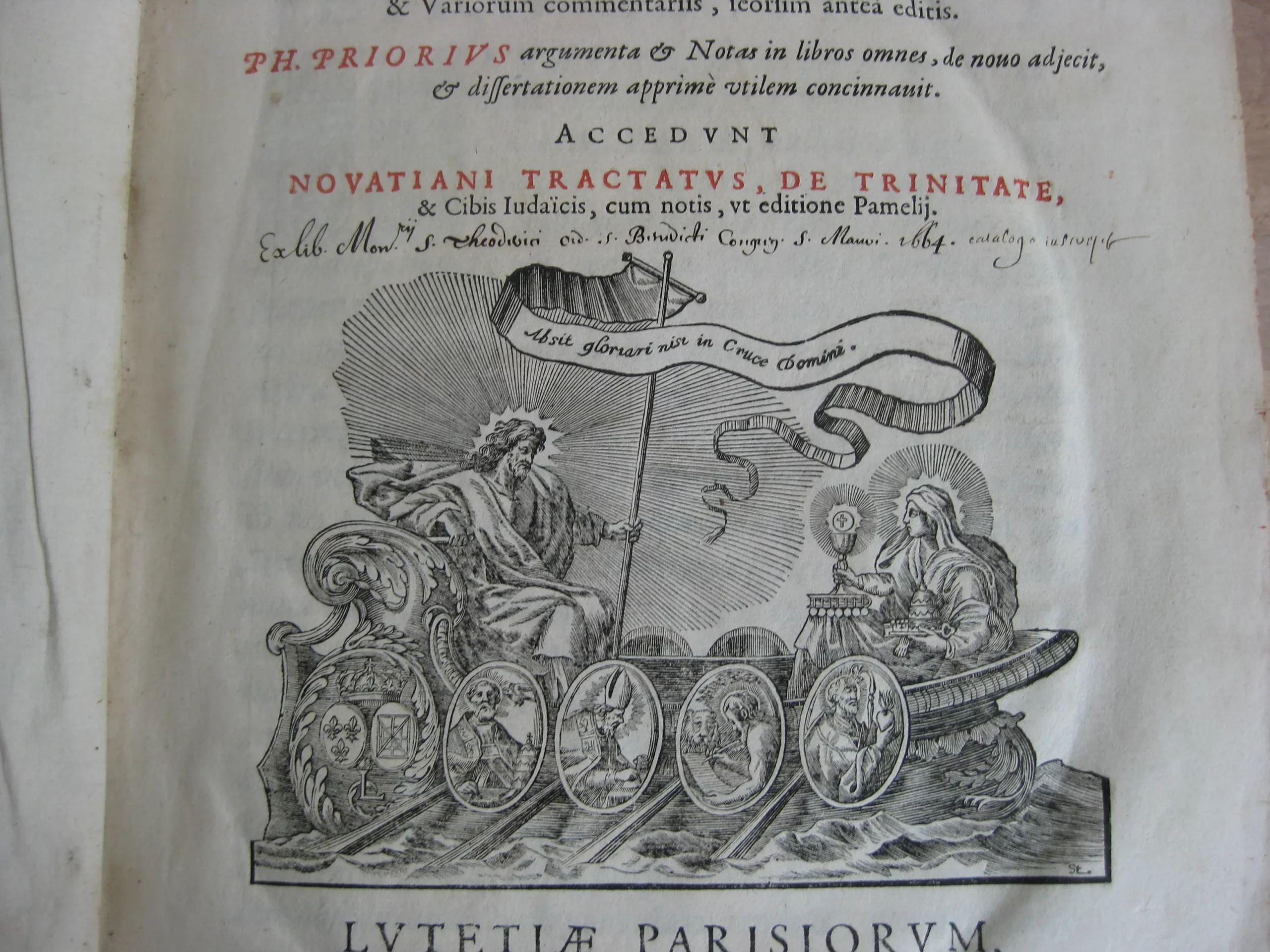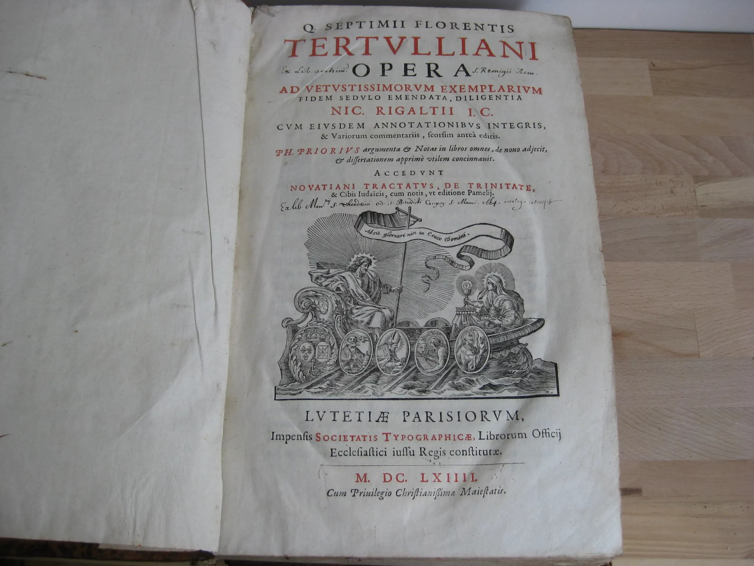 Q. Septimii Florentis Tertulliani Opera ad vetustissimorum exemplarium fidem sedulo emendata, diligentia Nic. Rigaltii I.C. cum eiusdem annotationibus integris, & variorum commentariis, seorsim anteae editis. Ph. Priorius argumenta & notas in libros omnes, de nouo adjecit, & dissertationem apprime utilem concinnauit. Accedunt Novatiani tractatus, De trinitate, & Cibis iudaicis, cum notis, vt editione Pamelij