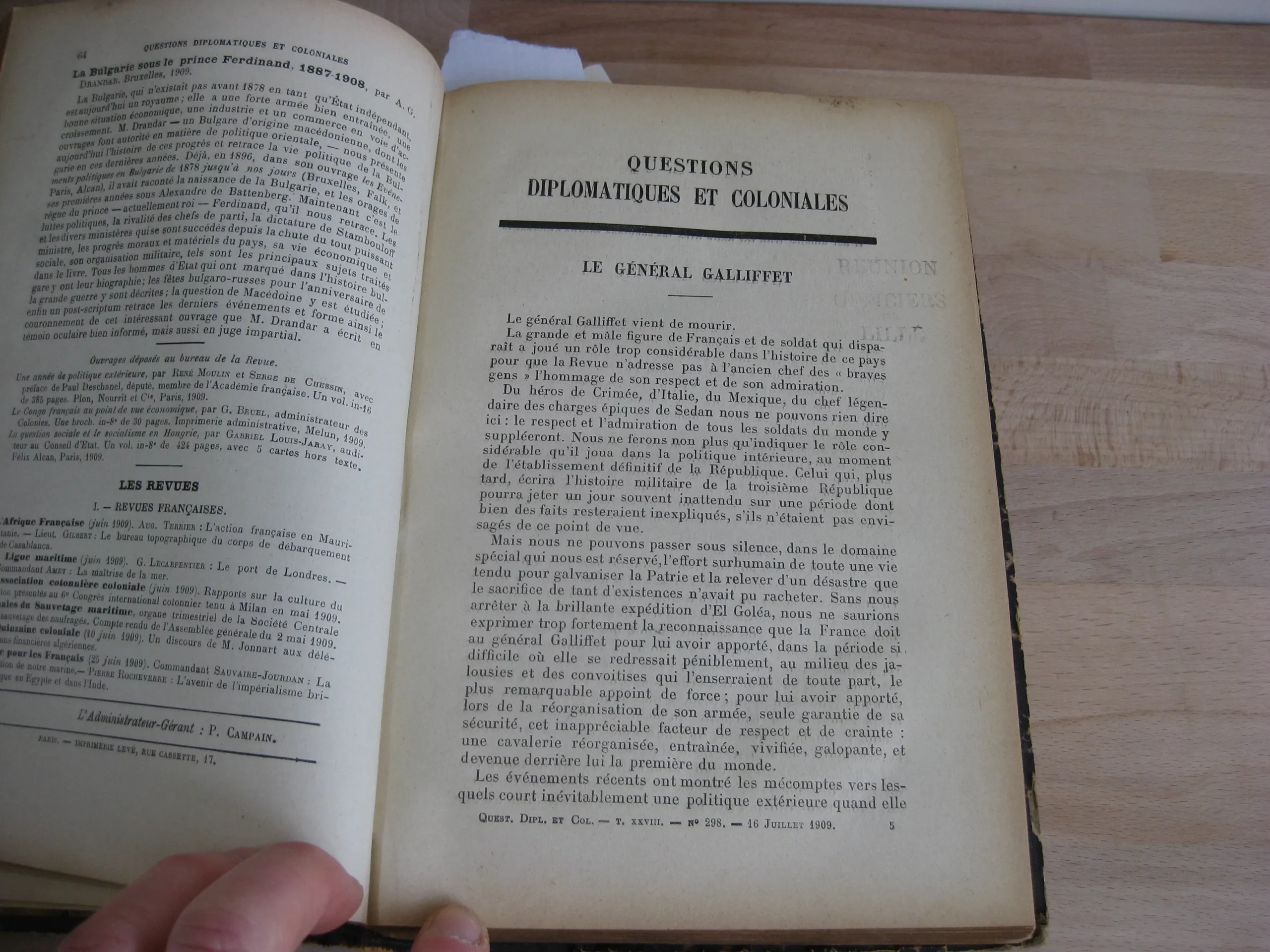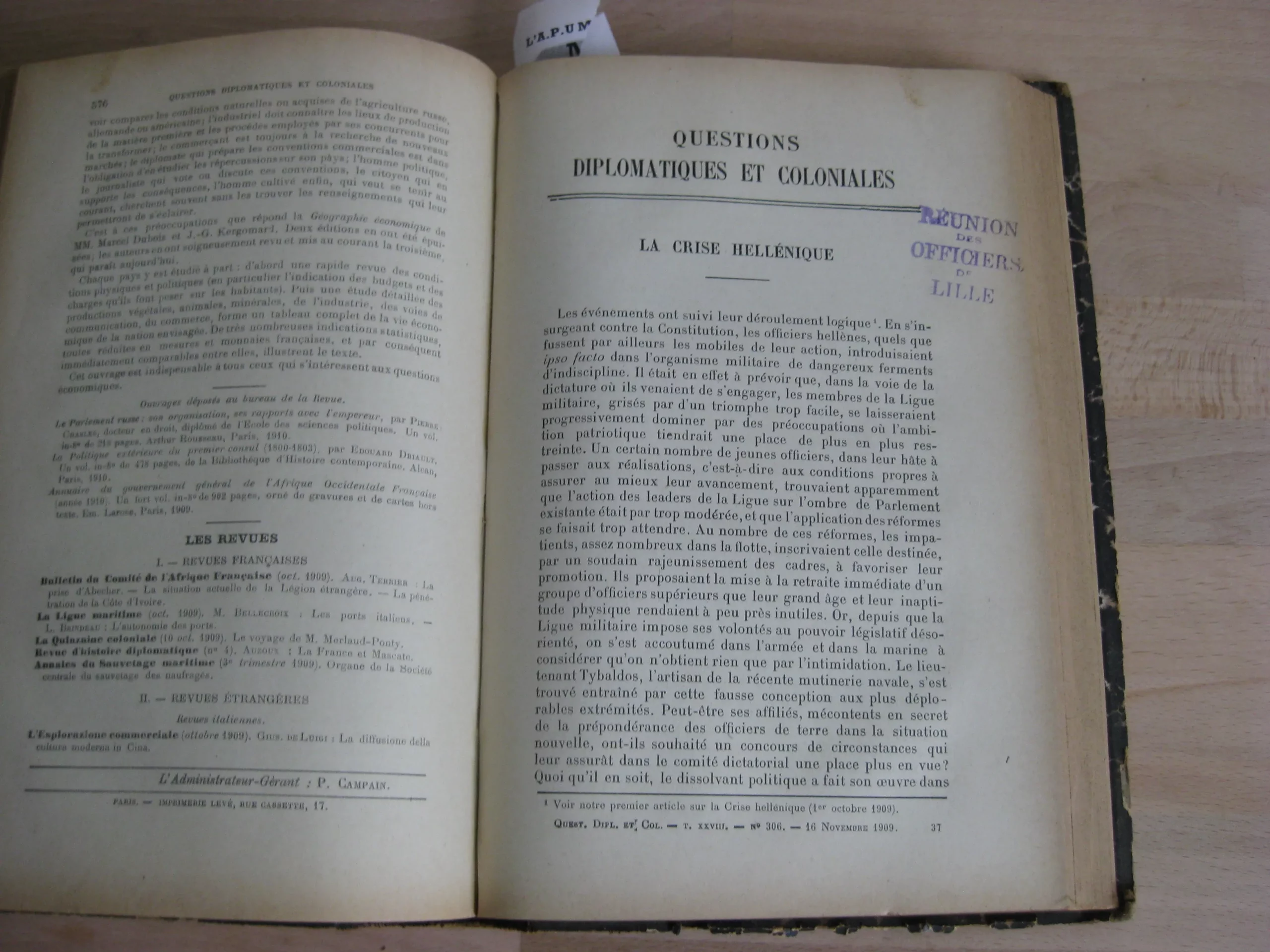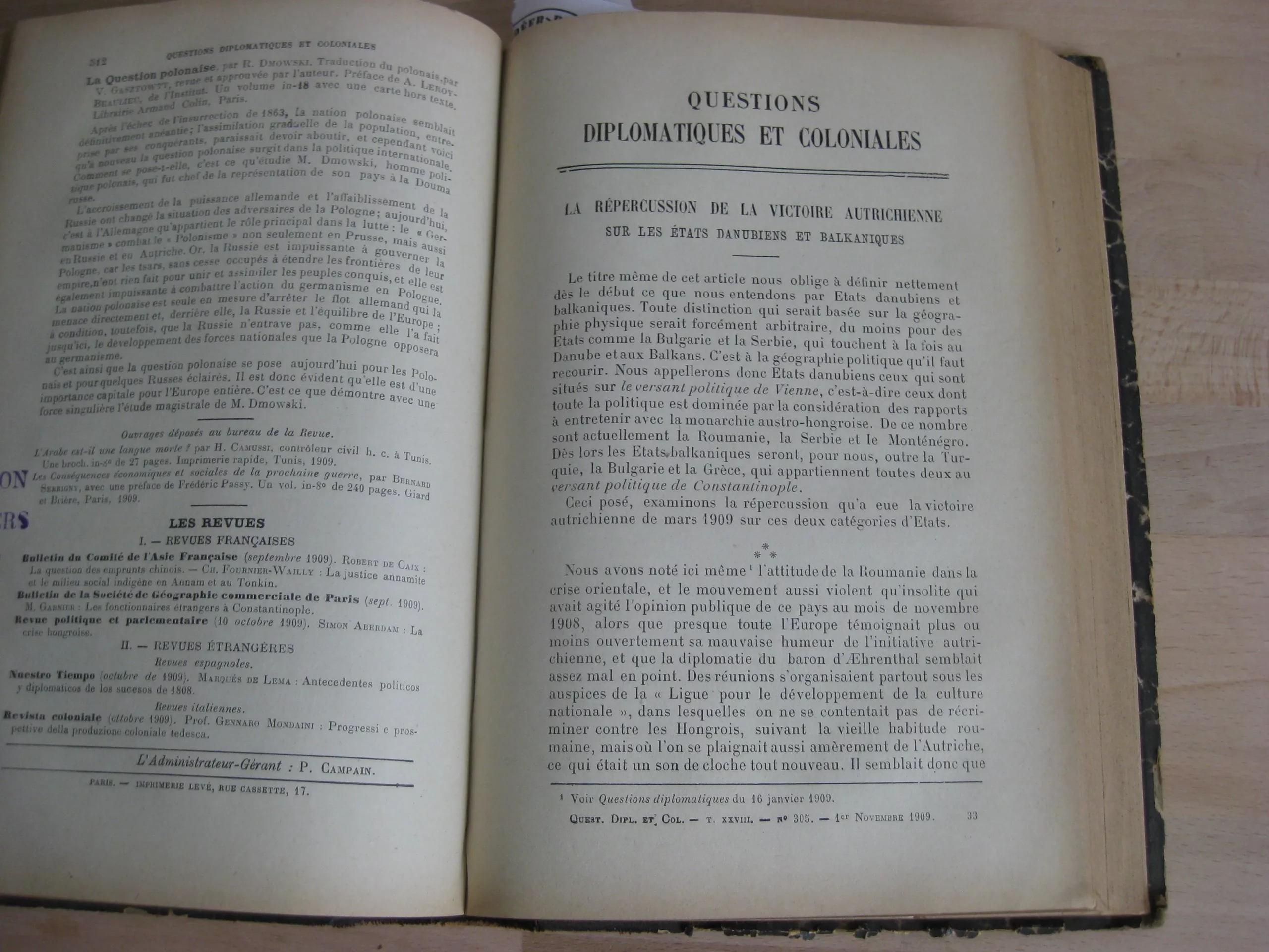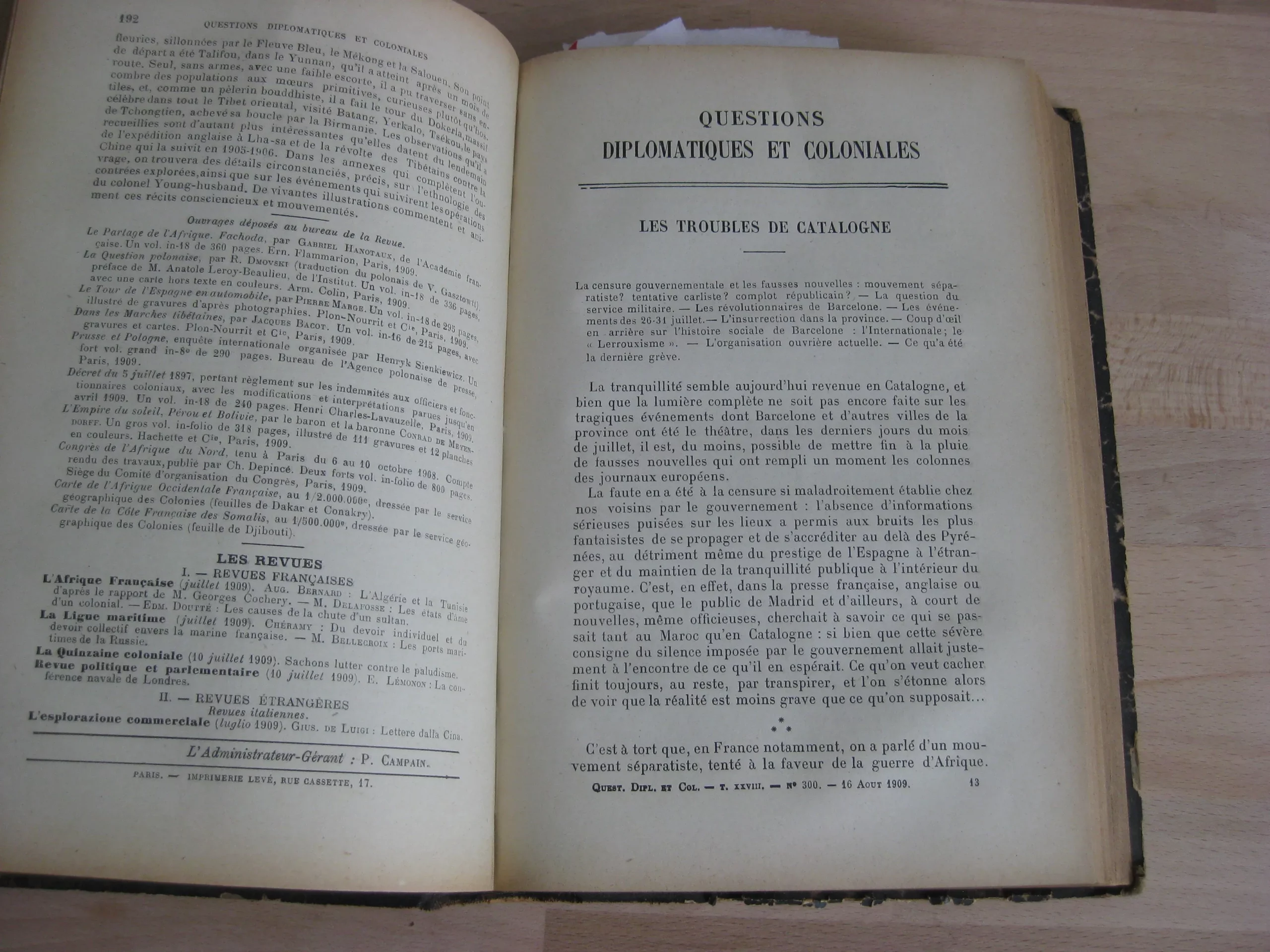 Demi-veau brun à dos long orné du titre, 242 x 161, 767p. Avec table. 1909. Paraissant le 1er et le 16 de chaque mois. Recueil bien complet des 12 livraisons, de la livraison du 01/07/1909 à celle du 16/12/1909. . Comprend notamment 10 cartes et La question crétoise / la situation en Perse / La marine italienne / Les troubles en Catalogne / Le problème irlandais /La jeune Turquie et l’avenir du panislamisme / Les colonies portugaises, Le Mozambique / La crise hellénique /La répercussion de la victoire autrichienne sur les états danubiens et balkaniques / ou encore Les Espagnols dans le Rif. Intérieur propre et intègre. Reliure très frottées avec nombreuses épidermures. Bon exemplaire bien ferme.