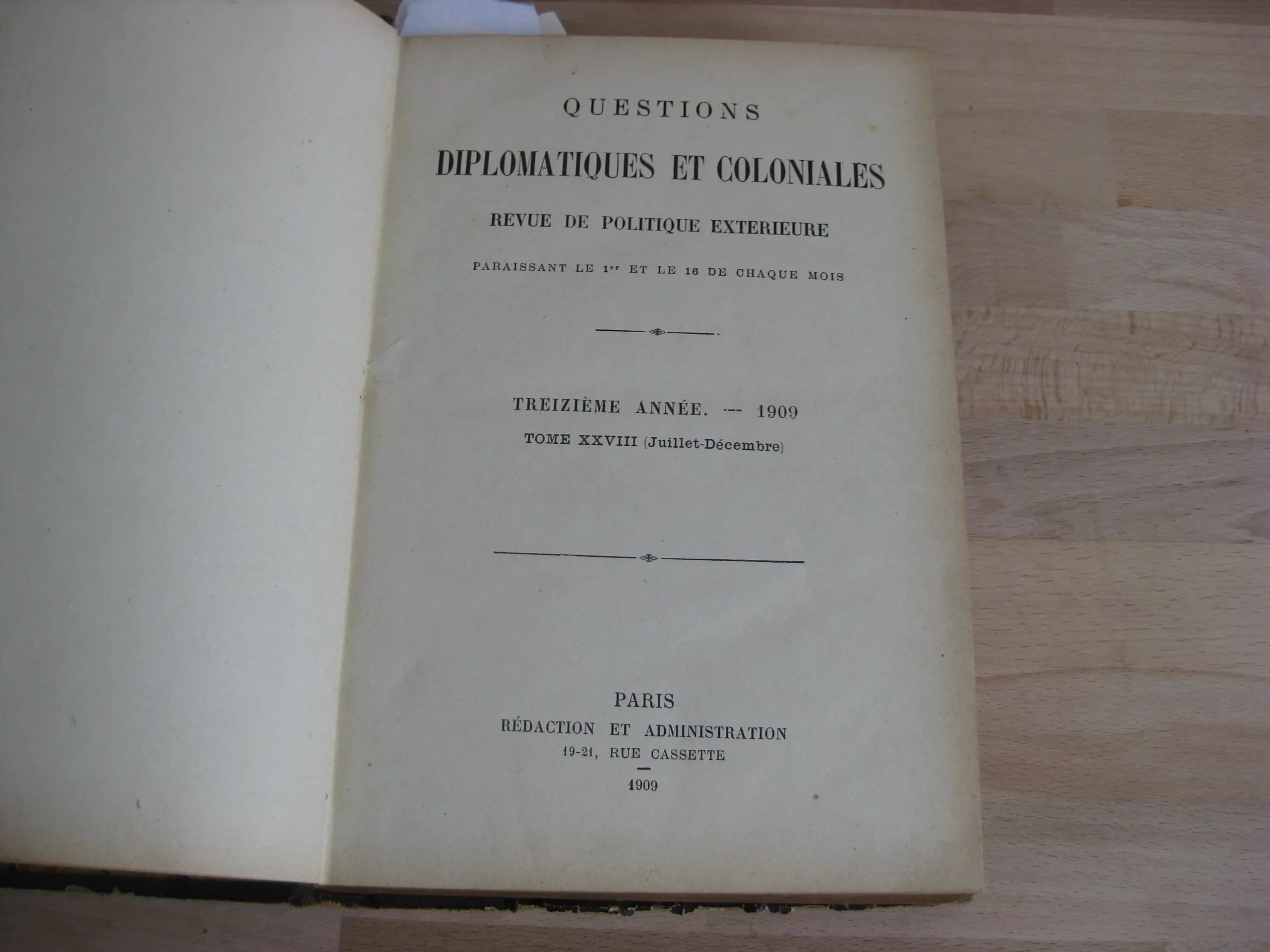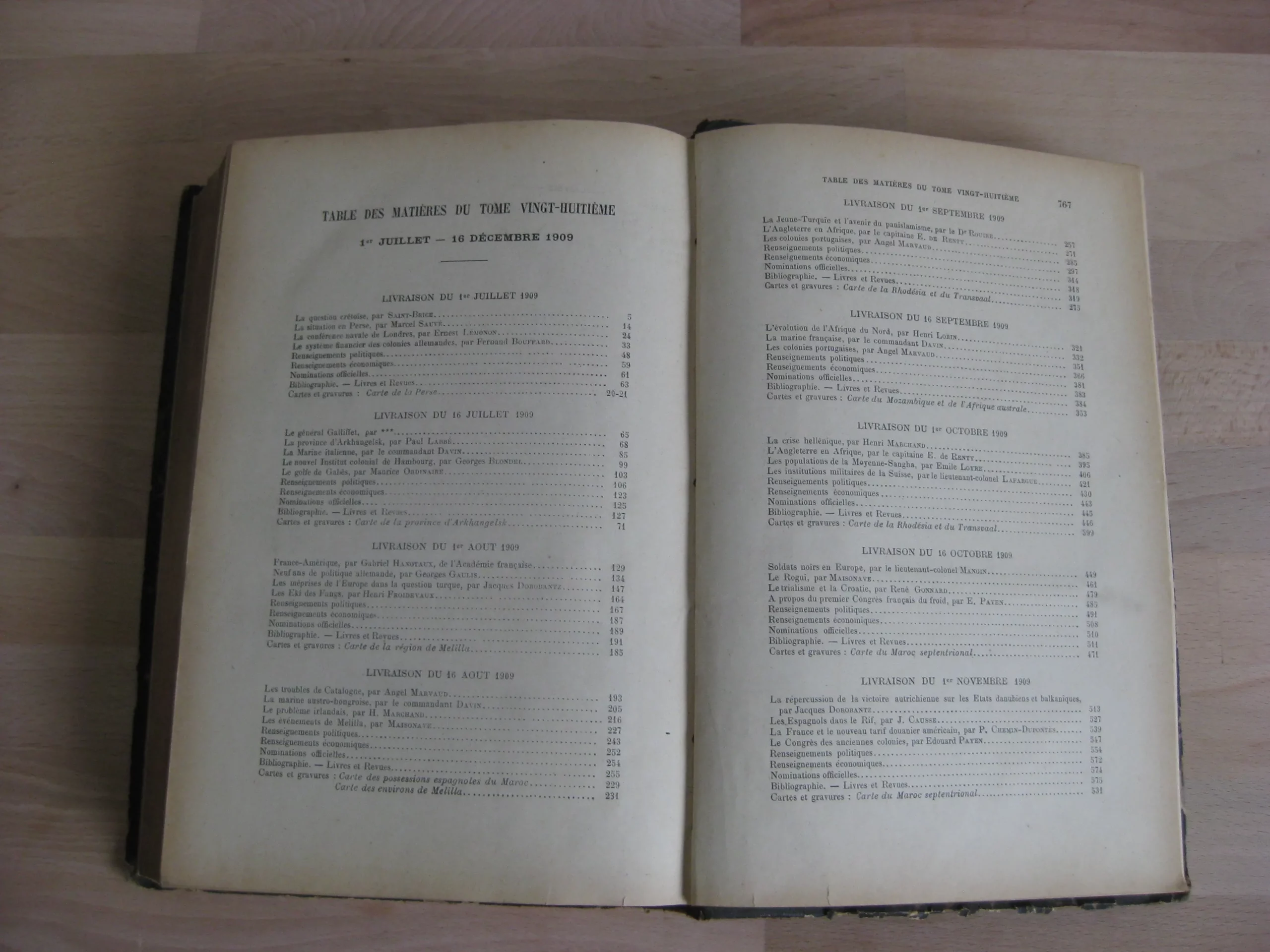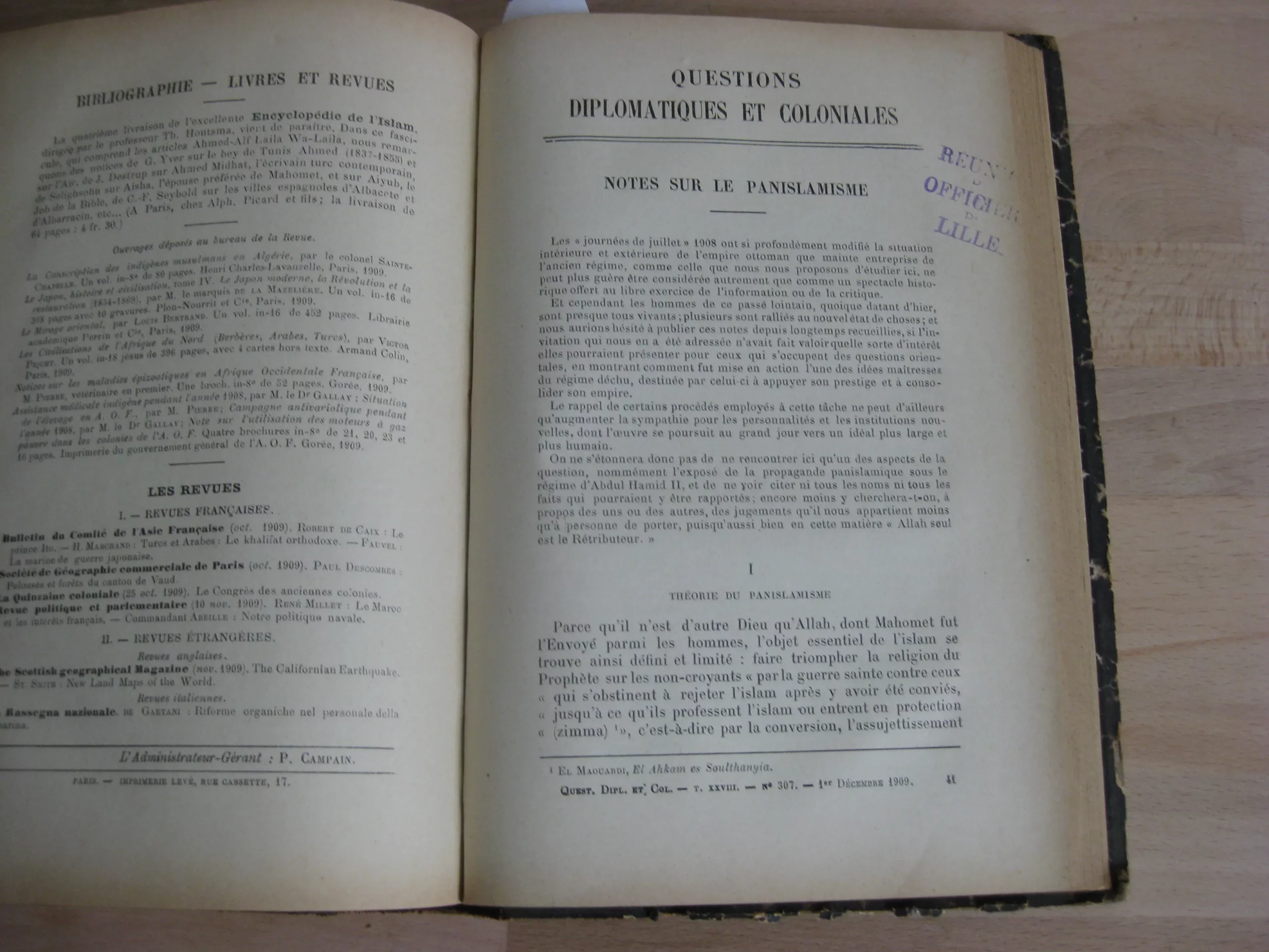 Demi-veau brun à dos long orné du titre, 242 x 161, 767p. Avec table. 1909. Paraissant le 1er et le 16 de chaque mois. Recueil bien complet des 12 livraisons, de la livraison du 01/07/1909 à celle du 16/12/1909. . Comprend notamment 10 cartes et La question crétoise / la situation en Perse / La marine italienne / Les troubles en Catalogne / Le problème irlandais /La jeune Turquie et l’avenir du panislamisme / Les colonies portugaises, Le Mozambique / La crise hellénique /La répercussion de la victoire autrichienne sur les états danubiens et balkaniques / ou encore Les Espagnols dans le Rif. Intérieur propre et intègre. Reliure très frottées avec nombreuses épidermures. Bon exemplaire bien ferme.