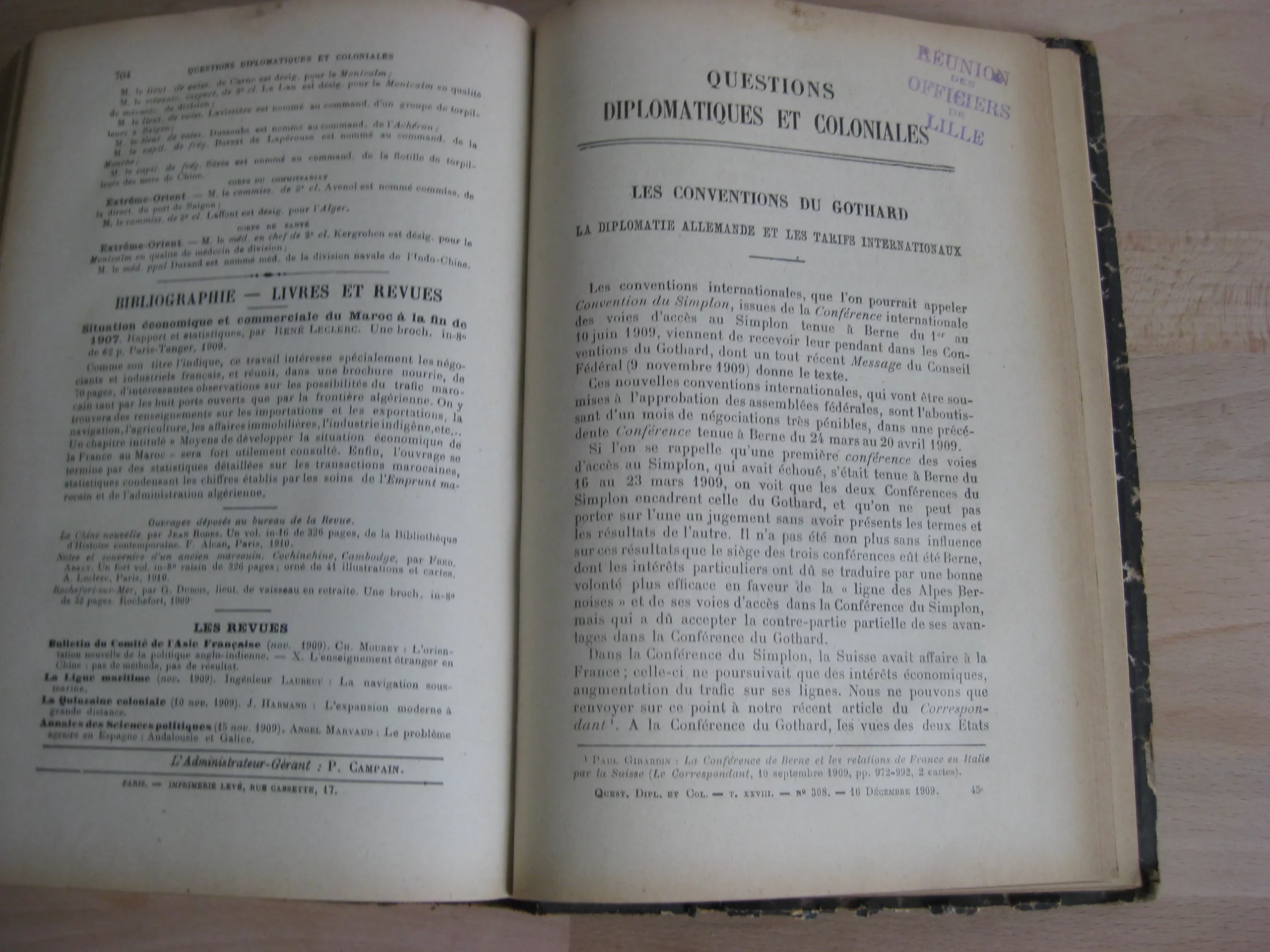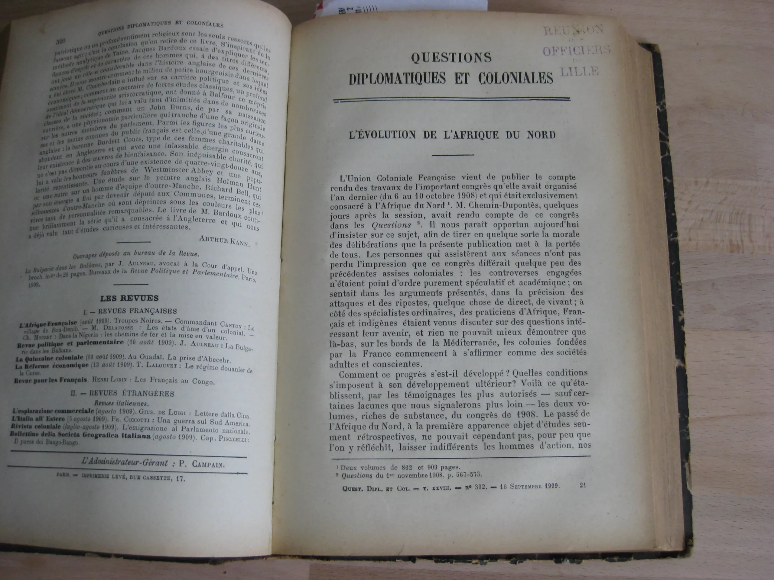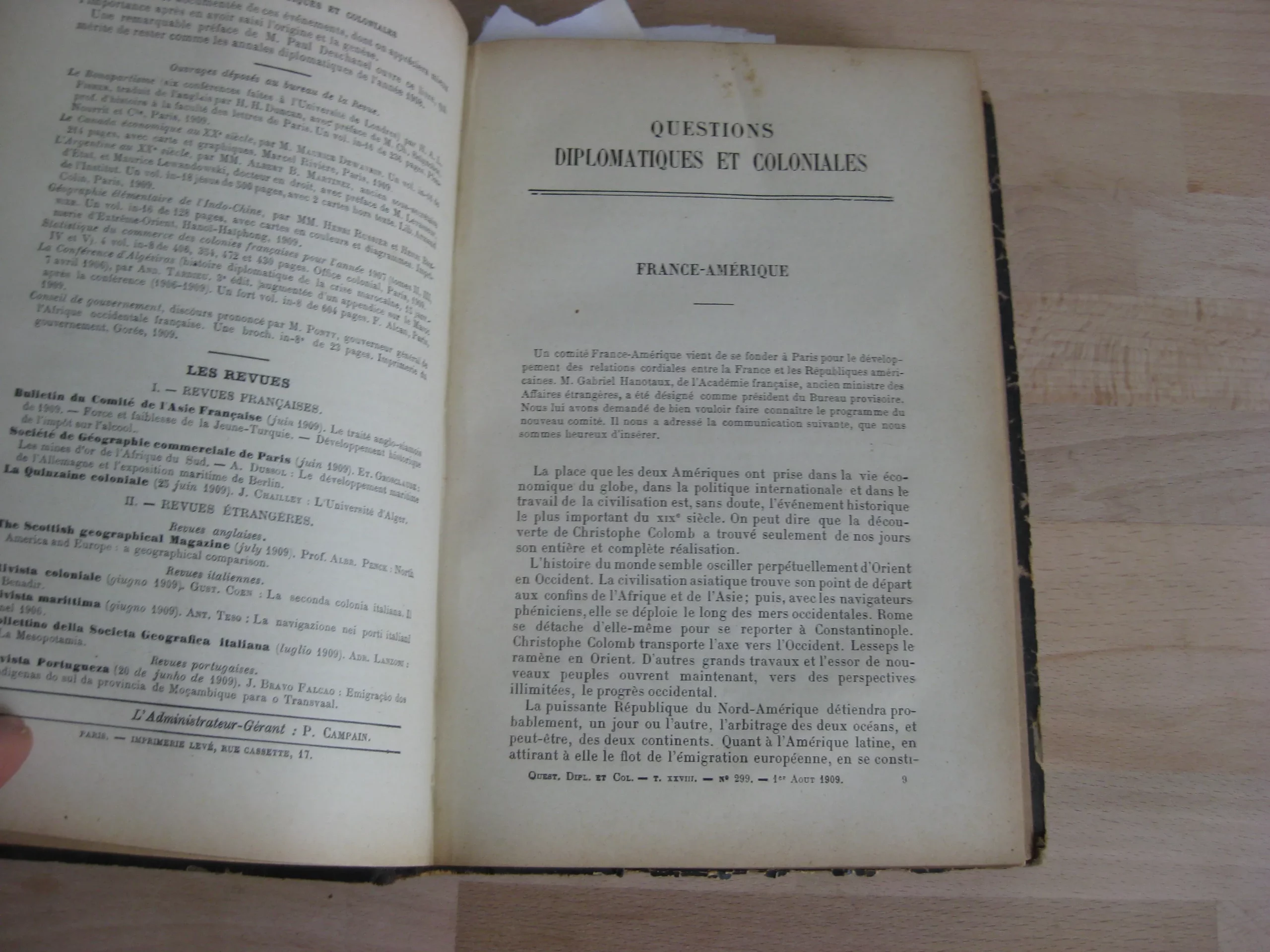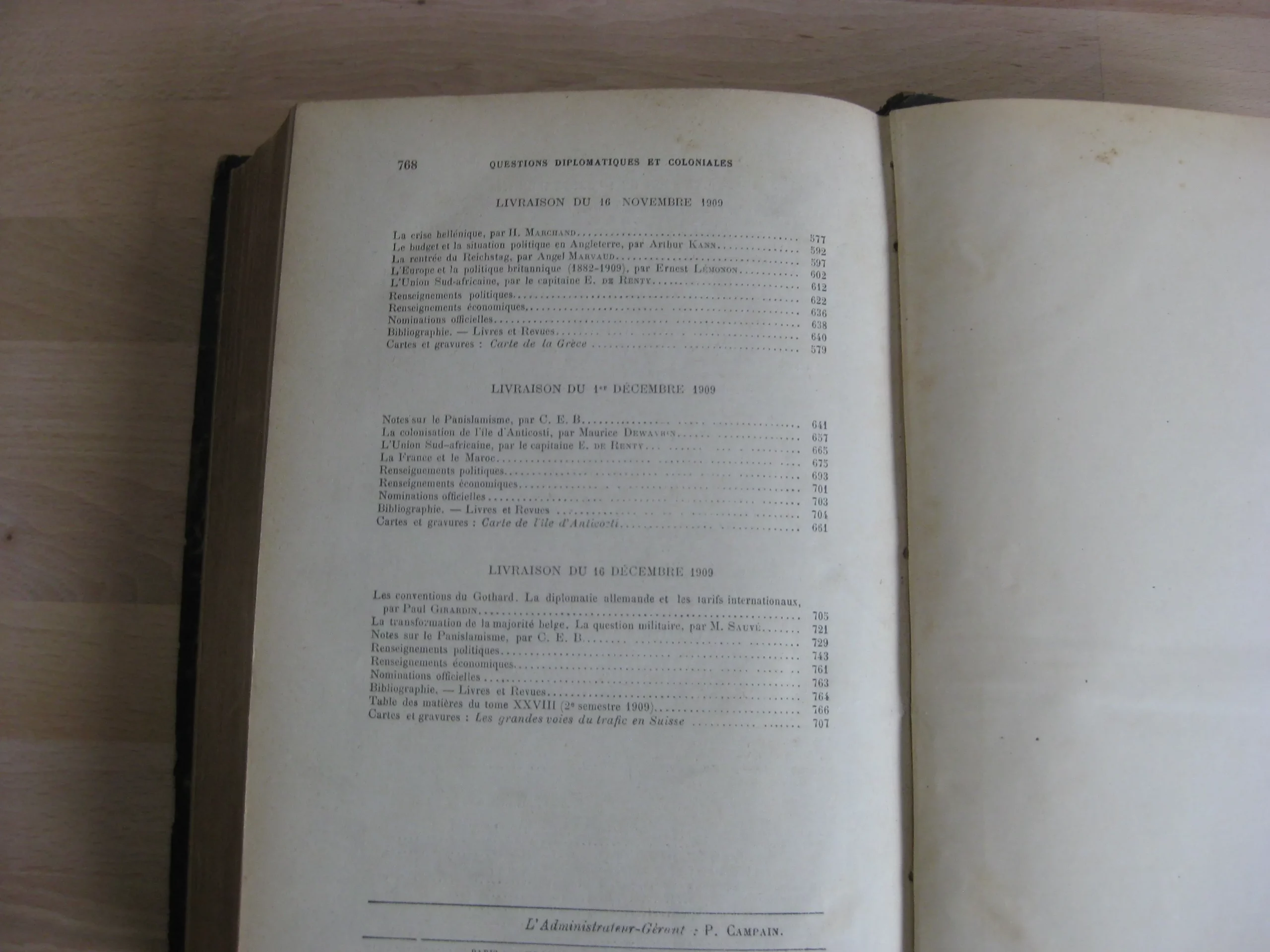 Demi-veau brun à dos long orné du titre, 242 x 161, 767p. Avec table. 1909. Paraissant le 1er et le 16 de chaque mois. Recueil bien complet des 12 livraisons, de la livraison du 01/07/1909 à celle du 16/12/1909. . Comprend notamment 10 cartes et La question crétoise / la situation en Perse / La marine italienne / Les troubles en Catalogne / Le problème irlandais /La jeune Turquie et l’avenir du panislamisme / Les colonies portugaises, Le Mozambique / La crise hellénique /La répercussion de la victoire autrichienne sur les états danubiens et balkaniques / ou encore Les Espagnols dans le Rif. Intérieur propre et intègre. Reliure très frottées avec nombreuses épidermures. Bon exemplaire bien ferme.
