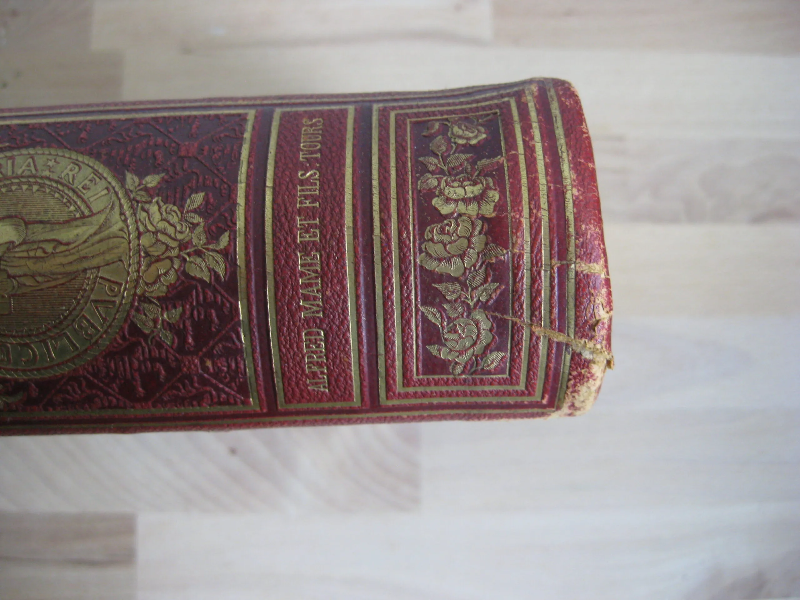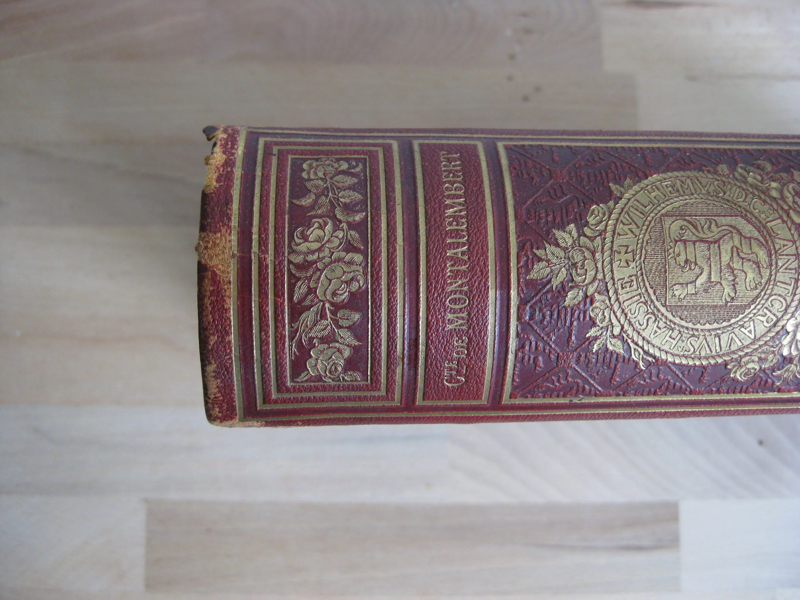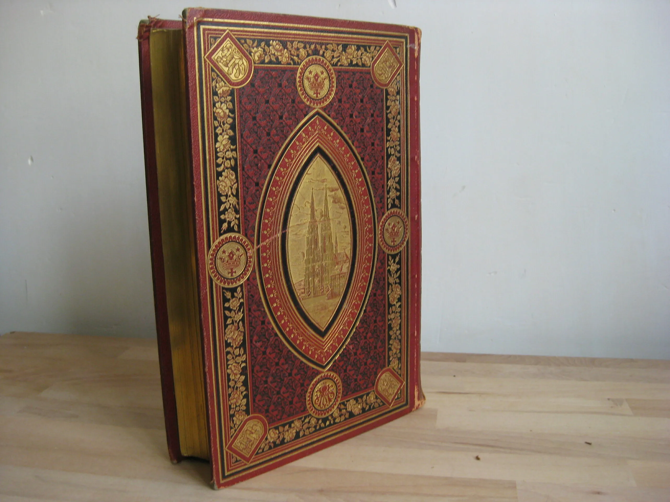 In-4. Half-shagreen decorated with two superb plates on the covers, long spine, richly decorated in particular with two medallions, the one at the top is a Lion of Flanders surrounded by a reference to William Hassie Landgrave (Lantcravius ​​Hassie Wilhemus), the one on the magpie to the Virgin. Lower cover with a superb cathedral decoration in the center in a beautiful oval richly decorated and framed. All edges gilded. 285 x 205, 550p. With tables 1880. 2nd edition. With a preface by Léon Gauthier. Illustrated with numerous drawings (vignettes, chapter headings, tailpieces, initials) and 34 full-page ill. under serpente including 8 chromolithographs (including frontispiece) and 26 black and white (including a double page). Interior generally clean, the little foxing is in the margin. Corners bumped. Covers and fields rubbed, scuffs on the fields. Joints rubbed, upper joint cracked and briefly opened at the head and foot. Spine rubbed, especially at the head and tail with scuffs and folds. Good, firm copy.