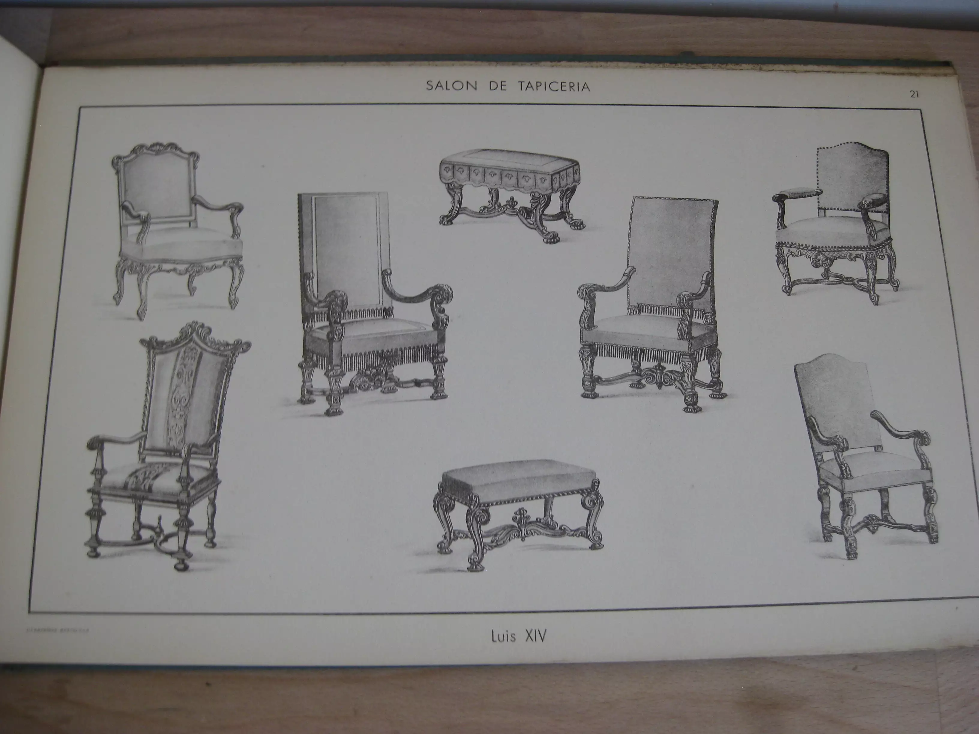 DescriptionPortfolio cartonné à lacets, dos toilé muet, 230 x 366, sans date, 1930-1933 ca. Avec 30 planches numérotées 1 à 30, en noir et blanc représentant du mobilier de salon dans différents styles historiques : Renaissance espagnole, Empire, Moderne (divers dont rideaux et livings), Hepplewhite, Adam, Jacobéen, Régence, Élisabéthain, Louis XIV, Louis XV, Louis XVI, Moderne anglais, Moderne colonial, William Mary, Sheraton, Baroque, Georgian [style anglais 1720-1840], Reine Anne, Carlos II, ainsi que des modèles modernes et des rideaux. Première planche avec rousseurs, toutes les autres sont propres, et quelques rousseurs sur la dernière (principalement au verso).Plats cartonnés avec rousseurs. Dos toilé avec déchirure en tête et pied. Bon exemplaire.