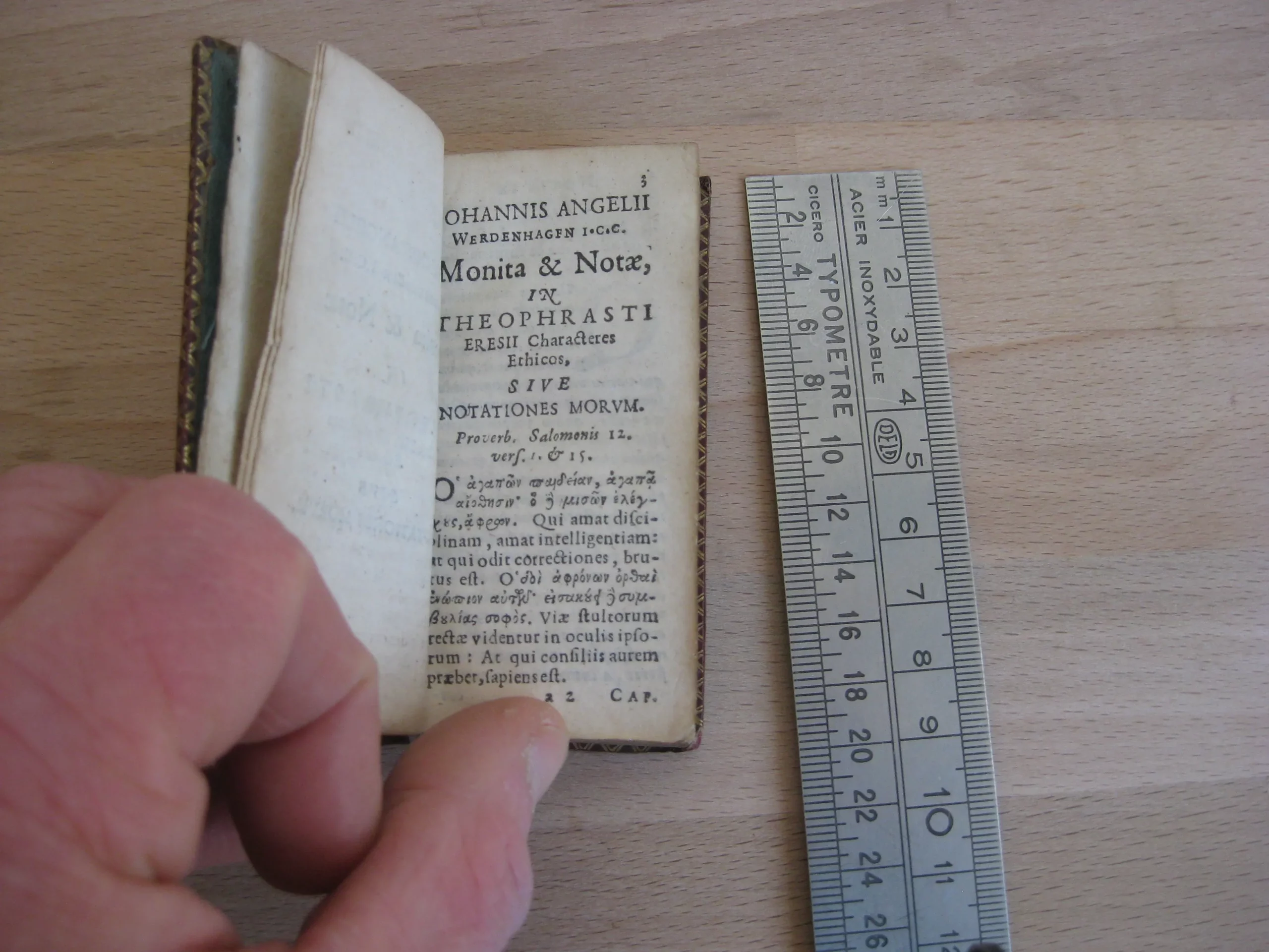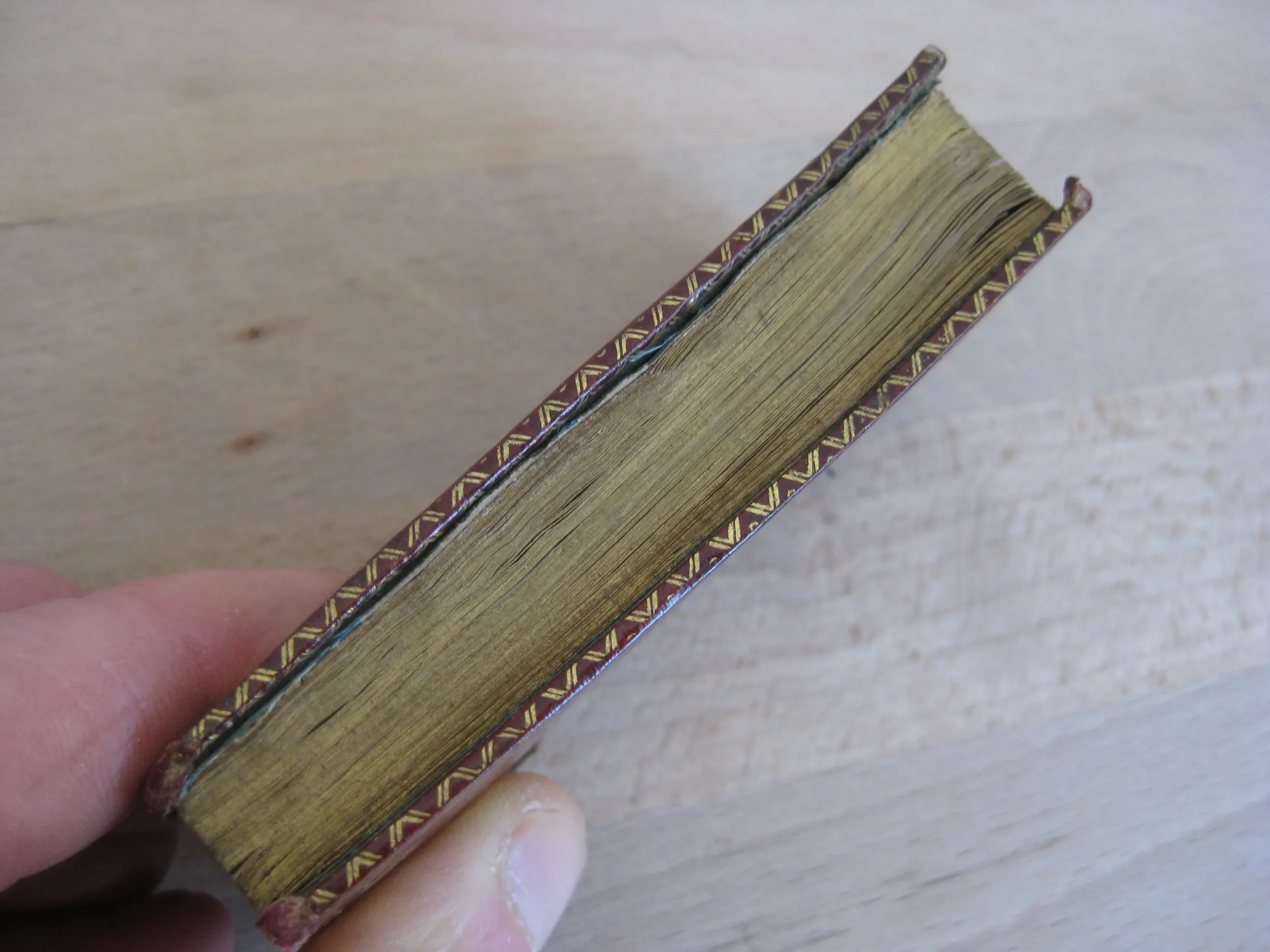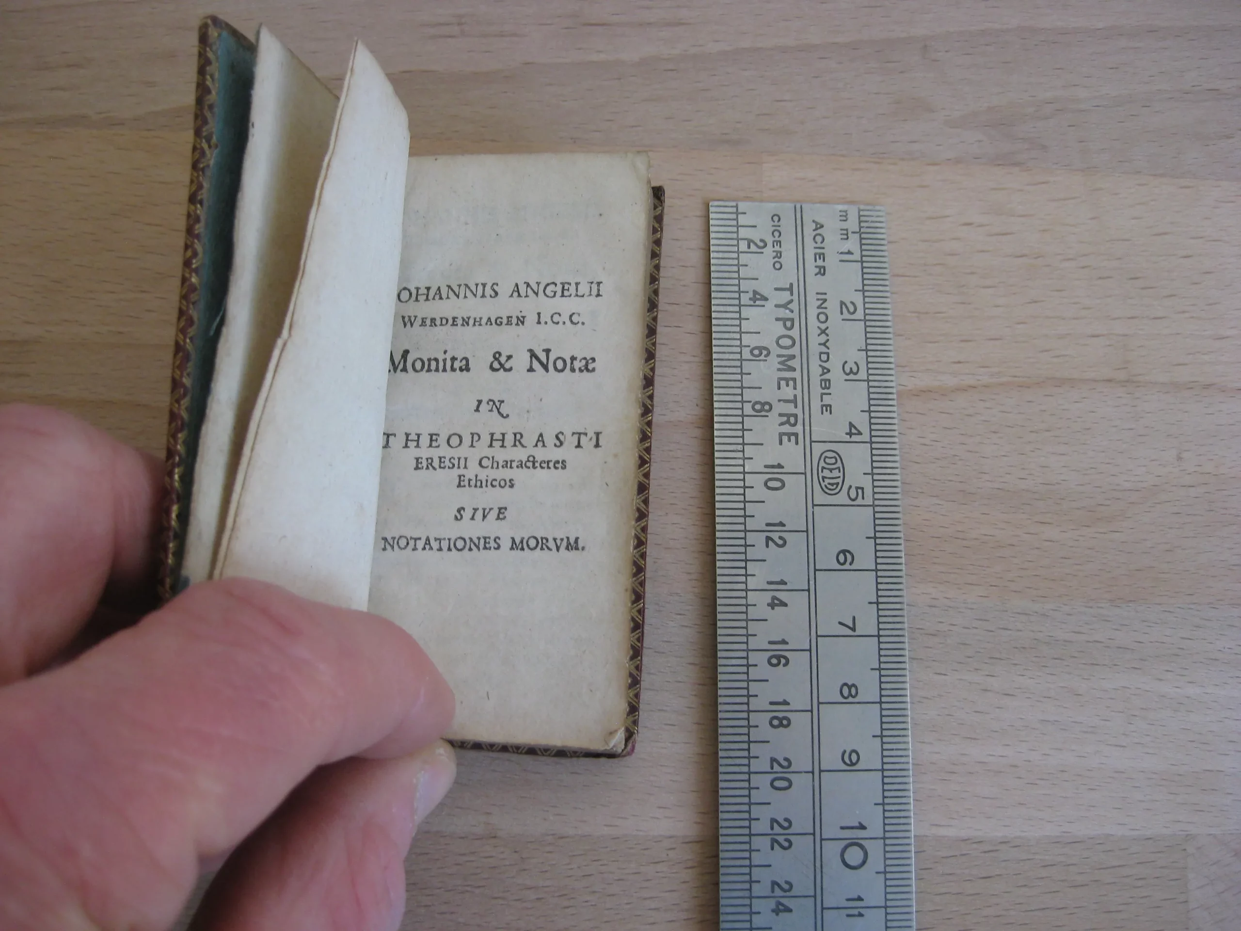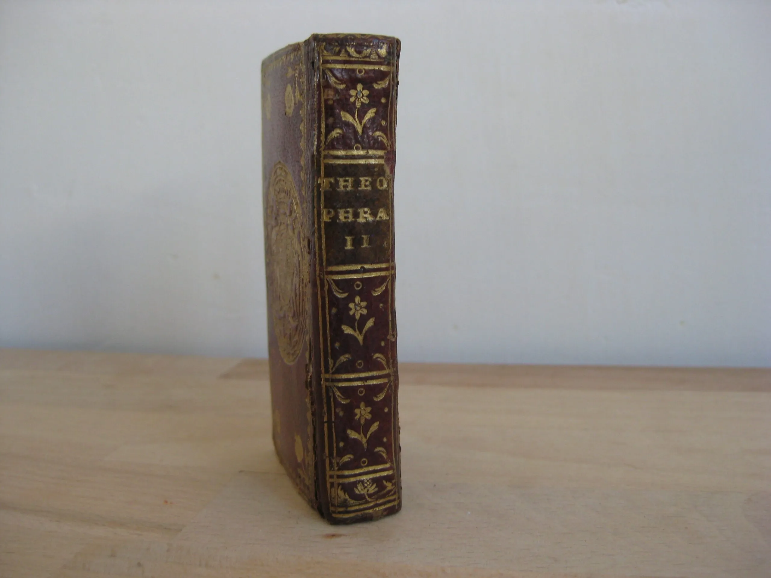 In-32 (87 x 45 mm), plein maroquin rouge d’époque aux armes (non identifiées) et richement orné aux plats et dos. Plats aux armes, avec encadrement à liserés au sein duquel une guirlande de feuille dentelées forment un autre cadre, avec motif floral aux angles et les armes au centre. Dos orné de liserés et des titre/tomaison et du même motif floral aux caissons. Champs, bords de coiffe et queue ornés d’un même motif « vague » repris également en bordures des contreplats. Toutes tranches dorées. Tranchefile, signet. Joli papier de soie bleu en contreplats. [page de titre générale non reprise sur ce tome] Ioannis Maire, 1632. Partie III seule, les commentaires de Johann Angelius Werdenhagen, comprenant 13 chapitres 4-234 pp. Le chapitre XII se termine par : Dn. Tilomanno Pletenbro [Plettenher] Philippus Melanchton s. 213-217pp. Vitaebergae, anno 1523. Suivi de Paedagogis Philip. Melancht. S à L. 218-222p. Vitaeberg. Ann. 1527. Suivi de Monitum, serium ad lectorem christ. Doctrinae ethicae anno 1618 annexum. 223-234pp. In fine : Iehova salus mea in Monita ethica Johannis Angelii Werdenhagij I. CC. Fredericus Husanus aliàs Kayn Thuring, 235 à 237 (fin). Les deux autres Intérieur très bon, propre et intègre. Plats légèrement frottés, mais plus fortement pour le plat supérieur. Mors frottés, légèrement fendus, avec en mors inférieur (sur la deuxième moitié en pied) des travaux d’insectes avec manques. Dos légèrement frotté, avec petite épidemure en queue. Ici donc la Partie III de cette édition des Caractères de Théophraste en deux tomes ; texte grec imprimé en grec, édité de trois parties, dont la traduction latine est due au protestant calviniste Isaac Casaubon. La troisième partie étant le commentaire de Johann Angelius Werdenhagen. Le tome I regroupant donc le texte grec et la traduction latine de Cazaubon. Philosophe, politologue et diplomate allemand, Johann Angelius Werdenhagen est également l’auteur de De rebuspublicis Hanseaticis earumque nobili confederatione.