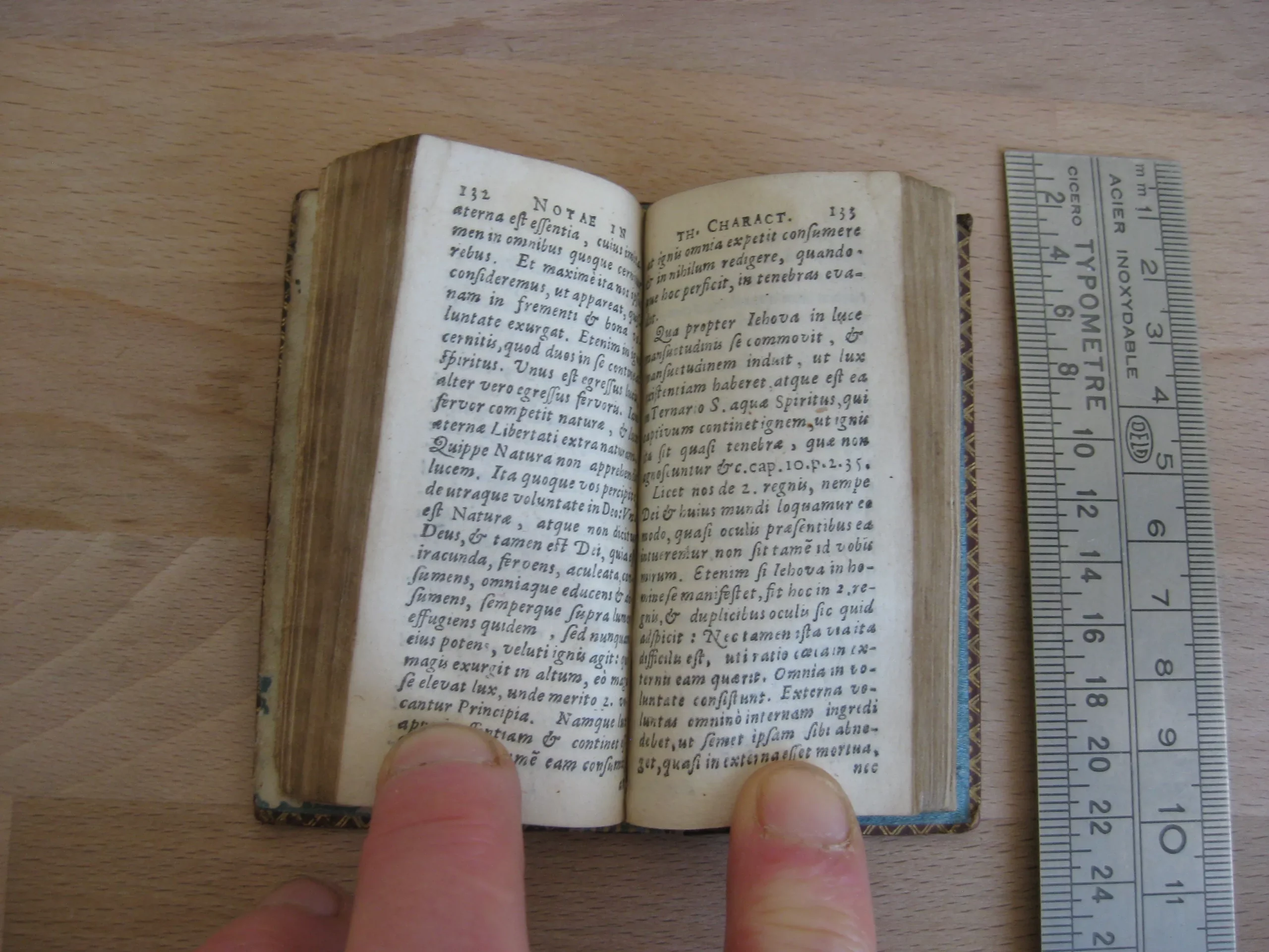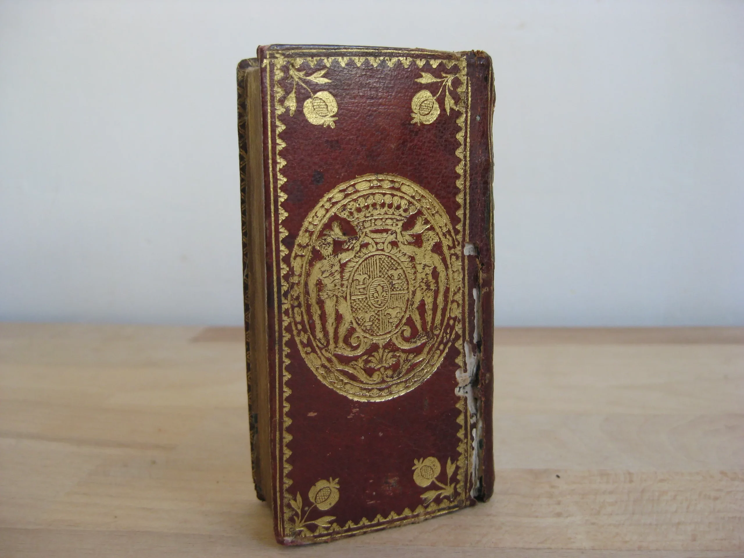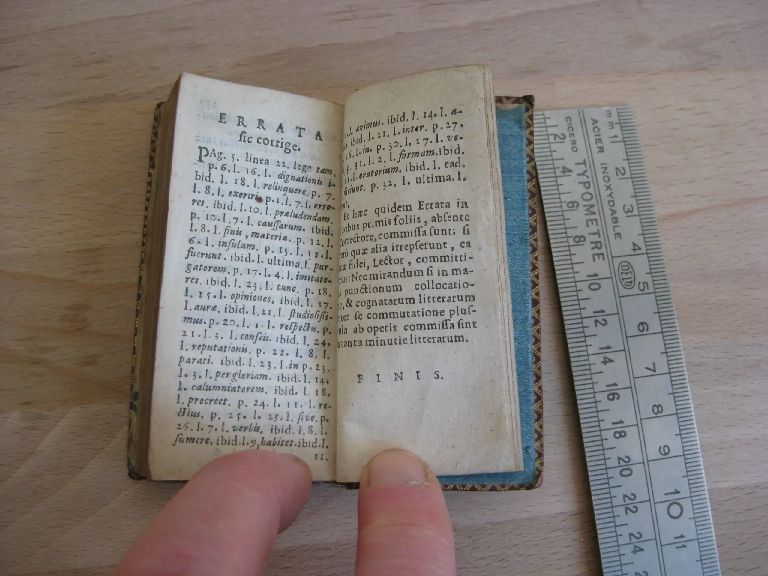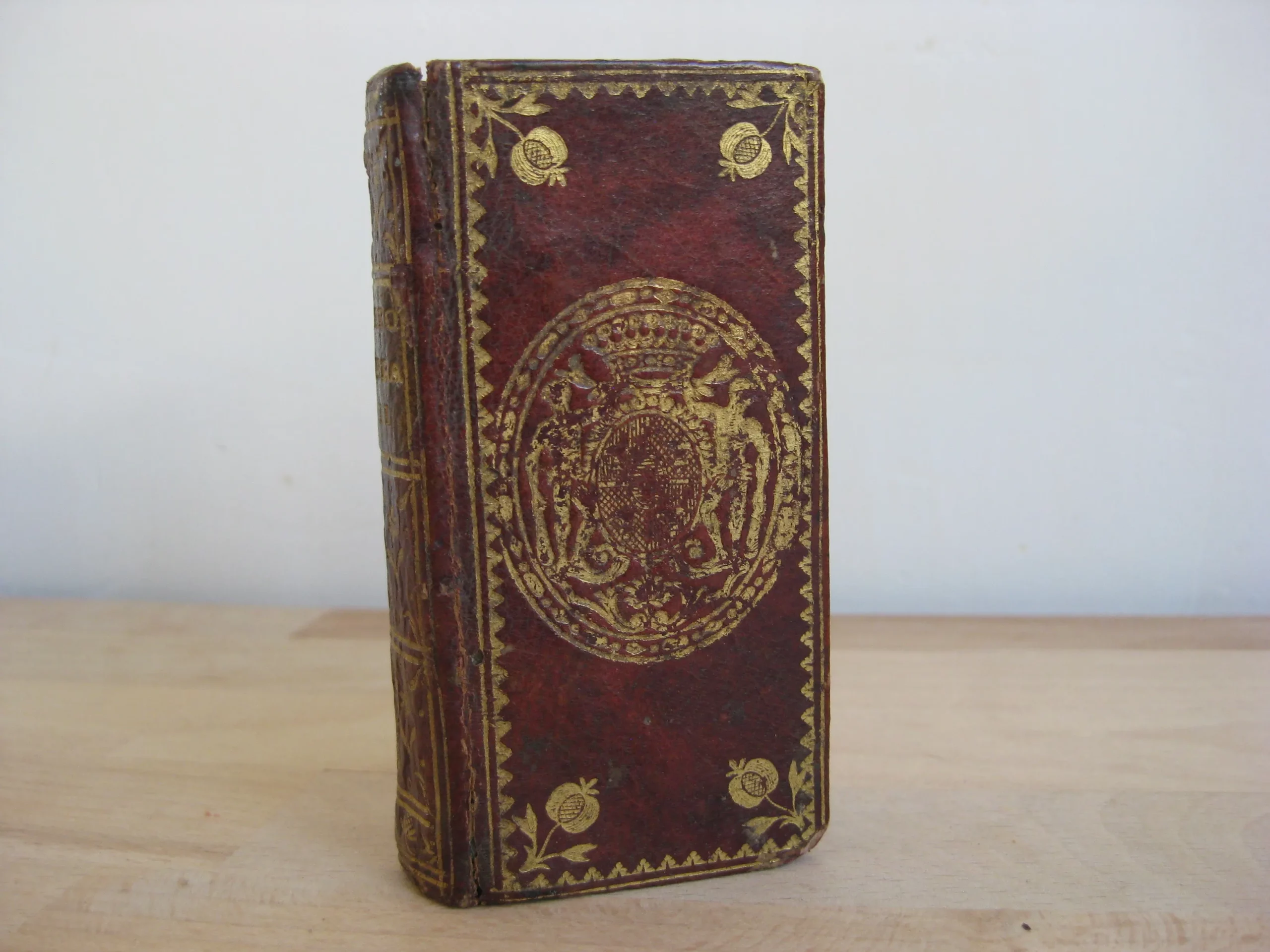 In-32 (87 x 45 mm), plein maroquin rouge d’époque aux armes (non identifiées) et richement orné aux plats et dos. Plats aux armes, avec encadrement à liserés au sein duquel une guirlande de feuille dentelées forment un autre cadre, avec motif floral aux angles et les armes au centre. Dos orné de liserés et des titre/tomaison et du même motif floral aux caissons. Champs, bords de coiffe et queue ornés d’un même motif « vague » repris également en bordures des contreplats. Toutes tranches dorées. Tranchefile, signet. Joli papier de soie bleu en contreplats. [page de titre générale non reprise sur ce tome] Ioannis Maire, 1632. Partie III seule, les commentaires de Johann Angelius Werdenhagen, comprenant 13 chapitres 4-234 pp. Le chapitre XII se termine par : Dn. Tilomanno Pletenbro [Plettenher] Philippus Melanchton s. 213-217pp. Vitaebergae, anno 1523. Suivi de Paedagogis Philip. Melancht. S à L. 218-222p. Vitaeberg. Ann. 1527. Suivi de Monitum, serium ad lectorem christ. Doctrinae ethicae anno 1618 annexum. 223-234pp. In fine : Iehova salus mea in Monita ethica Johannis Angelii Werdenhagij I. CC. Fredericus Husanus aliàs Kayn Thuring, 235 à 237 (fin). Les deux autres Intérieur très bon, propre et intègre. Plats légèrement frottés, mais plus fortement pour le plat supérieur. Mors frottés, légèrement fendus, avec en mors inférieur (sur la deuxième moitié en pied) des travaux d’insectes avec manques. Dos légèrement frotté, avec petite épidemure en queue. Ici donc la Partie III de cette édition des Caractères de Théophraste en deux tomes ; texte grec imprimé en grec, édité de trois parties, dont la traduction latine est due au protestant calviniste Isaac Casaubon. La troisième partie étant le commentaire de Johann Angelius Werdenhagen. Le tome I regroupant donc le texte grec et la traduction latine de Cazaubon. Philosophe, politologue et diplomate allemand, Johann Angelius Werdenhagen est également l’auteur de De rebuspublicis Hanseaticis earumque nobili confederatione.