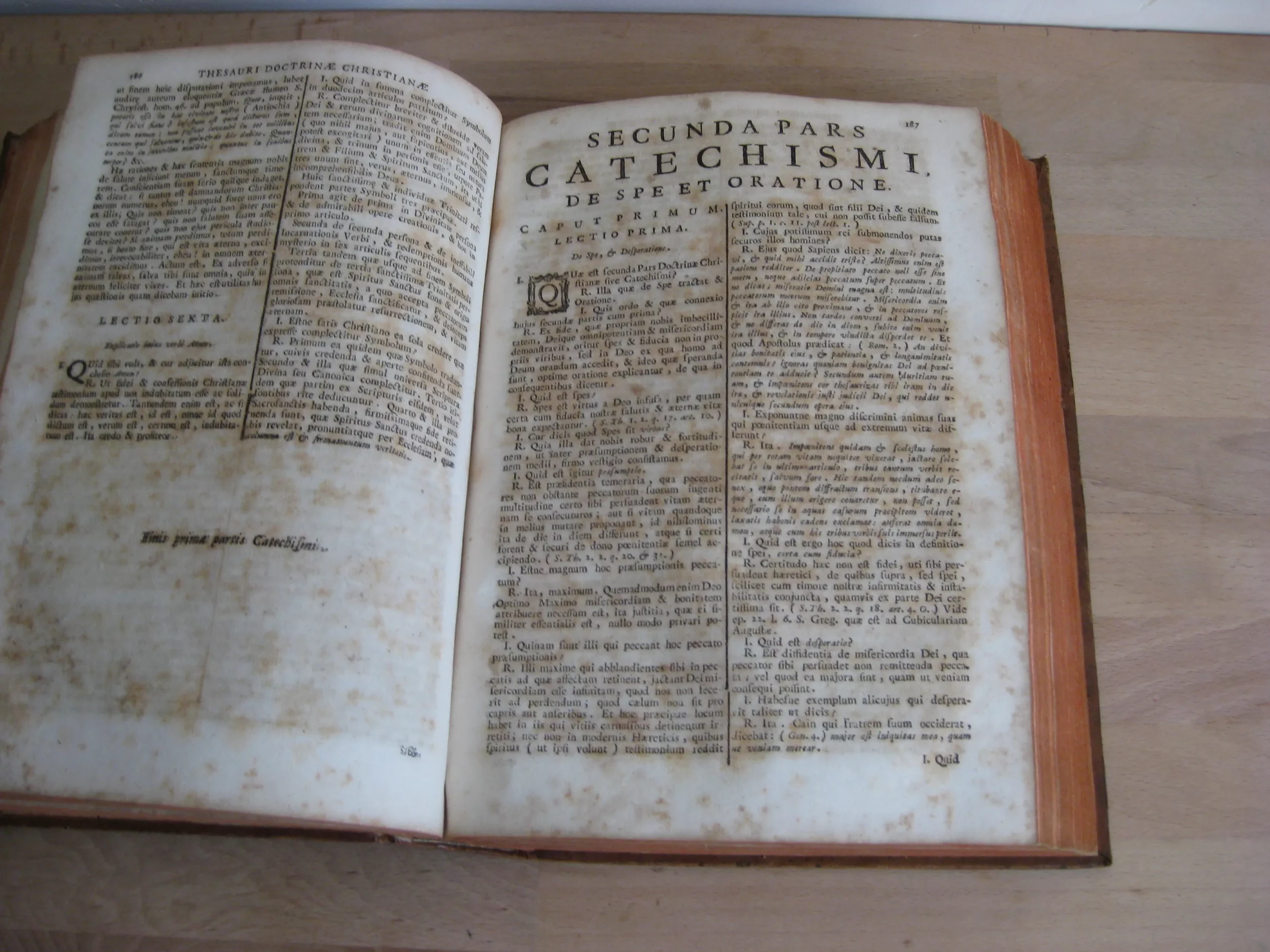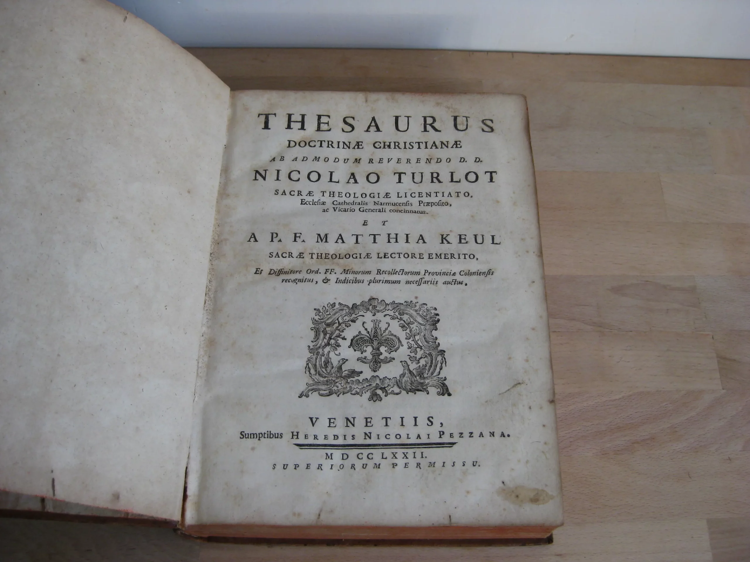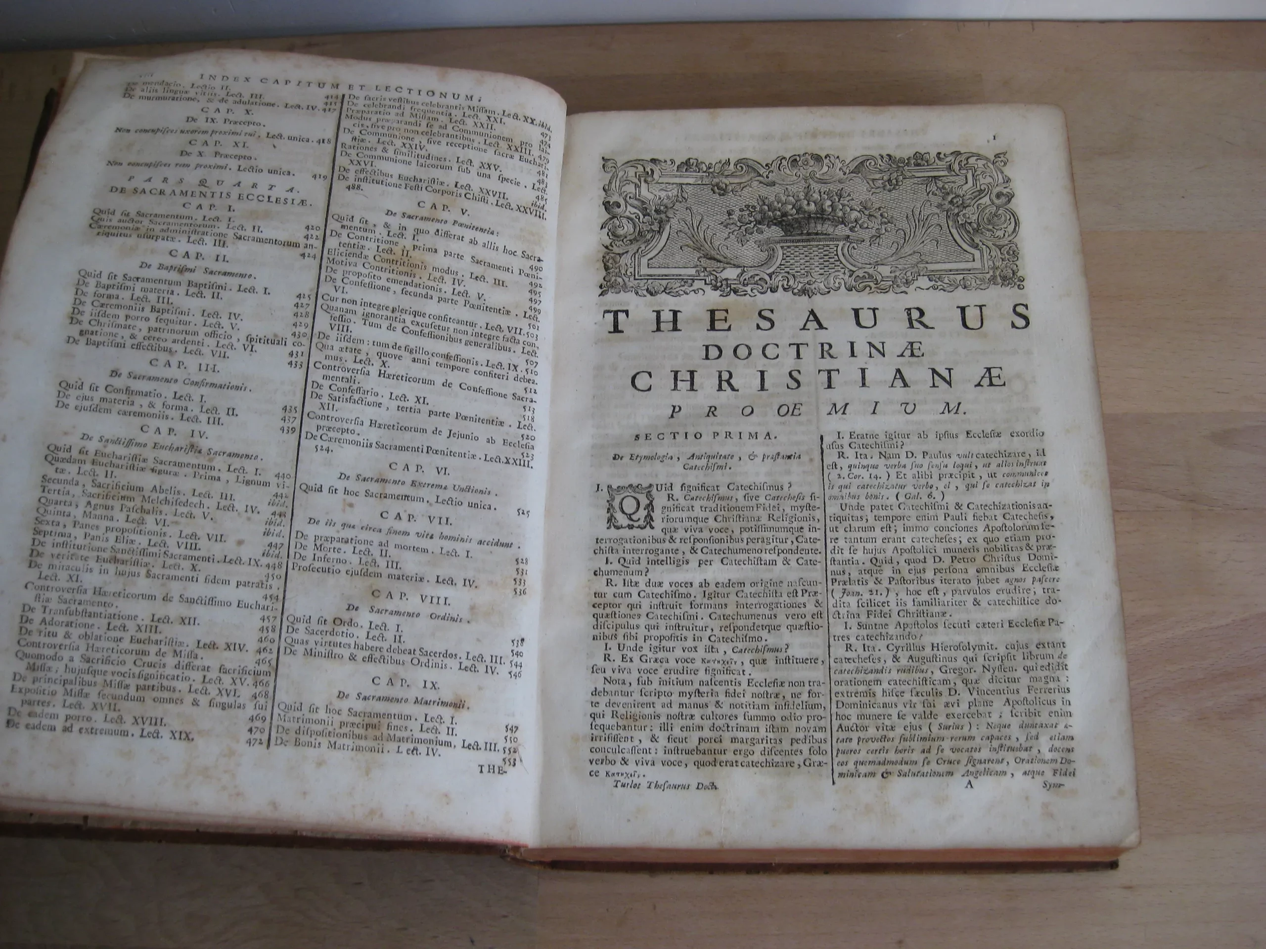Plein veau à motif, dos à cinq nerfs, orné d’une pièce de titre en maroquin lie de vin et de caissons à motifs floraux, tranches rouge, 256 x 190, Venetiis, 1772. Vignette au titre, bel entête au texte. Adresse, approbation et Index capitum et lectionum, 6p. Puis le texte, 582p. Avec les Index rerum et concionatorius. Rousseurs générales parfois uniformes et légères, parfois abondantes et marquées. Travail de vers aux gardes, marginalement au titre, et en dernière page. Travail de vers également aux contreplat supérieur (fortement) et inférieur. Plats légèrement frottés avec travail de vers en plats supérieur (en pied et en tête près du mors) ; mors intègres ; coins et champs frottés, un coins de tête avec un petit manque. Dos frotté avec épidermures mais en bel état. Plat supérieur avec une torsion convexe.