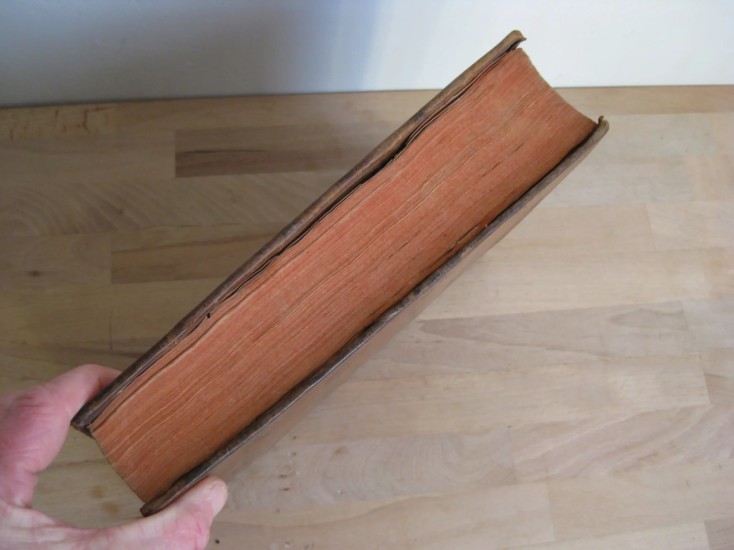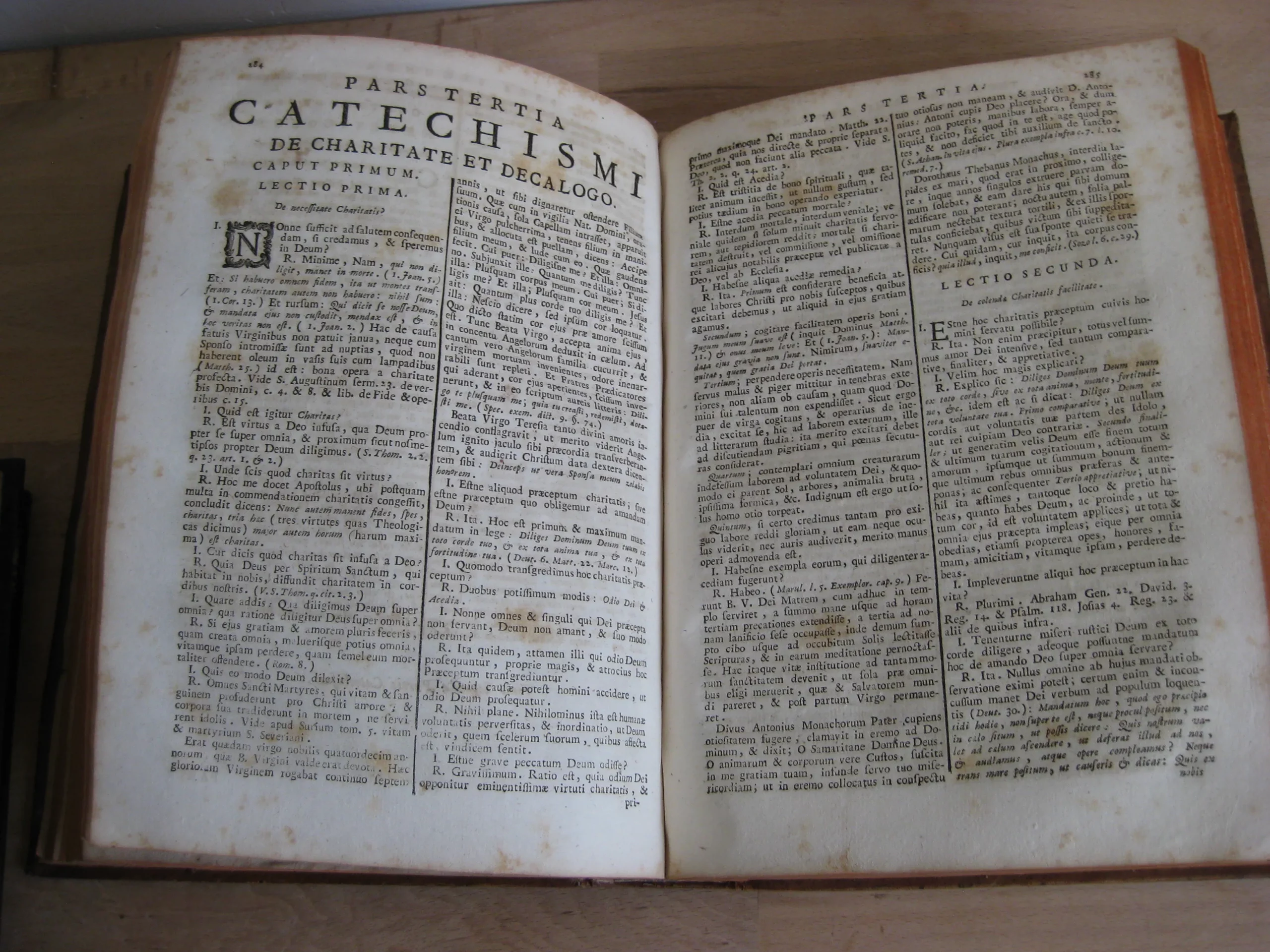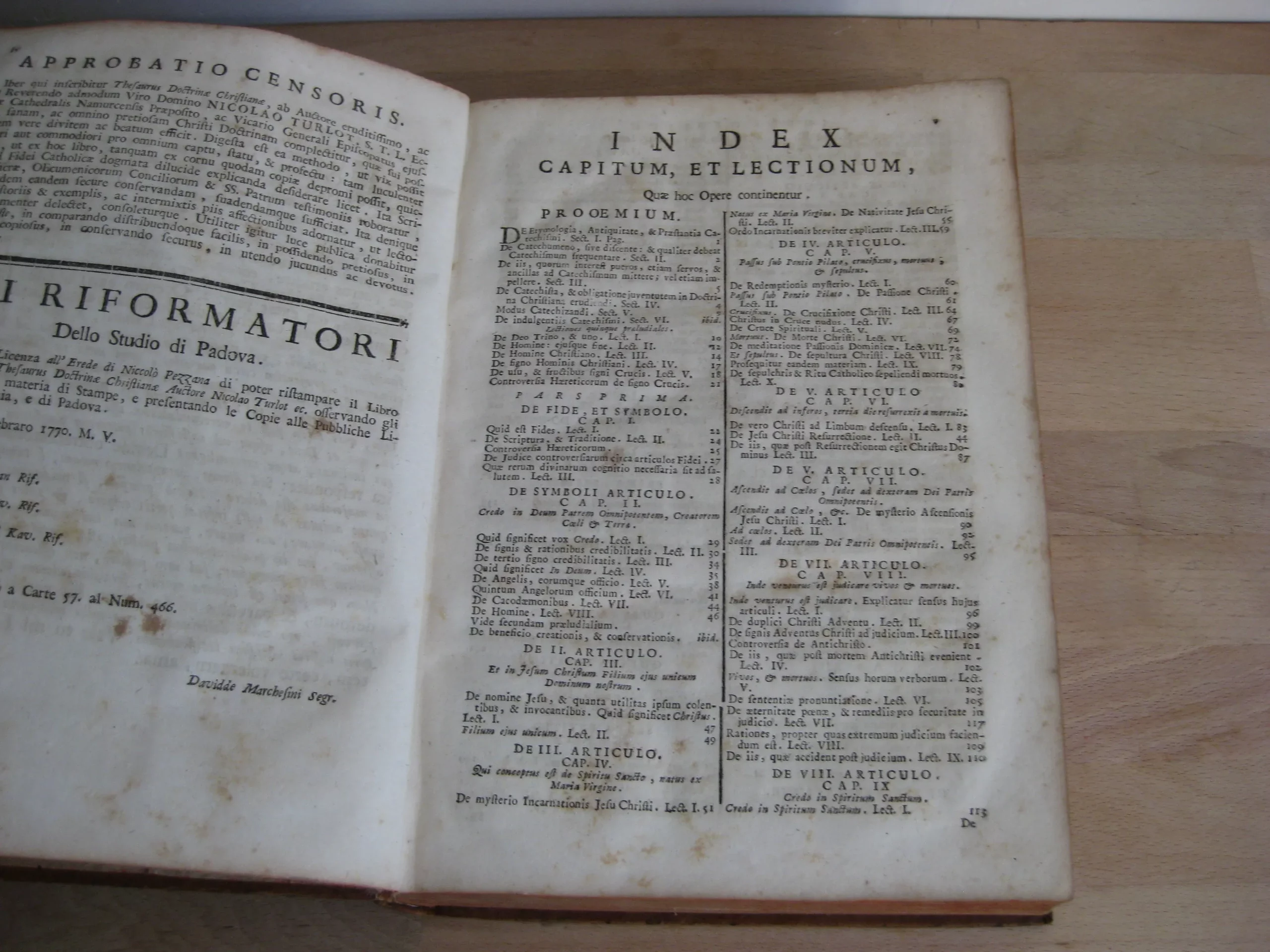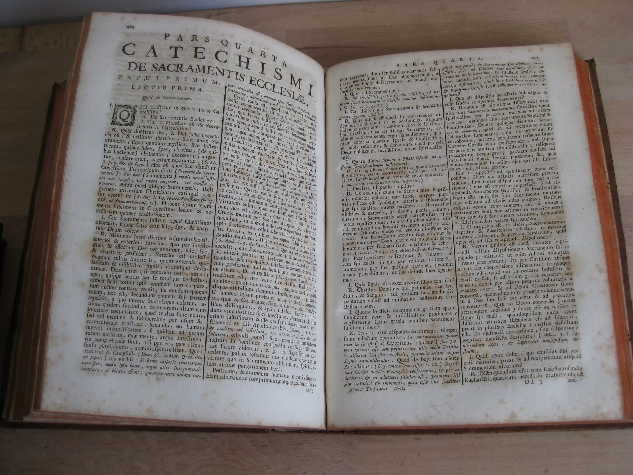 Plein veau à motif, dos à cinq nerfs, orné d’une pièce de titre en maroquin lie de vin et de caissons à motifs floraux, tranches rouge, 256 x 190, Venetiis, 1772. Vignette au titre, bel entête au texte. Adresse, approbation et Index capitum et lectionum, 6p. Puis le texte, 582p. Avec les Index rerum et concionatorius. Rousseurs générales parfois uniformes et légères, parfois abondantes et marquées. Travail de vers aux gardes, marginalement au titre, et en dernière page. Travail de vers également aux contreplat supérieur (fortement) et inférieur. Plats légèrement frottés avec travail de vers en plats supérieur (en pied et en tête près du mors) ; mors intègres ; coins et champs frottés, un coins de tête avec un petit manque. Dos frotté avec épidermures mais en bel état. Plat supérieur avec une torsion convexe.