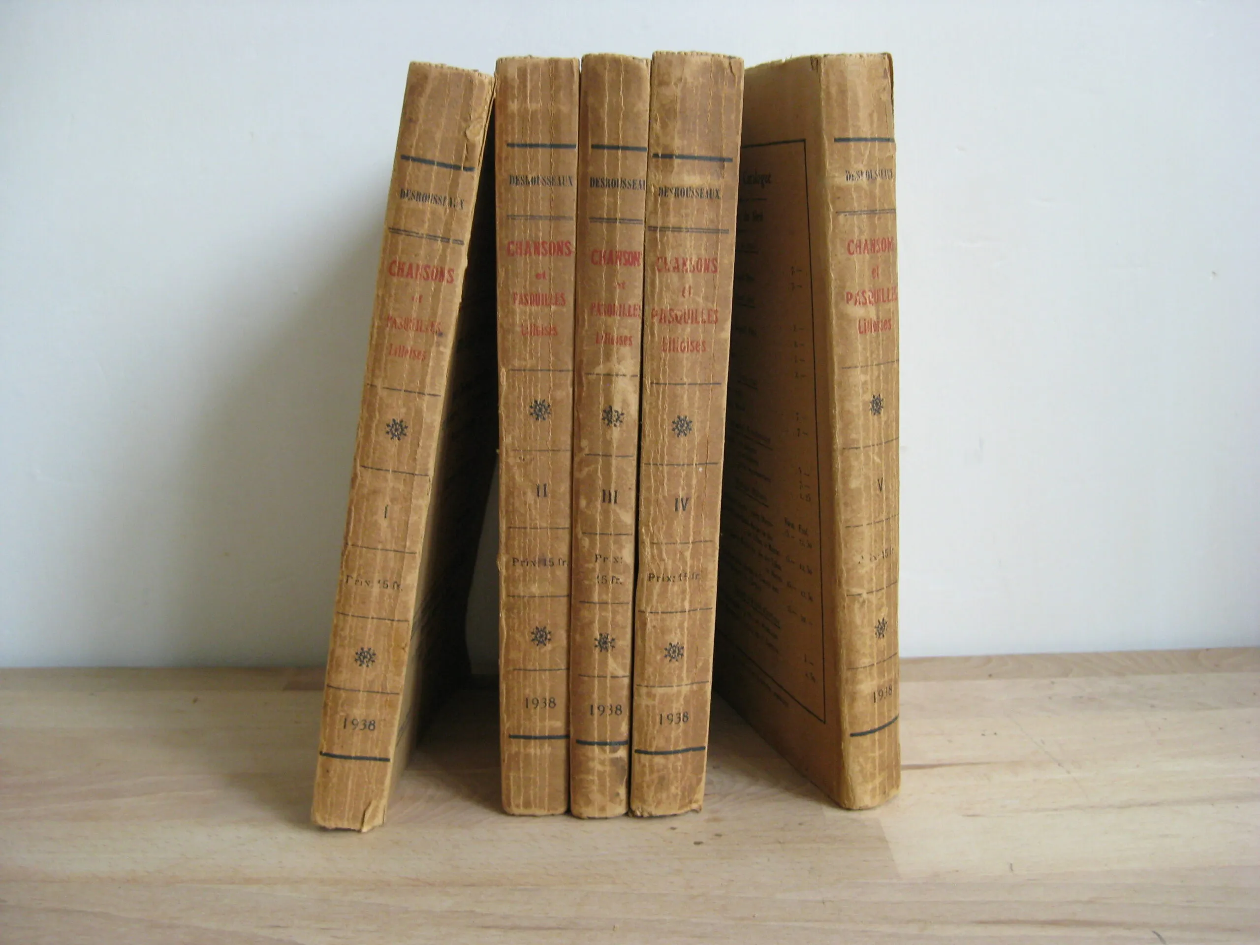 Paperback, 202 x 130, Nouvelles édition 1938. T1, 240p. With table. A lack at the head of the spine and on the cover. T2, 220p. With table. Some foxing on the cover. T3, 186p. With table. T4, 264p. With table. T5, 252p. Followed by the noted tunes, 35p. Then the table. Foxing on the cover, and small tear without loss at the head and foot of the spine. For all volumes, clean interior.