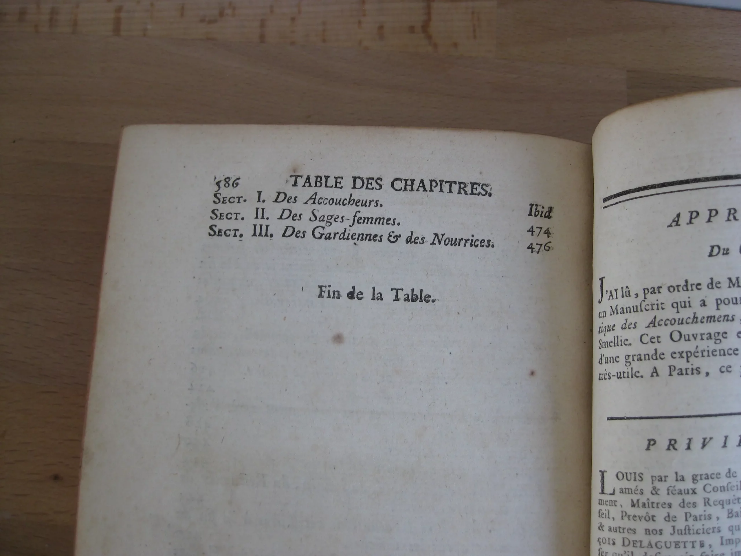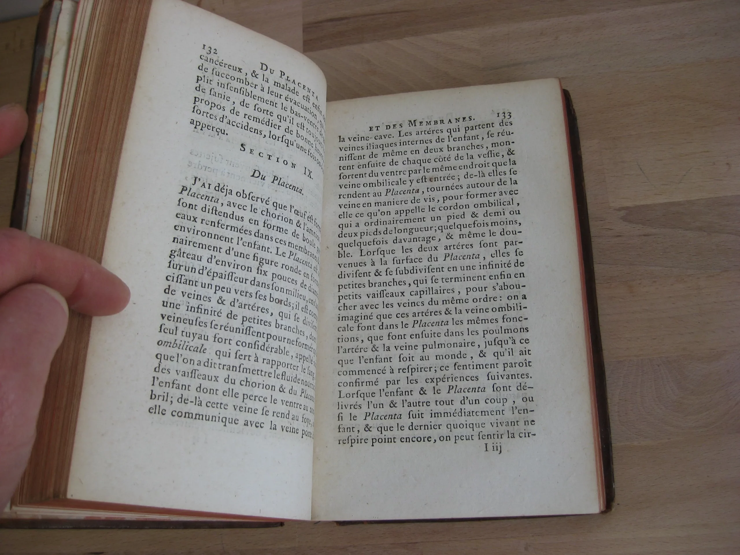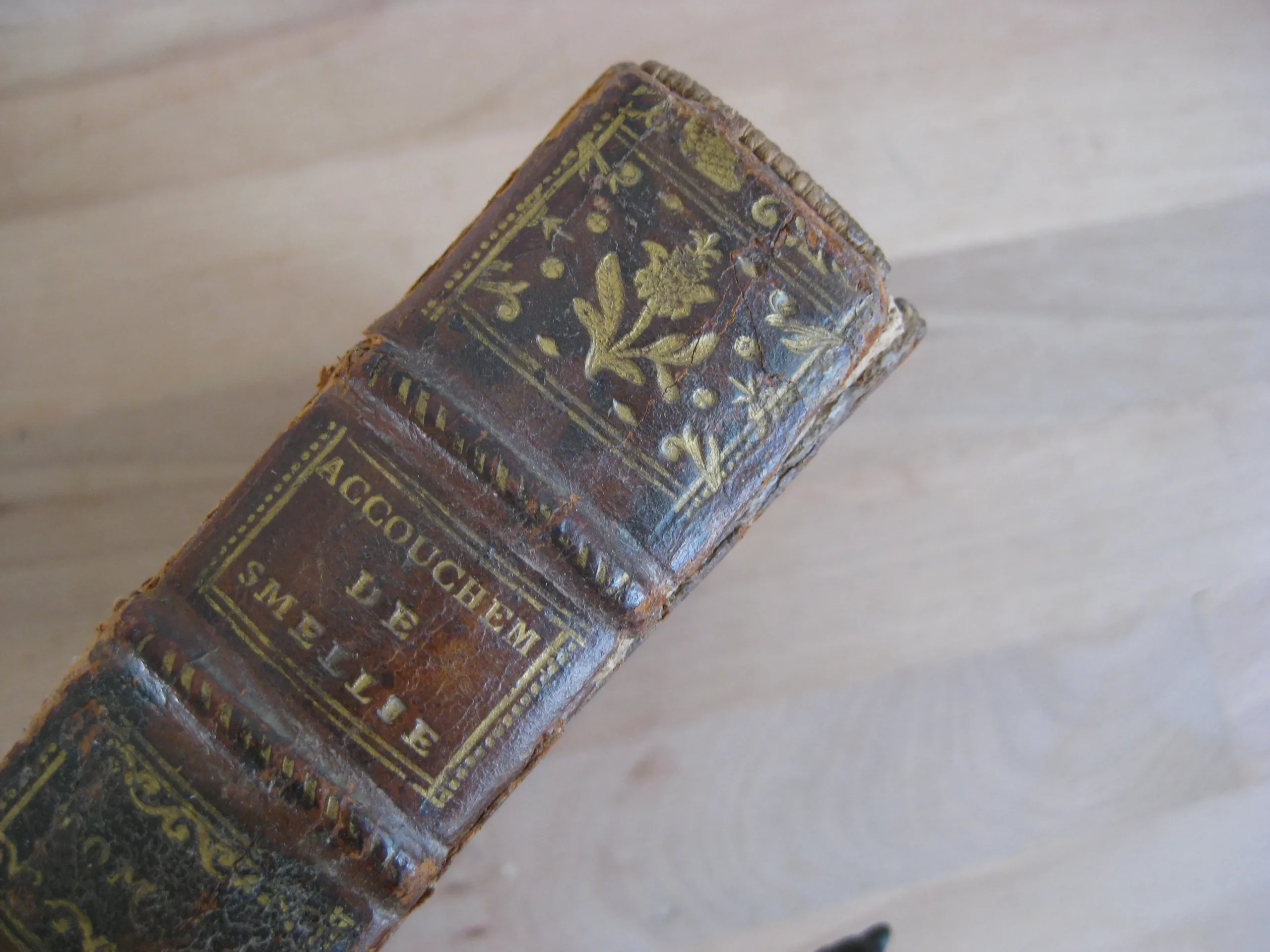 In-8 plein veau tacheté, dos à cinq nerfs, orné d’une pièce de titre, d’une pièce de tomaison, et fleuronné aux caissons, tranches rouges, 202 x 180, 486p. Avec table. 1771. Traduit de l’anglois par M de Préville Première édition en français du premier volume de ce très rare ouvrage d’une importance considérable pour l’art des Accouchements, complet en 4 tomes. Comprend : Avertissement, vj-vij ; Préface, x-xvj. Puis le texte divisé en Introduction et 4 livres. Intérieur très fais, propre et intègre. Coins et champs frottés, coins très légèrement émoussés. Plats frottés, avec griffes et épidermures. Mors supérieur fendu en tête et queue de plats supérieur et inférieur. Dos frotté avec épidermures, coiffe et queue arasées.