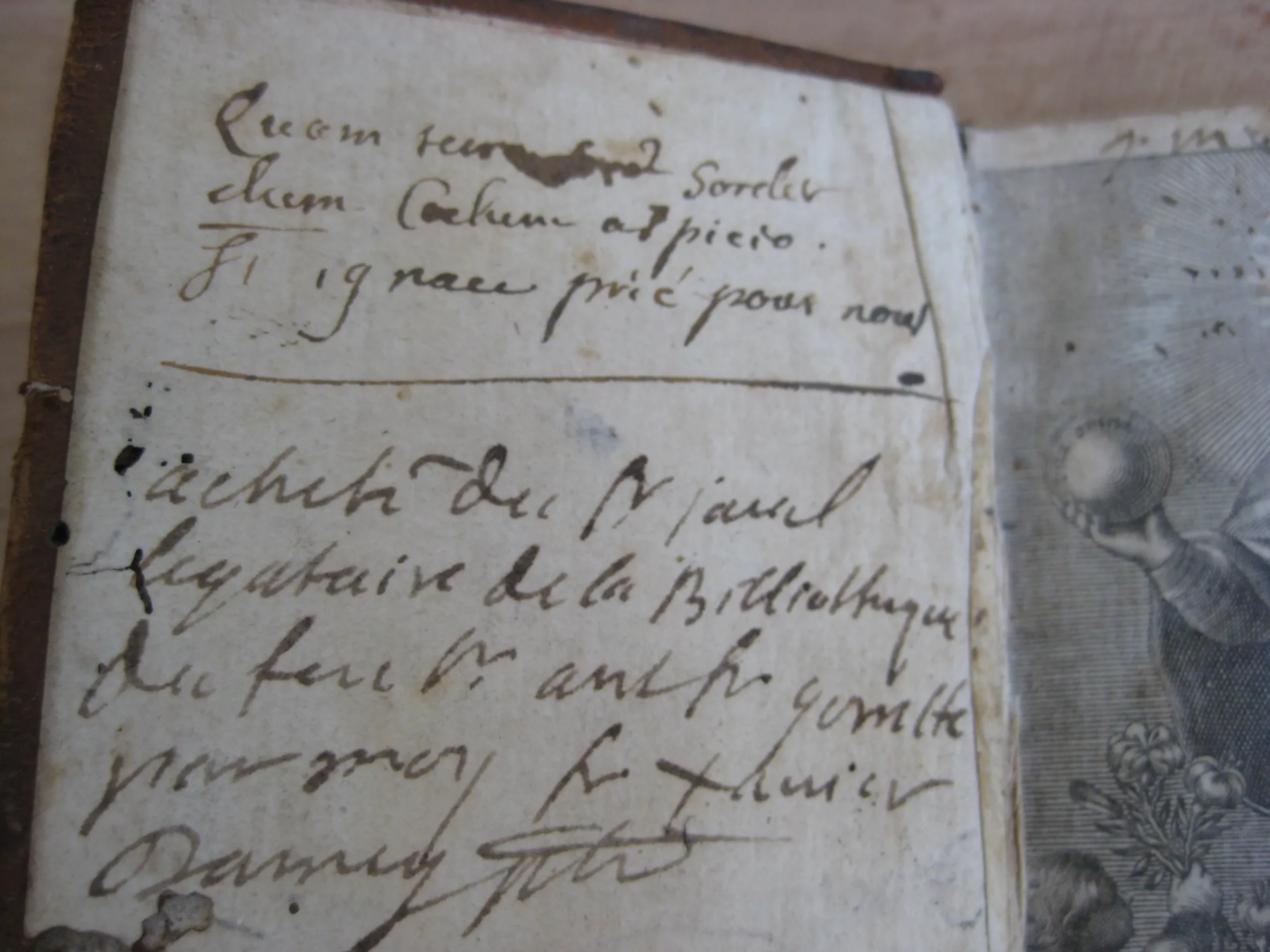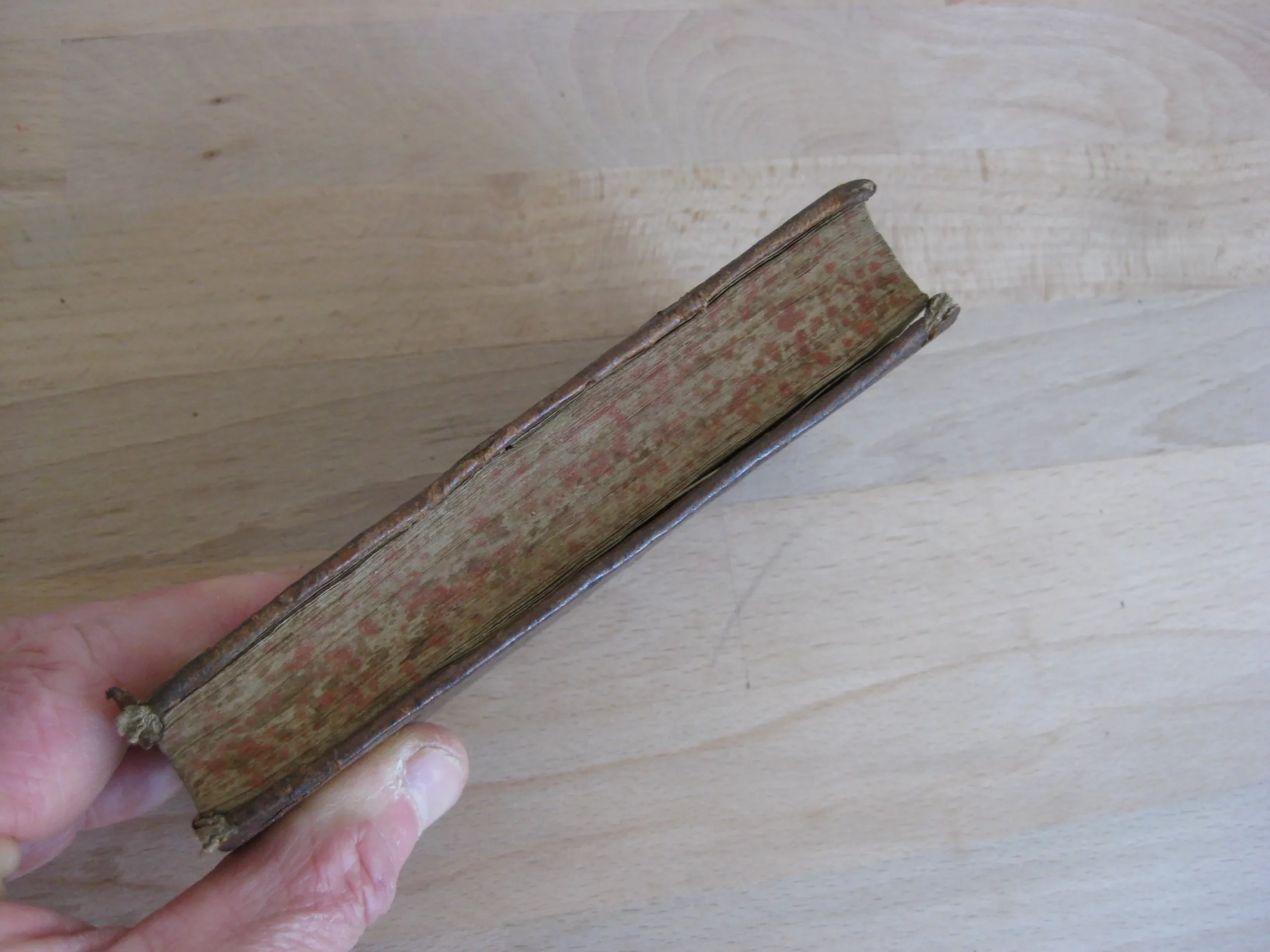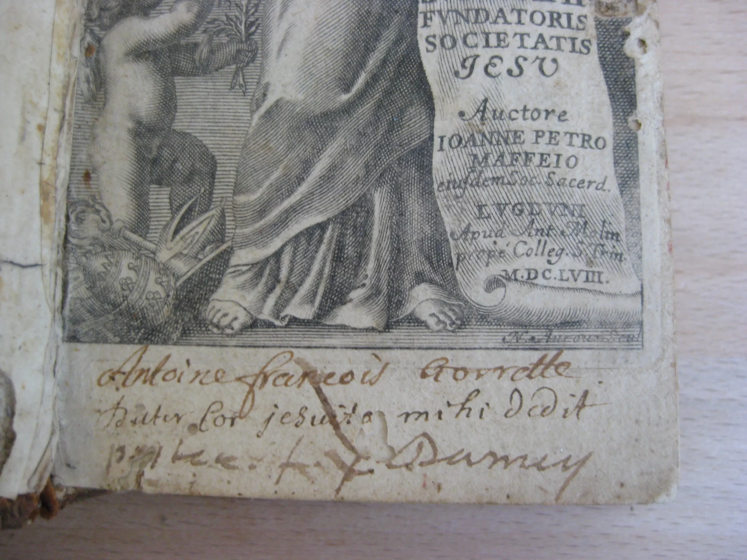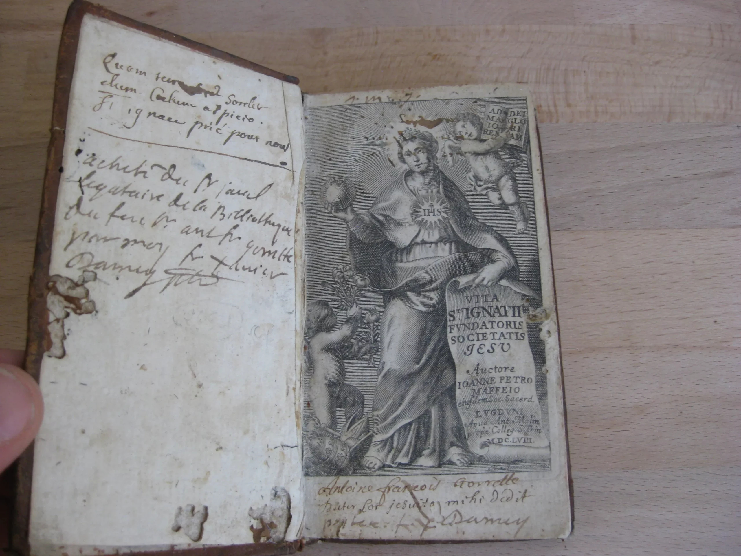 Description1 vol. petit in-12 relié plein veau chiné noir,à quatre nerf orné, tranches jaspées rouges, 133 x 78, 1658. Edition originale. 321 pages, + index, titre gravé, et frontispice gravé représentant Saint-Ignace, les deux par Nicolas Auroux. Adresse Divina Gloriae avant la lettre, 5p. Exemplaire enrichi d’ex-libris manuscrit au titre : Antoine François Gorrette, suivi d’une inscription latine ; ex-libris que l’on retrouve en dernière page vierge. En contreplat supérieur, une prière à St Ignace, et une note sur l’achat du présent exemplaire. Un autre ex-libris est manuscrit en tête du verso au titre : « Girard Prêtre, 1788 » et en tête de première page de texte « à feu Xavier Damey (?) ». Intérieur propre, rousseurs légères ; page de titre avec taches en tête, manque et trou de ver en marge droite avec atteinte à la gravure, trous de vers en marge de pied. On retrouve le petit manque latéral en marge des 4 premières pages. Coins et champs frottés, 3 coins légèrement émoussés. Champ et bord de plat supérieur avec trou de vers et épidermure. Tête de mors supérieur avec enfoncement et petit manque, coup et petit manque qui touche le premier caisson également. Bon exemplaire de cette assez rare édition originale.