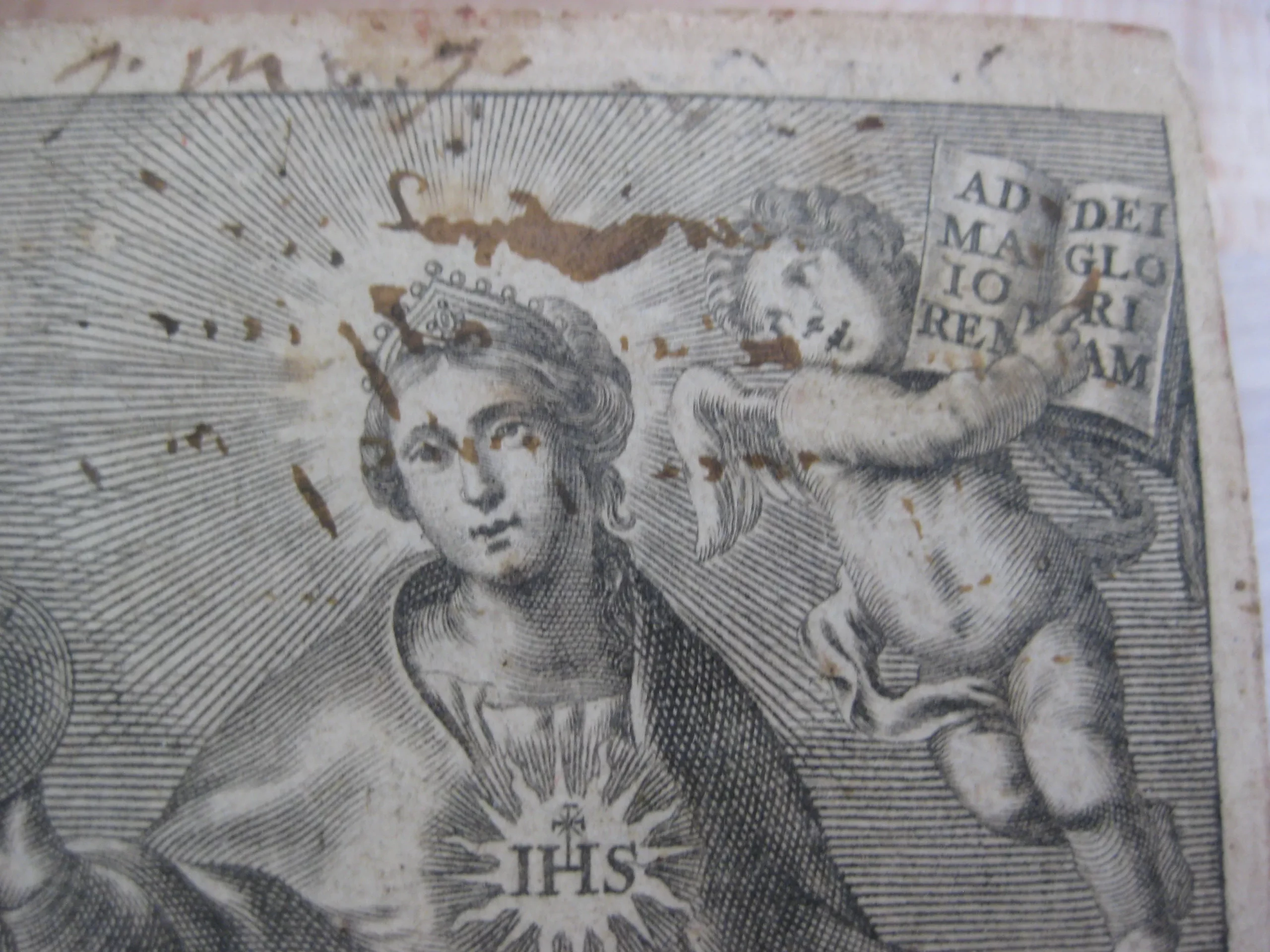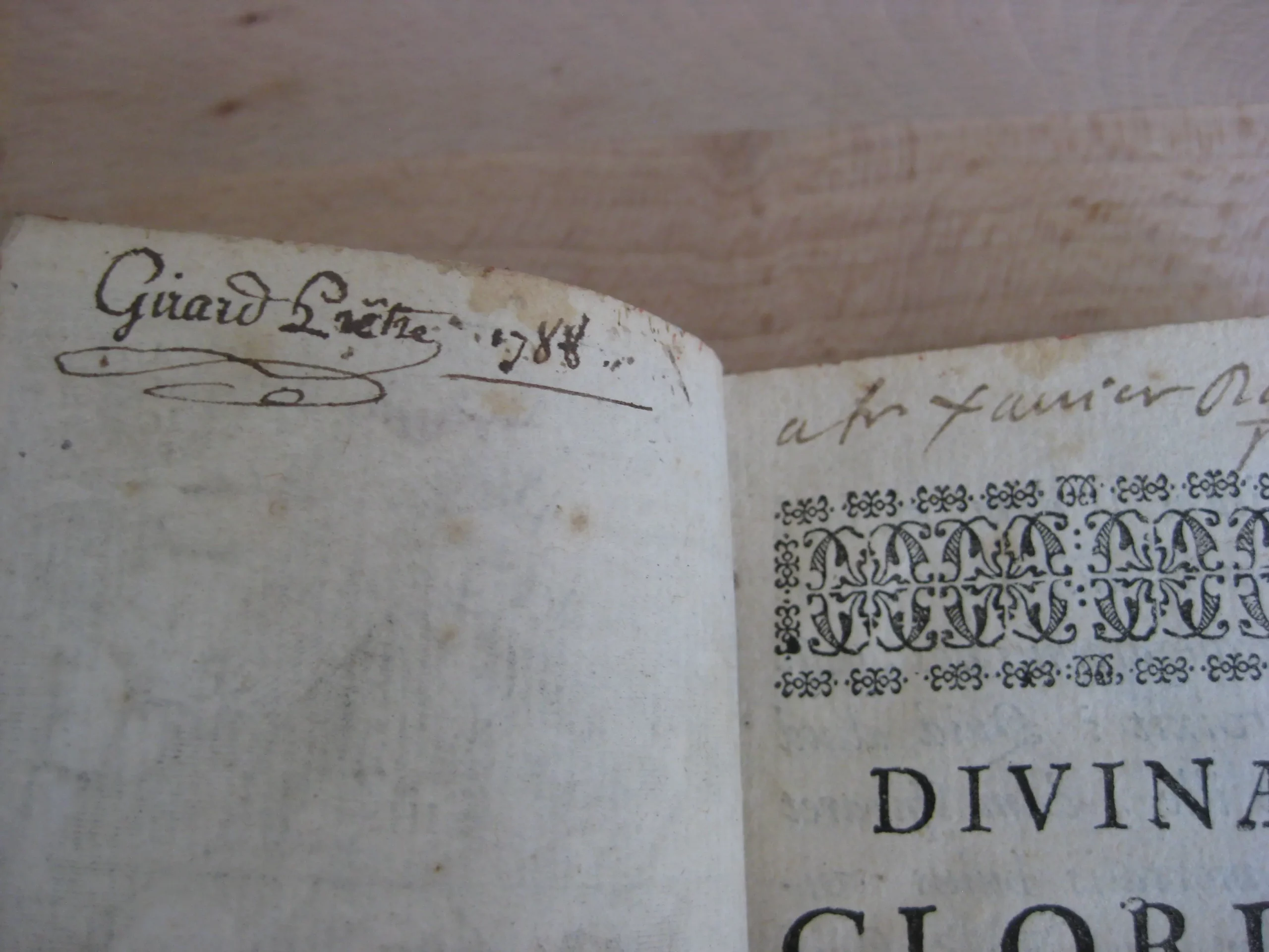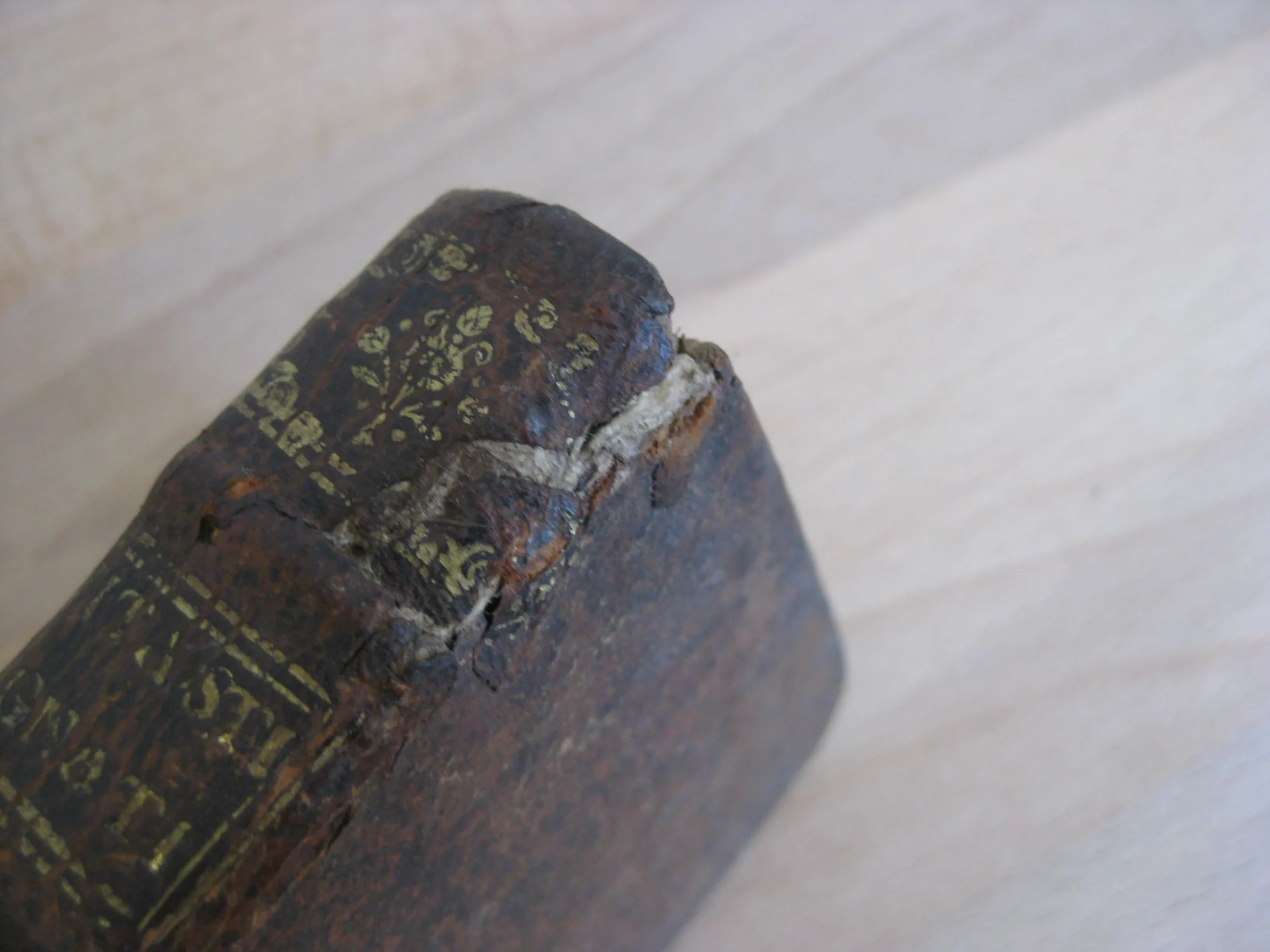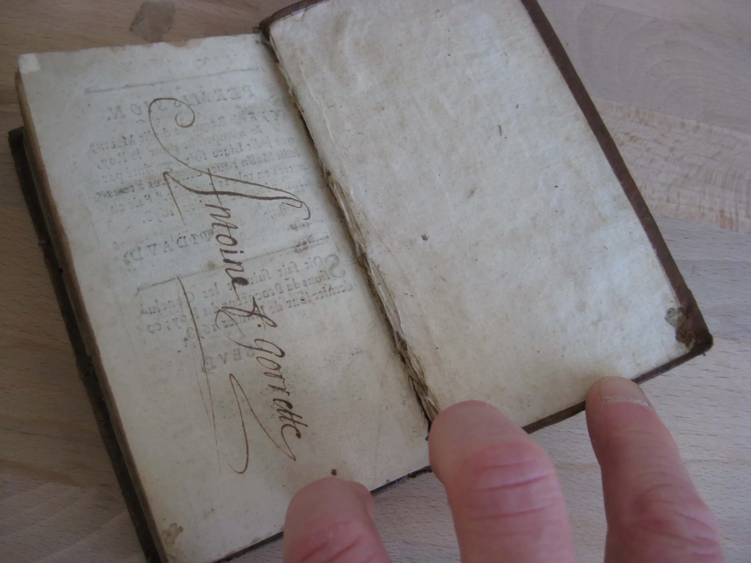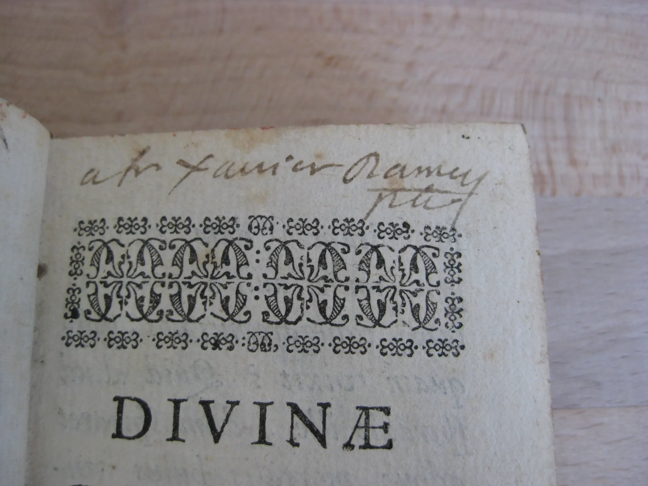 Description1 vol. petit in-12 relié plein veau chiné noir,à quatre nerf orné, tranches jaspées rouges, 133 x 78, 1658. Edition originale. 321 pages, + index, titre gravé, et frontispice gravé représentant Saint-Ignace, les deux par Nicolas Auroux. Adresse Divina Gloriae avant la lettre, 5p. Exemplaire enrichi d’ex-libris manuscrit au titre : Antoine François Gorrette, suivi d’une inscription latine ; ex-libris que l’on retrouve en dernière page vierge. En contreplat supérieur, une prière à St Ignace, et une note sur l’achat du présent exemplaire. Un autre ex-libris est manuscrit en tête du verso au titre : « Girard Prêtre, 1788 » et en tête de première page de texte « à feu Xavier Damey (?) ». Intérieur propre, rousseurs légères ; page de titre avec taches en tête, manque et trou de ver en marge droite avec atteinte à la gravure, trous de vers en marge de pied. On retrouve le petit manque latéral en marge des 4 premières pages. Coins et champs frottés, 3 coins légèrement émoussés. Champ et bord de plat supérieur avec trou de vers et épidermure. Tête de mors supérieur avec enfoncement et petit manque, coup et petit manque qui touche le premier caisson également. Bon exemplaire de cette assez rare édition originale.