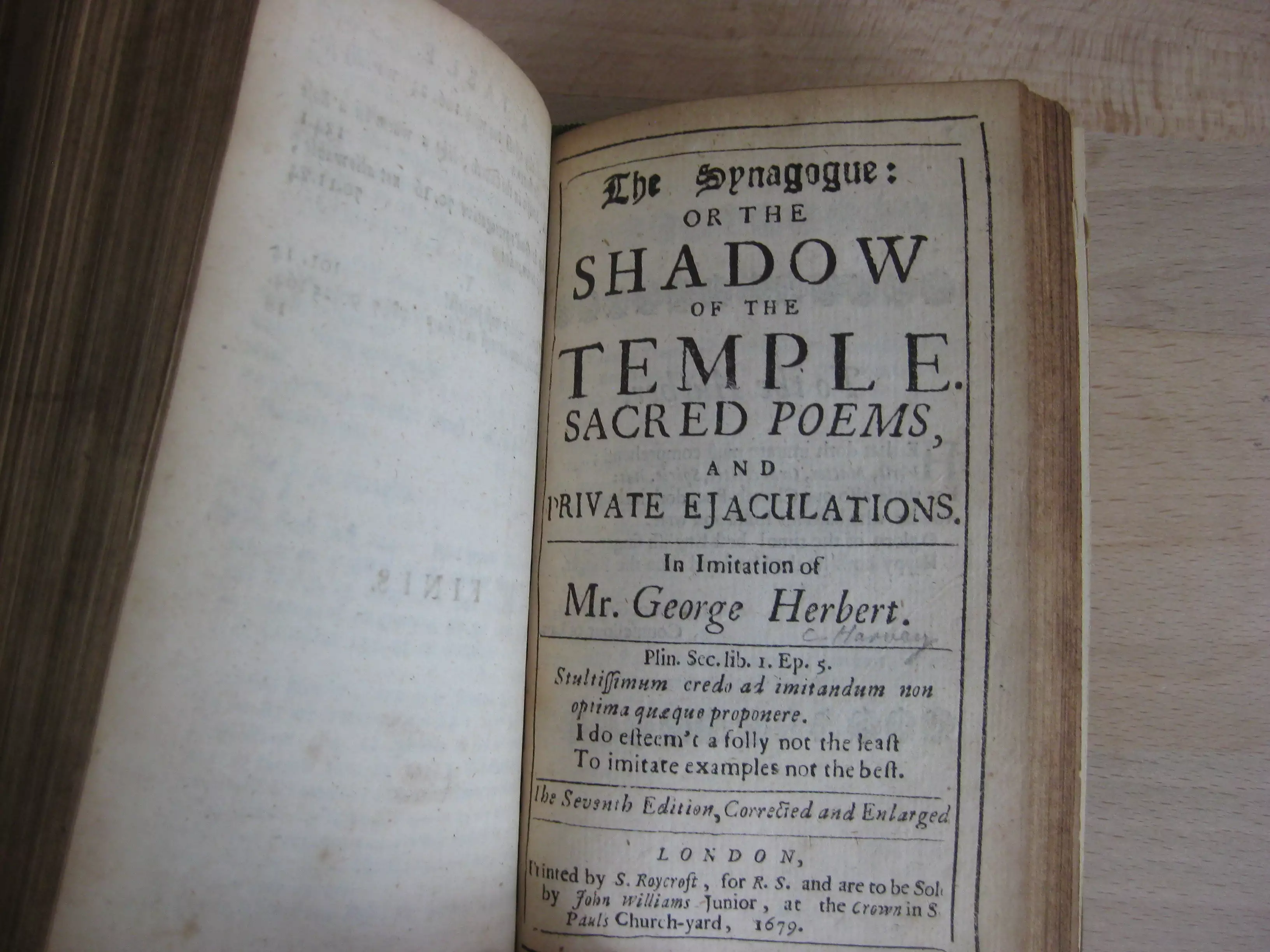 Suivi de The Synagogue: or, the Shadow of the Temple. Sacred poems, and private ejaculations. In imitation of Mr. George Herbert, sans mention d’auteur [Christopher Harvey ; titre paru anonymement dans l’édition de 1640 des poèmes de G. Herbert, et souvent repris dans les éditons suivantes], 1679, 71p.
