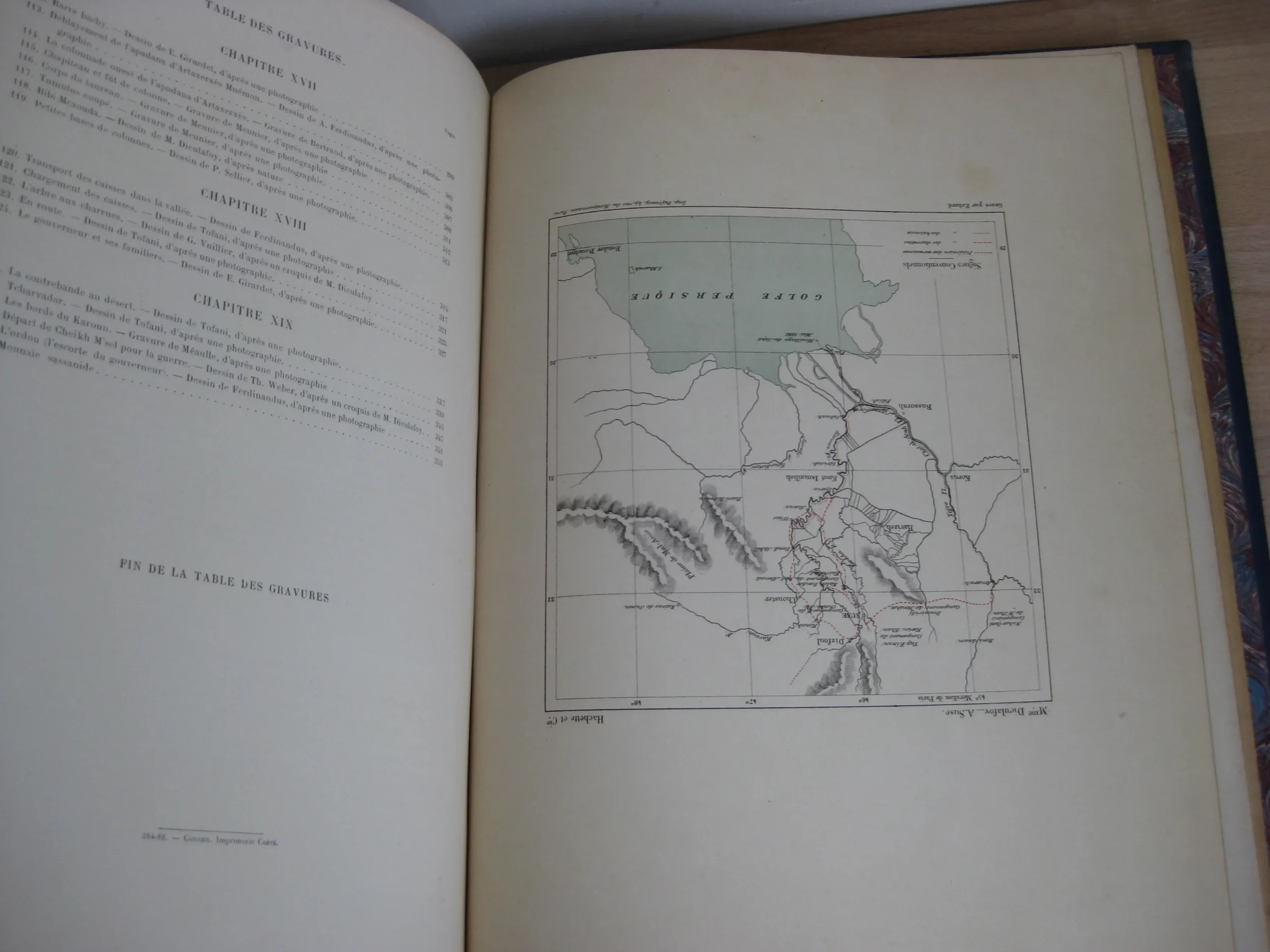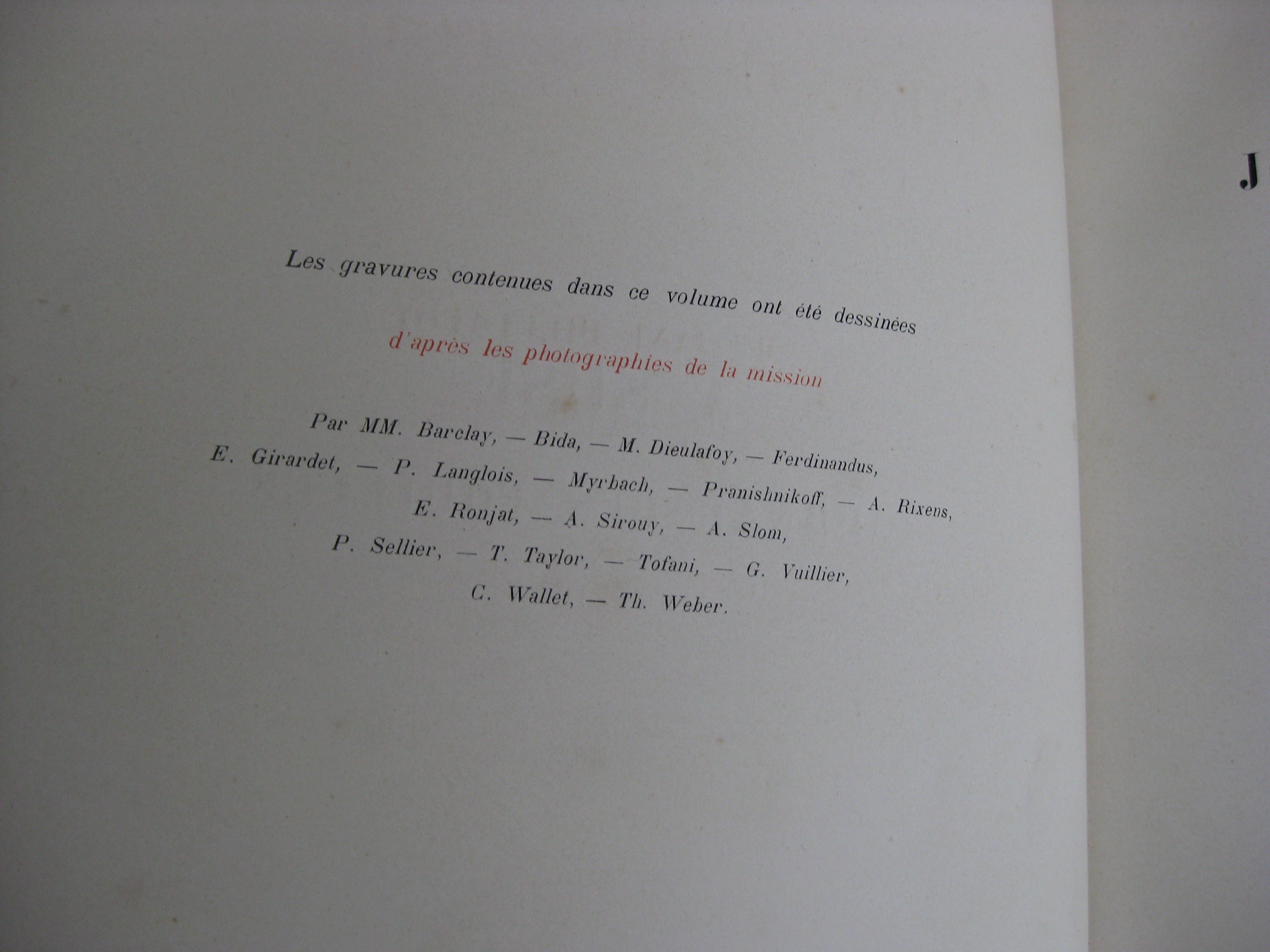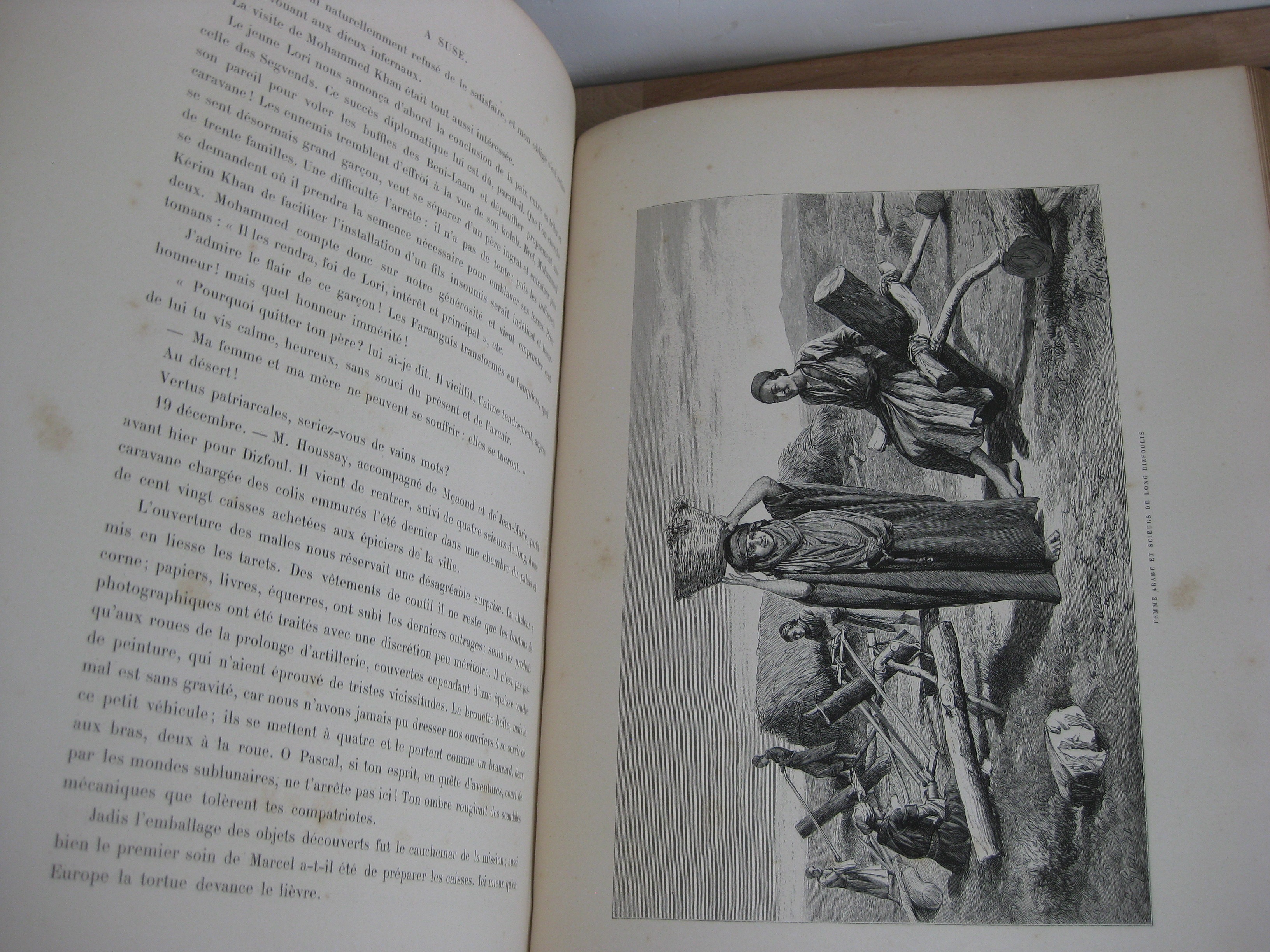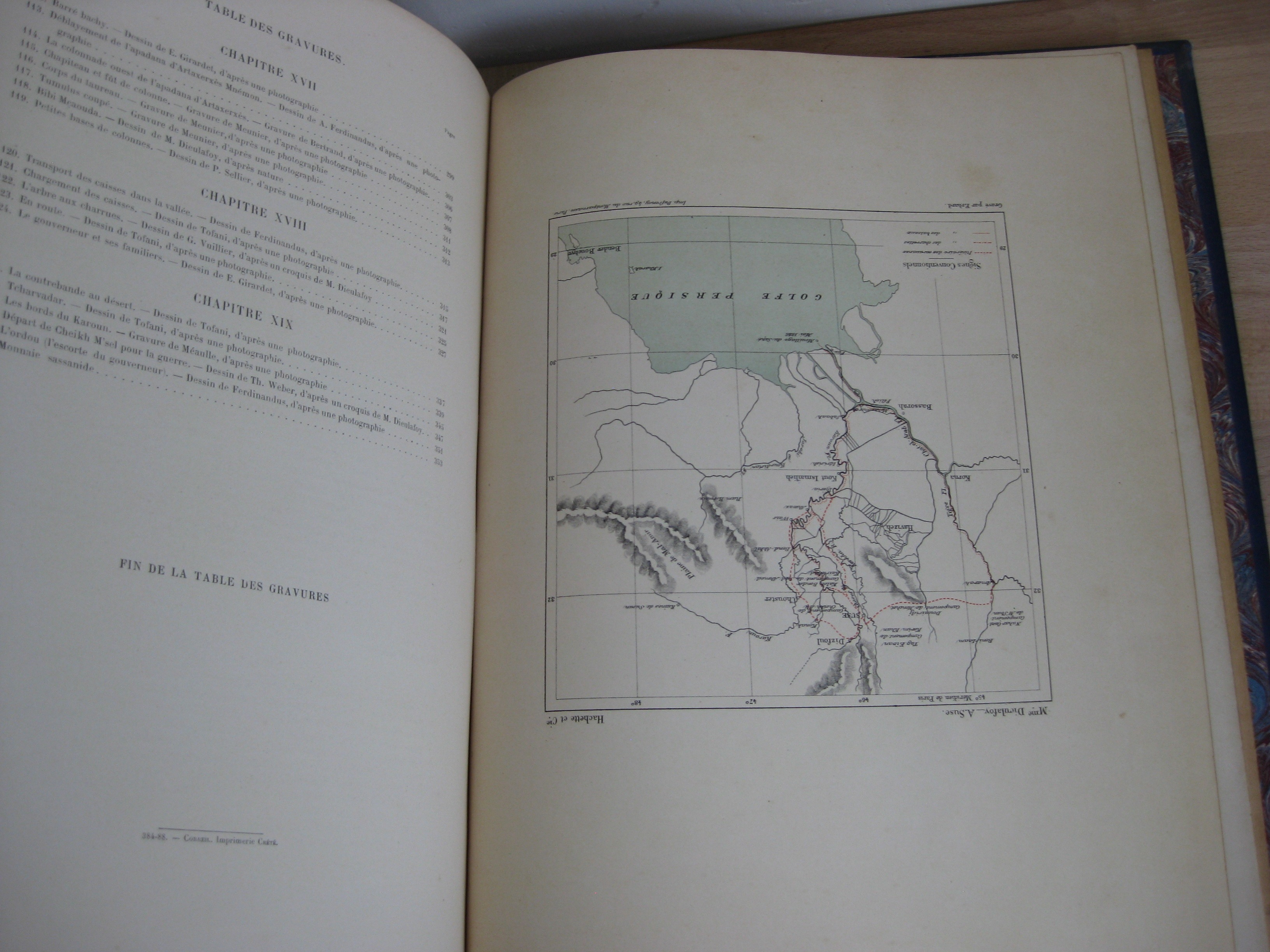 Librairie Hachette et Cie – Demi-chagrin bleu, plats de percaline, 340 x 260, toutes tranches dorées, signet mauve, Plats illustrés à l’identique : motifs géométriques bleus sur fond crème sur lequel se détachent des rameaux de feuillus et un médaillon argenté (aux motifs assyriens). Dos orné de motifs floraux) et de cartouche de titre et d’éditeur sur fond argenté. 366p. Avec table. 1888. Édition originale illustrée de 121 gravures sur bois : in-texte, entêtes, culs-de-lampes, et à pleine page (38) d’après les photographies de la mission Barclay, Bida, Dieulafoy, Ferdinandus, Girardet, etc. Et une carte couleur in fine (intègre, mais montée à l’envers).