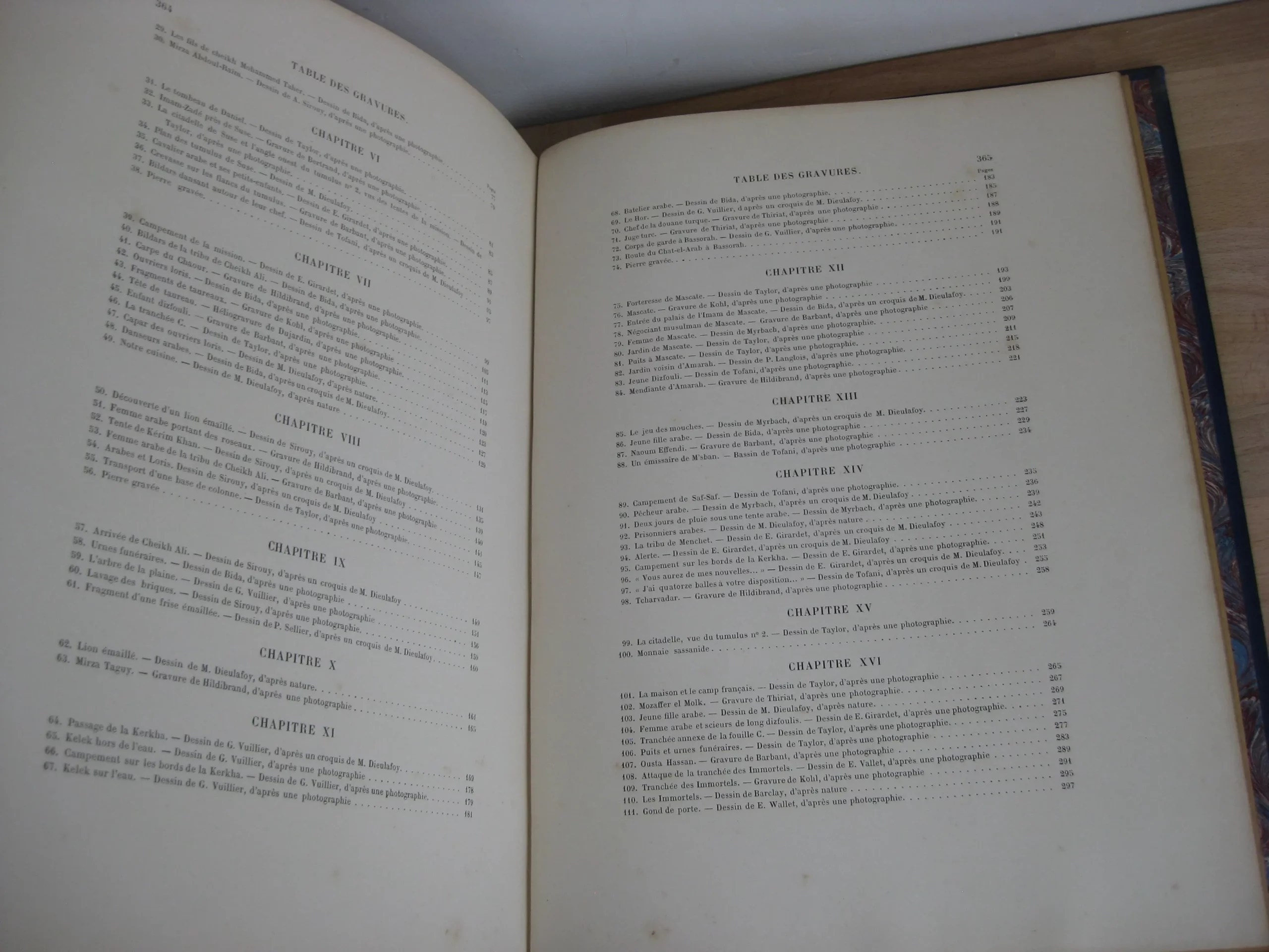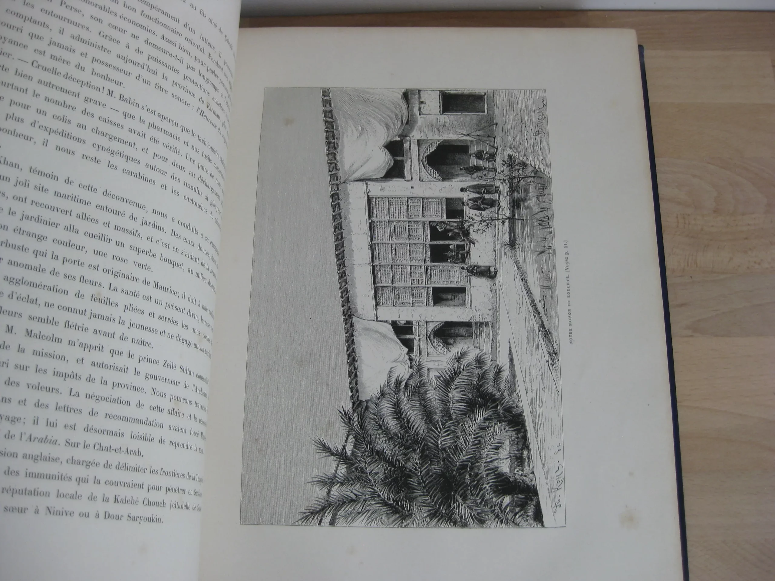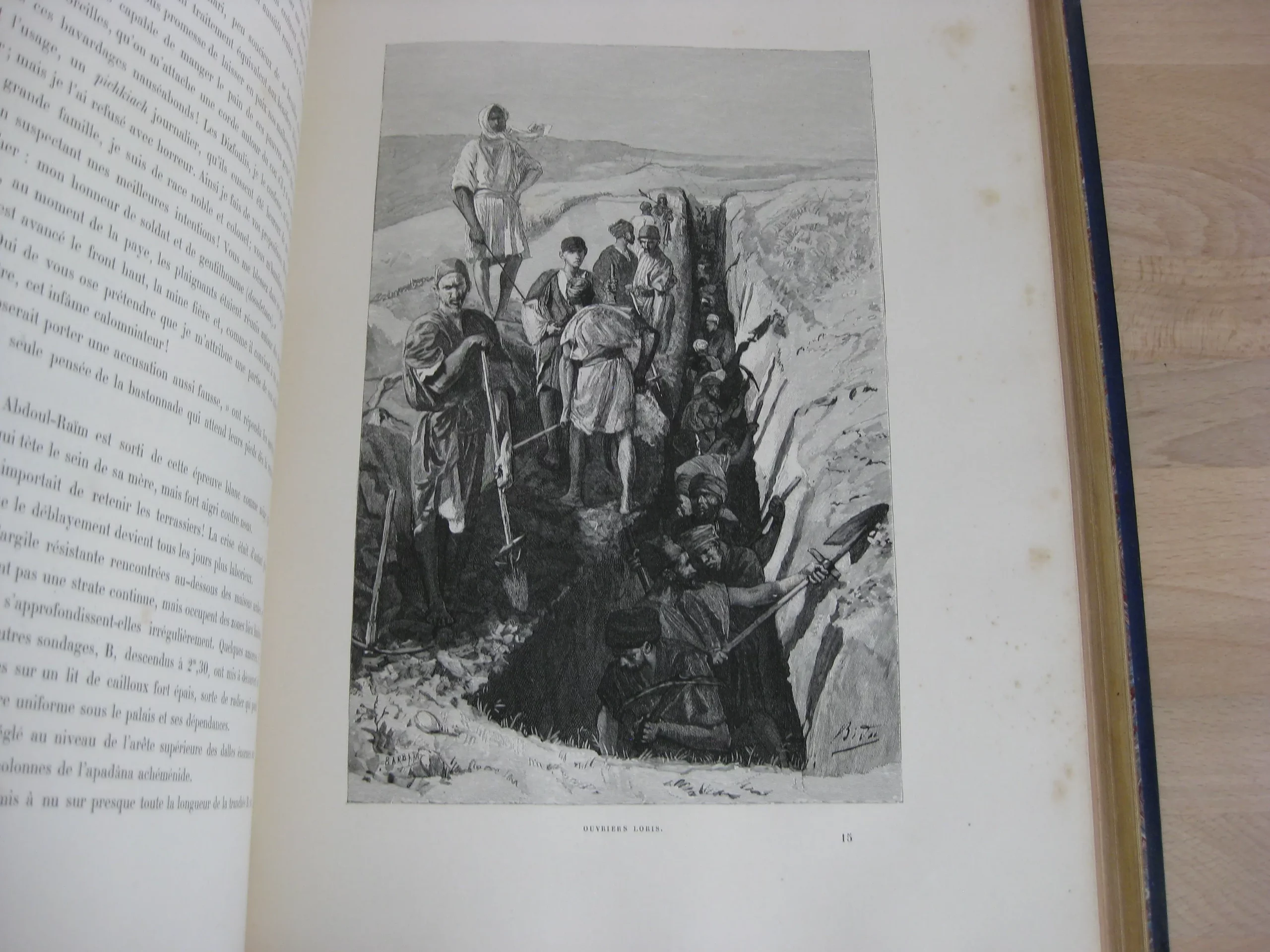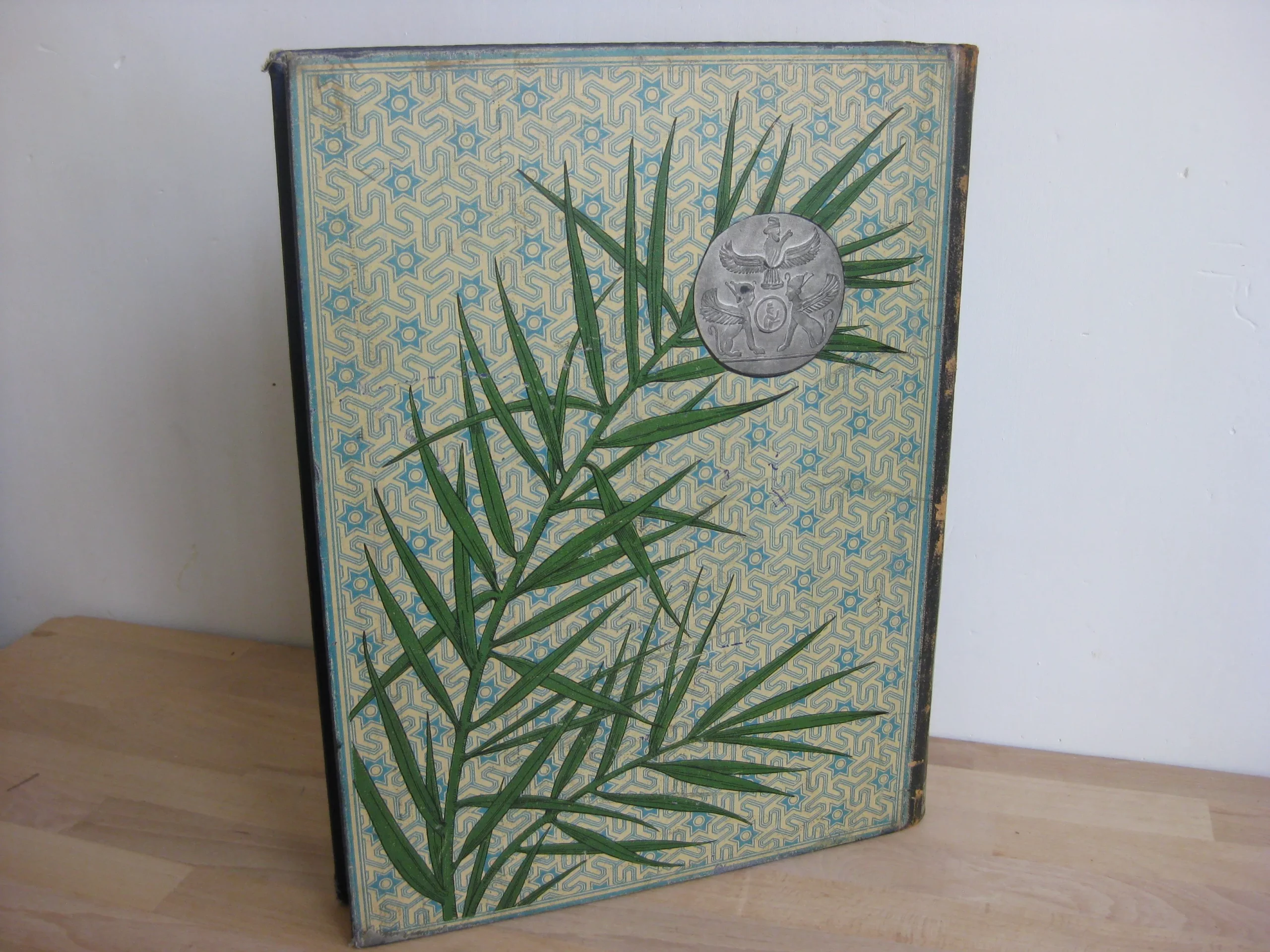 Librairie Hachette et Cie – Demi-chagrin bleu, plats de percaline, 340 x 260, toutes tranches dorées, signet mauve, Plats illustrés à l’identique : motifs géométriques bleus sur fond crème sur lequel se détachent des rameaux de feuillus et un médaillon argenté (aux motifs assyriens). Dos orné de motifs floraux) et de cartouche de titre et d’éditeur sur fond argenté. 366p. Avec table. 1888. Édition originale illustrée de 121 gravures sur bois : in-texte, entêtes, culs-de-lampes, et à pleine page (38) d’après les photographies de la mission Barclay, Bida, Dieulafoy, Ferdinandus, Girardet, etc. Et une carte couleur in fine (intègre, mais montée à l’envers).