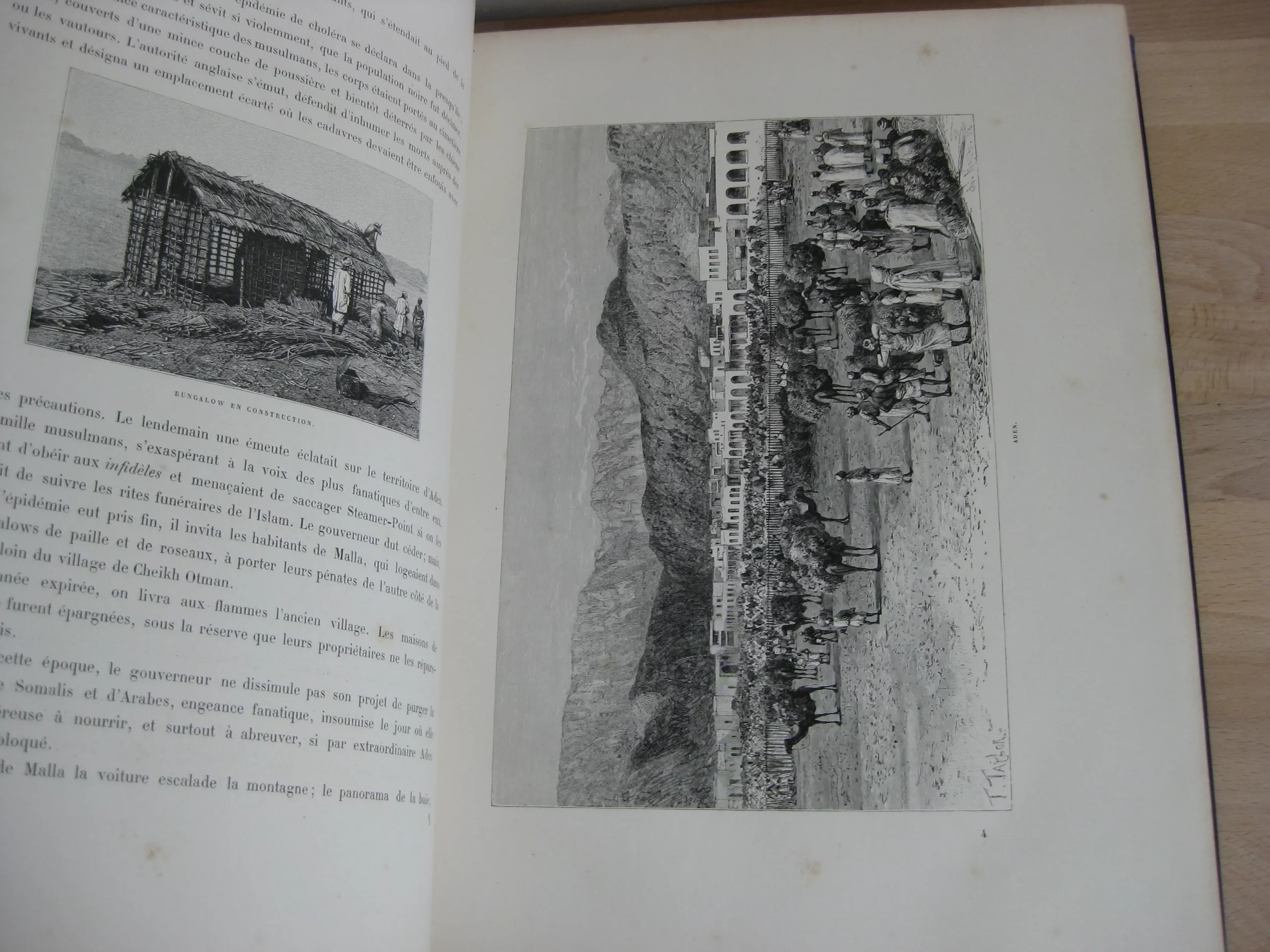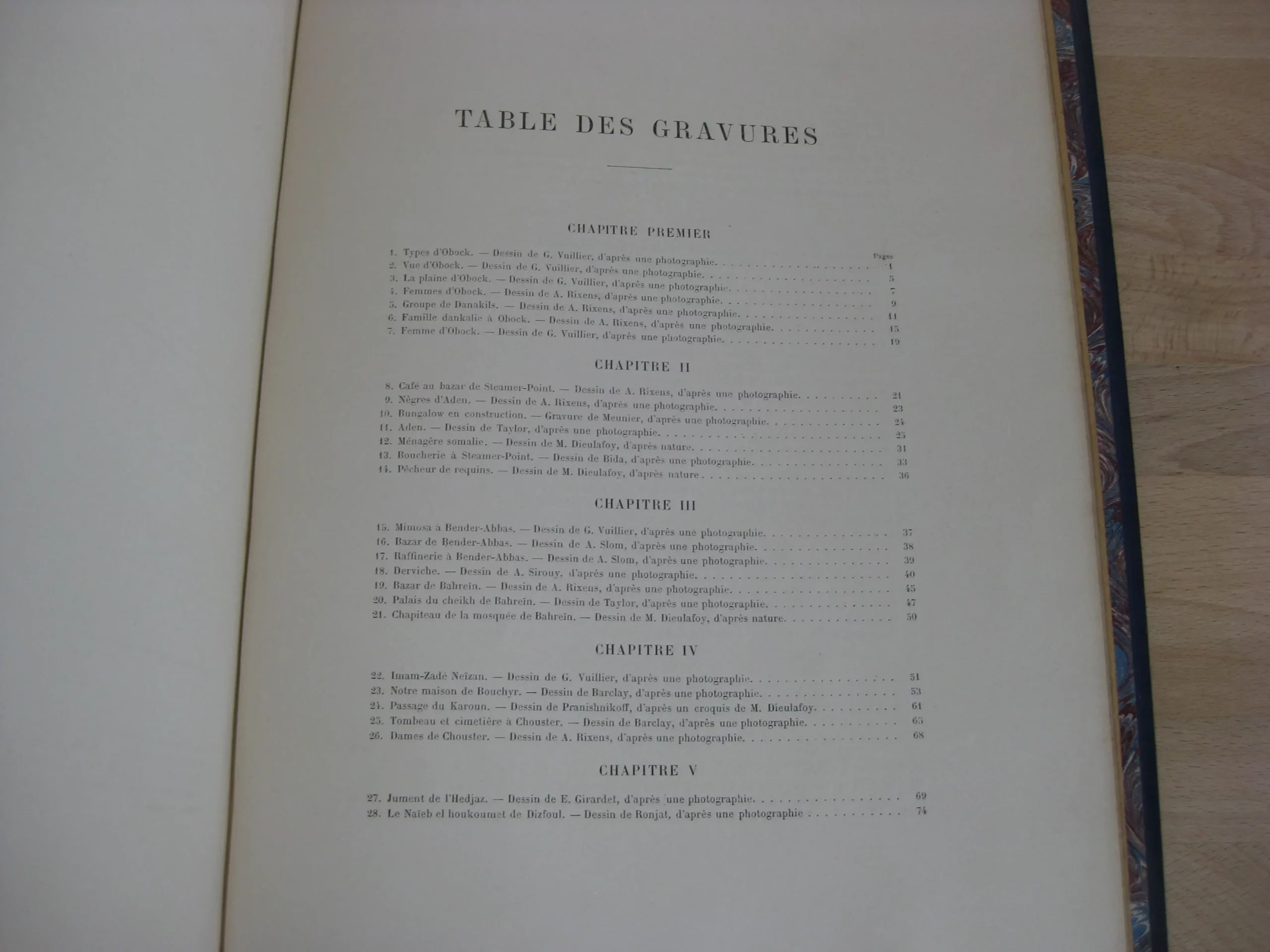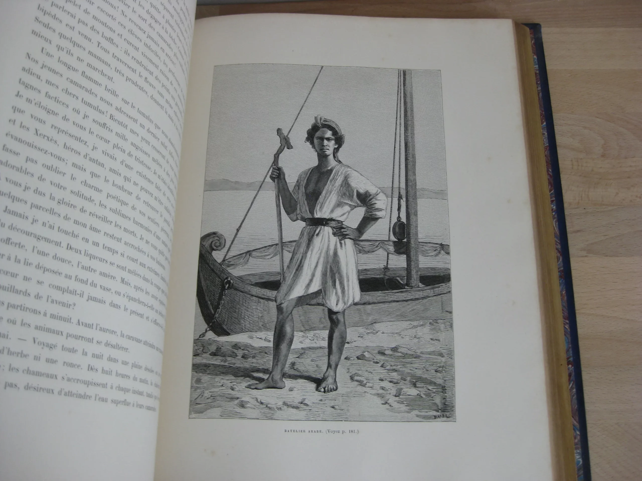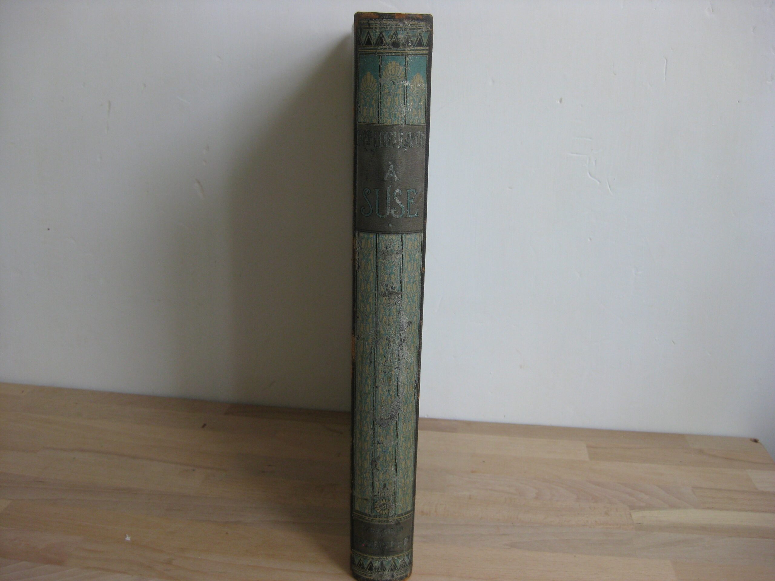 Librairie Hachette et Cie – Demi-chagrin bleu, plats de percaline, 340 x 260, toutes tranches dorées, signet mauve, Plats illustrés à l’identique : motifs géométriques bleus sur fond crème sur lequel se détachent des rameaux de feuillus et un médaillon argenté (aux motifs assyriens). Dos orné de motifs floraux) et de cartouche de titre et d’éditeur sur fond argenté. 366p. Avec table. 1888. Édition originale illustrée de 121 gravures sur bois : in-texte, entêtes, culs-de-lampes, et à pleine page (38) d’après les photographies de la mission Barclay, Bida, Dieulafoy, Ferdinandus, Girardet, etc. Et une carte couleur in fine (intègre, mais montée à l’envers).
