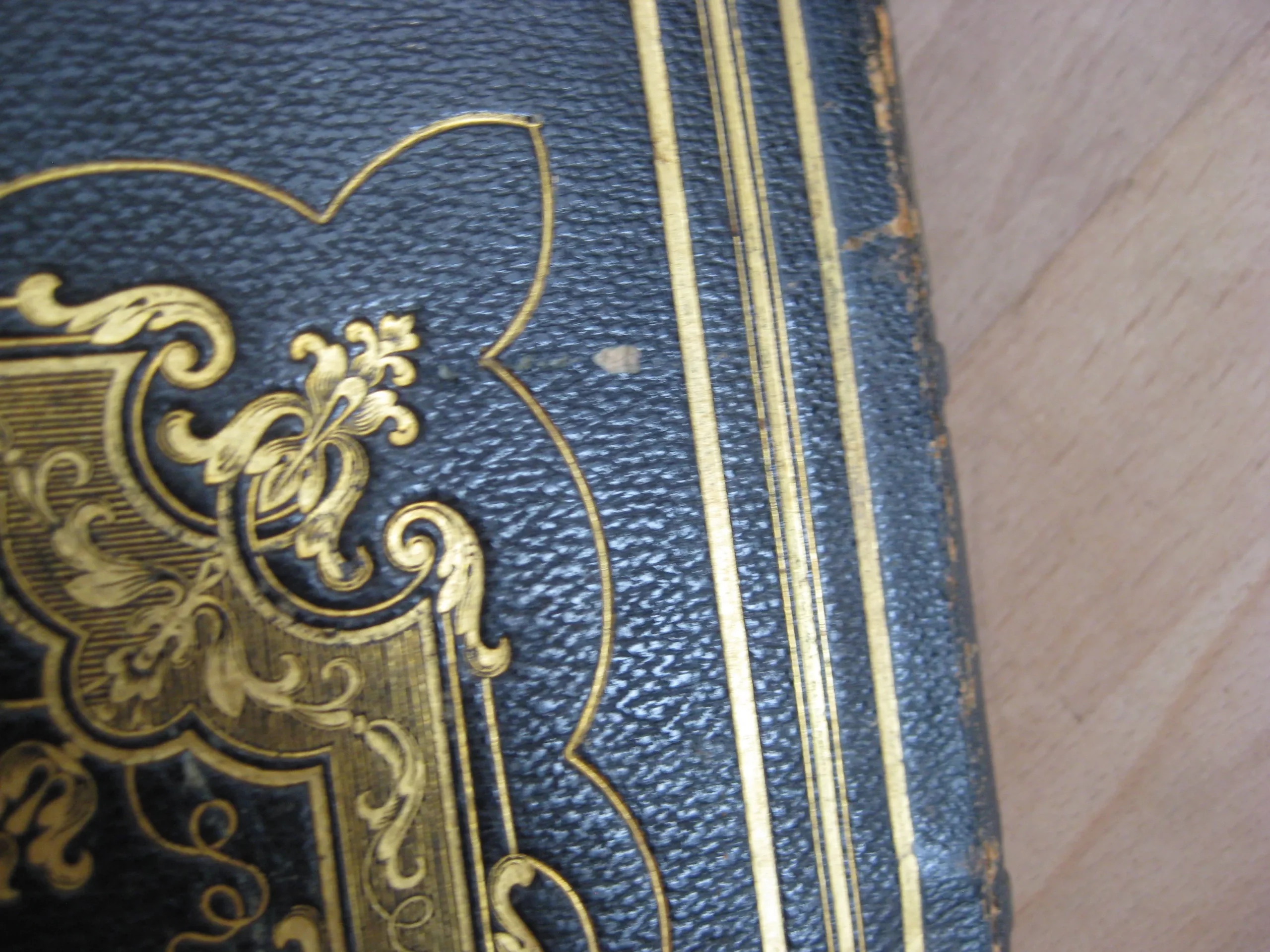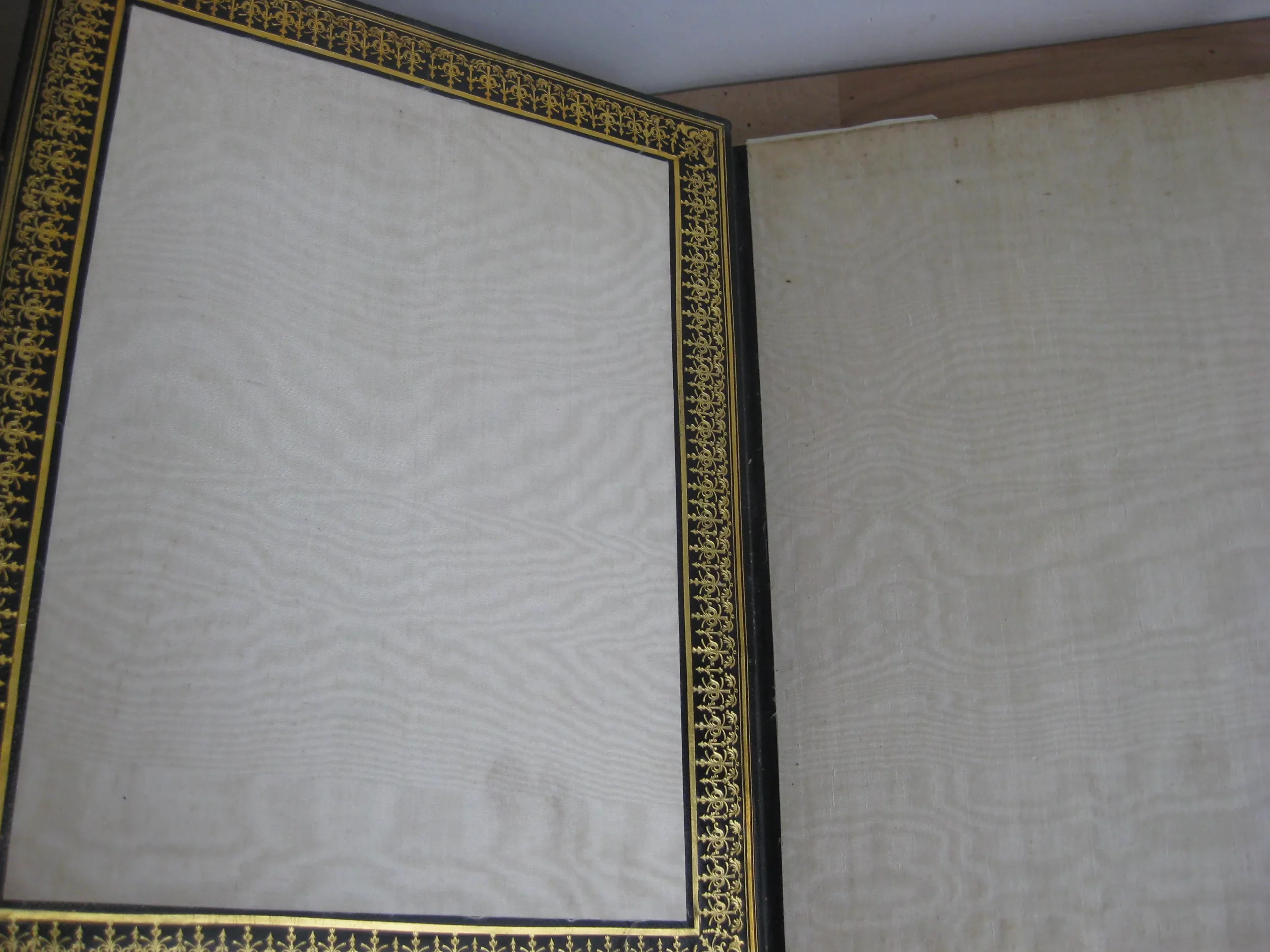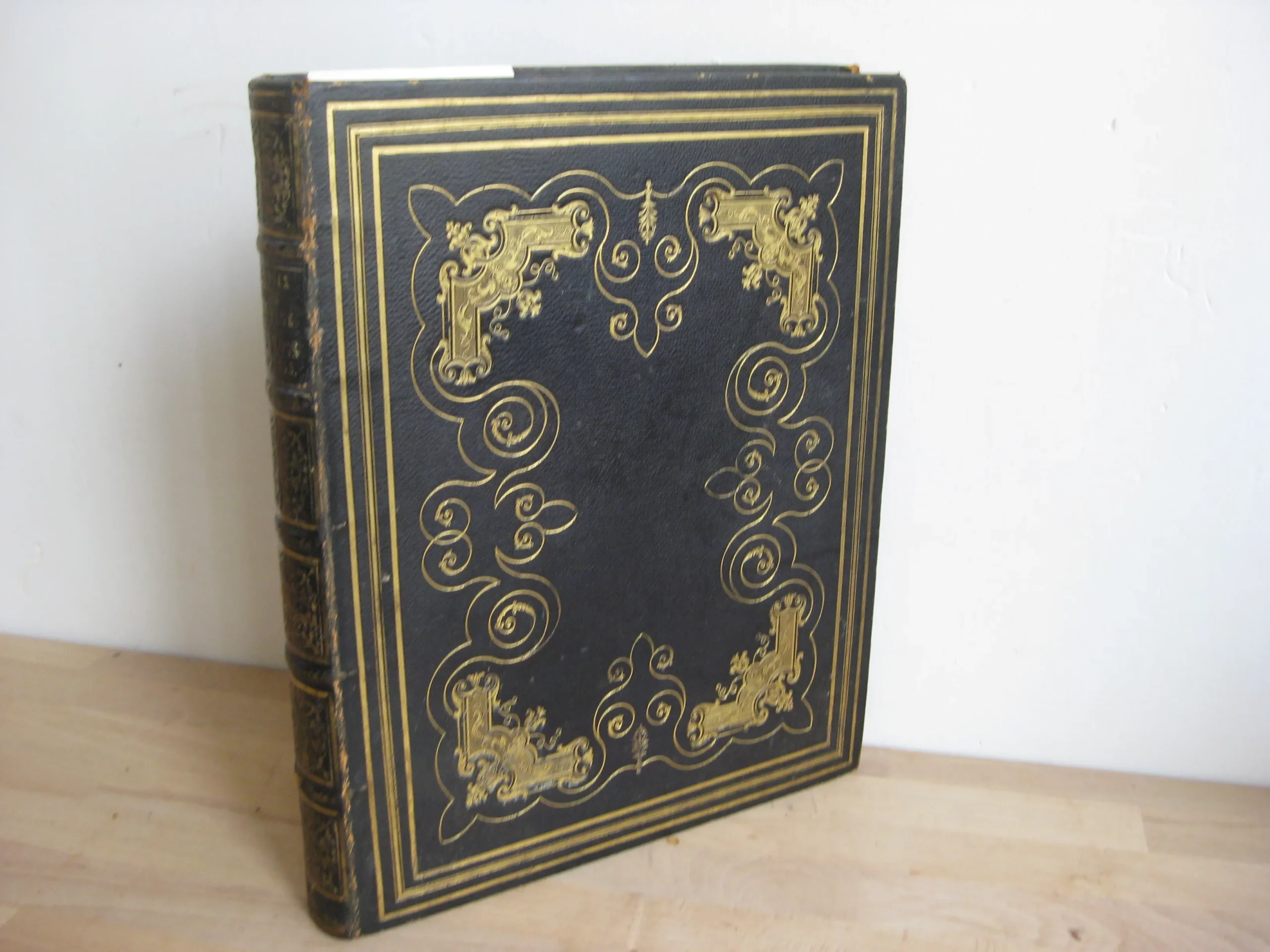 Plein chagrin noir à petits grains, In 4, dos à 5 nerfs très richement orné aux caissons, plats joliment orné de motifs dorés dans un triple encadrement, tranches dorées, large signet-ruban de soie mauve, contreplats doublés de soie blanche dans une encadrement guirlande doré, 314 x 253, 1835. Edition originale. Comprend :