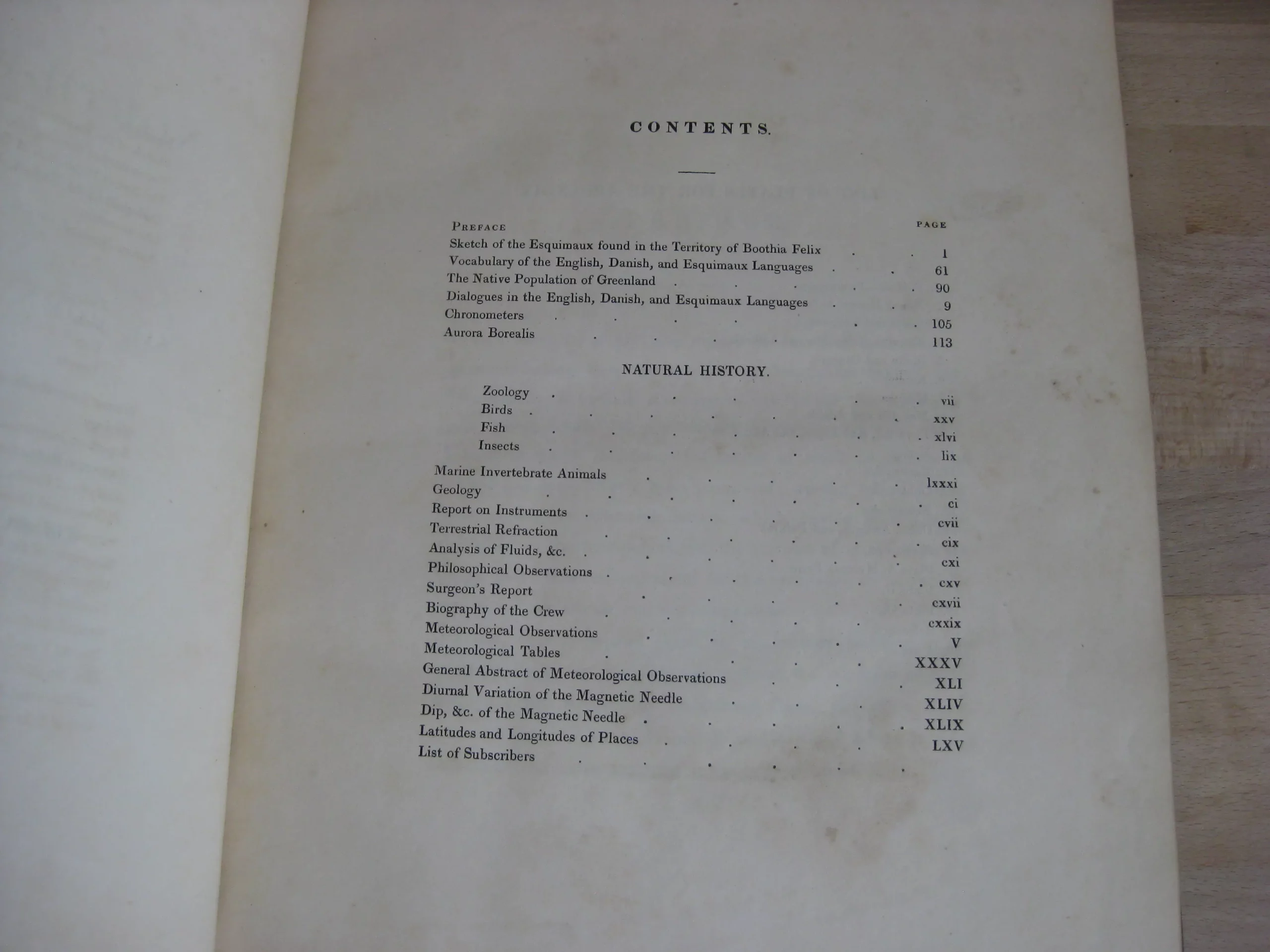 Puis : 1-120pp. Sketch of the Esquimaux found… ; Vocabulary of the English, Danish and Esquimaux langages ; The Native Population of Greenland ; Chronometers ; Aurora Borealis.
