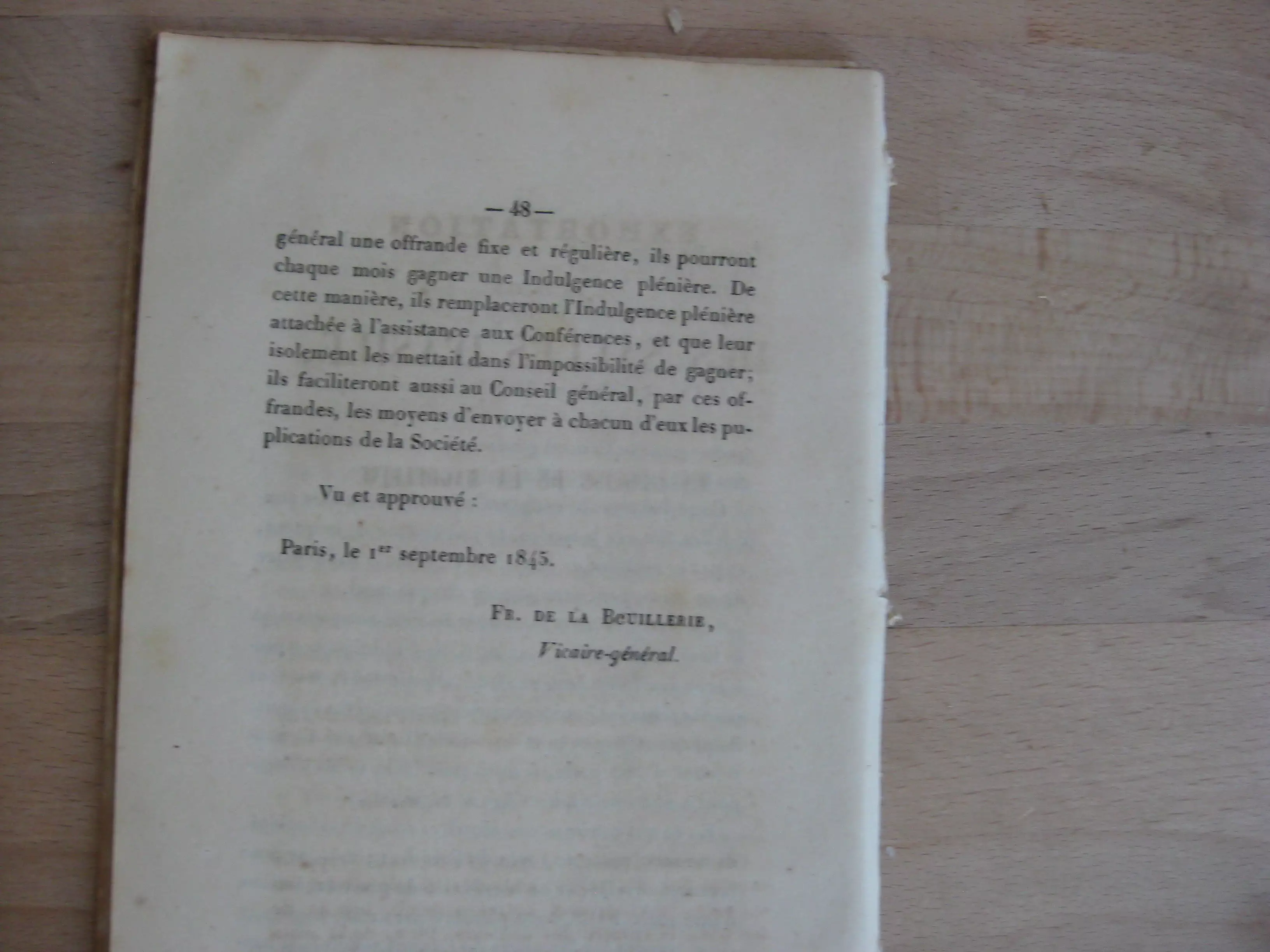Broché issu de reliure, 207 x 130, 48p. 1845. Comprend plusieurs textes à la suite dans une seule pagination : le Bref, 4p. Puis Grégoire XVI, pape. Afin d’en perpétuer la mémoire, du même auteur, 4p. Puis : Ordonnances d’exaquatur de NN. SS. Les archevêques et évêques de France, 24p. Puis : Instruction 1. Des indulgences en général, 8p. Par F. Dupanloup. Puis Bref supplémentaire Gregorius PP. XVI, 2p. A. Card. Lambruschini, puis Grégoire XVI, pape. Afin d’en perpétuer la mémoire, du même auteur,(pas le même texte que précédemment), 3p. In fine : Instruction sur les indulgences accordées aux bienfaiteurs de la société de Saint-Vincent de Paul. Rousseurs fortes en début, puis plus marginales. 2 premiers feuillets détachés.