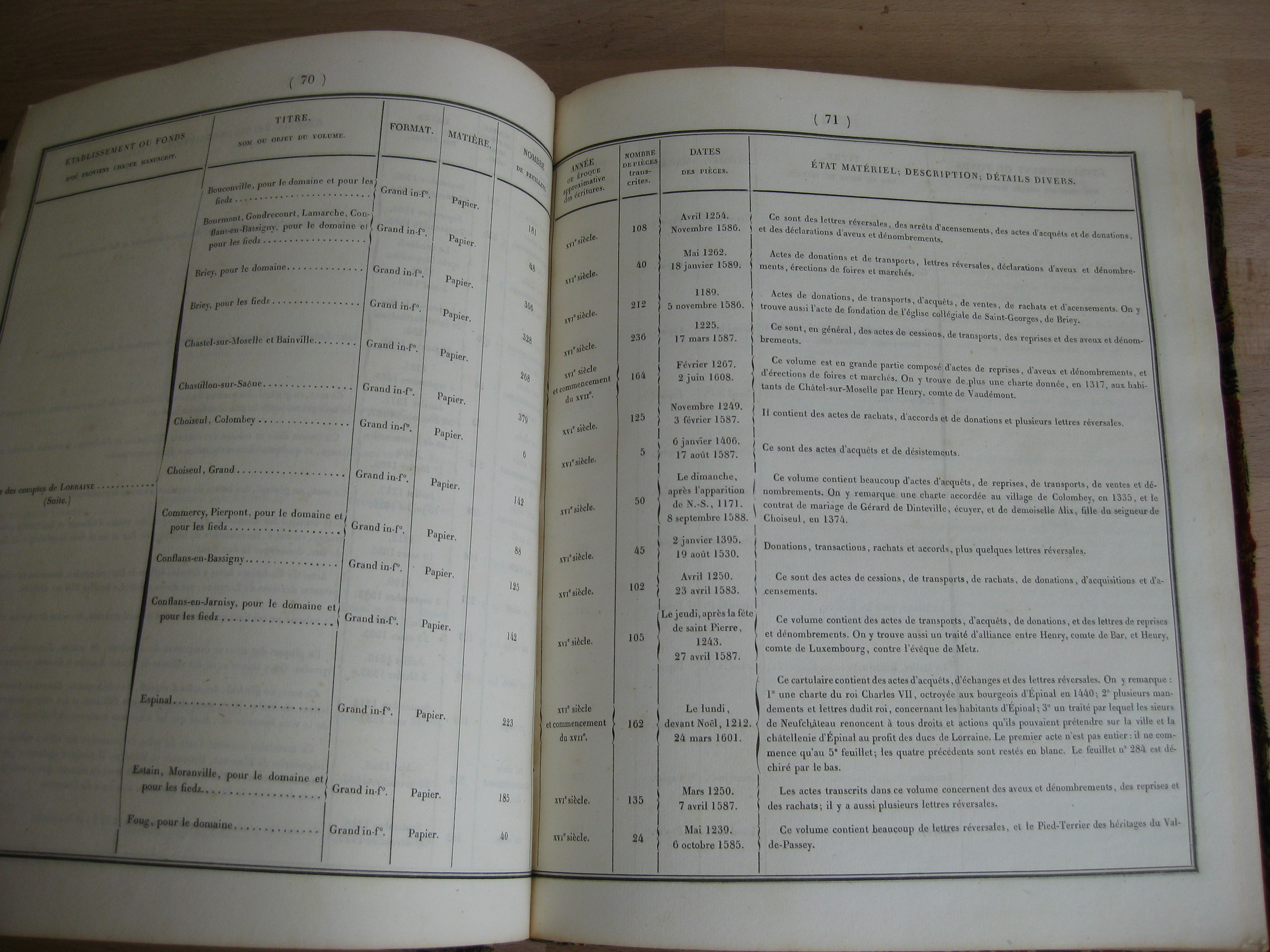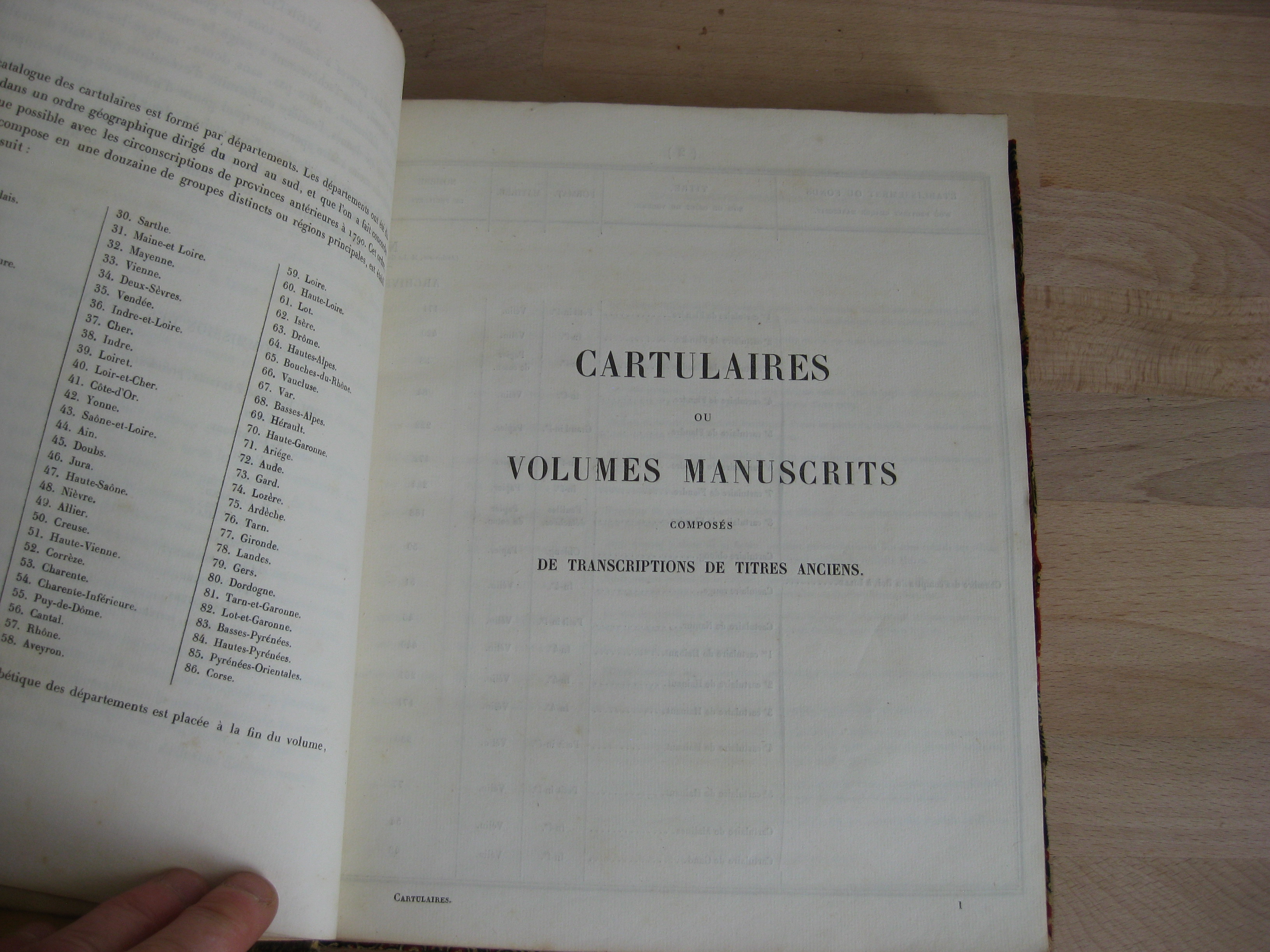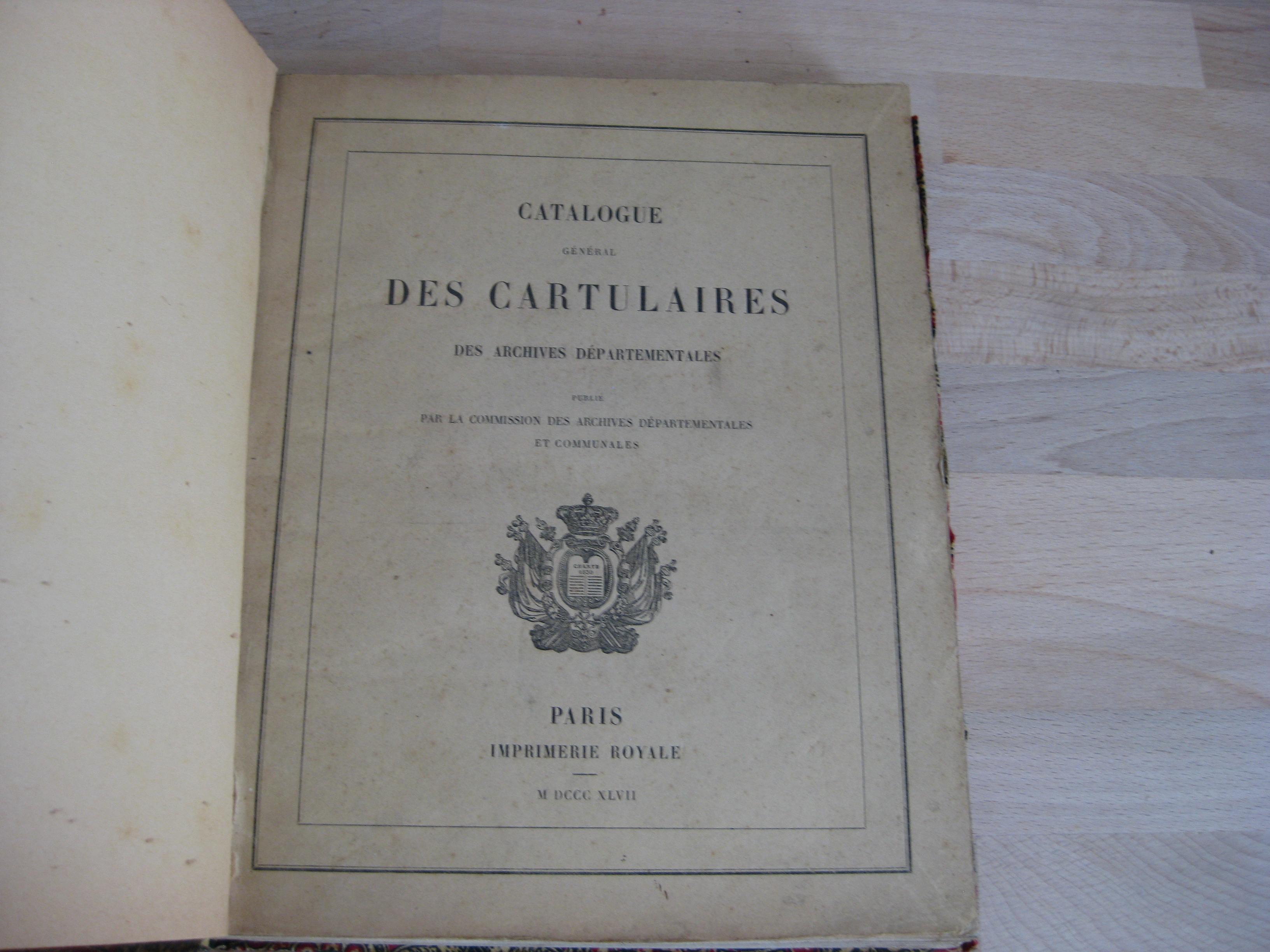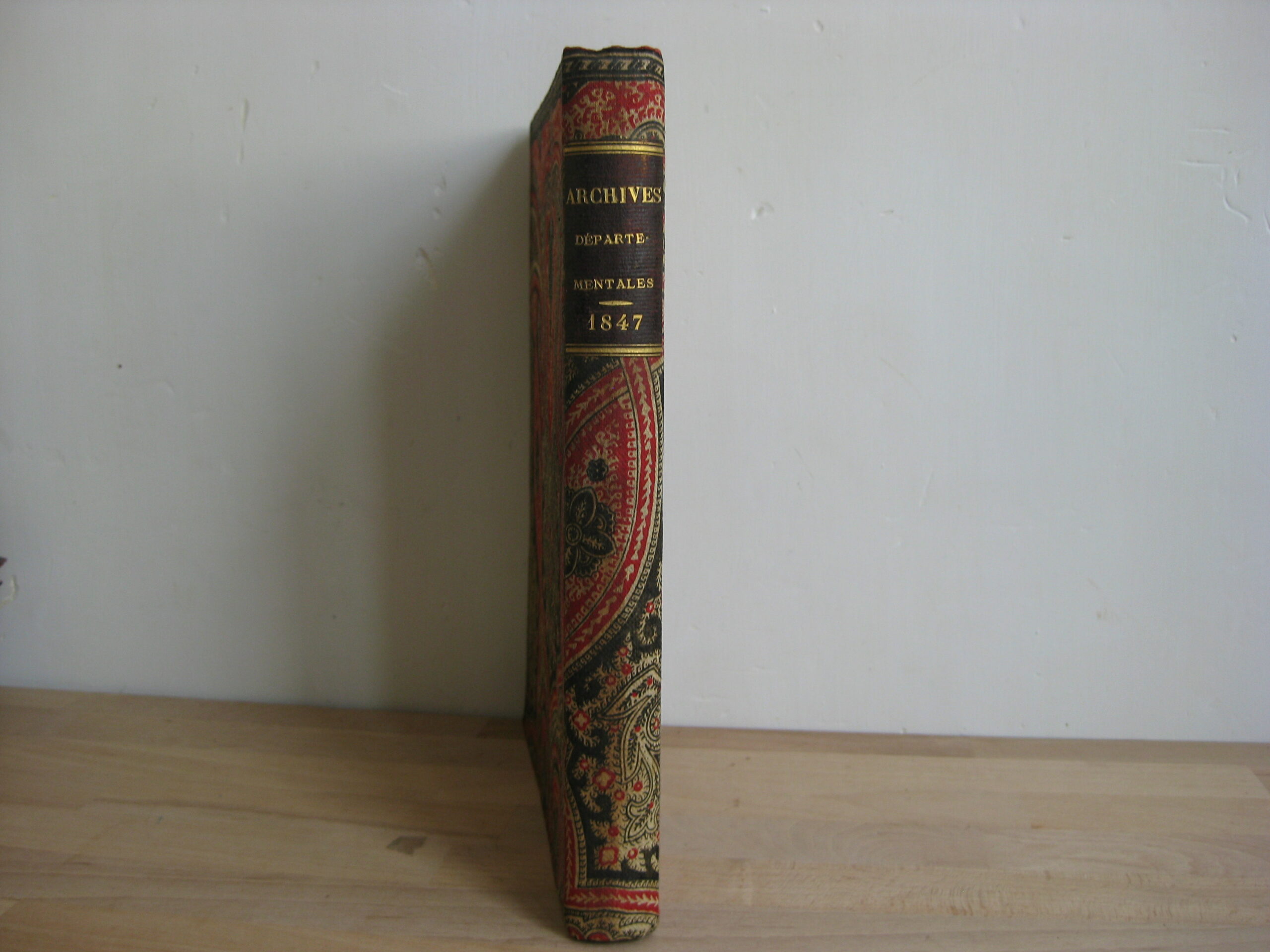 Imprimerie royale – Pleine toile à recouvrement, colorée à motifs floraux, à dos long orné d’une pièce de titre en maroquin noir, couvertures conservées, 264 x 212, 285p. Avec table. 1847. Très bel ex-libris collé en contreplat supérieur, dessiné et semble-t-il signé E. Loriot, comportant quelques inscriptions non indentifiées autour d’un dessin au nombreux motifs symboliques. Comprend : Cartulaires ou volumes manuscrits composés de transcriptions de titres anciens, 2-263 pp. Puis Tableaux présentant les relevés numériques du catalogue des cartulaires, 267-272 pp. Puis Table des noms de lieux, maisons, établissements ou corporations. 274-285 pp. Intérieur très frais, propre et intègre. Plats inférieur et dos frottés et un peu noircis, mais bel exemplaire, propre et intègre. Bien ferme.