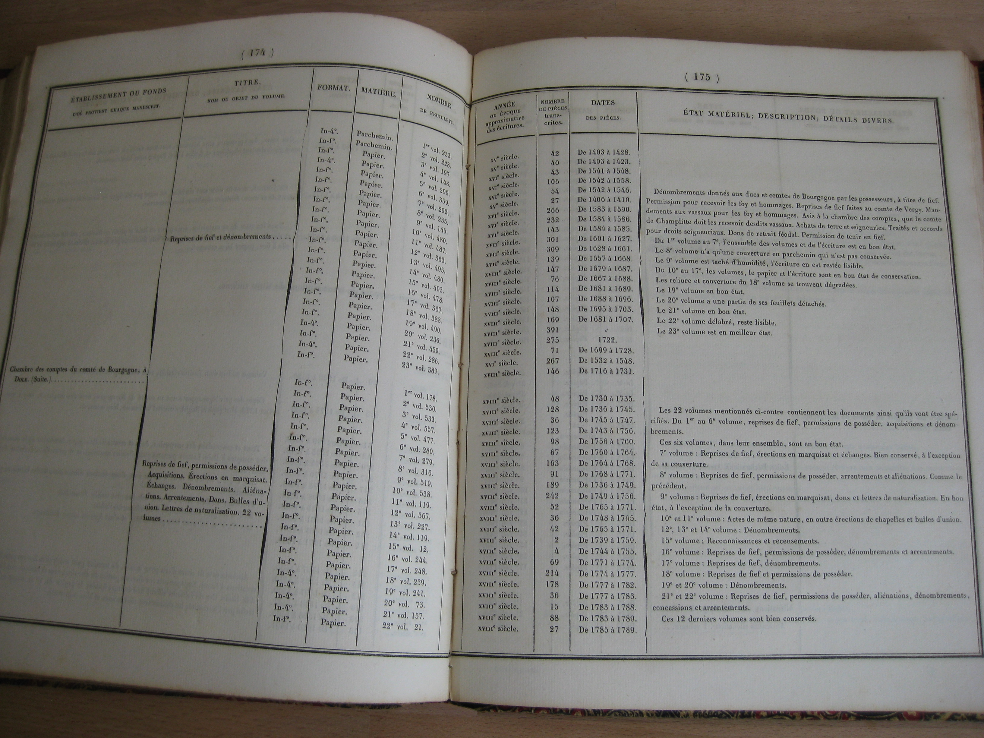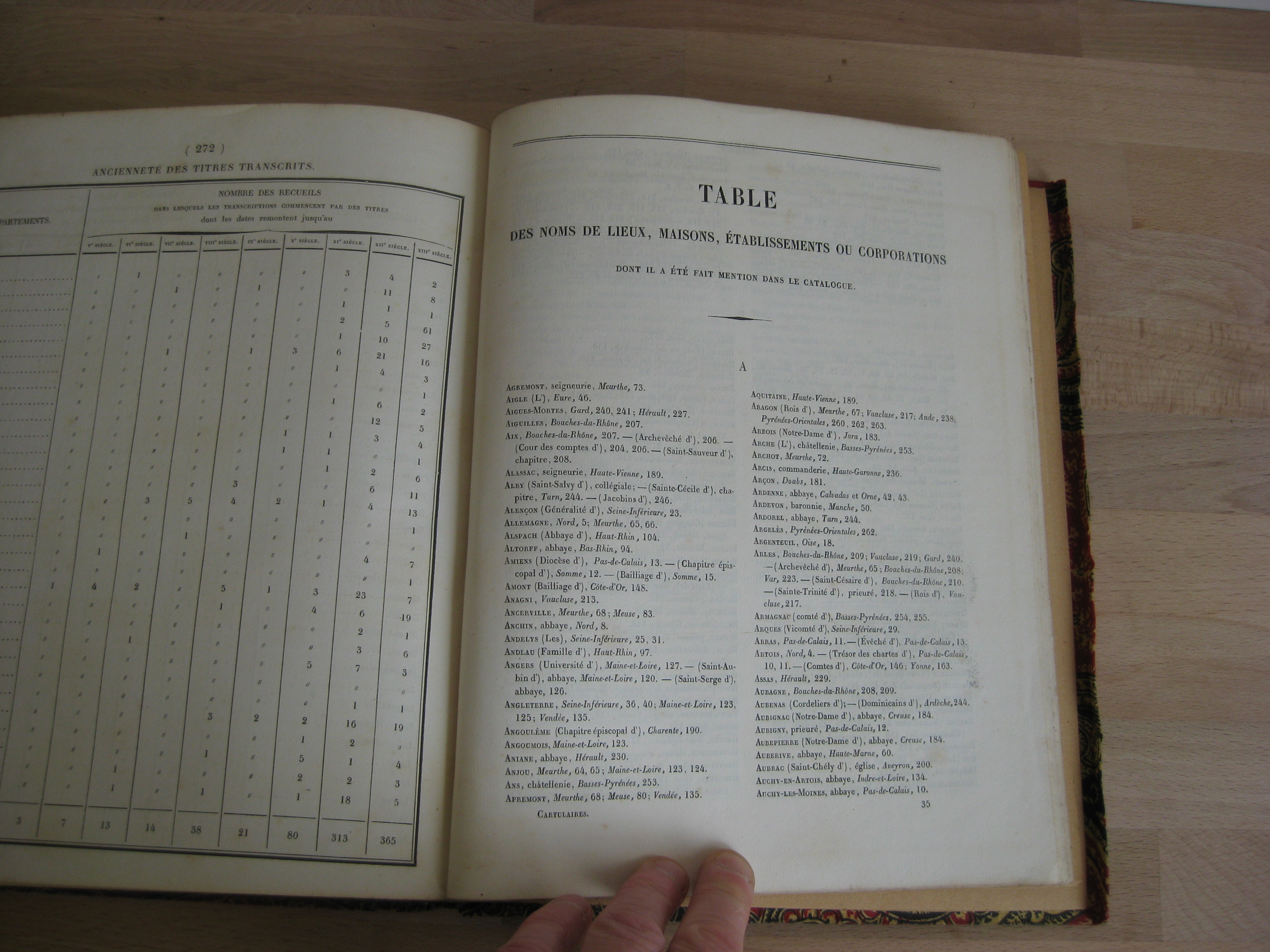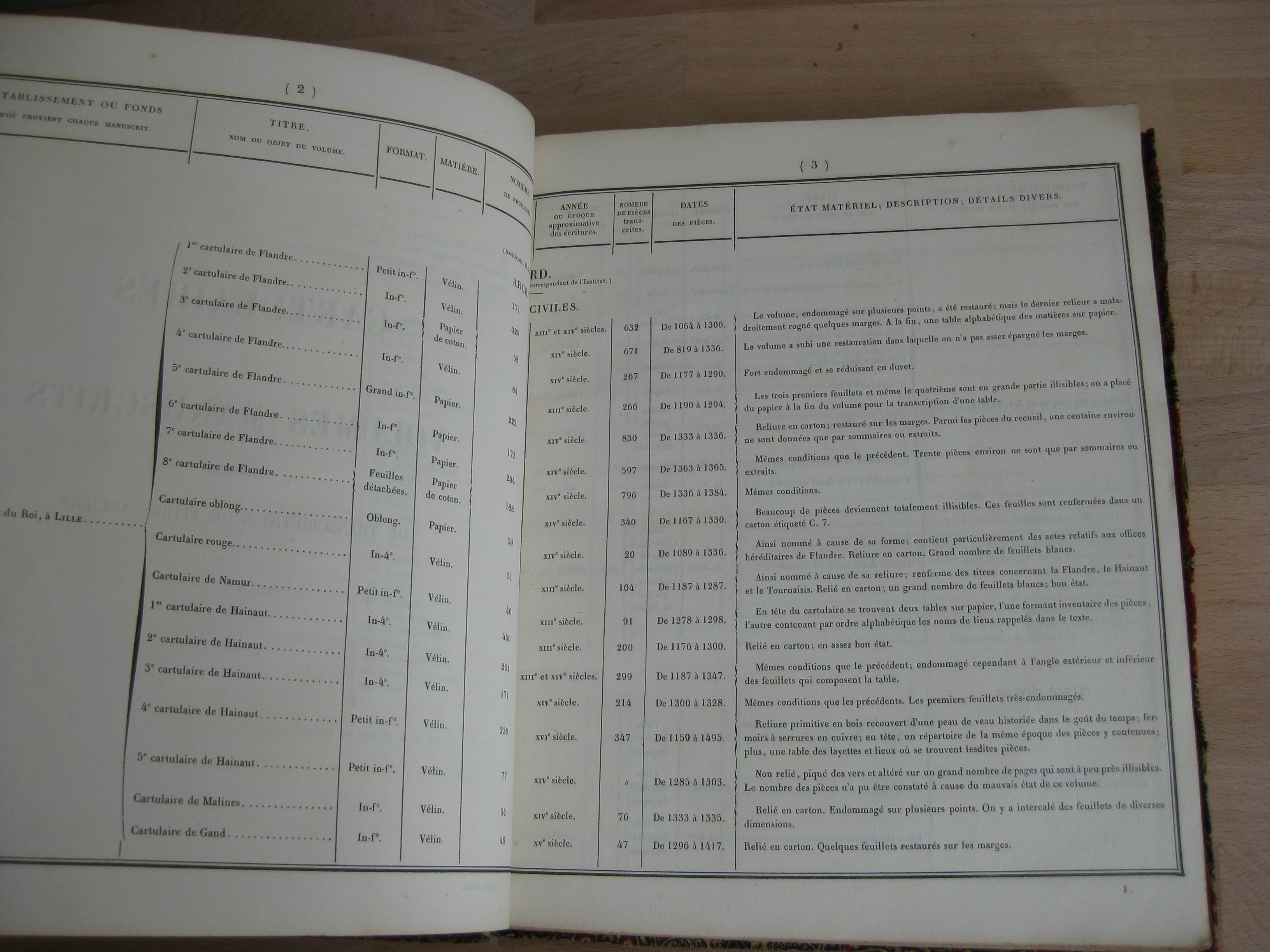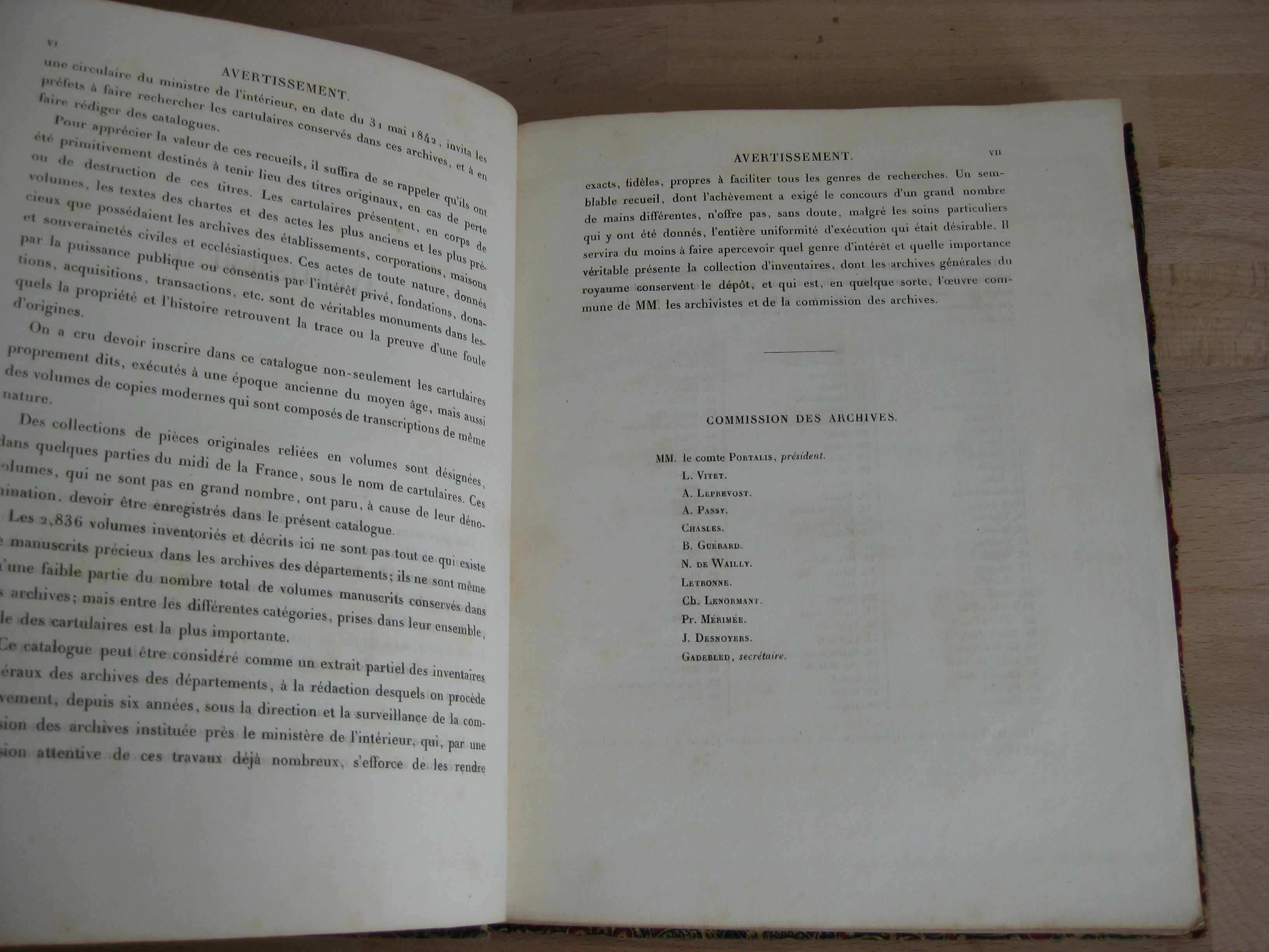 Imprimerie royale – Pleine toile à recouvrement, colorée à motifs floraux, à dos long orné d’une pièce de titre en maroquin noir, couvertures conservées, 264 x 212, 285p. Avec table. 1847. Très bel ex-libris collé en contreplat supérieur, dessiné et semble-t-il signé E. Loriot, comportant quelques inscriptions non indentifiées autour d’un dessin au nombreux motifs symboliques. Comprend : Cartulaires ou volumes manuscrits composés de transcriptions de titres anciens, 2-263 pp. Puis Tableaux présentant les relevés numériques du catalogue des cartulaires, 267-272 pp. Puis Table des noms de lieux, maisons, établissements ou corporations. 274-285 pp. Intérieur très frais, propre et intègre. Plats inférieur et dos frottés et un peu noircis, mais bel exemplaire, propre et intègre. Bien ferme.