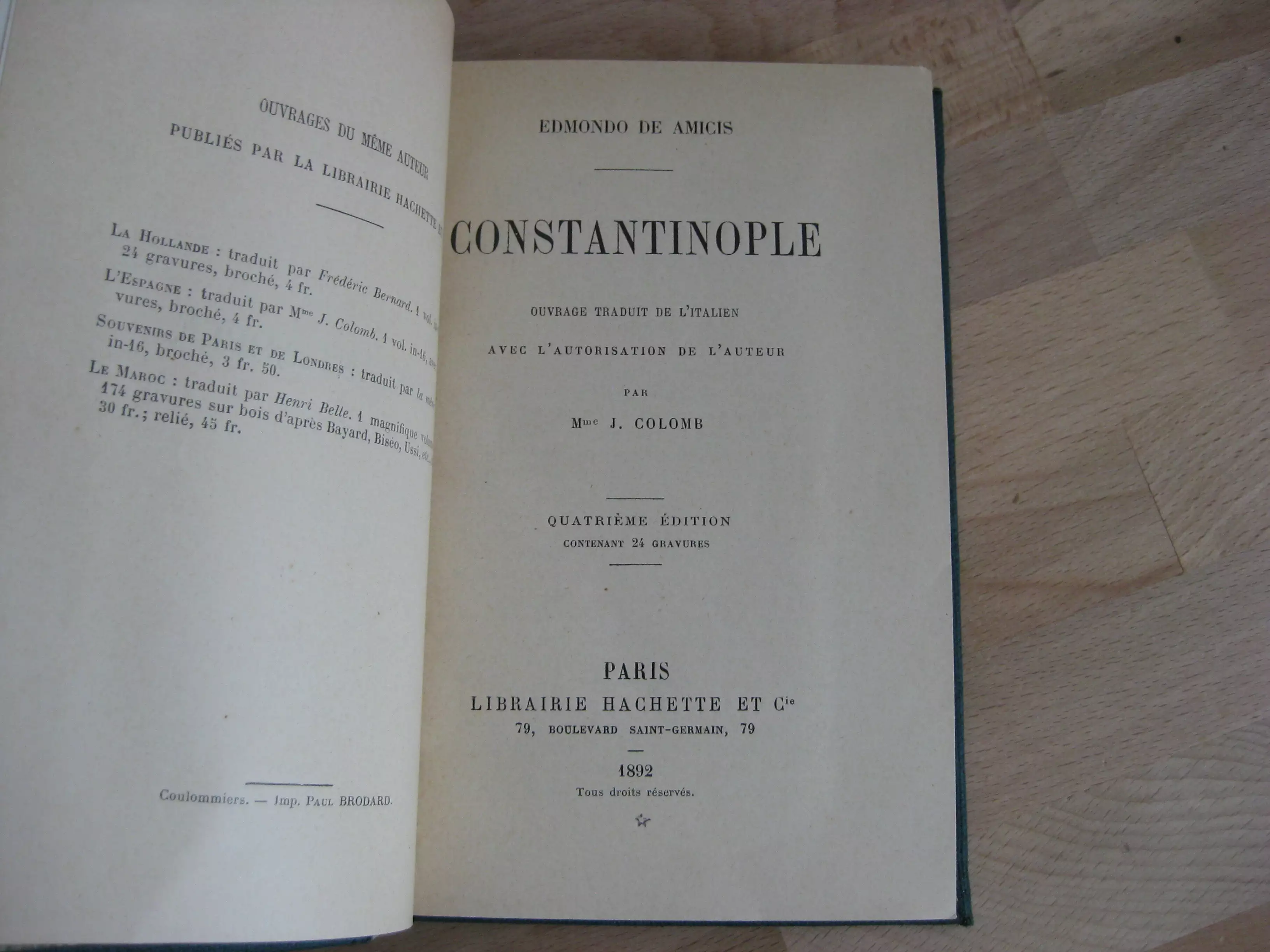 Librairie Hachette – Pleine toile verte à dos long orné d’une pièce de titre en maroquin vert, signet vert, 188 x 125,, 394p. Avec table. 1892. 4ème édition, contenant 24 gravures. Traduction de l’italien de Mme J. Colomb. Exemplaire enrichi d’un bel ex-libris aux armes « Gustave Estaquier » en contreplat supérieur. Intérieur très bon, propre et intègre. Pleine toile très bonne, propre et intègre, frottements marginaux. Bel exemplaire bien ferme.
