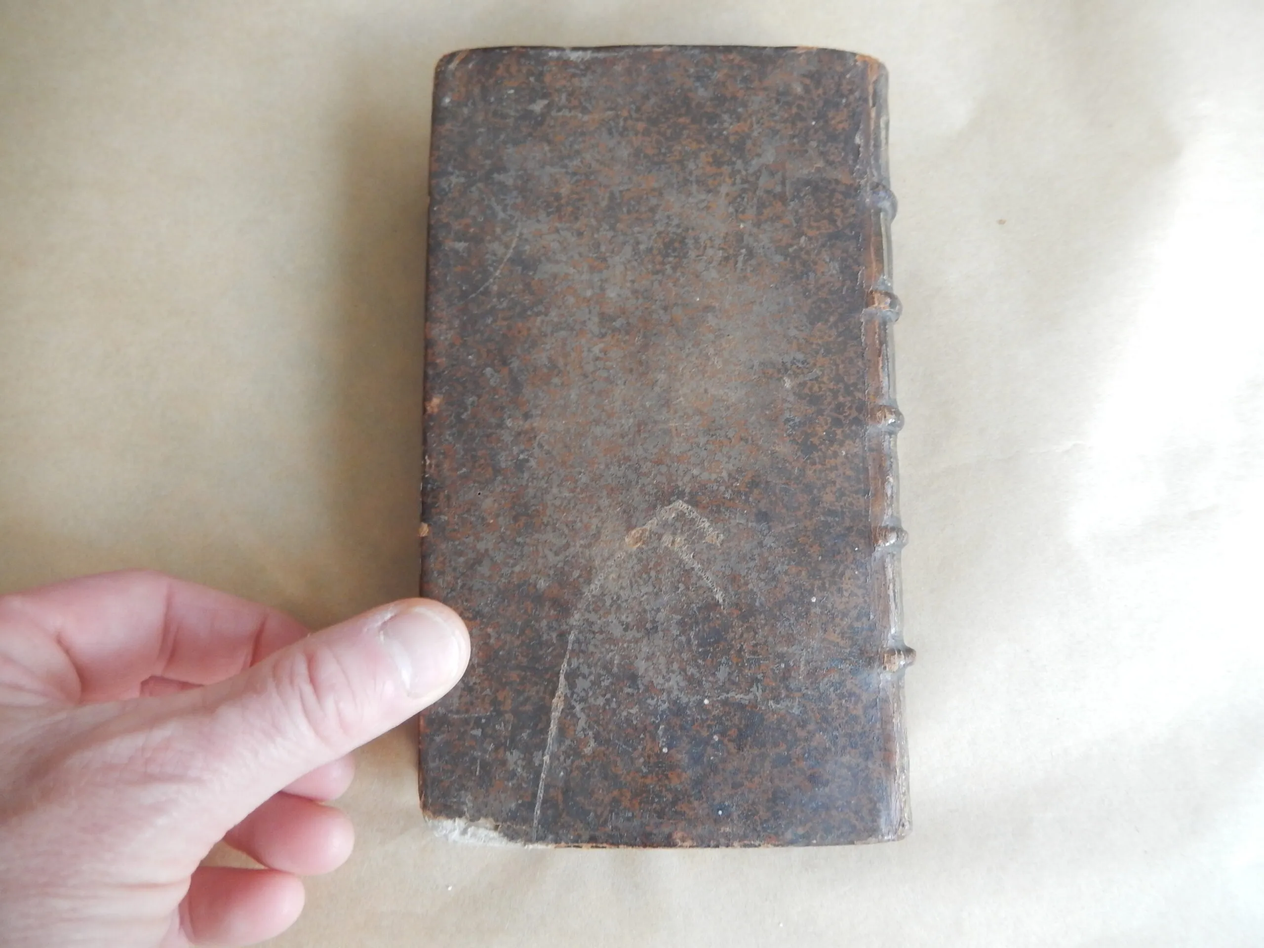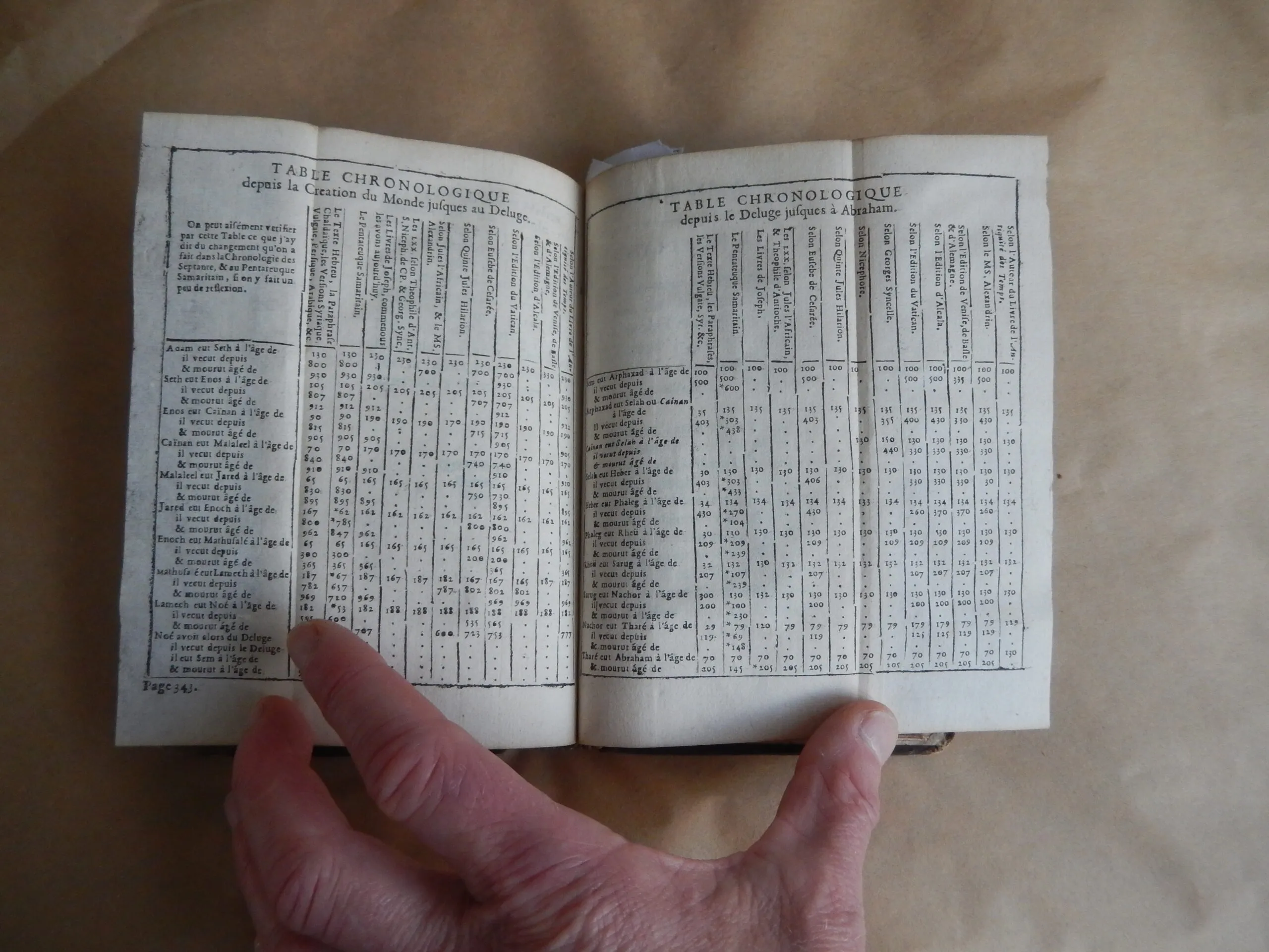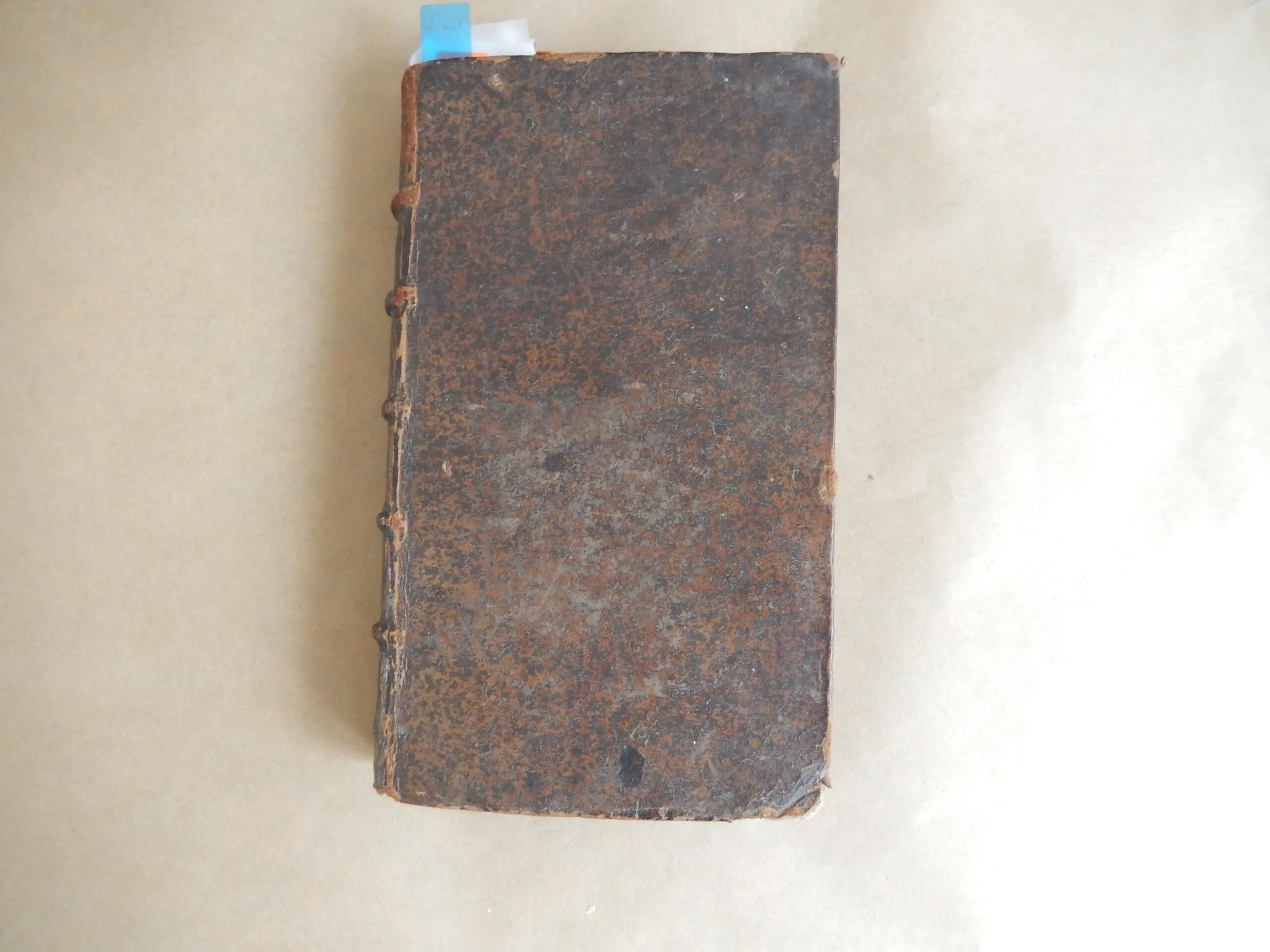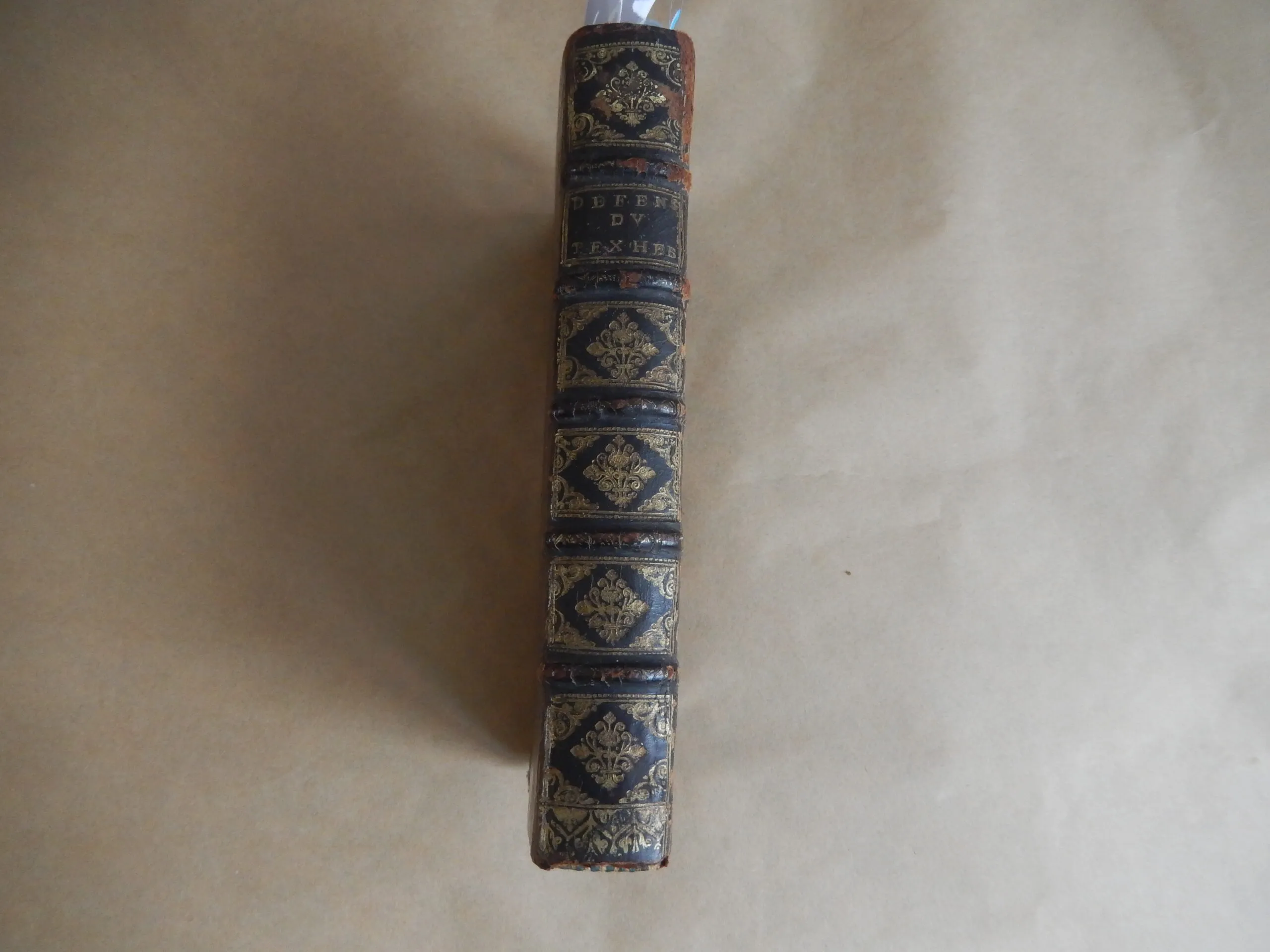 Plein veau marbré, dos à cinq nerfs orné d’une pièce de titre et de motifs aux caissons, tranches jaspées rouges, 169 x 103, 469p. Hors table et errata (23p.) 1690. Edition originale. Frontispice gravé : portrait de Claude Le Tonnelier de Breteuil, evesque de Boulogne . Ex-libris en contreplat : Mr. L. H. Collard, prêtre ».. Avec 2 tables chronologiques dépliantes hors texte et 2 dans le texte, intègres. Comprend : Adresse à Claude Le Tonnelier, 13p. Préface, Approbation, Permissions et Privilège, 21p. Table des chapitres, des deux parties, 5p. Puis le texte, 469p. Intérieur très frais avec un tampon du séminaire de Caen, au titre, avec un code en tête, et un tampon en marge d’une page. Coins et champs frottés, coins de pied émoussés. Plats frottés avec traces noires et épidermures. Mors frottés avec épidermures mais intègres. Dos frotté avec épidemures en coiffe et aux nerfs ; queue arasée. Bel exemplaire bien ferme.