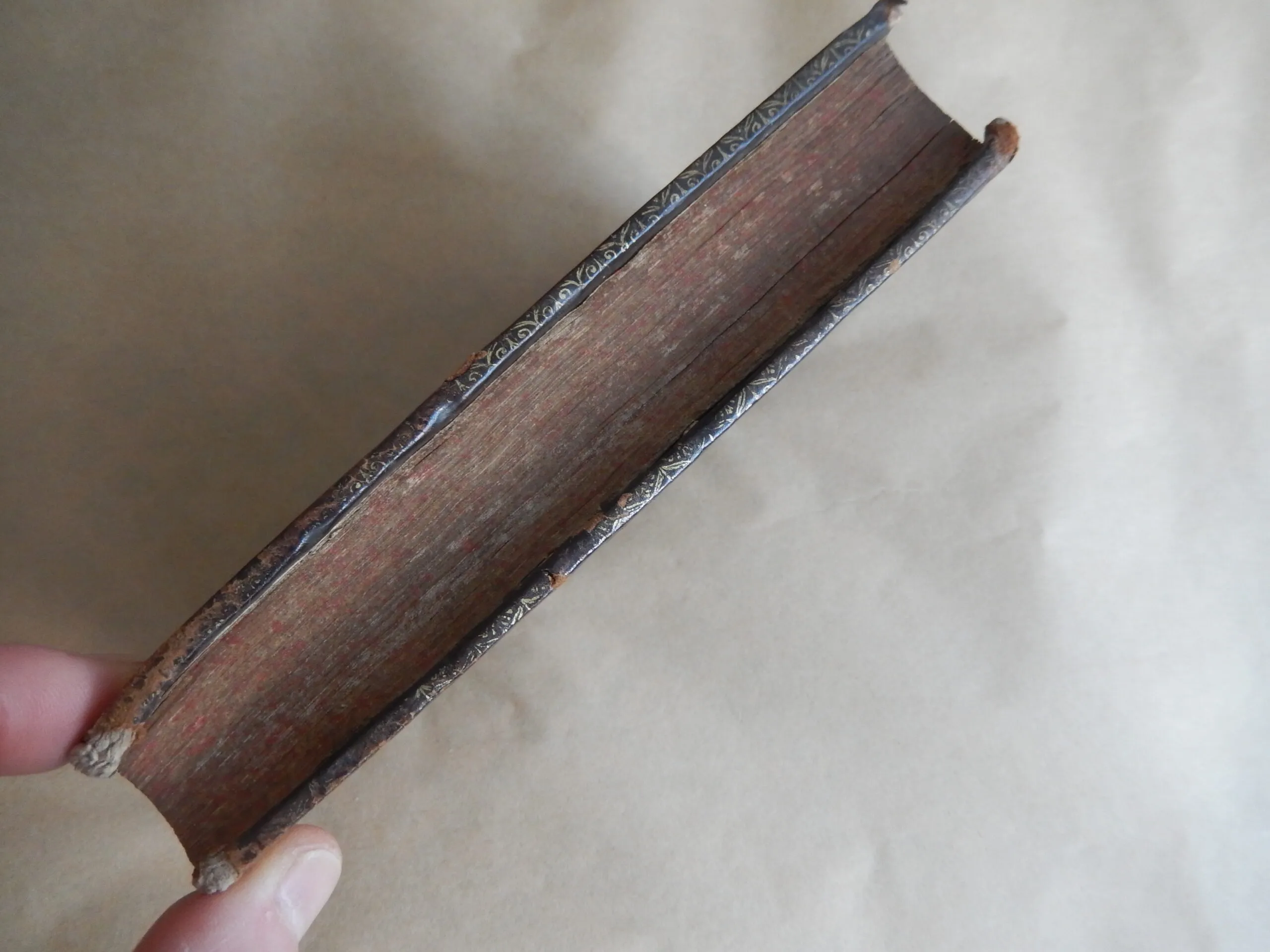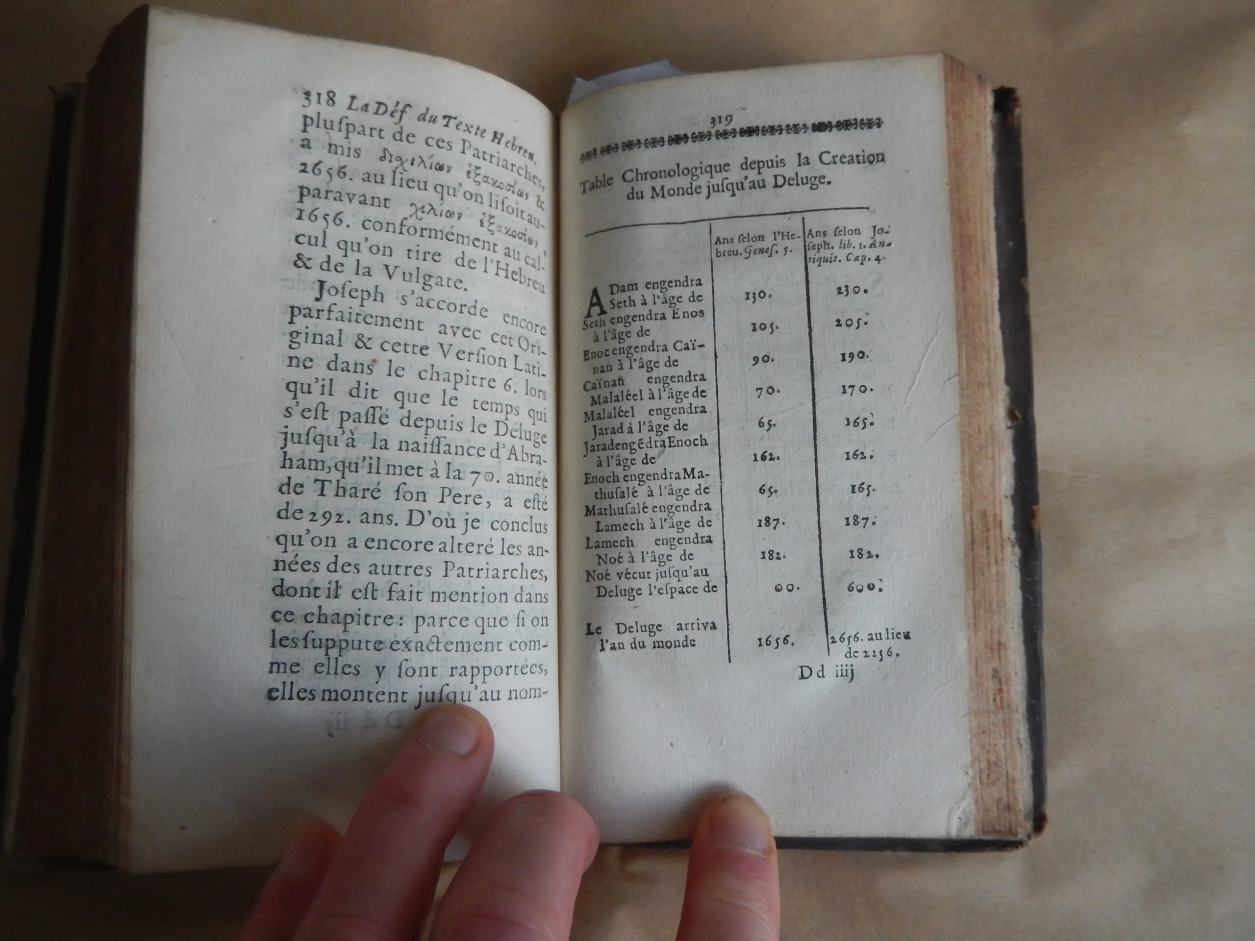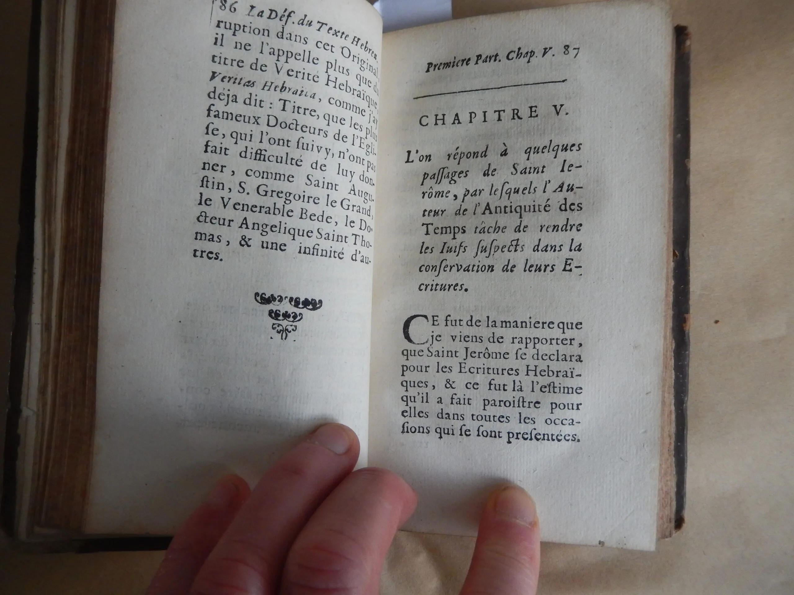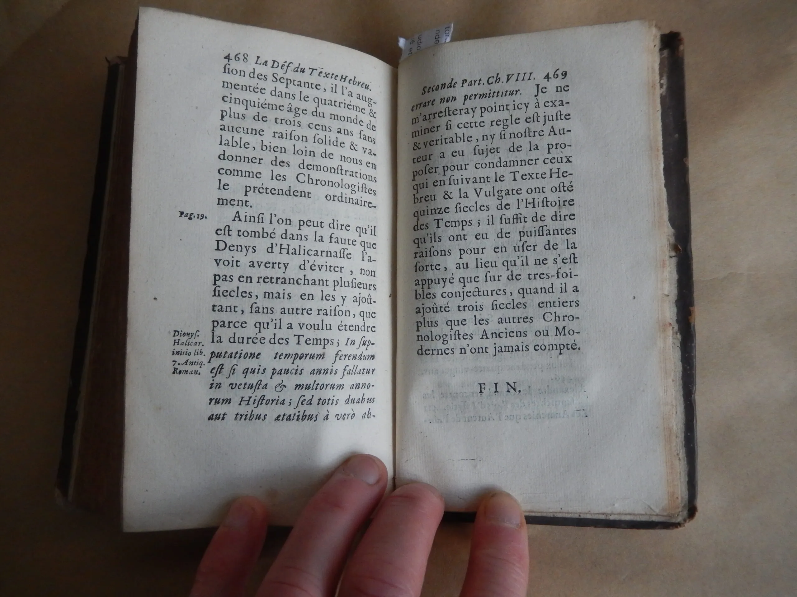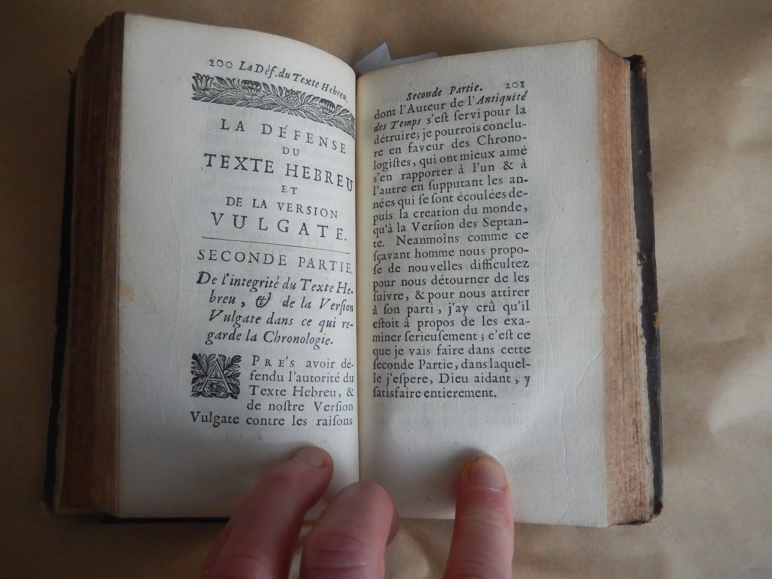 Plein veau marbré, dos à cinq nerfs orné d’une pièce de titre et de motifs aux caissons, tranches jaspées rouges, 169 x 103, 469p. Hors table et errata (23p.) 1690. Edition originale. Frontispice gravé : portrait de Claude Le Tonnelier de Breteuil, evesque de Boulogne . Ex-libris en contreplat : Mr. L. H. Collard, prêtre ».. Avec 2 tables chronologiques dépliantes hors texte et 2 dans le texte, intègres. Comprend : Adresse à Claude Le Tonnelier, 13p. Préface, Approbation, Permissions et Privilège, 21p. Table des chapitres, des deux parties, 5p. Puis le texte, 469p. Intérieur très frais avec un tampon du séminaire de Caen, au titre, avec un code en tête, et un tampon en marge d’une page. Coins et champs frottés, coins de pied émoussés. Plats frottés avec traces noires et épidermures. Mors frottés avec épidermures mais intègres. Dos frotté avec épidemures en coiffe et aux nerfs ; queue arasée. Bel exemplaire bien ferme.