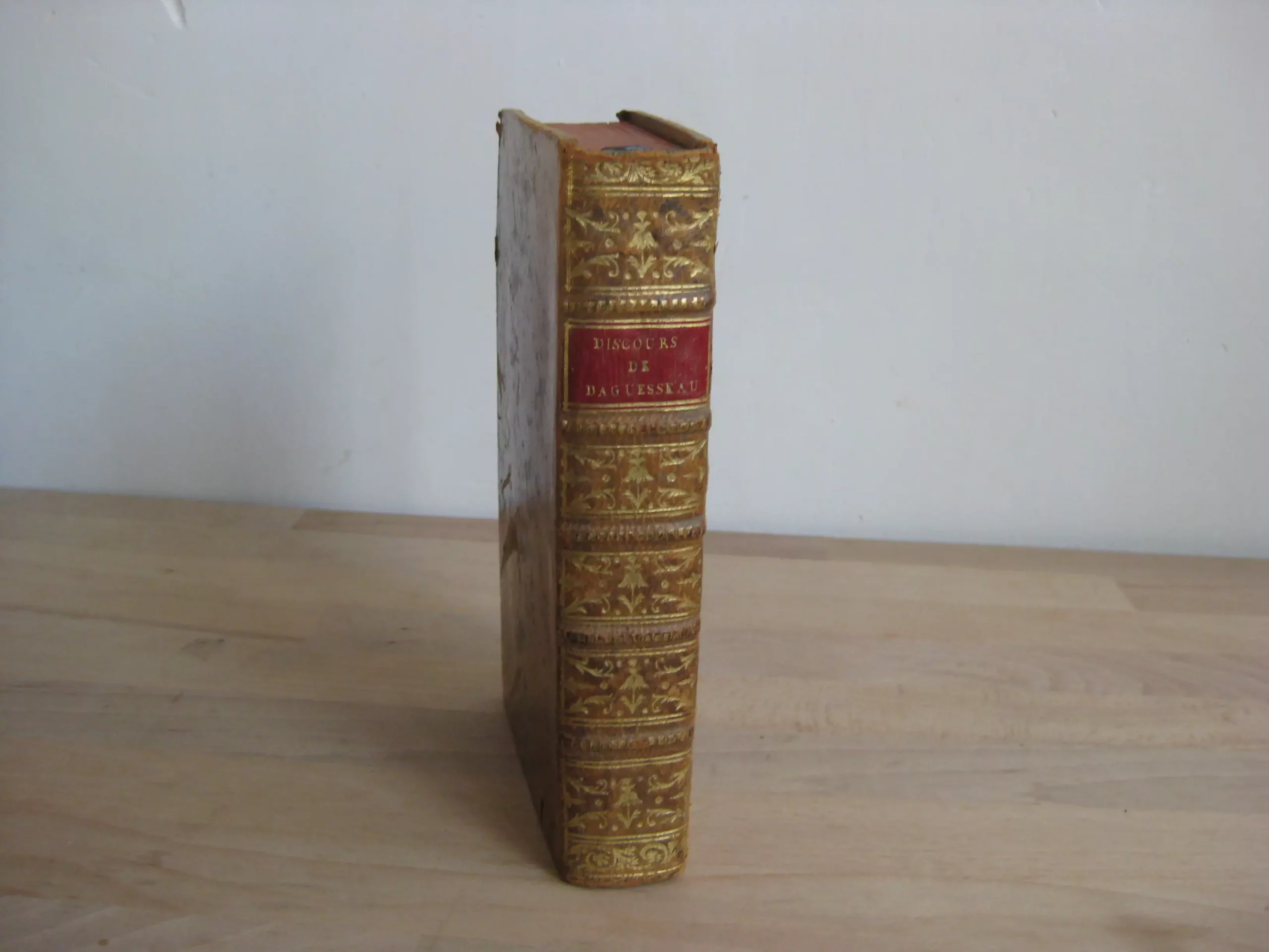 DescriptionS.N.Amsterdam – Plein veau marbré, dos à cinq nerfs richement orné, pièce de titre rouge, tranches rouges, 174 x 103, 1756 et 1757 (T2). Précédé pour le T1 de : Avertissement ; Une vie de M. le Chancelier d’Aguesseau ; Discours prononcé par M. Terrasson ; Extrait de l’histoire de Saintonge, par Armand Maichin, sur la famille d’Aguesseau, paginés ii- lxij. Tome I sans table, T2 avec table in fine.