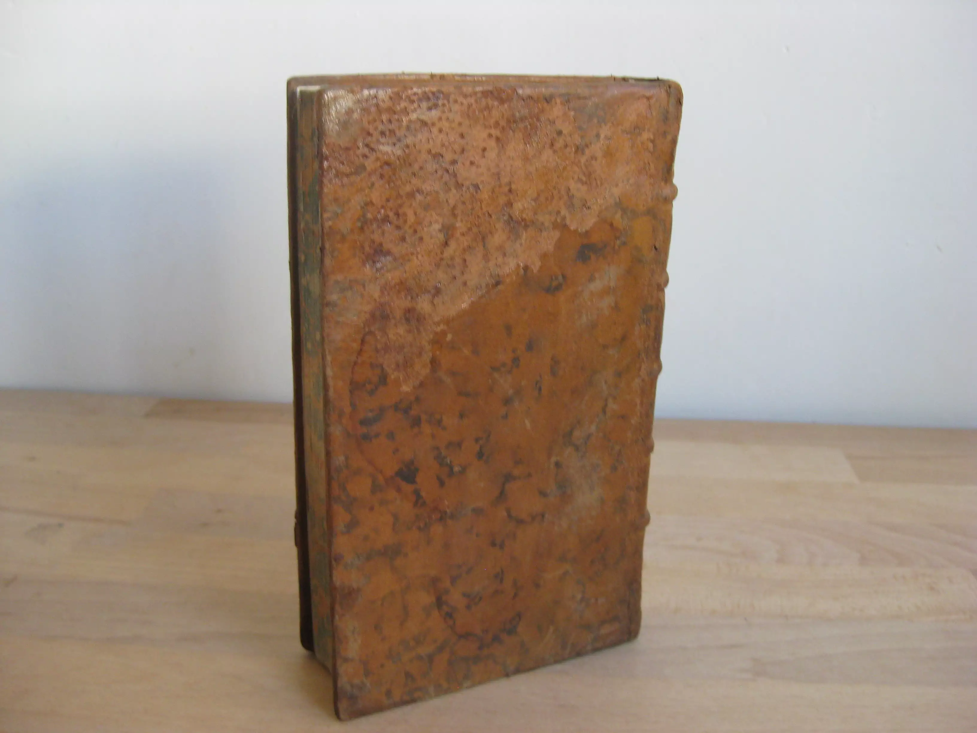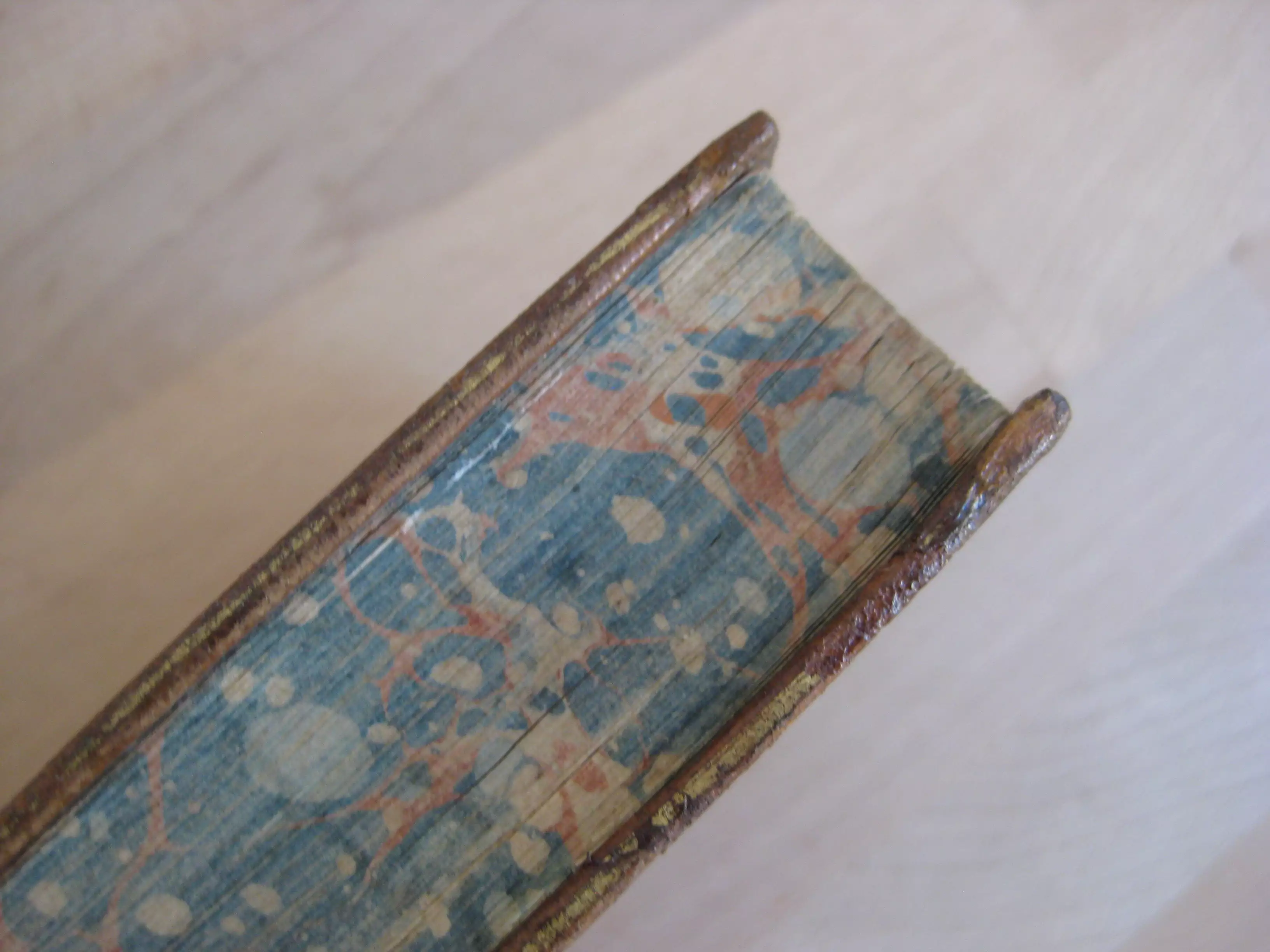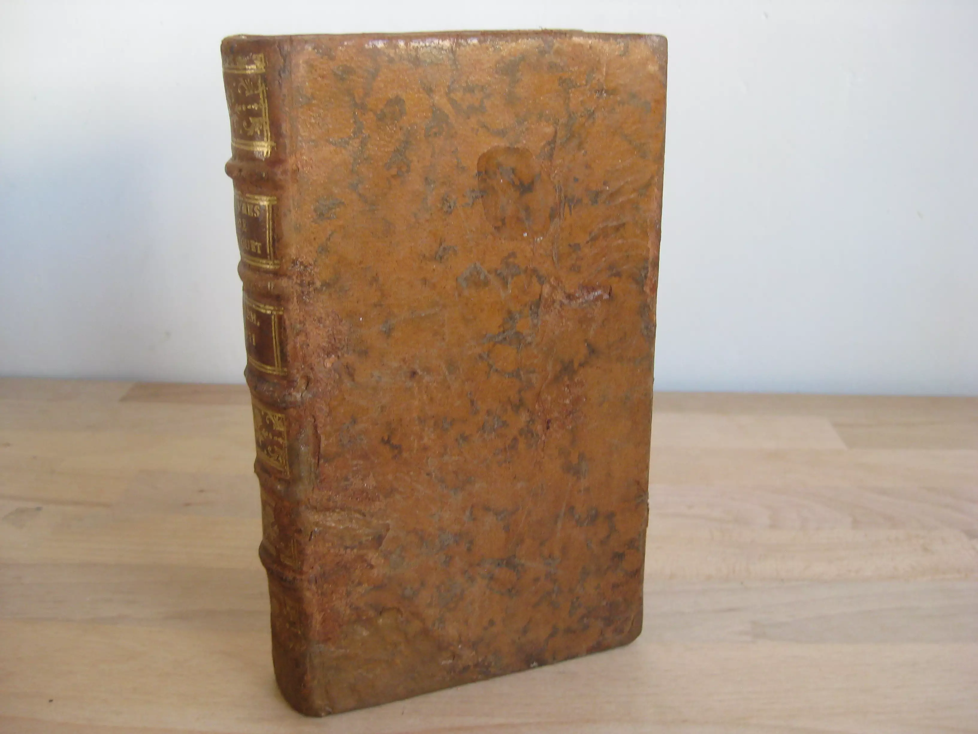 À Londres – Plein veau marbré, dos à cinq nerfs orné d’une pièce de titre et d’une tomaison en maroquin lie de vin, tranches petits cailloutées, 173 x 102, 143 et 256p. Avec table des chapitres pour les deux tomes. 1774. Edition originale. [Tome premier des Œuvres en faux-titre, XII en tomaison]. Intérieur frais, propre. Reliure propre avec restauration propre en pied de dos et de plat supérieur. Epidermure marquée en tête de plat inférieur. Coiffe frottée. Bon exemplaire bien ferme.