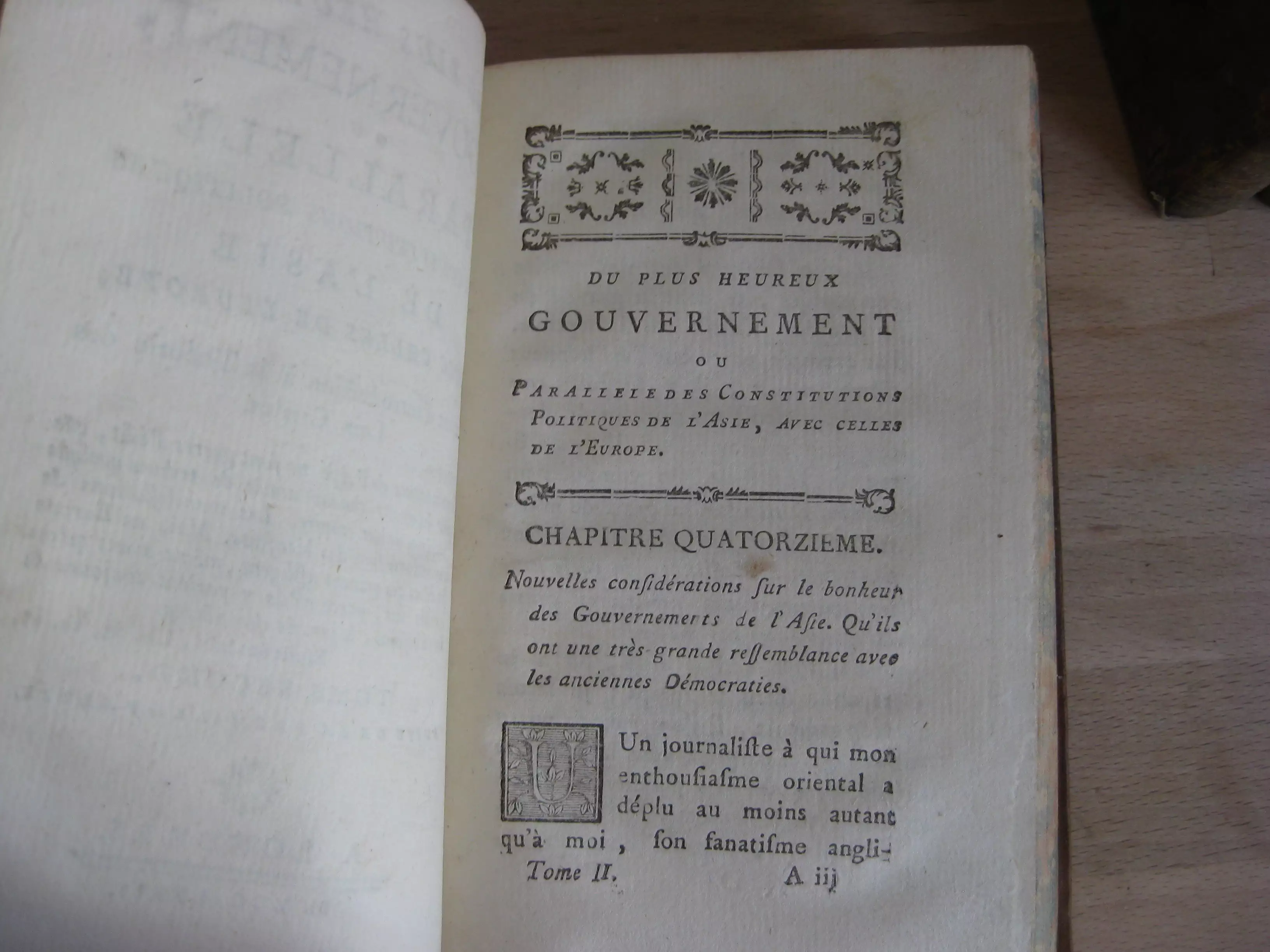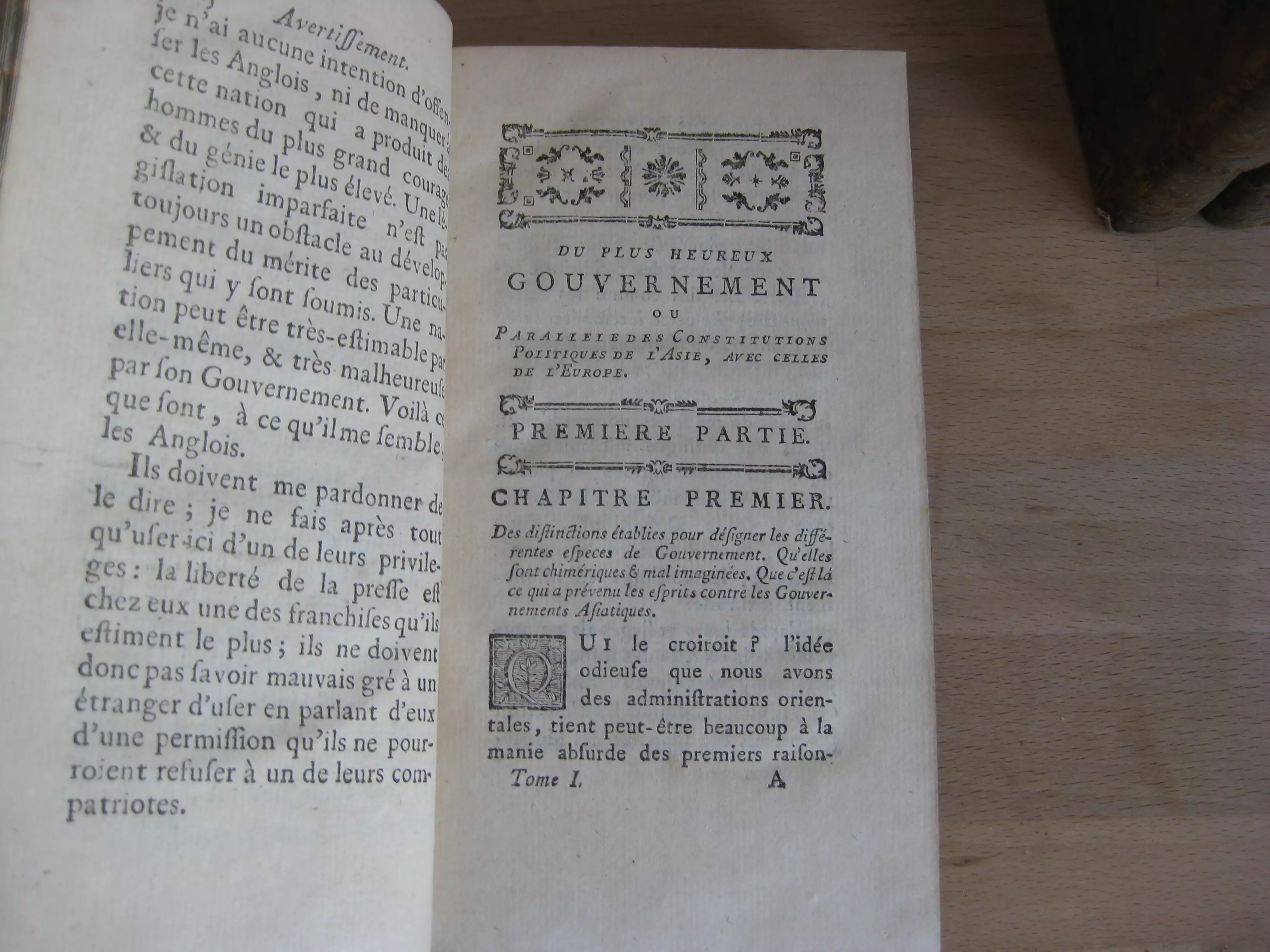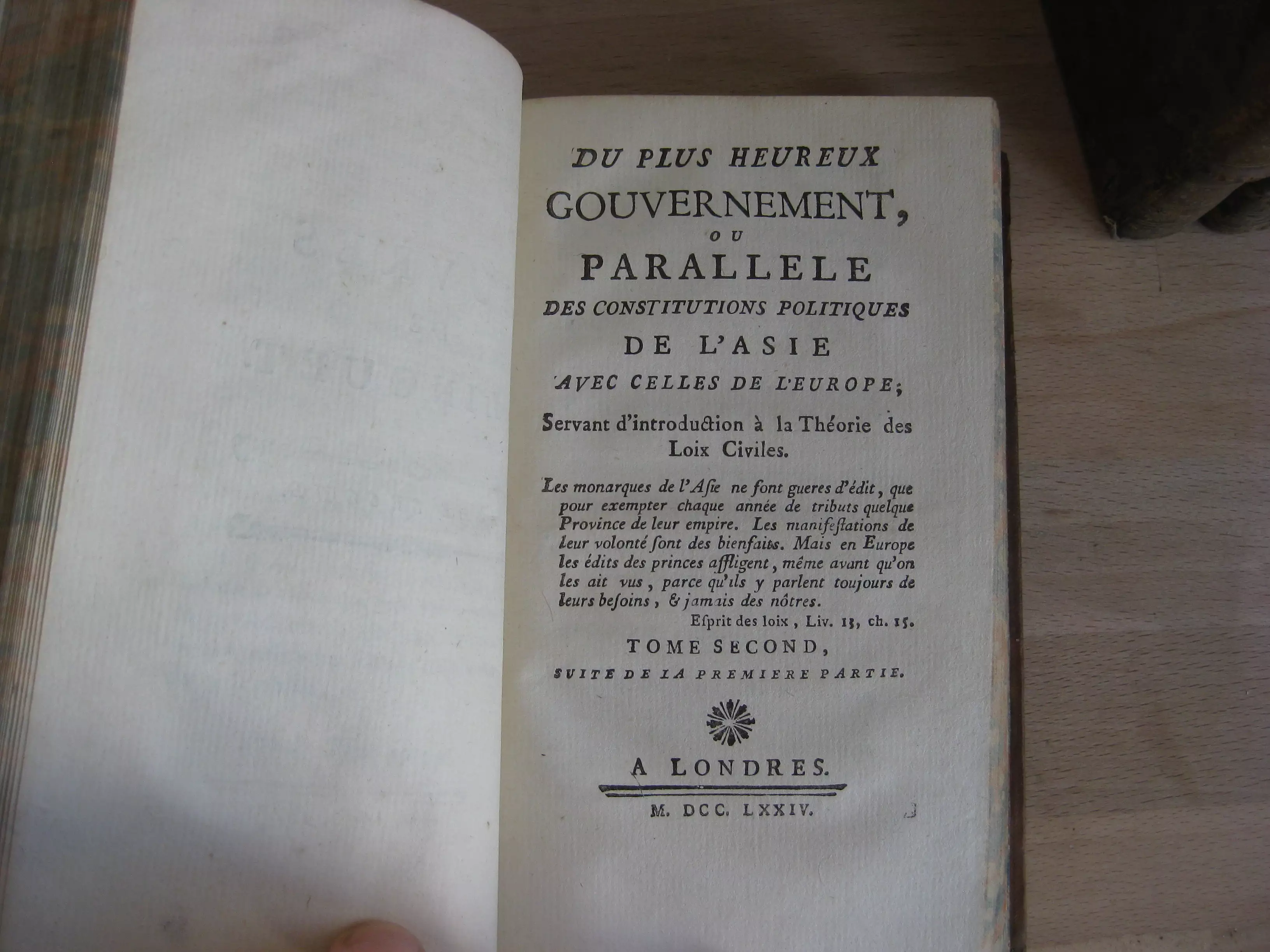 Du plus heureux gouvernement ou Parallèle des constitutions politiques de l’Asie avec celles de l’Europe. Servant d’introduction à la Théorie des Loix civiles, 2 tomes en un volume, complet.