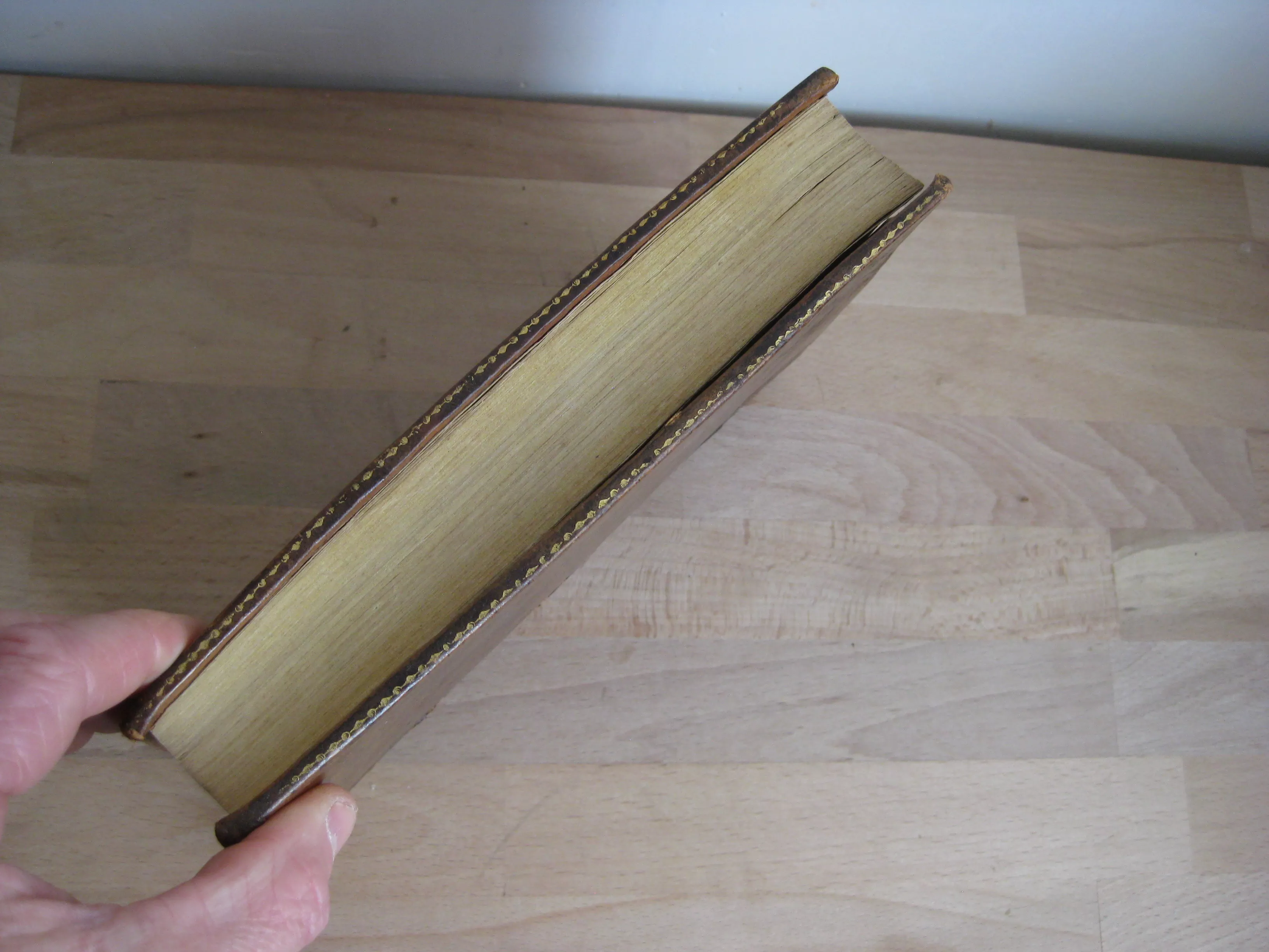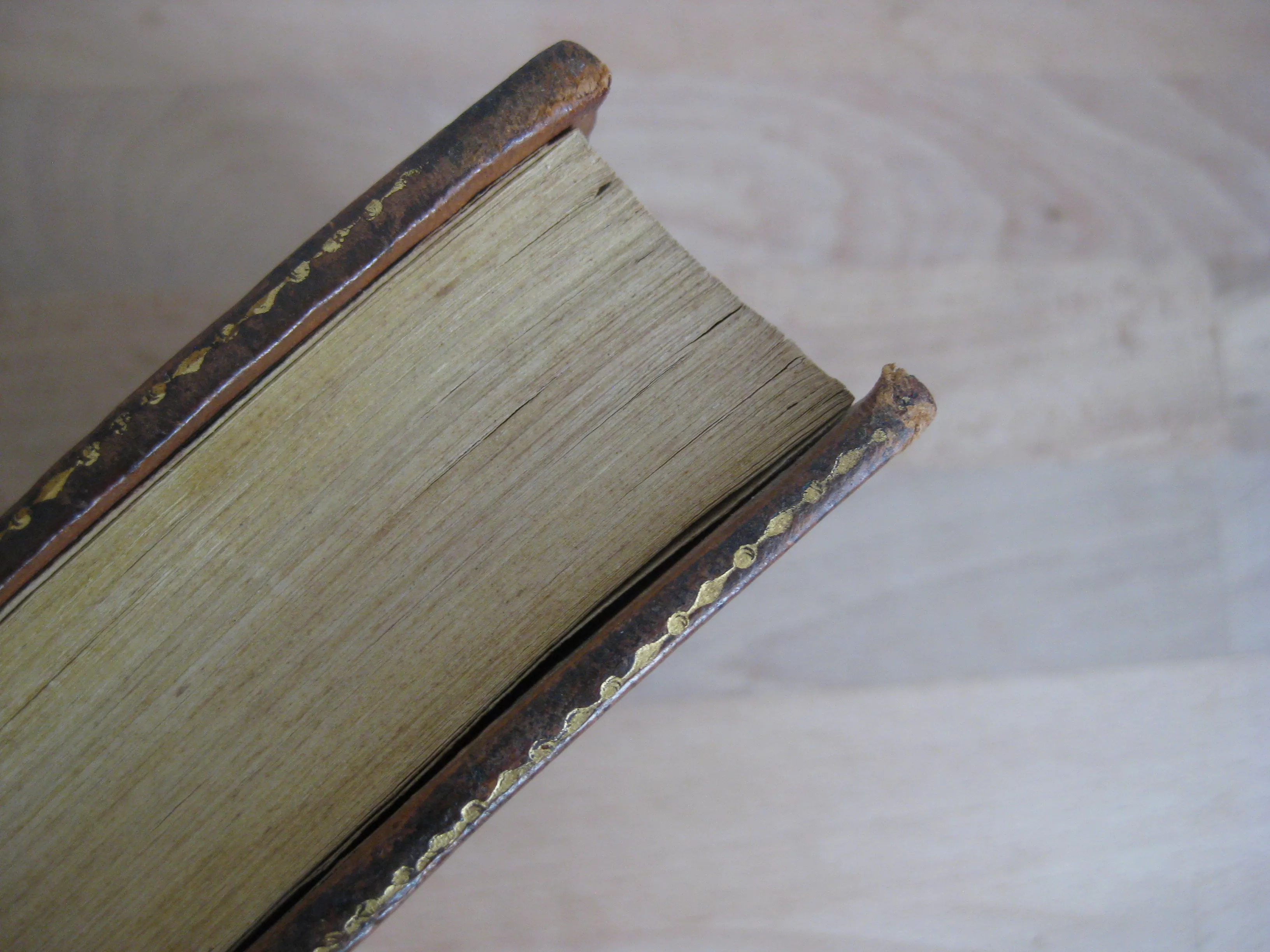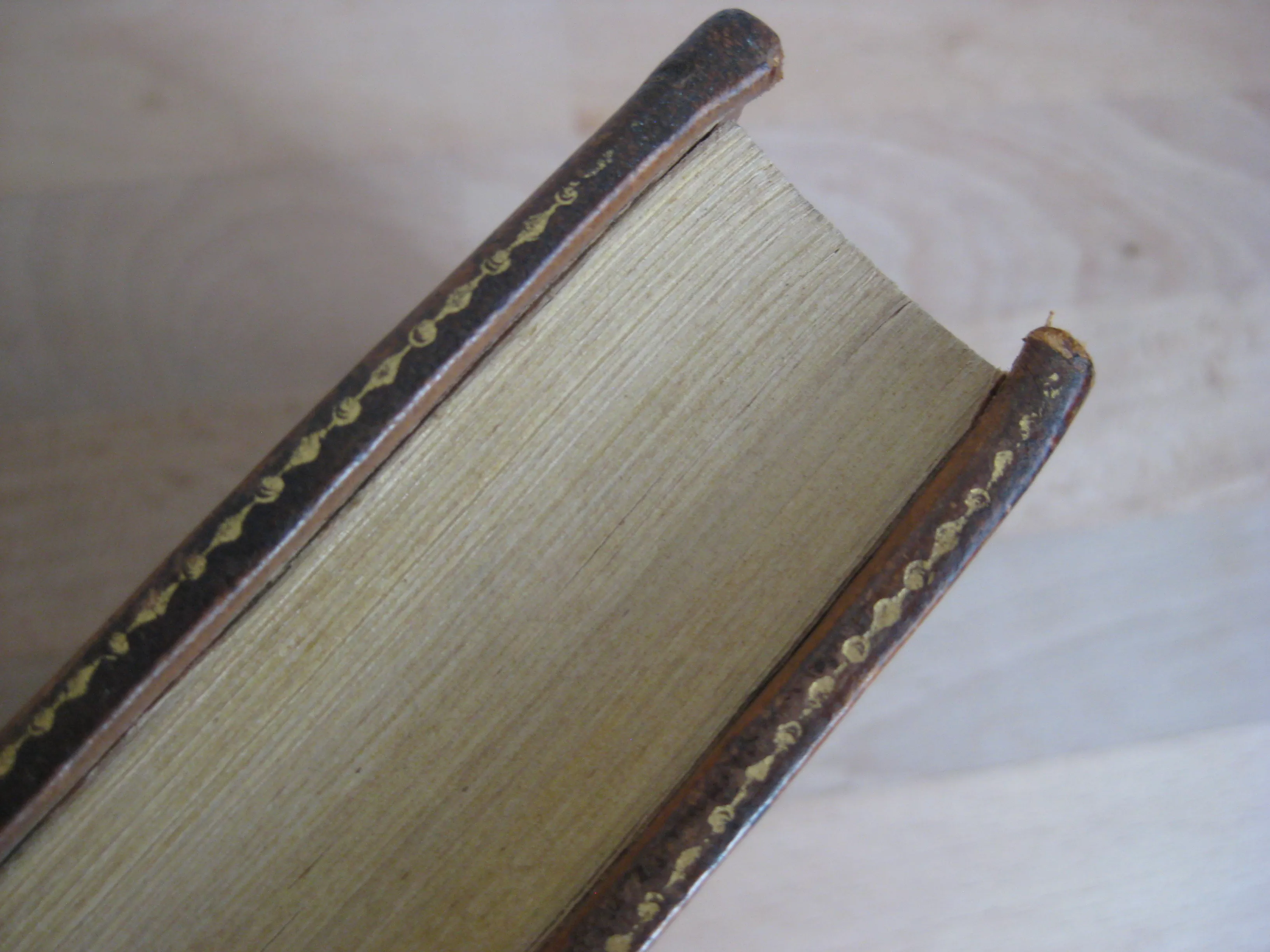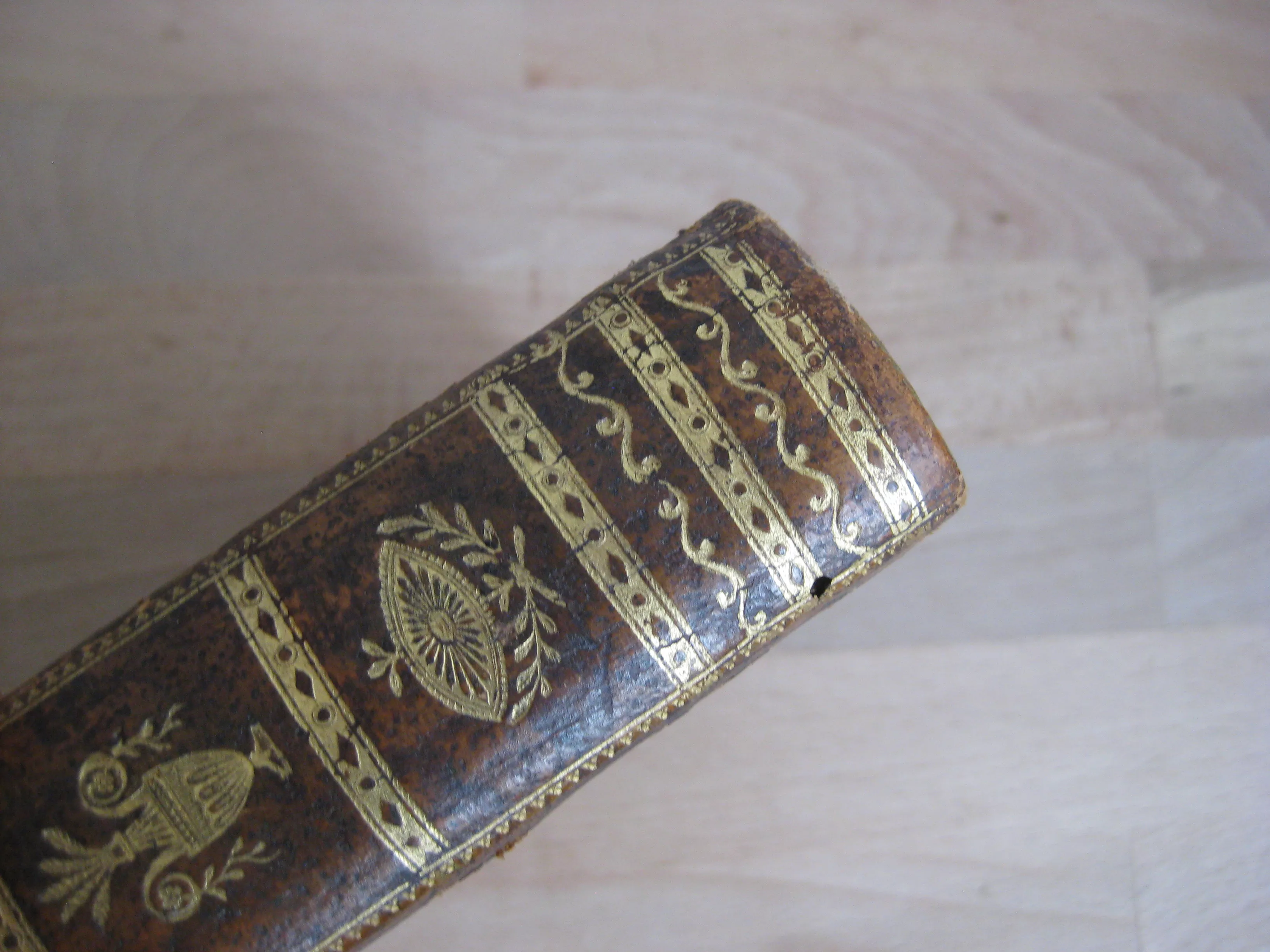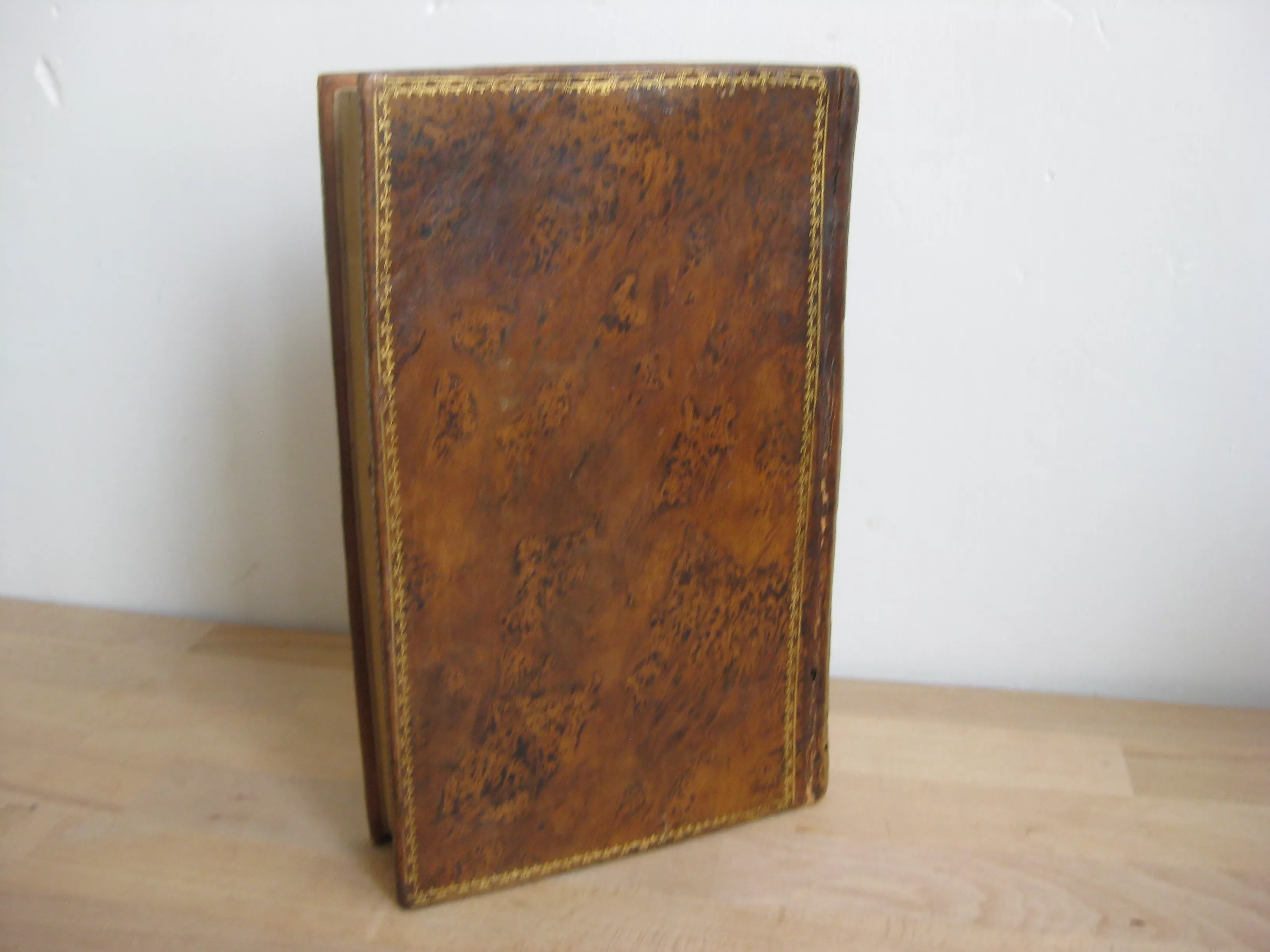 Plein veau marbrée, à dos long richement orné de frises et de motifs aux caissons, plats ornés d’une frise, champs ornés, toutes tranches jaunes, 210 x 133, 597p. An VI de la République.