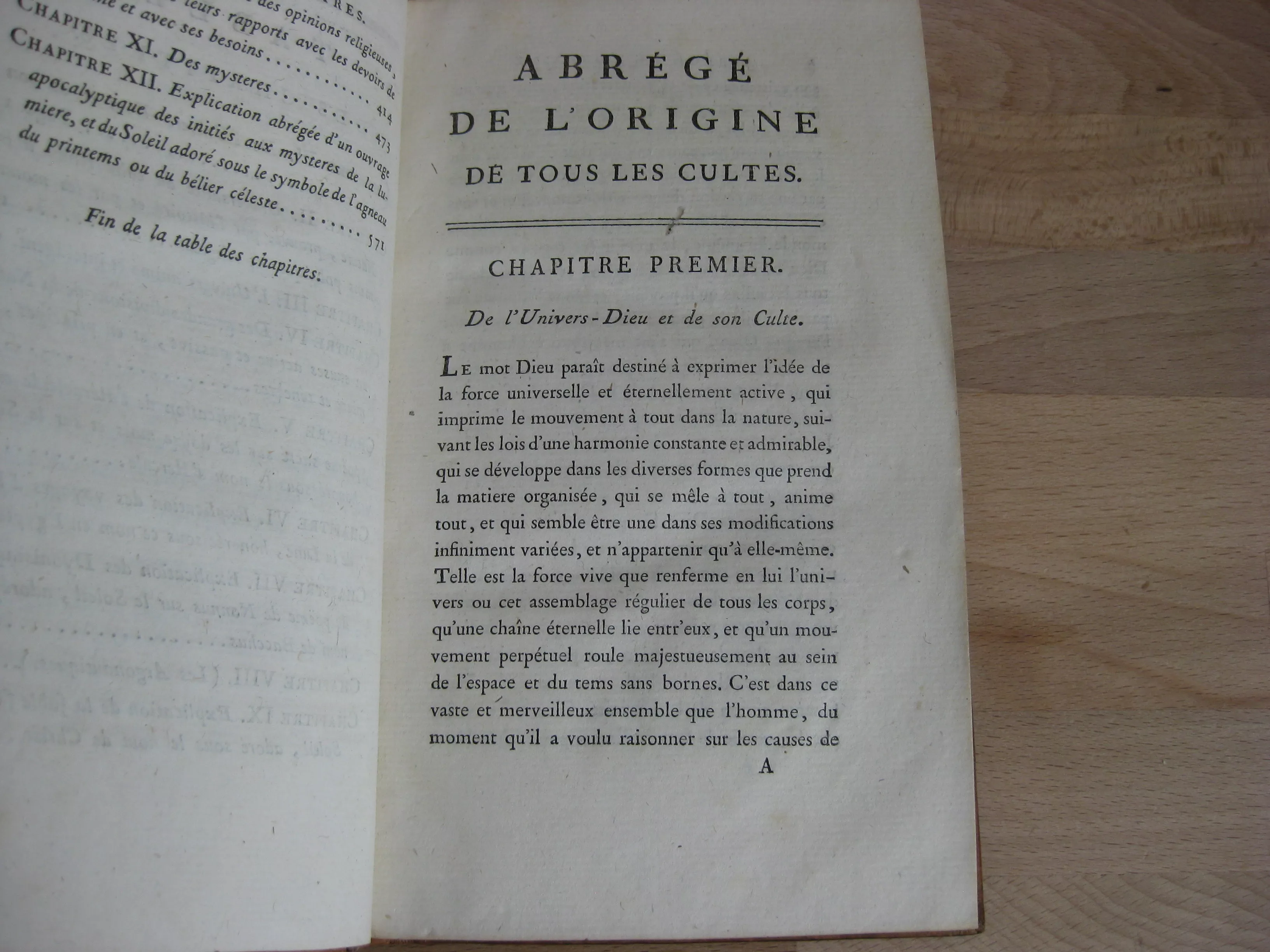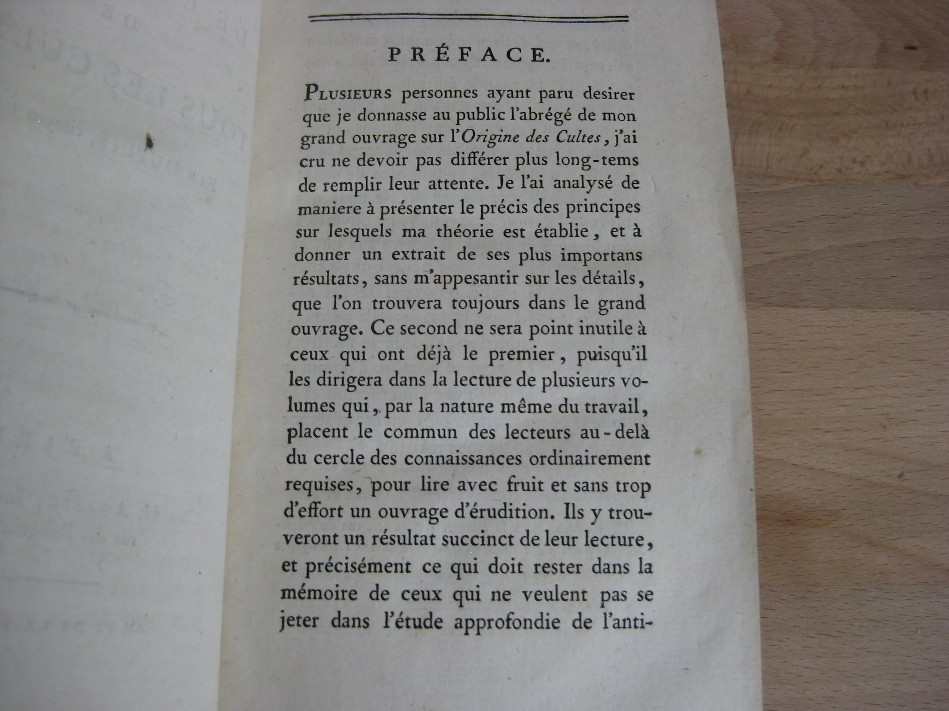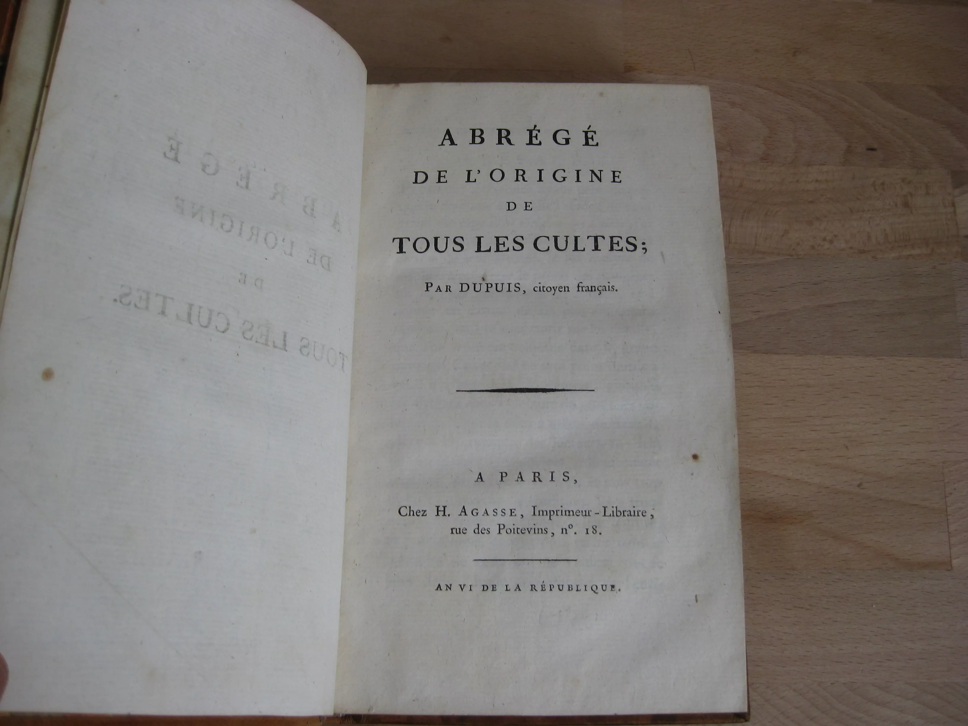 Érudit, scientifique et homme politique, Charles-François Dupuis fait paraître en 1795, l’Origine de tous les Cultes, ou la Religion universelle, « véritable bréviaire de l’athéisme philosophique », dans lequel il développe « son système ». S’appuyant sur un vaste travail comparatif, il cherche à y démontrer l’origine commune des positions religieuses et astronomiques chez les Égyptiens, les Grecs, les Chinois, les Perses et les Arabes. (…) L’abrégé donné en 1798 lui permet d’atteindre un plus large public. L’influence de l’ouvrage est durable, perceptible dans les travaux des archéologues Jacques-Antoine Dulaure et Alexandre Lenoir, chez Volney ou encore chez les idéologues, comme Destutt de Tracy. » (wikip)