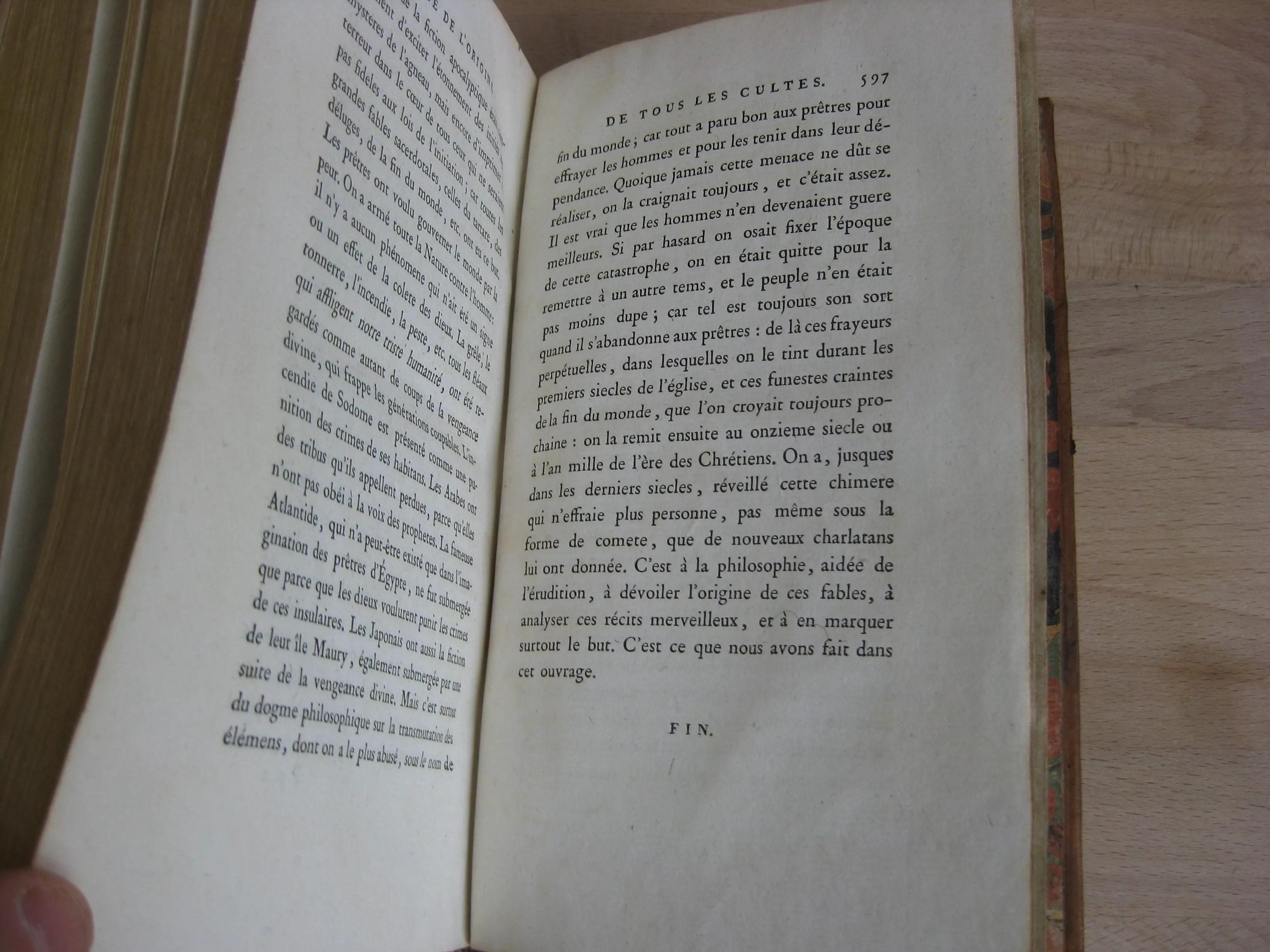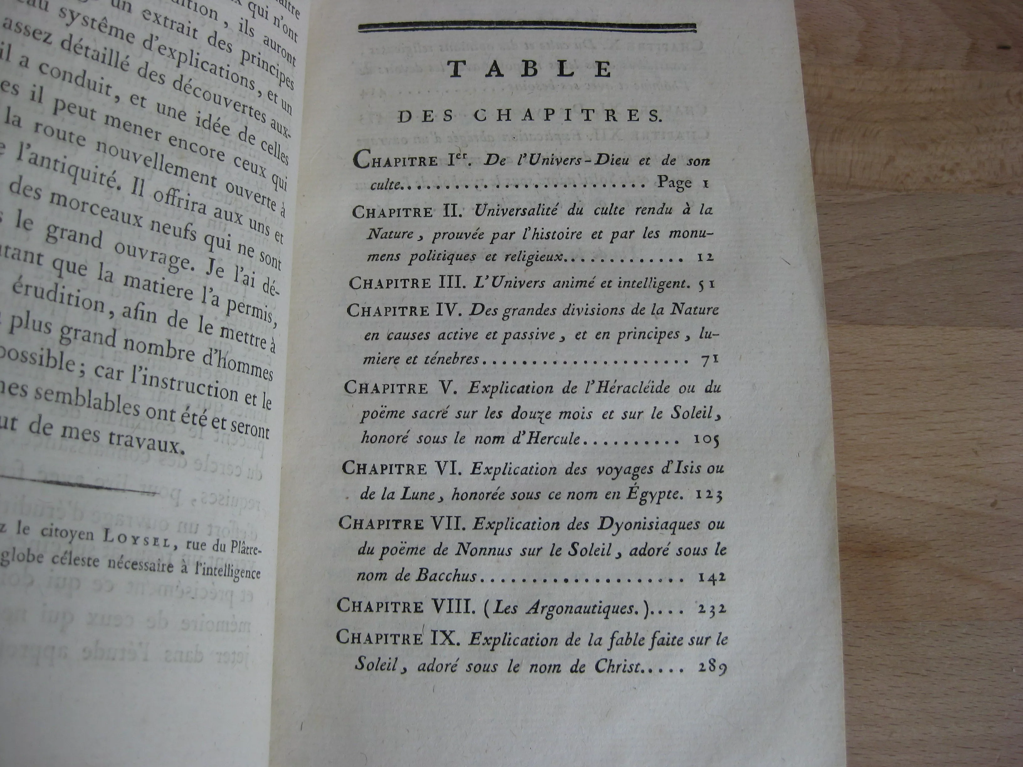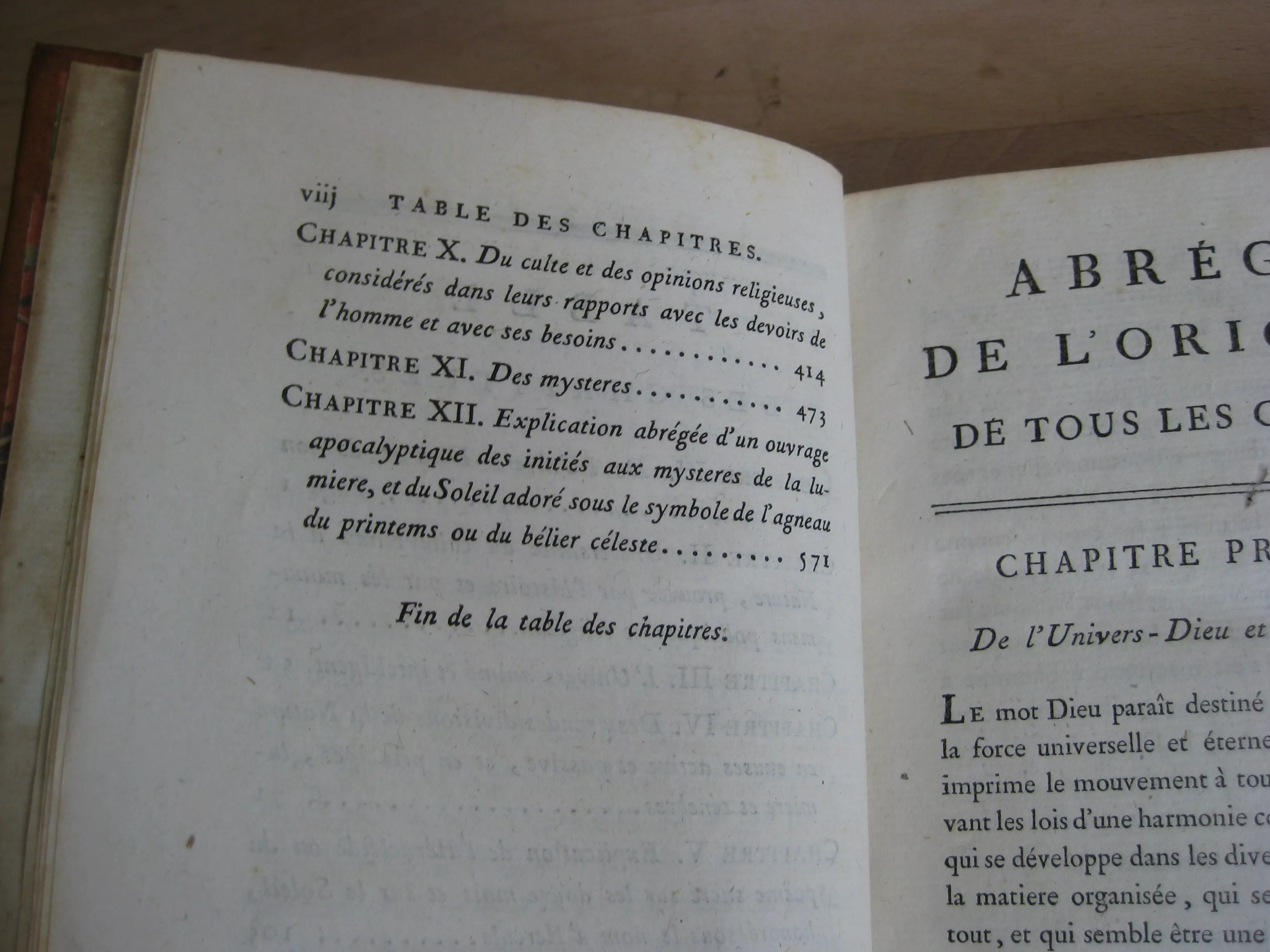 Érudit, scientifique et homme politique, Charles-François Dupuis fait paraître en 1795, l’Origine de tous les Cultes, ou la Religion universelle, « véritable bréviaire de l’athéisme philosophique », dans lequel il développe « son système ». S’appuyant sur un vaste travail comparatif, il cherche à y démontrer l’origine commune des positions religieuses et astronomiques chez les Égyptiens, les Grecs, les Chinois, les Perses et les Arabes. (…) L’abrégé donné en 1798 lui permet d’atteindre un plus large public. L’influence de l’ouvrage est durable, perceptible dans les travaux des archéologues Jacques-Antoine Dulaure et Alexandre Lenoir, chez Volney ou encore chez les idéologues, comme Destutt de Tracy. » (wikip)