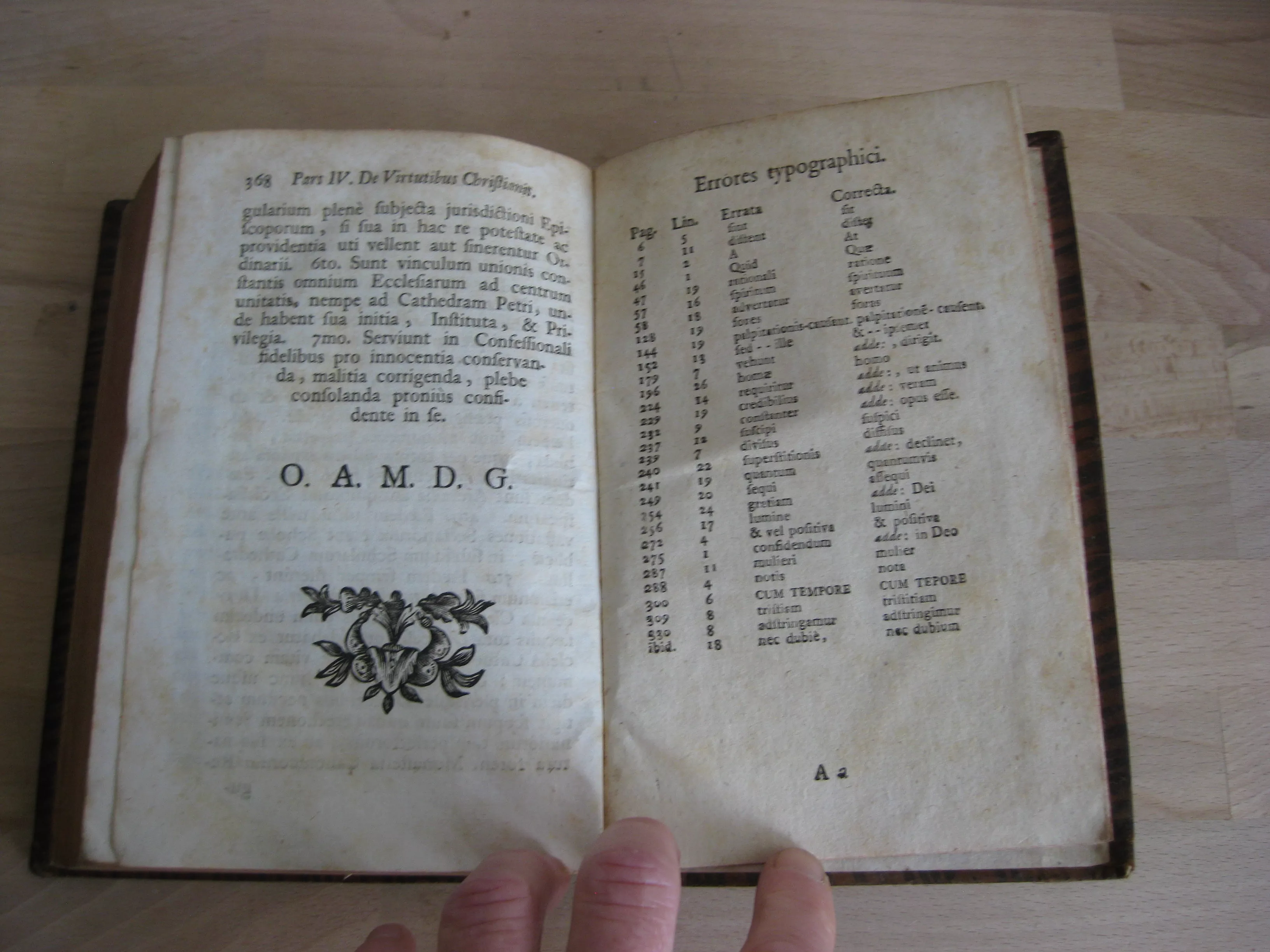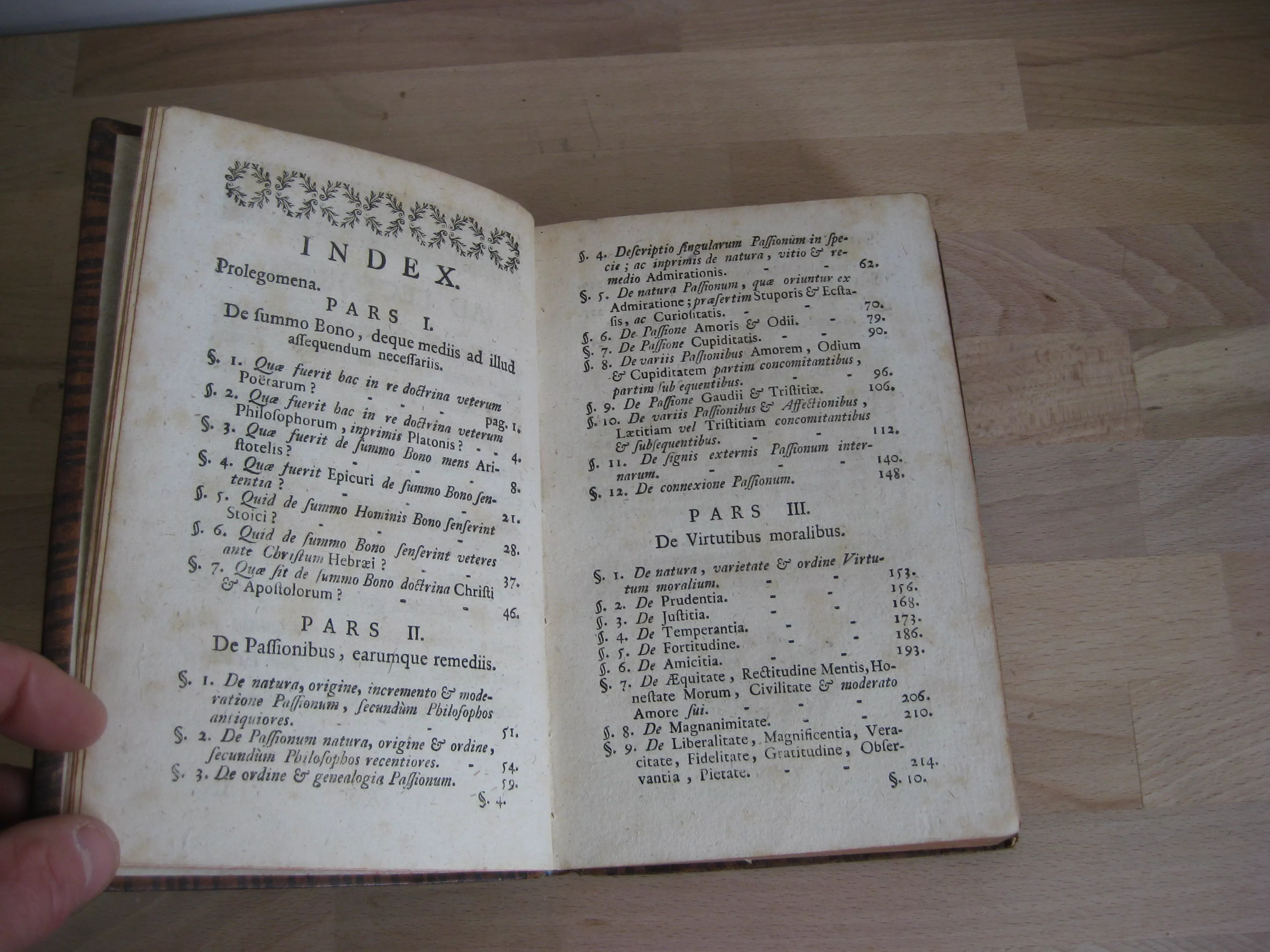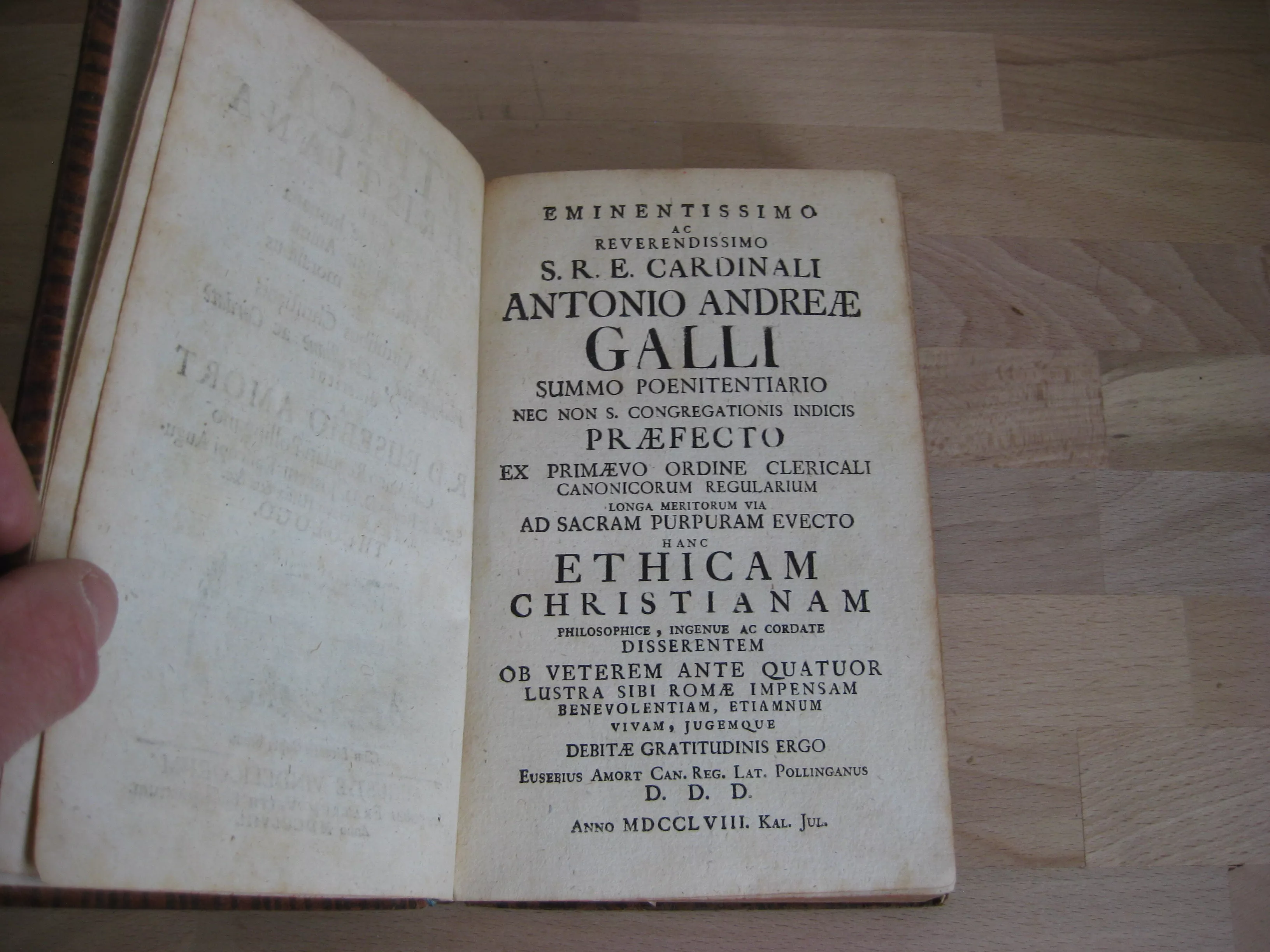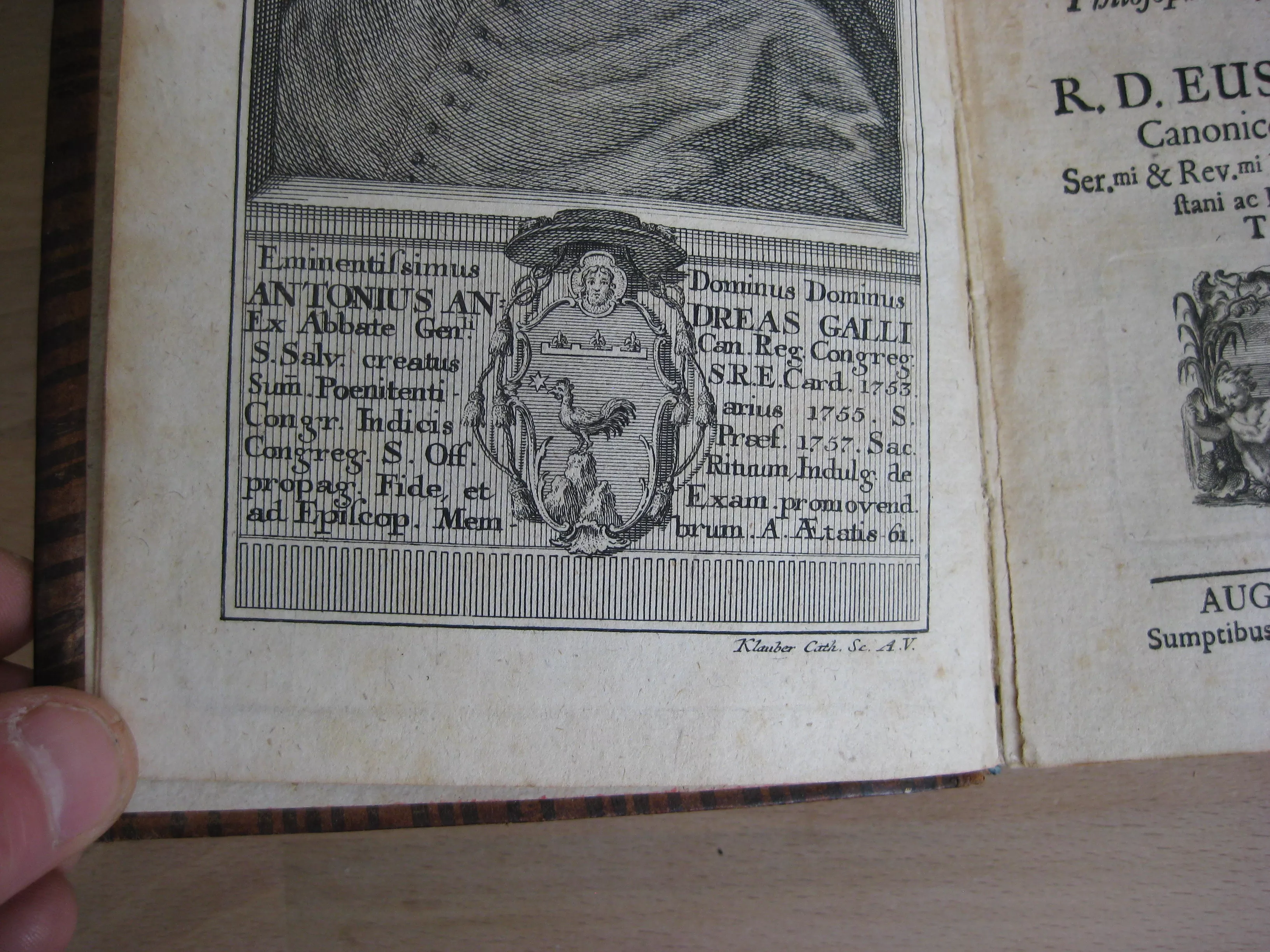 Plein veau marbré, dos à cinq nerfs, orné d’une pièce de titre olive au titre en creux, tranches jaspées rouges, 190 x 128, 368p. 1758. Première édition, avec très joli frontispice gravé par la graveuse allemande Catharina Klauber [identité réelle sujette à interrogation : portrait dans un grand encadrement du cardinal italien Antonus Andreas Galli [1697-1767 ] surplombant une adresse en piedestal, avec les armoiries du cardinal au centre. Jolie vignette allégorique au titre celle de l’éditeur avec son monogramme en pied à l’encre et boussole et la devise « Aperi et pretiosa lege » , vignette gravée par Joseph-Erasmus Bellinger. Ex-libris ou inscription latine manuscrite en garde. Comprend : Adresse au Cardinal Galli, Approbation et Adresse au lecteur, Index, Prolegomena , 10p. Puis le texte terminé par la devise jésuite acronyme O.A.M.D.G. [Omnia Ad Majorem Dei Gloriam]. In fine : Errores typographici. Intérieur propre mais avec rousseurs continues. Reliure en bel état excepté la coiffe manquante avec un manque au caisson de tête, la queue avec un petit manque et un trou de ver aux caisson de pied. Bel exemplaire bien ferme. Théologien catholique allemand, Eusebios Amort (1692-1775) est notamment l’auteur d’un cours de philosophie pour le diocèse d’Augsbourg.