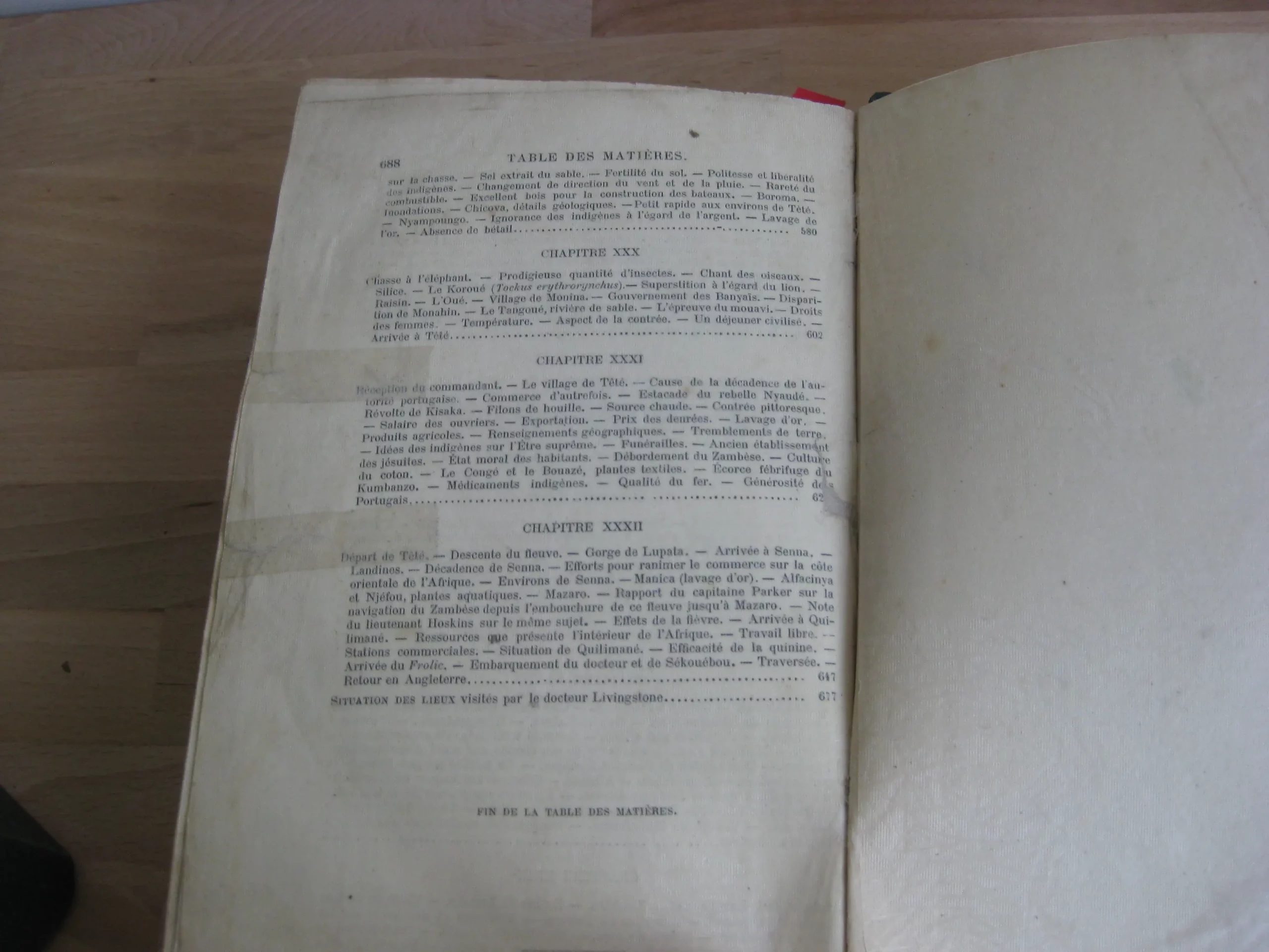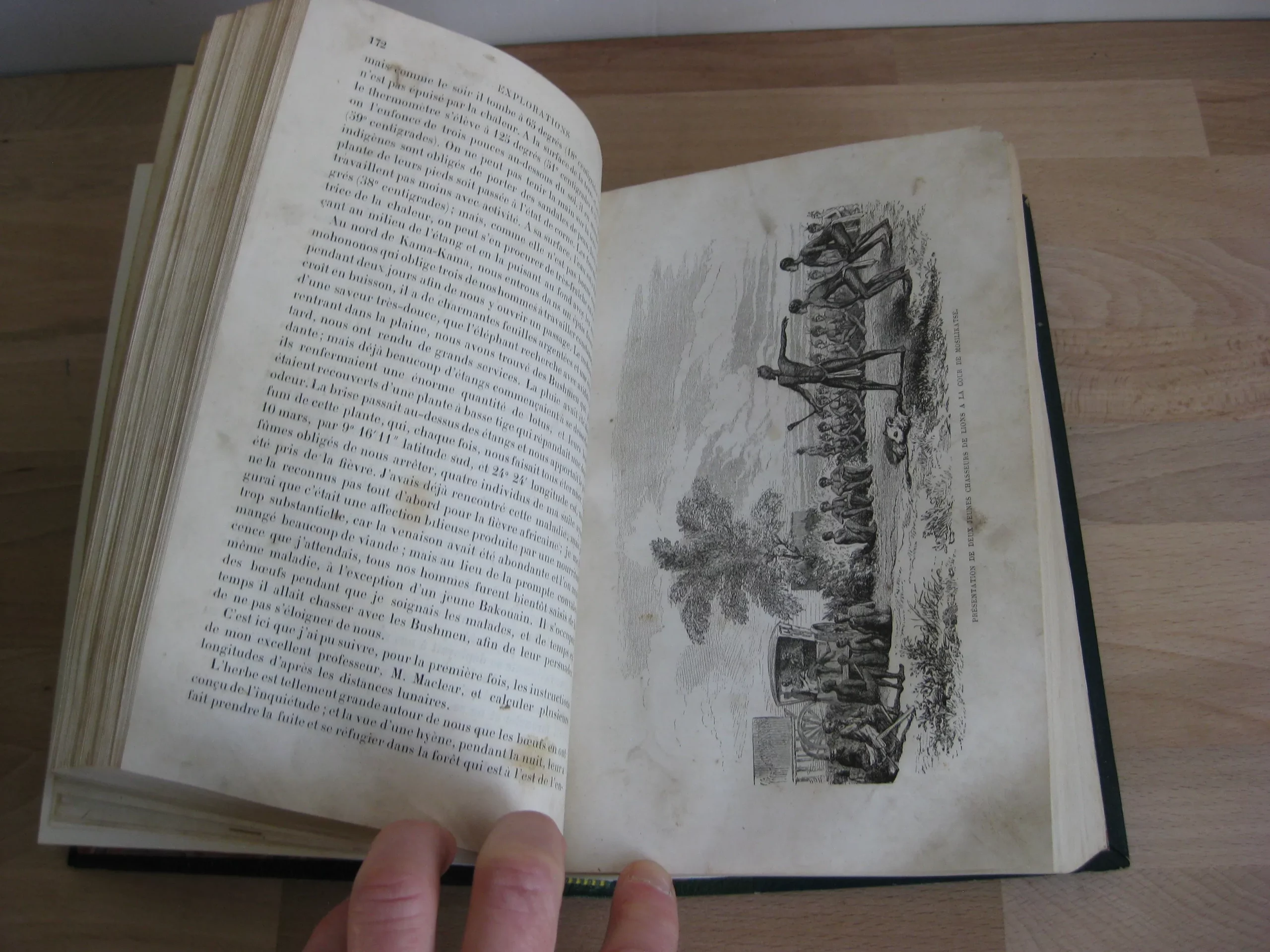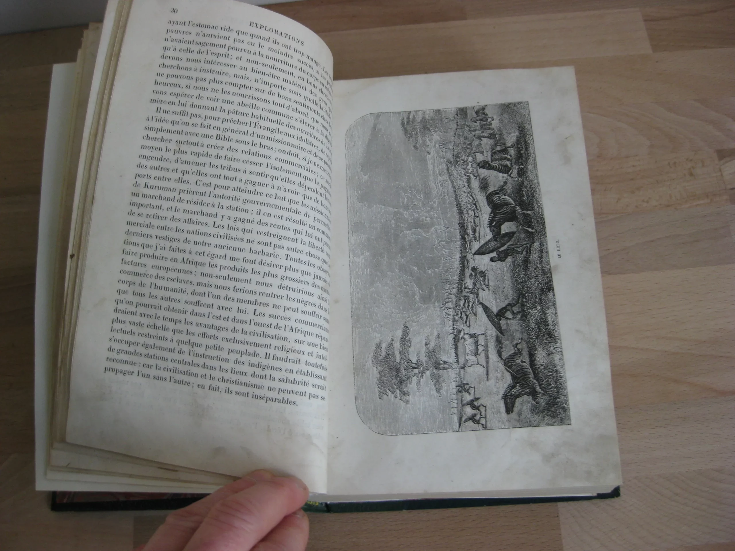 Reliure moderne pleine simili chagrin vert deux tons, à dos long orné des titre et auteur, 230 x 156, 675p. Suivi de l’Appendice : Situations des lieux visités par le docteur Livingstone, 5p. 1877. Nouvelle édition. Ouvrage traduit de l’anglais par Mme H. Loreau. 2 frontispices : frontispice dépliant (traces grises mais intègre) vis-à-vis du titre : chutes du Zanbèse, et portrait de l’auteur juste avant la lettre. 22 planches à pleine page hors texte (traces, mais intègres), 23 fines figures dans le texte, une planche dépliante (Coupe idéale du centre de l’Afrique australe), intègre, avec consolidation adhésive au verso des plis, et 2 cartes in fine très incomplètes, glissées sous claque pour la seconde : un bon tiers manque sur la première avec une déchirure sans manque ; au 3/4 manquante pour la seconde. Défauts dans le texte : pages 55-56 et 57-58 manquantes, soit le début du chapitre III ; et une page avec une déchirure sans manque. Page de faux-titre restauré en marge intérieure, et page de titre avec une restauration adhésive. Nombreuses traces taches grises sur les planches et pages. Pages un peu gondolées et claquantes dans le dernier tiers. Provenance : cercle royal de Quaregnon : Bibliothèque populaire de Quaregnon, comme l’indiquent les deux tampons un au faux-titre et un en page de titre ; un code au titre et en faux-titre. En contreplat supérieur : vignette d’un libraire belge de Kessel-Lo. Page de faux-titre restauré en marge intérieure, et page de titre avec une restauration adhésive. Coins frottés avec épidermures, mais reliure en très bel état.