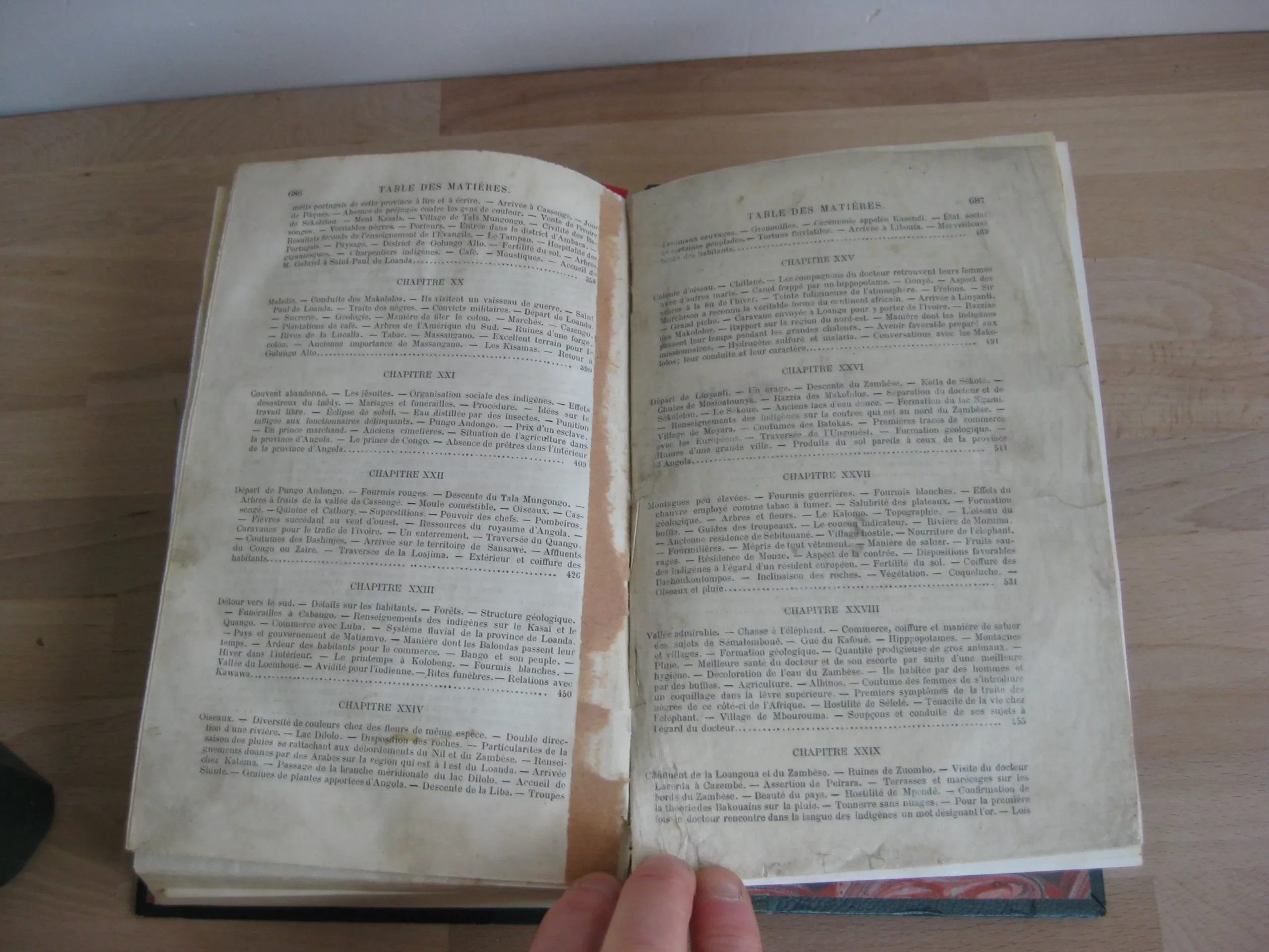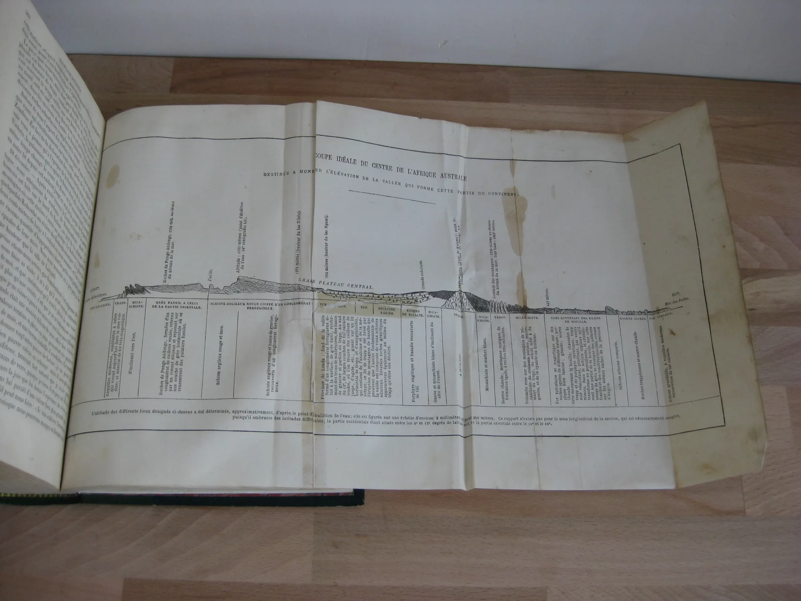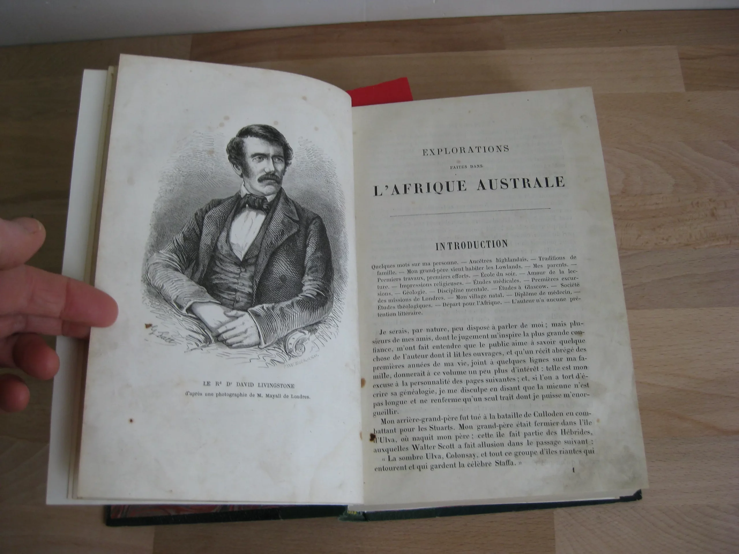 Reliure moderne pleine simili chagrin vert deux tons, à dos long orné des titre et auteur, 230 x 156, 675p. Suivi de l’Appendice : Situations des lieux visités par le docteur Livingstone, 5p. 1877. Nouvelle édition. Ouvrage traduit de l’anglais par Mme H. Loreau. 2 frontispices : frontispice dépliant (traces grises mais intègre) vis-à-vis du titre : chutes du Zanbèse, et portrait de l’auteur juste avant la lettre. 22 planches à pleine page hors texte (traces, mais intègres), 23 fines figures dans le texte, une planche dépliante (Coupe idéale du centre de l’Afrique australe), intègre, avec consolidation adhésive au verso des plis, et 2 cartes in fine très incomplètes, glissées sous claque pour la seconde : un bon tiers manque sur la première avec une déchirure sans manque ; au 3/4 manquante pour la seconde. Défauts dans le texte : pages 55-56 et 57-58 manquantes, soit le début du chapitre III ; et une page avec une déchirure sans manque. Page de faux-titre restauré en marge intérieure, et page de titre avec une restauration adhésive. Nombreuses traces taches grises sur les planches et pages. Pages un peu gondolées et claquantes dans le dernier tiers. Provenance : cercle royal de Quaregnon : Bibliothèque populaire de Quaregnon, comme l’indiquent les deux tampons un au faux-titre et un en page de titre ; un code au titre et en faux-titre. En contreplat supérieur : vignette d’un libraire belge de Kessel-Lo. Page de faux-titre restauré en marge intérieure, et page de titre avec une restauration adhésive. Coins frottés avec épidermures, mais reliure en très bel état.
