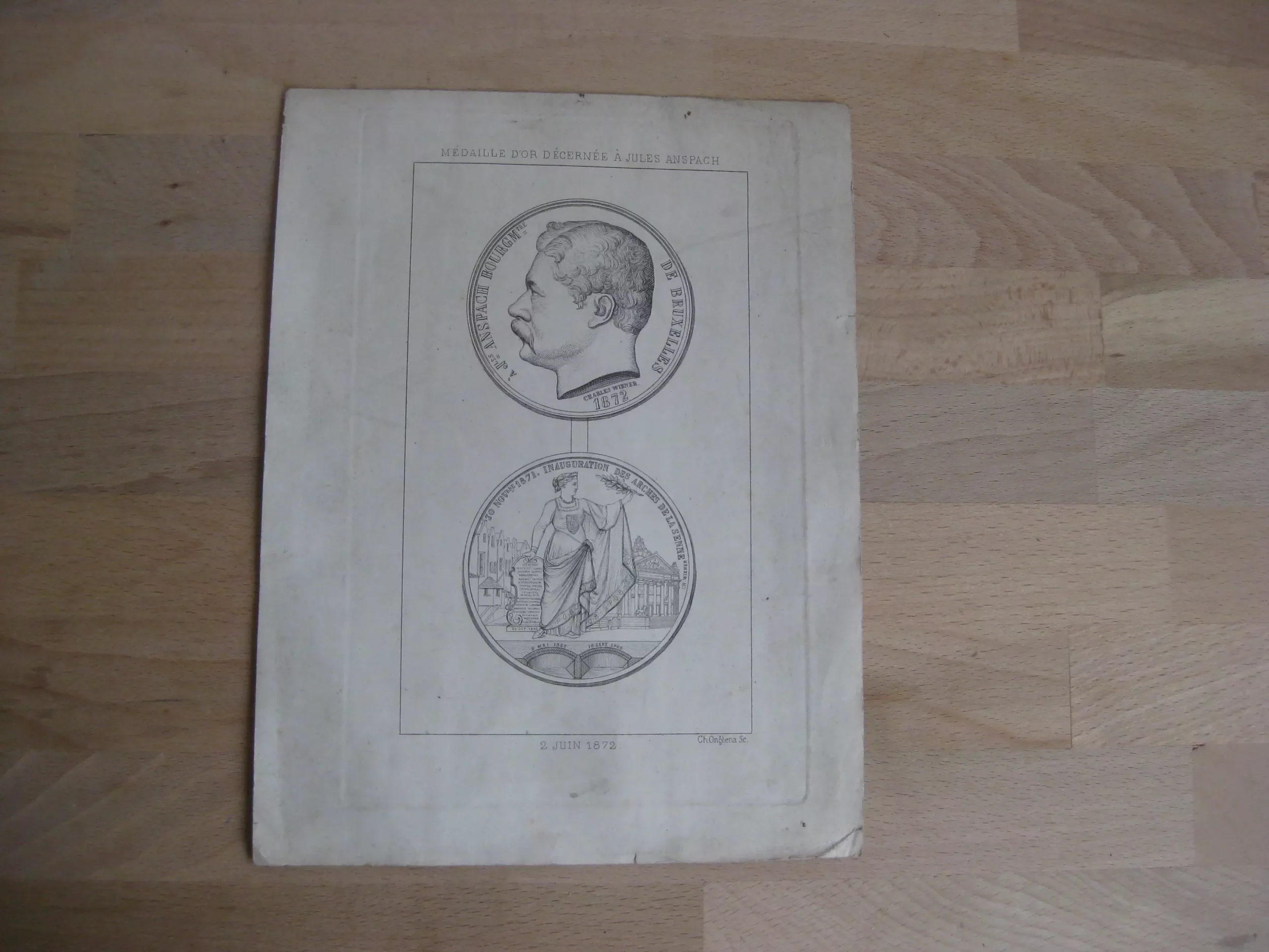 DescriptionGravure – Médaille décernée à Jules Anspach, 2 juin 1872 Bourgmestre de Bruxelles et Inauguration des arches de la Seine, 30 novembre 1871