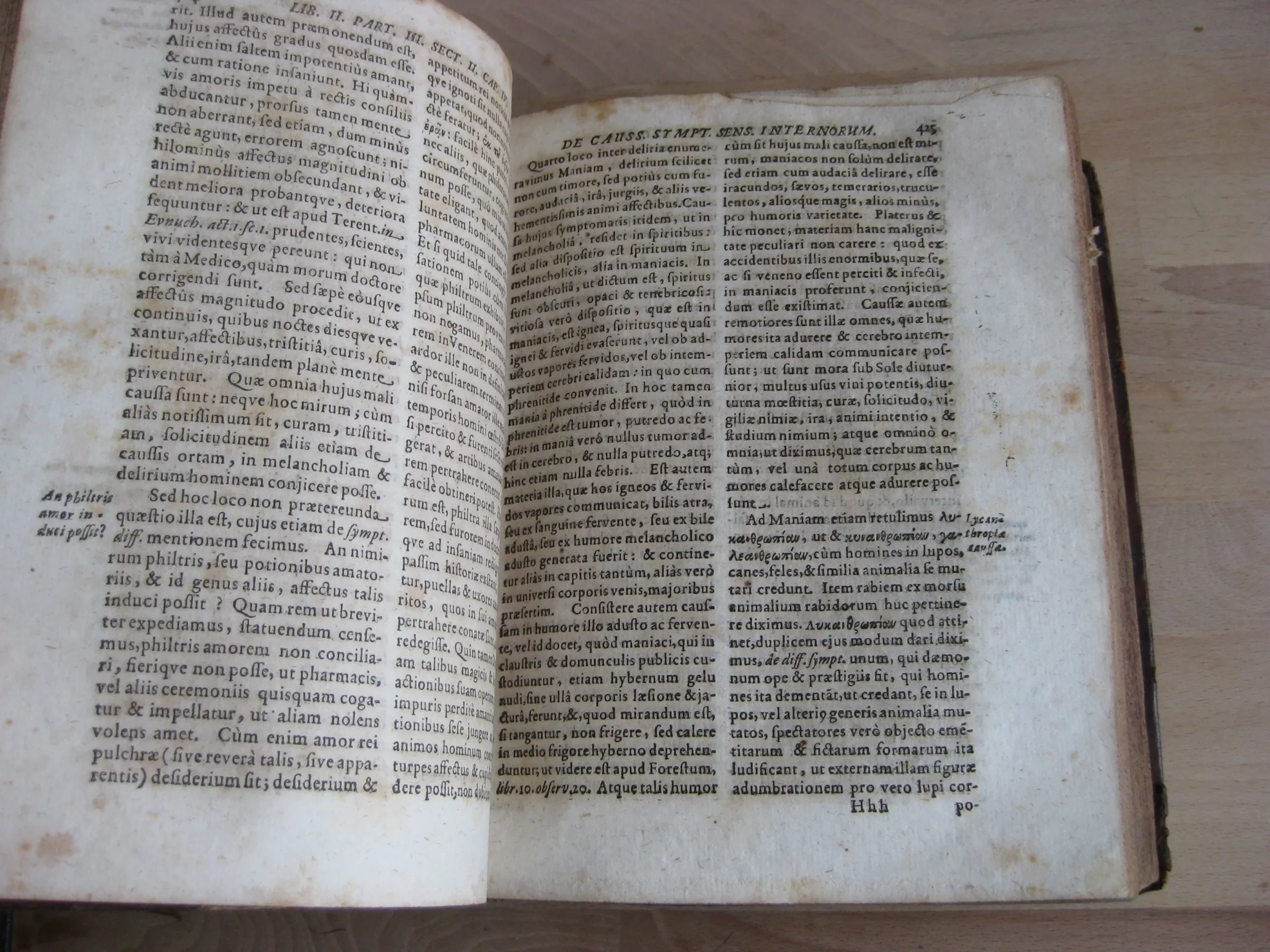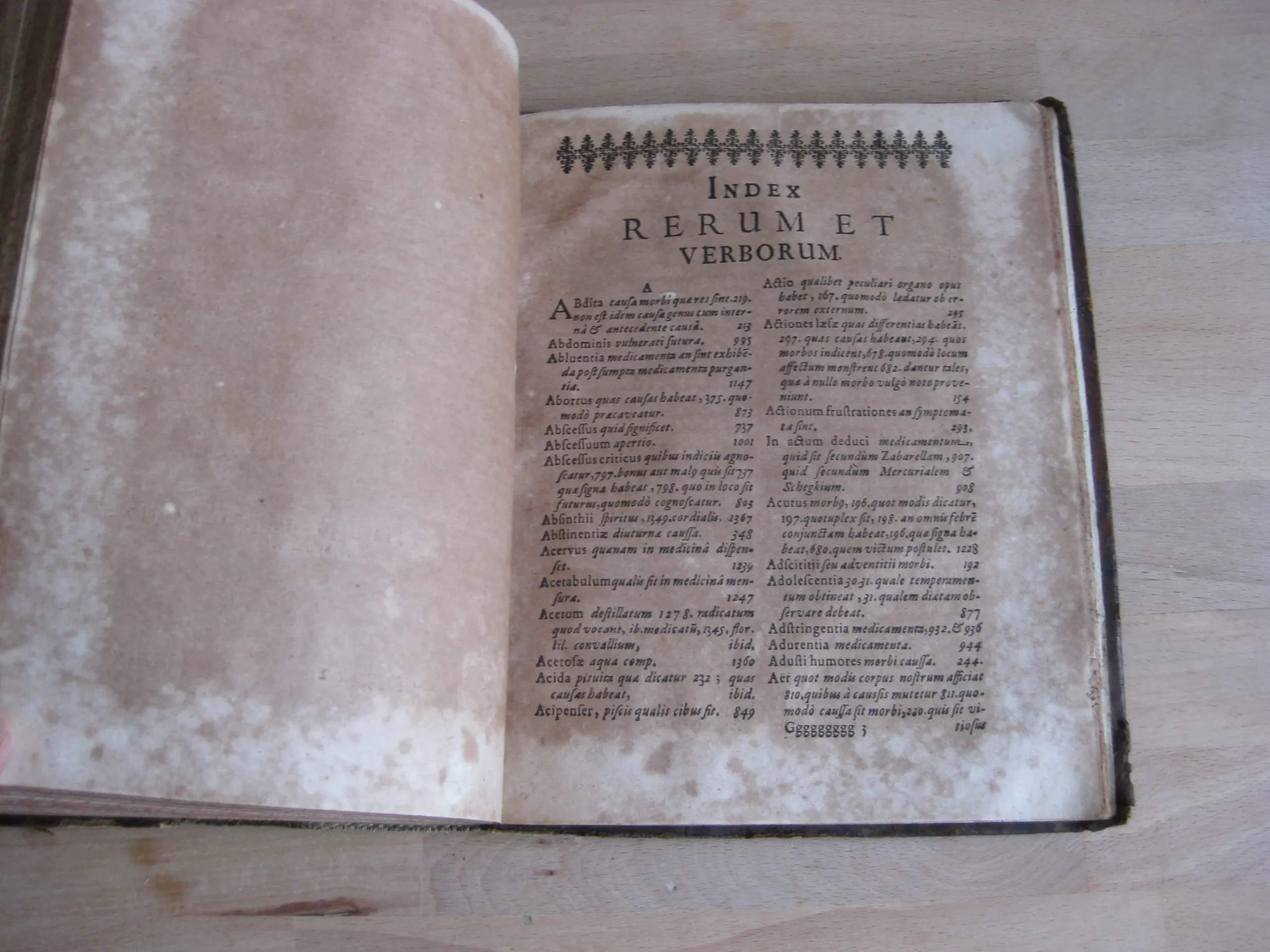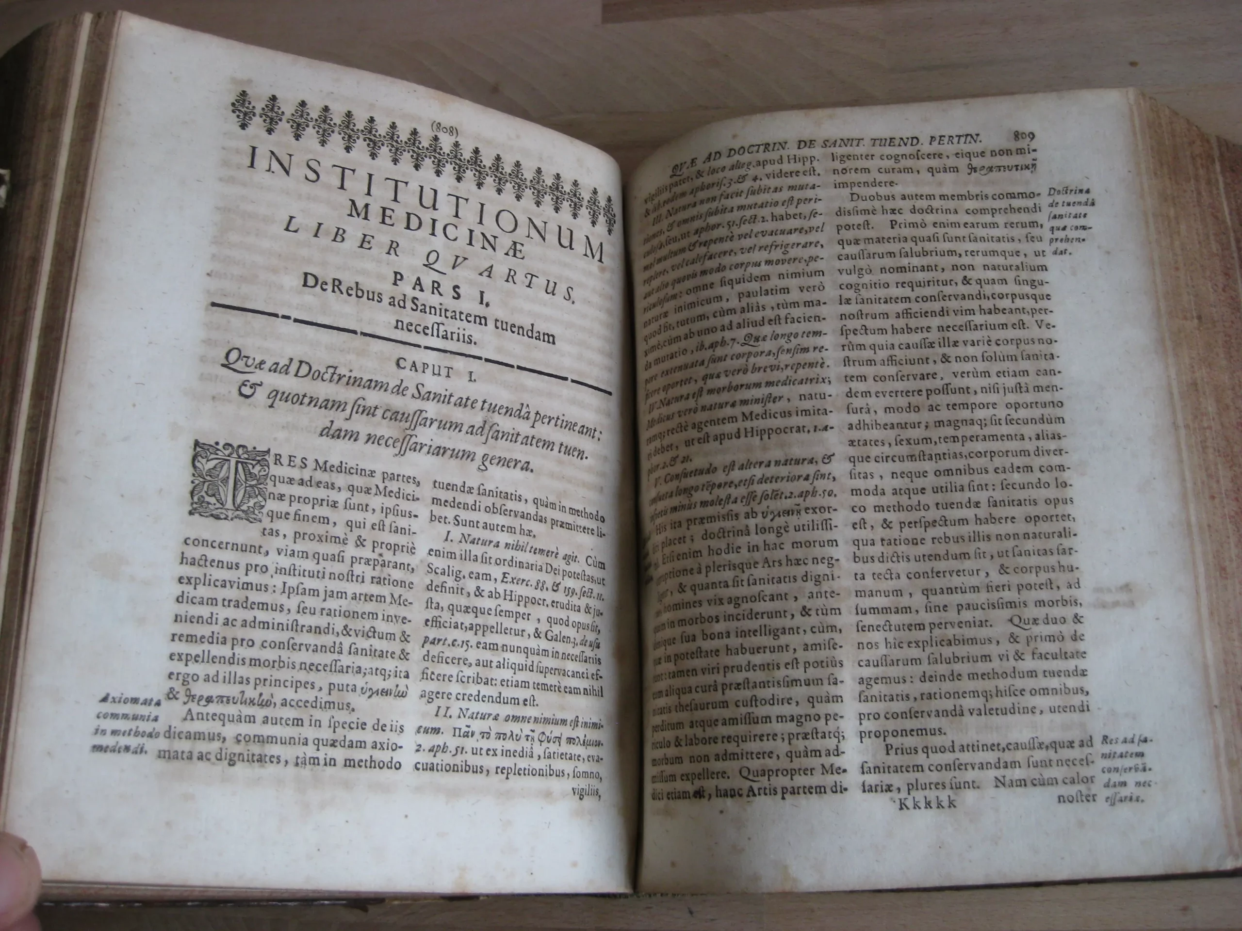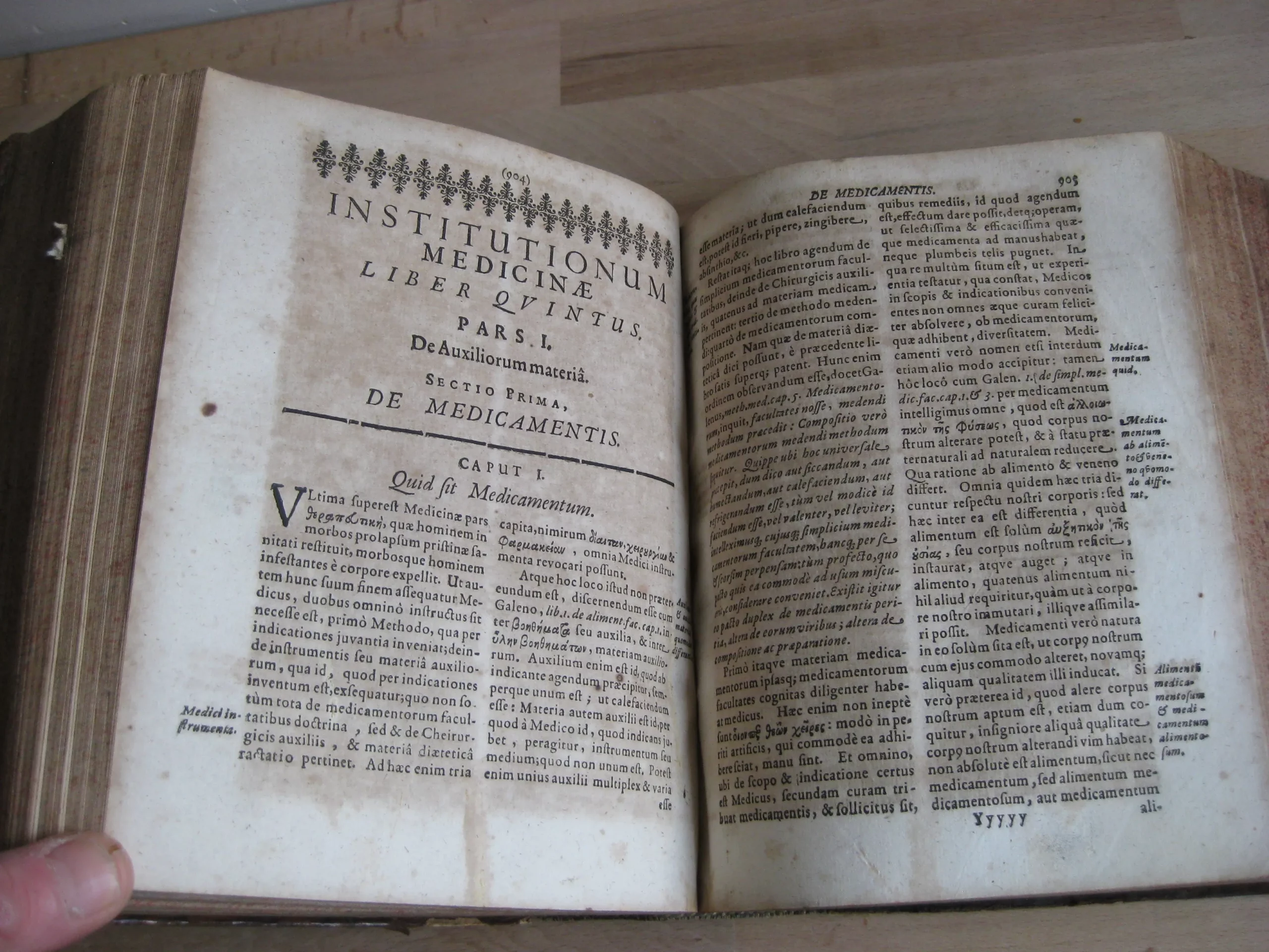 Un bel ex-libris manuscrit en première page blanche et 1 au premier titre : « Joannes Carolus Perié medicus 1732 », Comprend : 8 feuillets blanc. Adresse à Joh Georgio duci saxoniae [Jean-Georges Ier de Saxe ], 6p. Adresse au lecteur, 6p. Altera / tetier / quarta praefacio, 10p. Suivi de l’index des 5 livres, 13p. Index des Quaestionum controversarum, 10p. ; et un hommage à P. Laurembergius en vis-à-vis de la première page du texte. Puis les cinq livres, 1523p. Suivi de l’Index rerum et verborum, 50p. Et 1 feuillet blanc. Intérieur avec rousseurs, d’intensité variable, mais globalement uniformément brunis, petit manque de papier en marge latérale des derniers feuillets, pas de manque dans le texte.