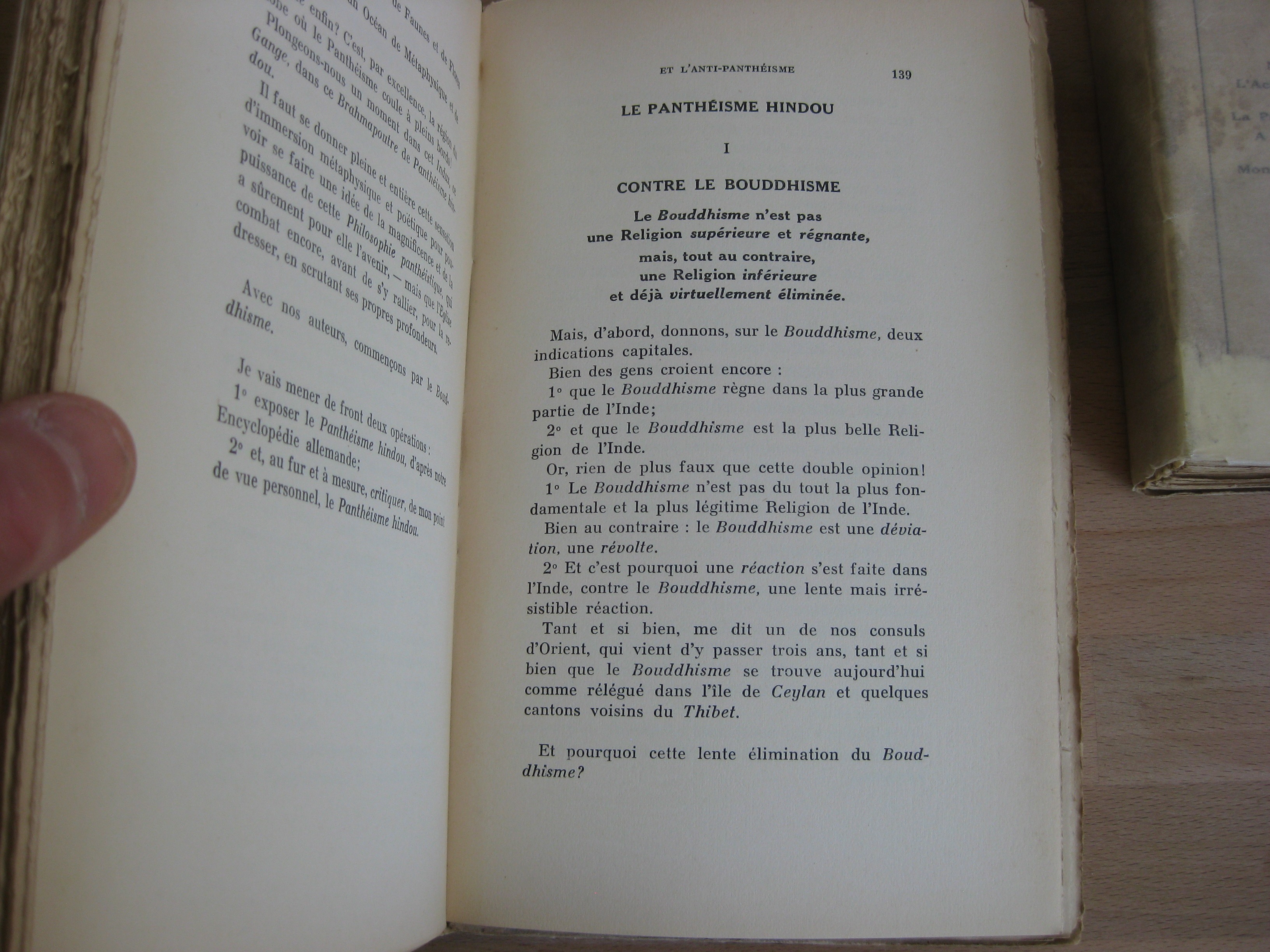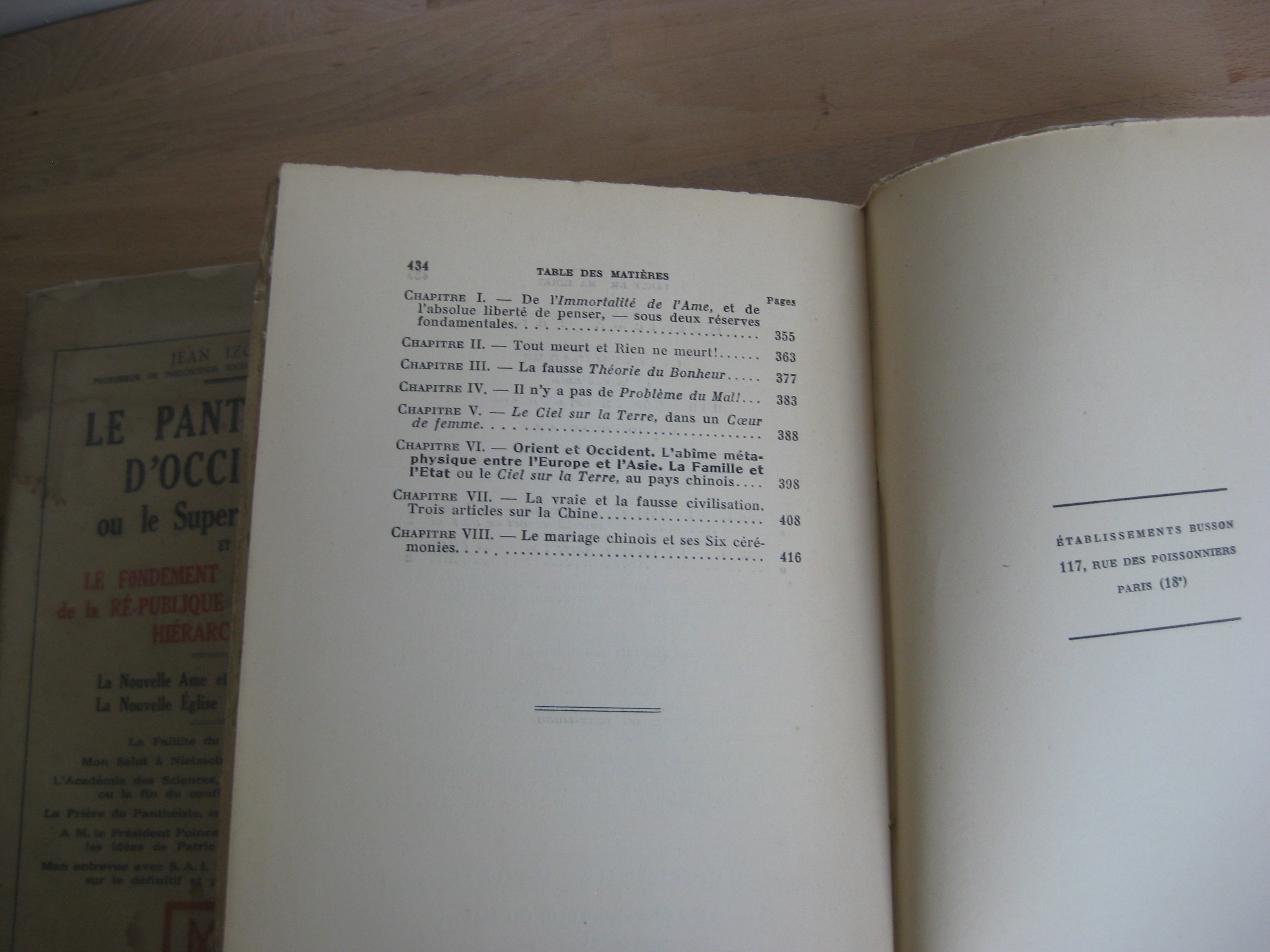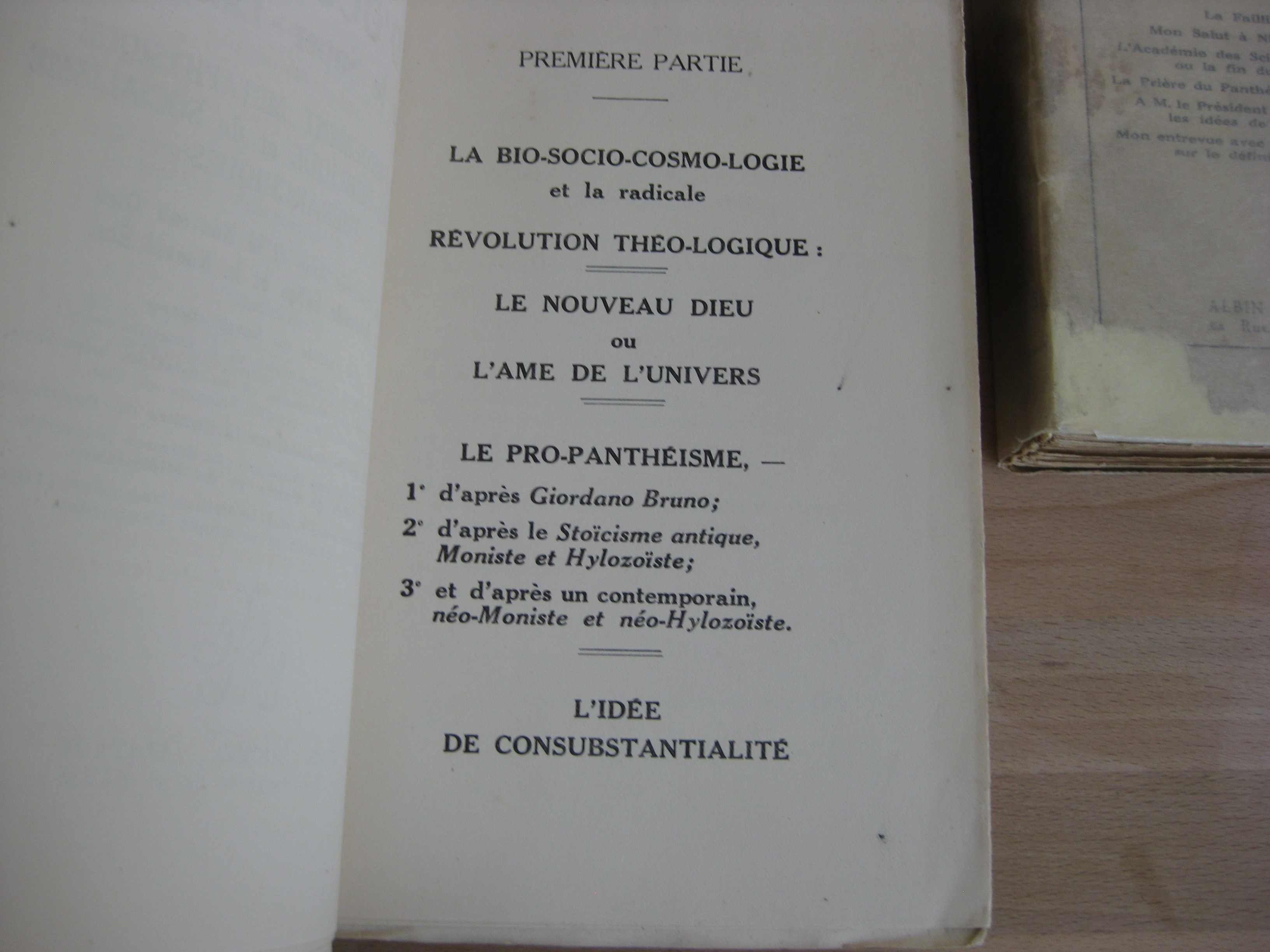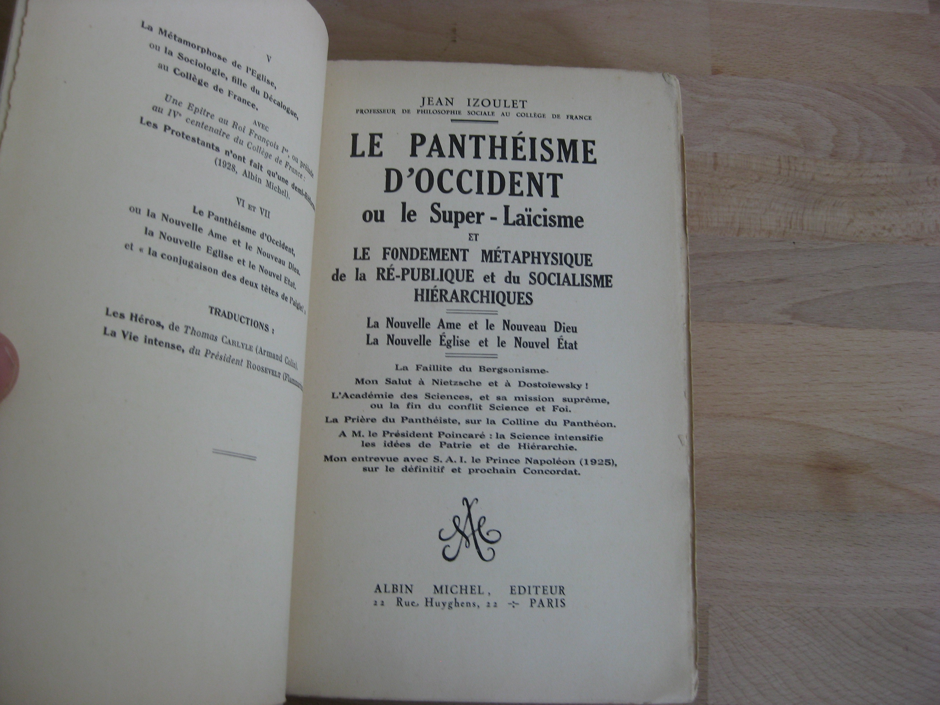Jean Izoulet. Le Panthéisme d’Occident ou le Super-laïcisme et le fondement métaphysique de la république et du socialisme hiérarchiques. La Nouvelle Ame et le Nouveau Dieu. La Nouvelle Église et le Nouvel État 2 vol. Broché, 230 x 145, 1928. 380p et 434p. Edition originale, sur vergé Lafuma tiré à 50 ex, n°9 ; très rare et rarement complet de ses deux volumes.