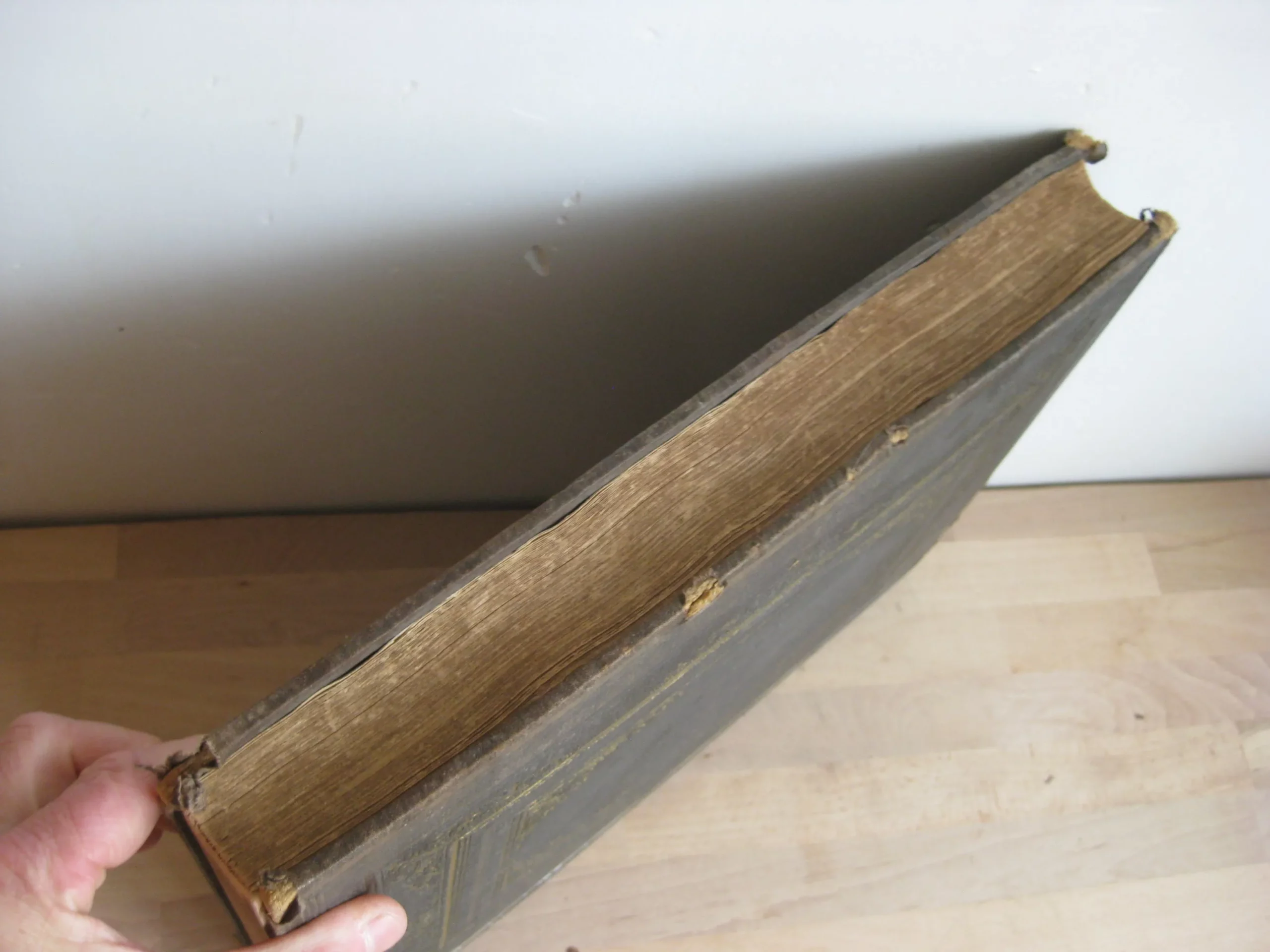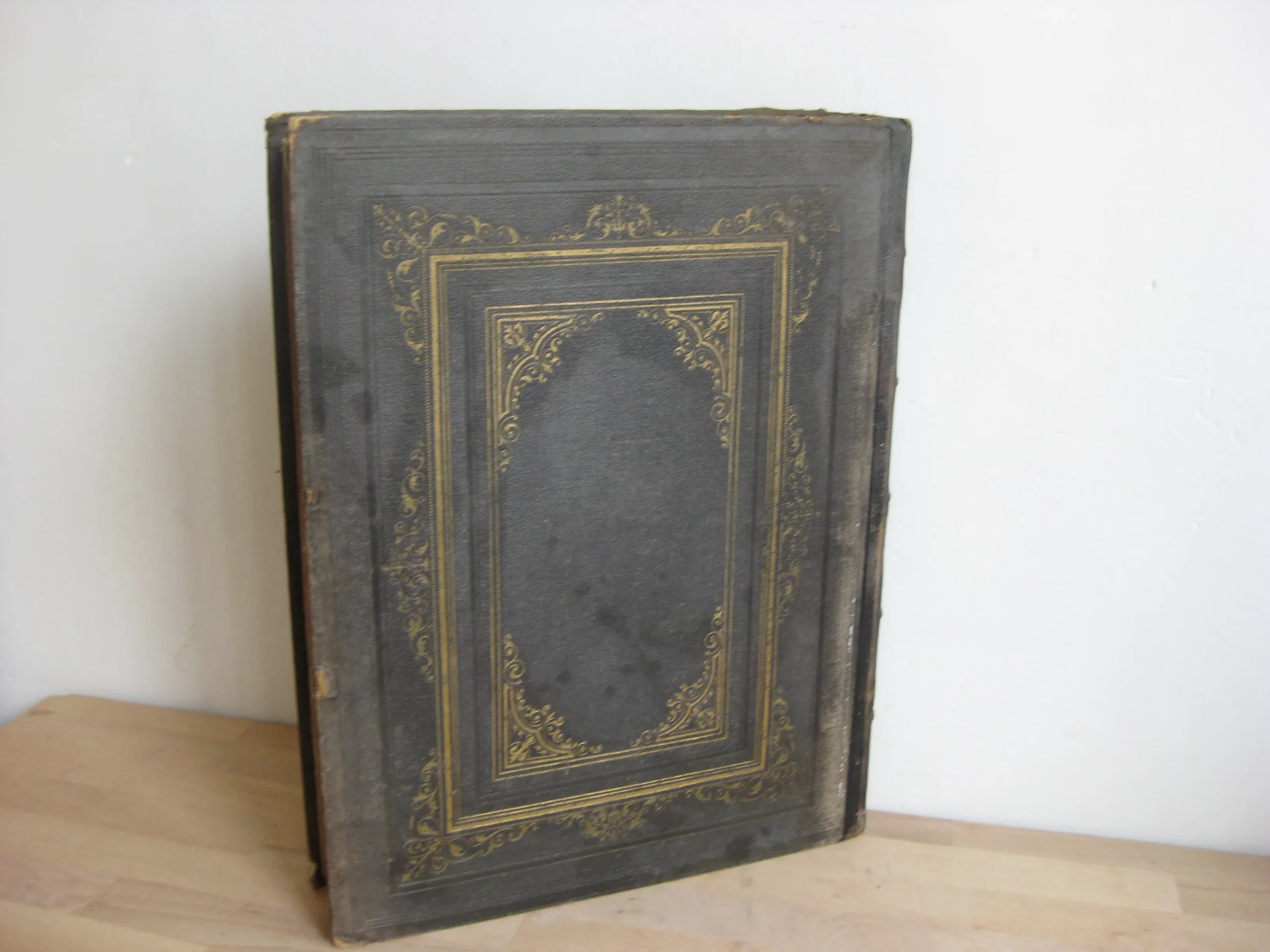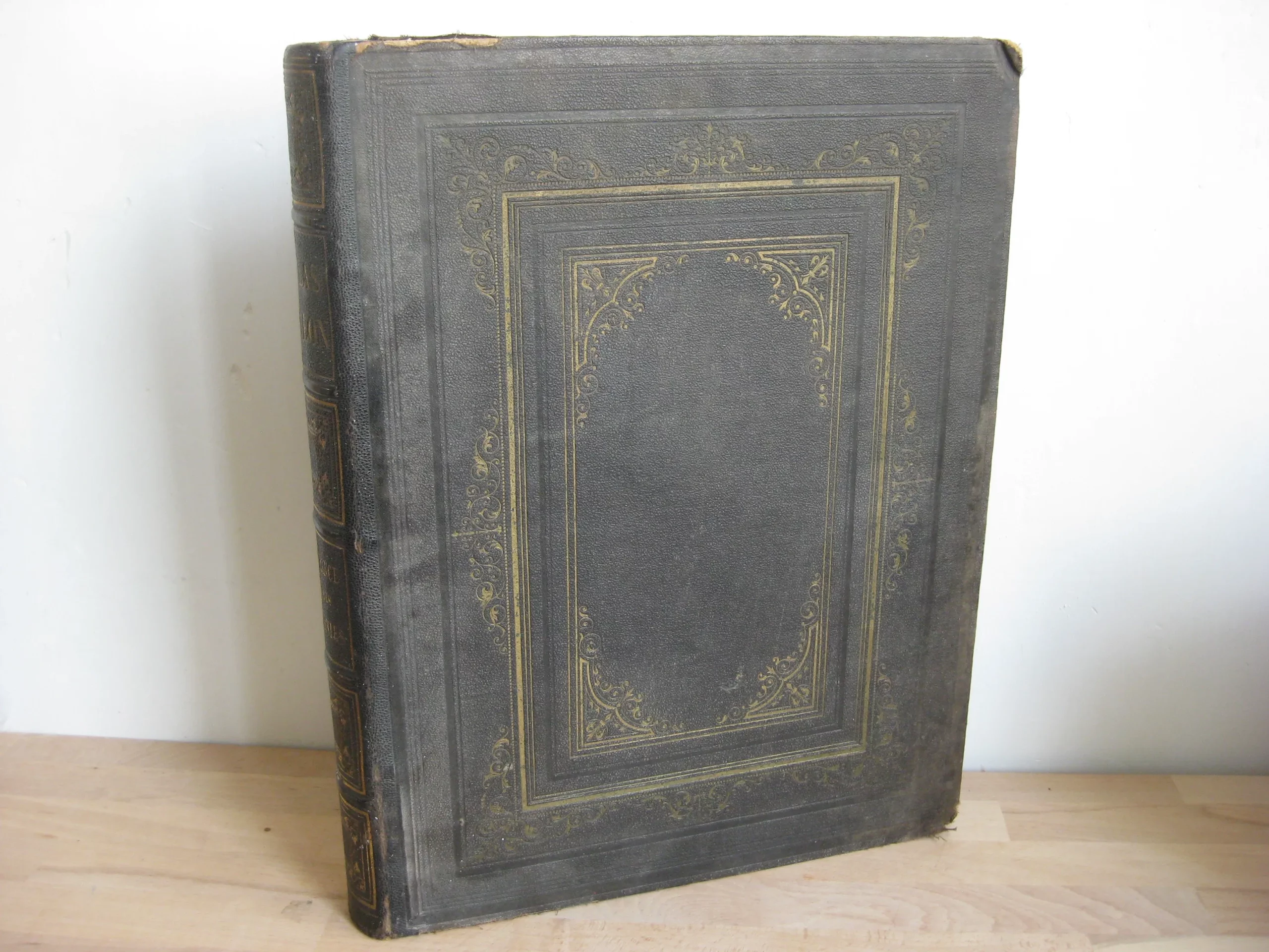 In-folio plein chagrin noir, dos à faux-nerfs orné des titres et éditeurs, et d’encadrements aux caissons, plats estampés d’une grand encadrement avec décor au fer dans un autre encadrement, 364 x 285, non paginé. 1877.