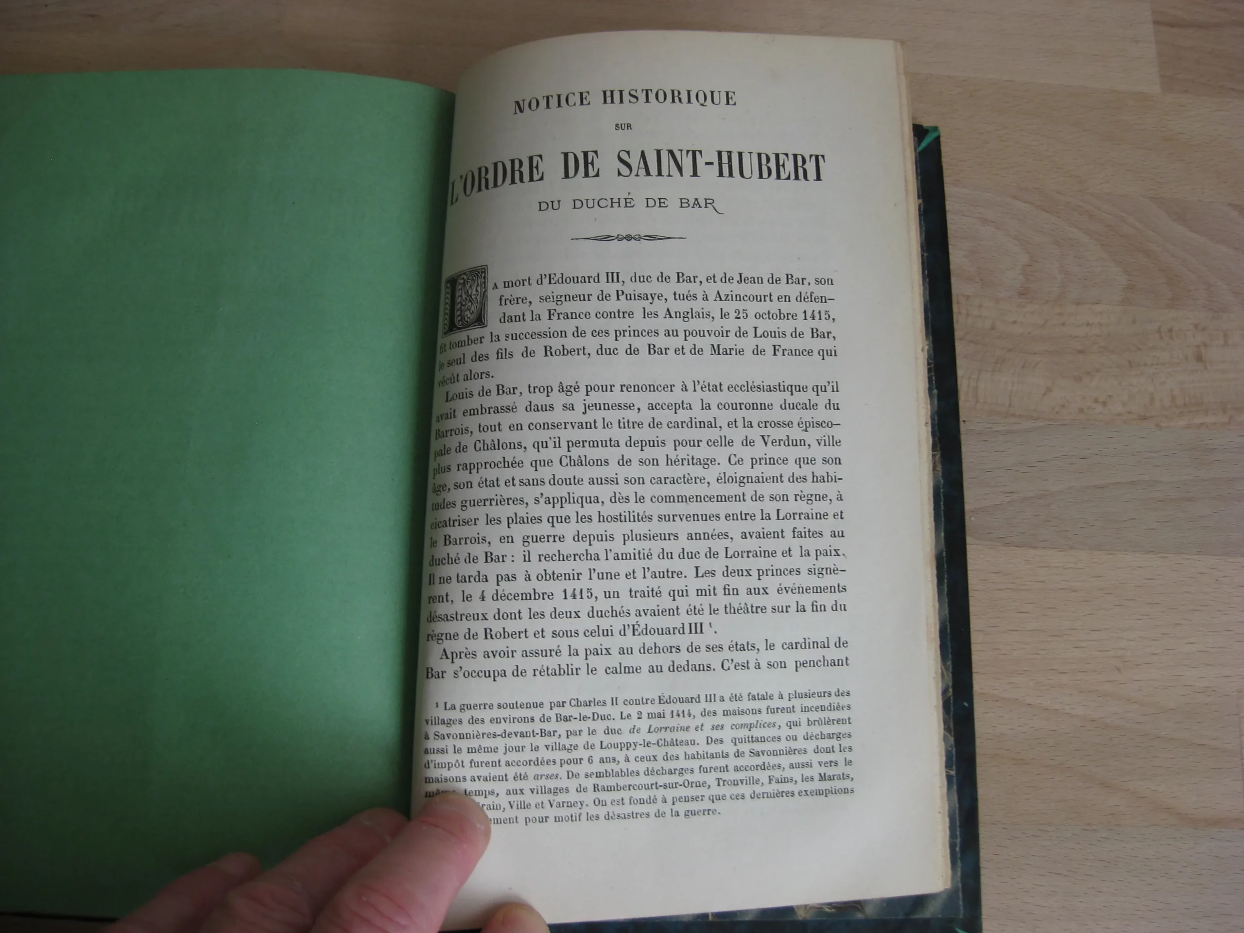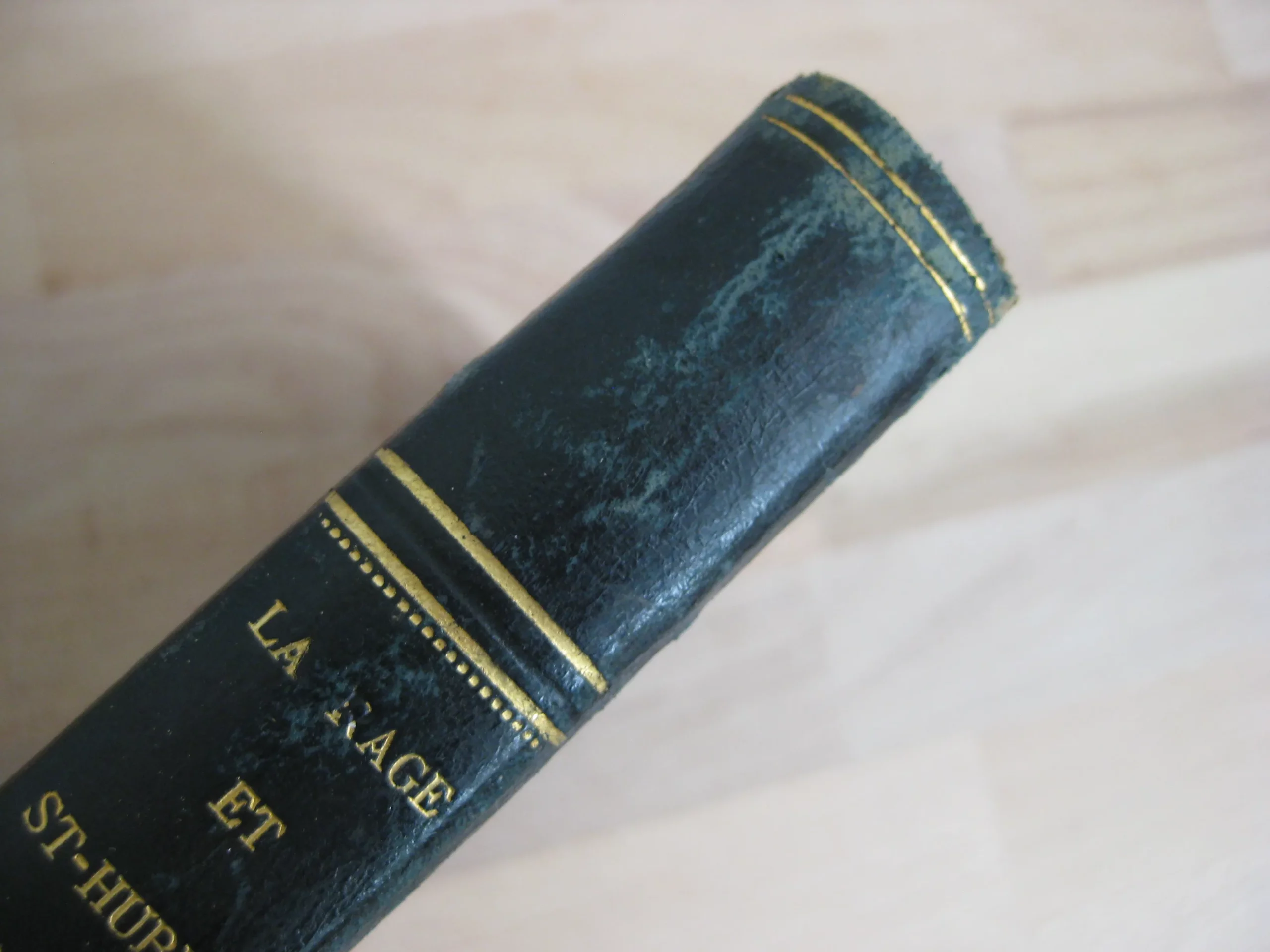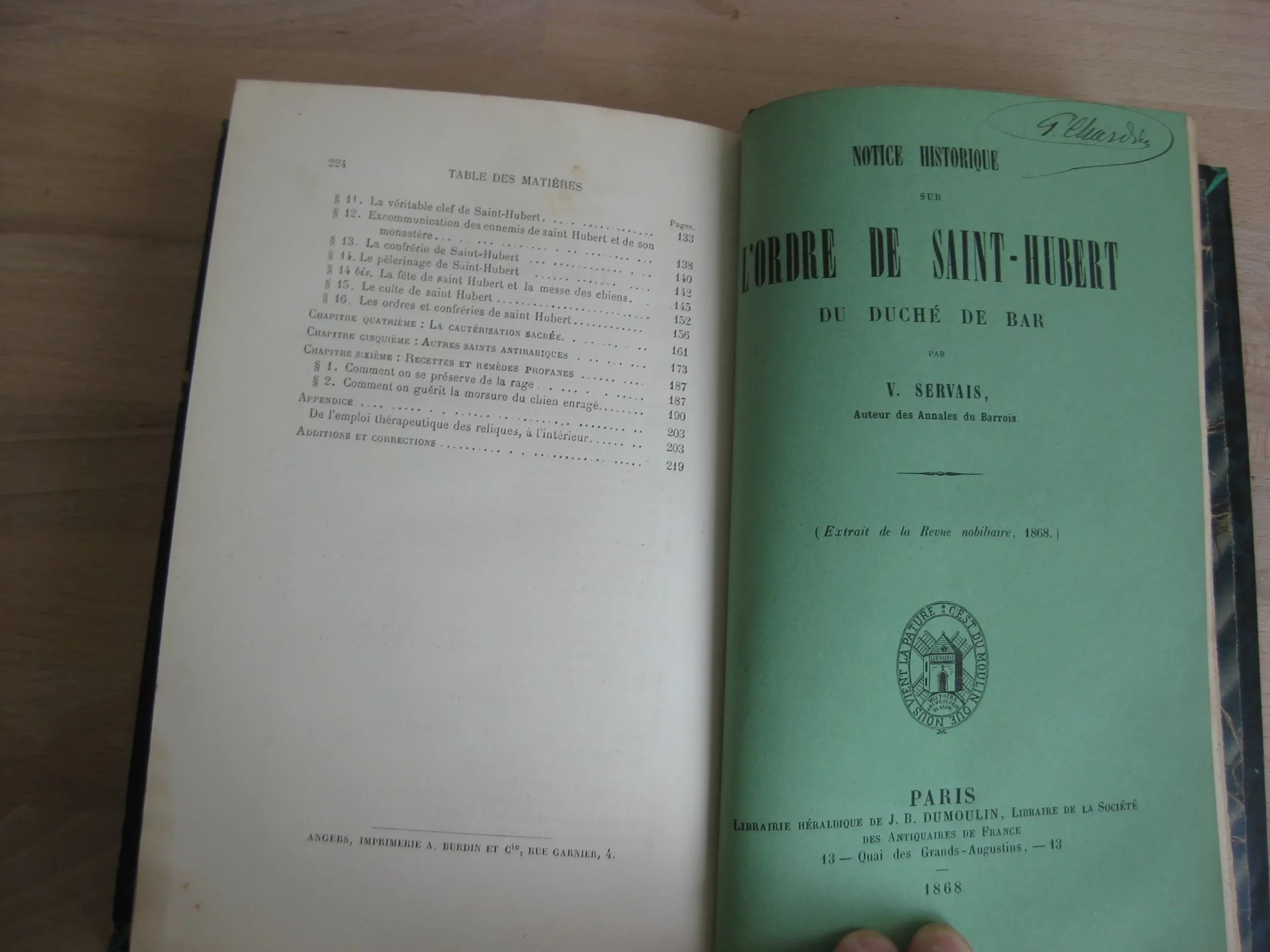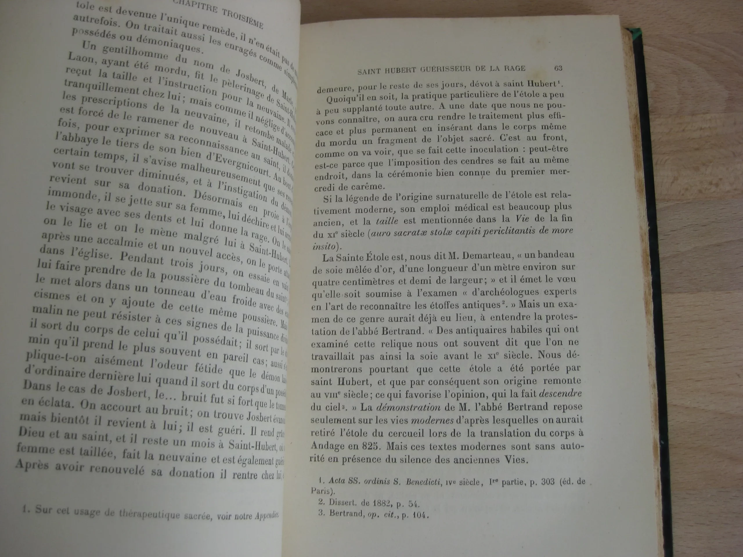 Demi-basane verte, dos long, orné du titre et de liserés, et aux chiffres en pied (non identifié, 2 C dos à dos sous 2 P dos à dos), couvertures conservées, 227 x 144, 224p. Avec table. 1887. Collection Bibliotheca Mythica n°1. Edition originale.  Relié à la suite : Notice historique sur l’Ordre de Saint-Hubert du duché de Bar, par V. Servais, 12p. 1868. (Extrait de la Revue nobiliaire, 1868). Ex-libris manuscrit identique en faux-titre du premier texte et au titre du second. Intérieur propre, rousseurs sur les tranches. Plats très frottés, notamment plat supérieur avec carton apparent. Griffes frottements, épidermures à la reliure, mais globalement bonne ; pied de mors inférieur ouvert. Bon exemplaire bien ferme.