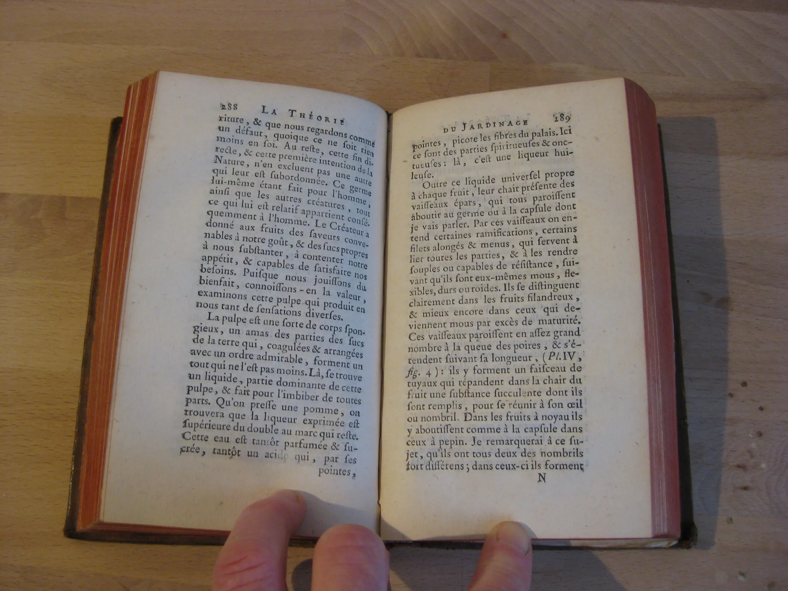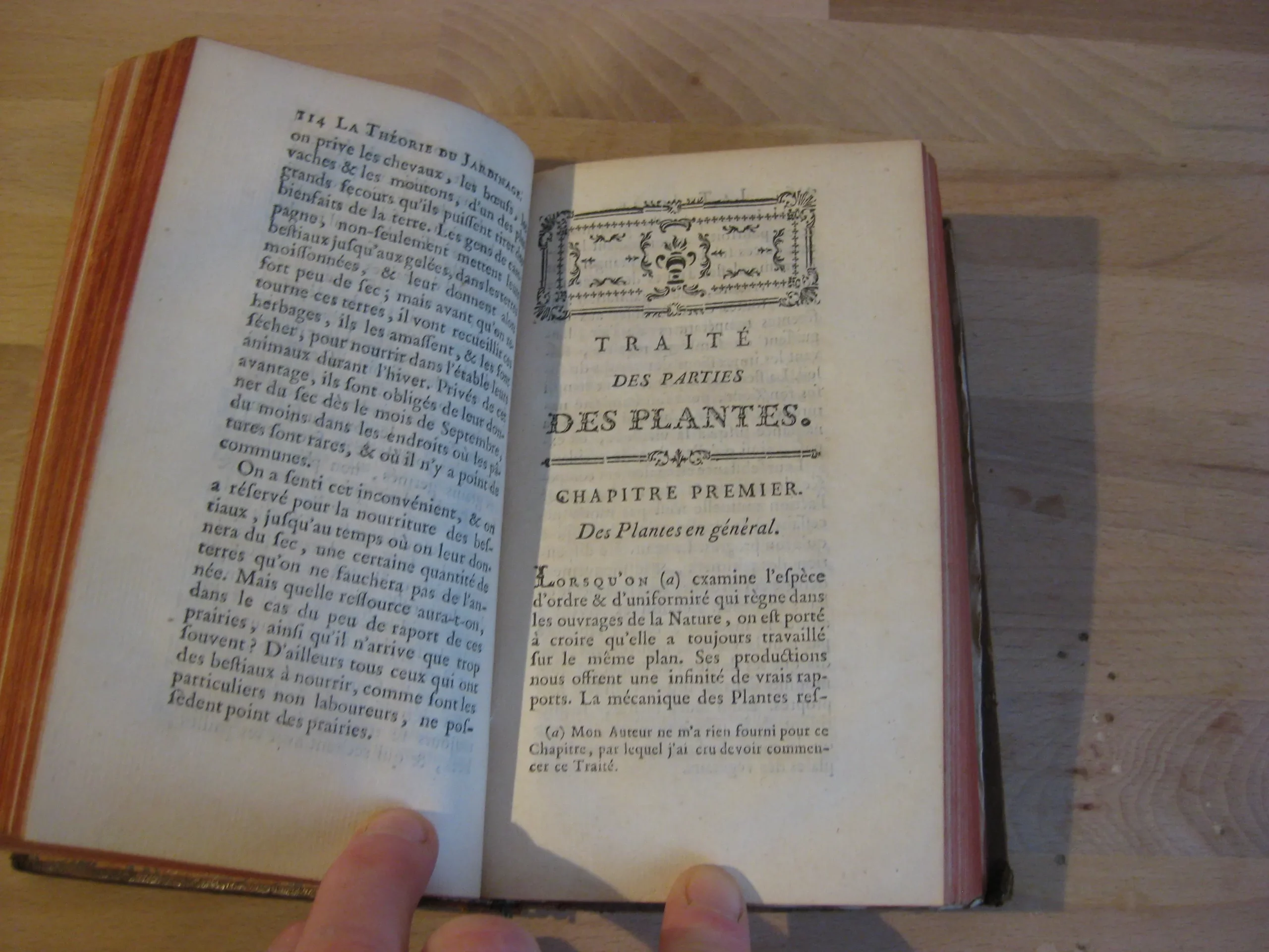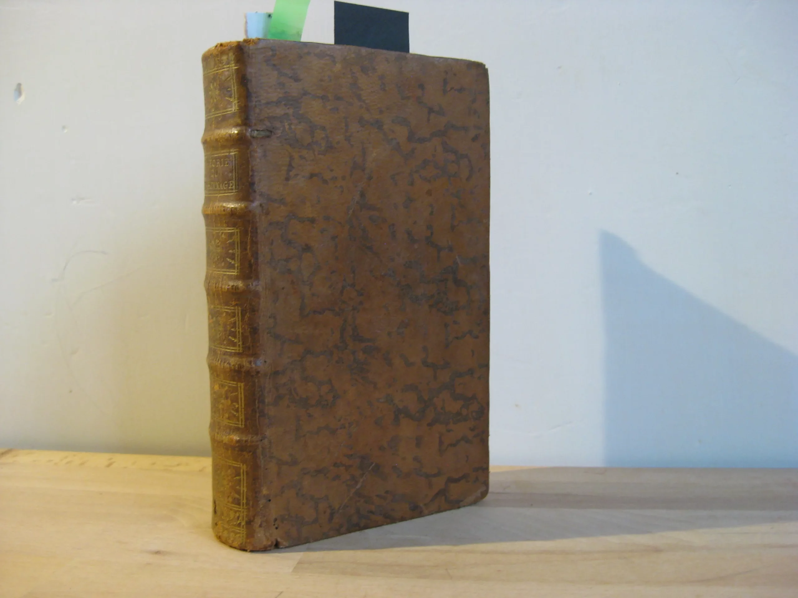 Plein veau veiné, dos à cinq nerfs, orné du titre et fleuronné aux caissons, tranches rouges, 170 x 104, 558p. 1785. Nouvelle édition revue, corrigée et ornée de figures en taille douce. Frontispice de J. Robert, gravé par Vincenzio Vangelisty. Avant la lettre : Adresse à l’Abbé Terray ; Précis de la vie et des occupations de Mr. L’abbé Roger Schabol, paginé iv-xij ; Préface du rédacteur, pp.xiv-xlj ; Table des traités et chapitres, 3p. In fine : Approbation et Privilège ; Errata. Et 82 figures dessinés et gravées par J. Robert, sur 5 planches dépliantes (intègres). Bien complet. Intérieur très bon, frais, rousseurs marginales. Coins et champs frottés, 3 coins légèrement émoussés. Plats frottés avec épidemrures, essentiellement en plat inférieur. Dos frotté, épidermures en queue, coiffe en partie arasée, deux travaux de vers en pied de dos. Bon exemplaire.