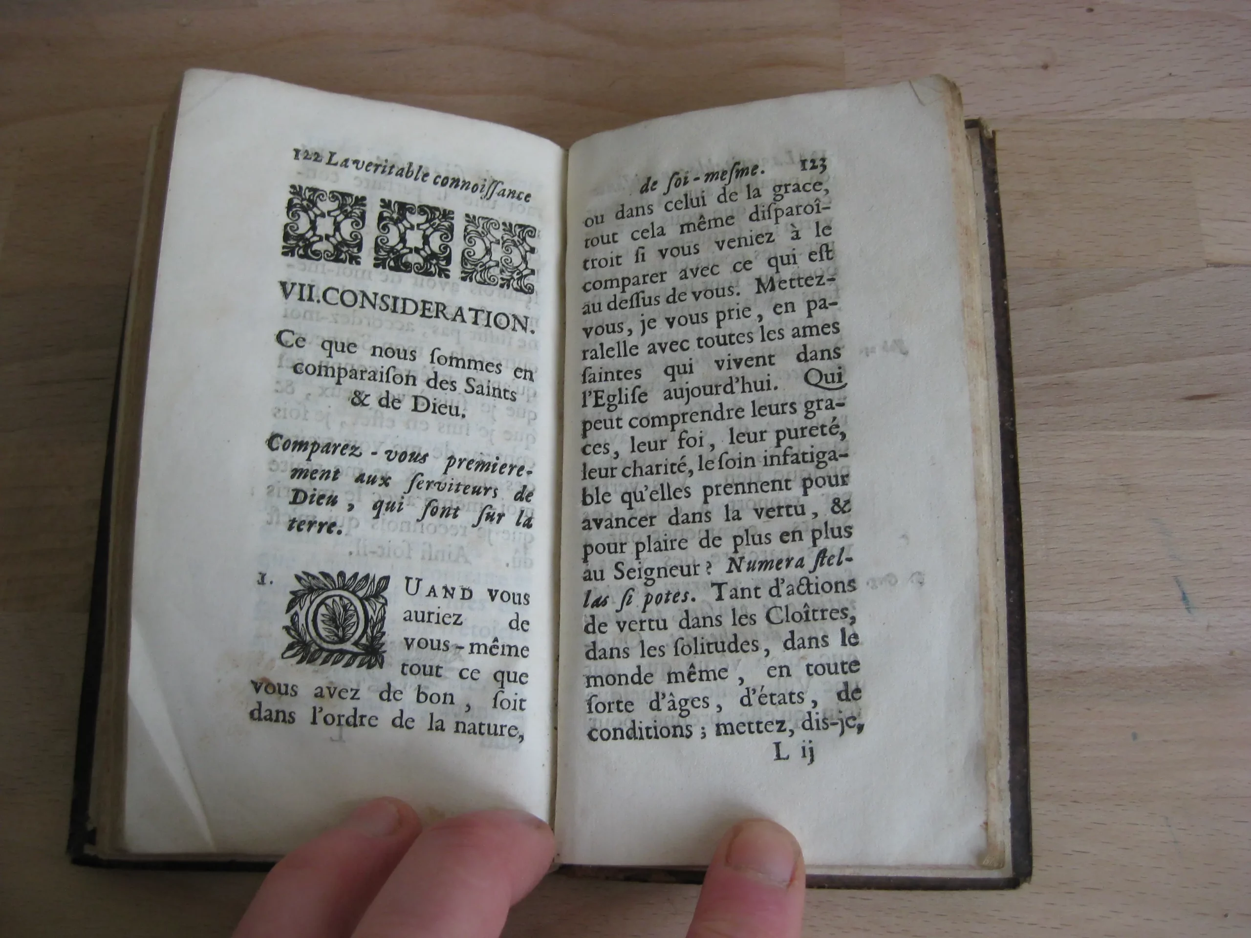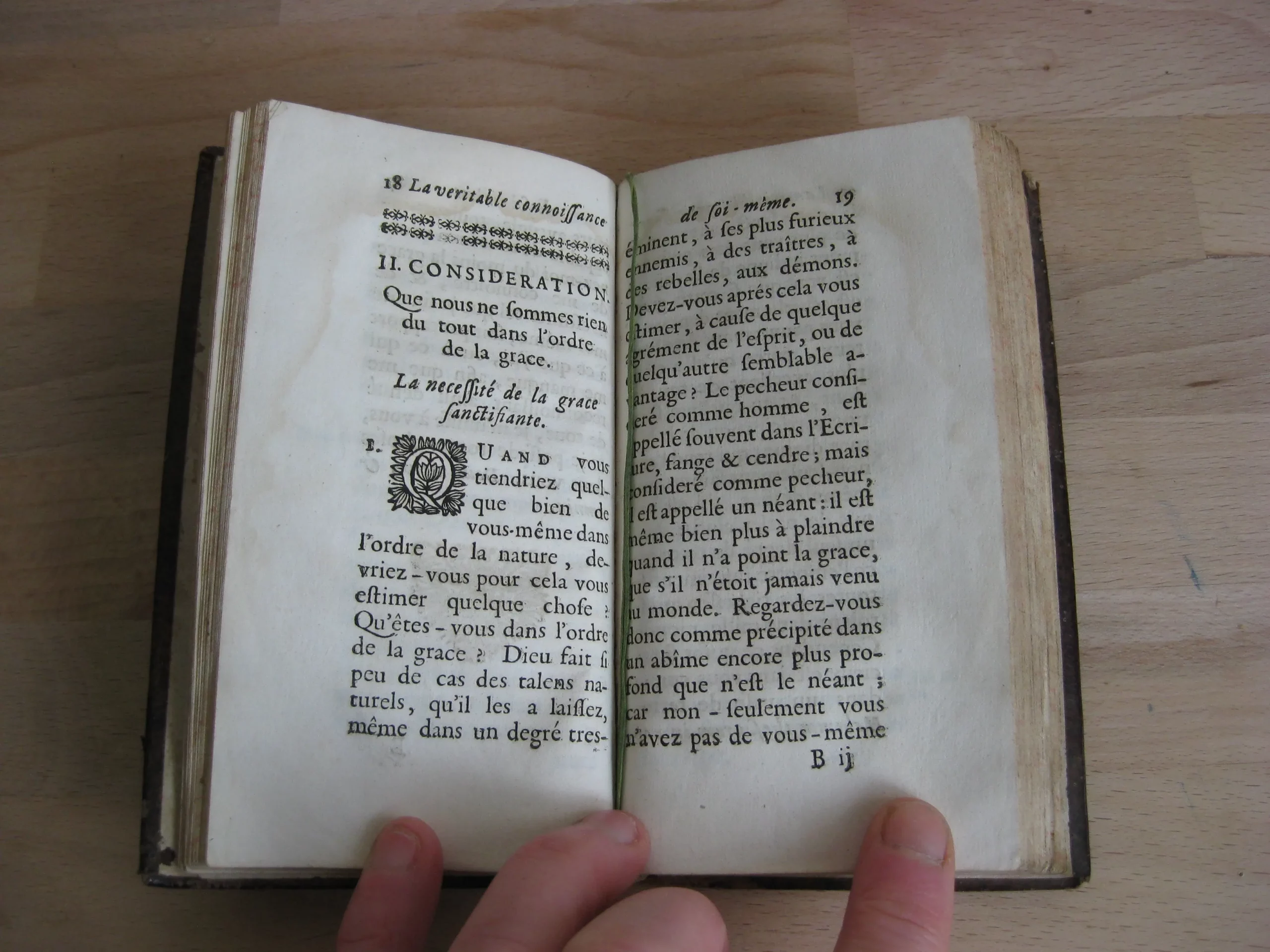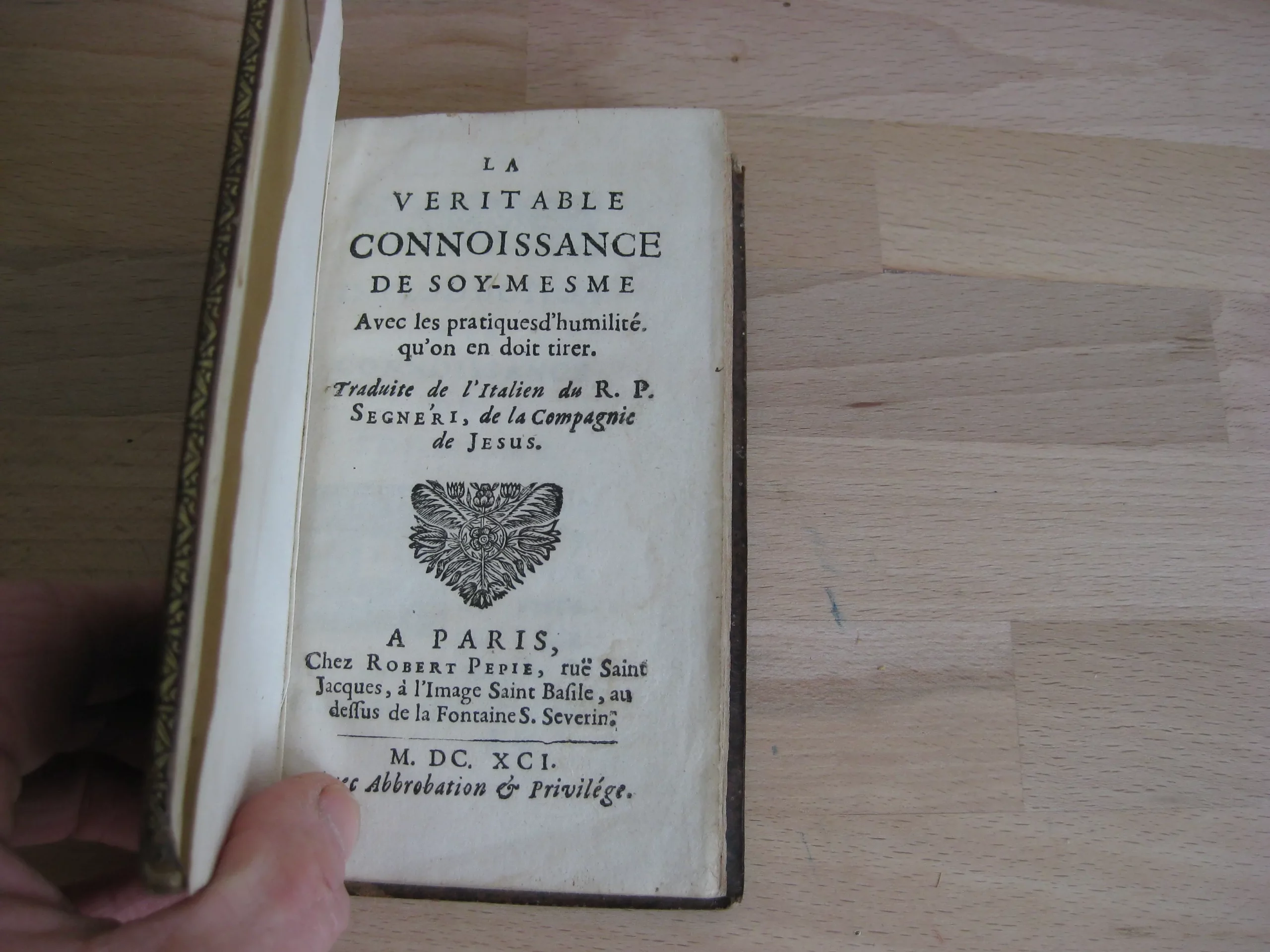 Pleine basane marbrée, dos à nerfs, orné de fleurons et liserés aux caissons et d’une pièce de titre en maroquin, tranches jaspées rouges, champs ornés, signet vert, 150 x 88, 142p. 1691. Avec sa table. Rare première édition française. Comprend : Introduction ; Table et privilège, 34p. Puis le texte : pp. 3-141. Lettrines, cul-de-lampe, entêtes à guirlande. Intérieur trè bon, avec quelques traces de légères mouillures en marge en début et fin de volume. Champs et coins frottés. Plats bons avec quelques  épidermures. Mors frottés, mors inférieur plus fortement. Dos frotté avec épidermures en coiffe, queue et nerf ; et petits manques en pièce de titre. Prêtre jésuite, italien, prédicateur et missionnaire, Paulus Segneri est un écrivain ascétique dont les travaux selon brunet, sont très estimés en Italie et ont été fréquemment réédités.