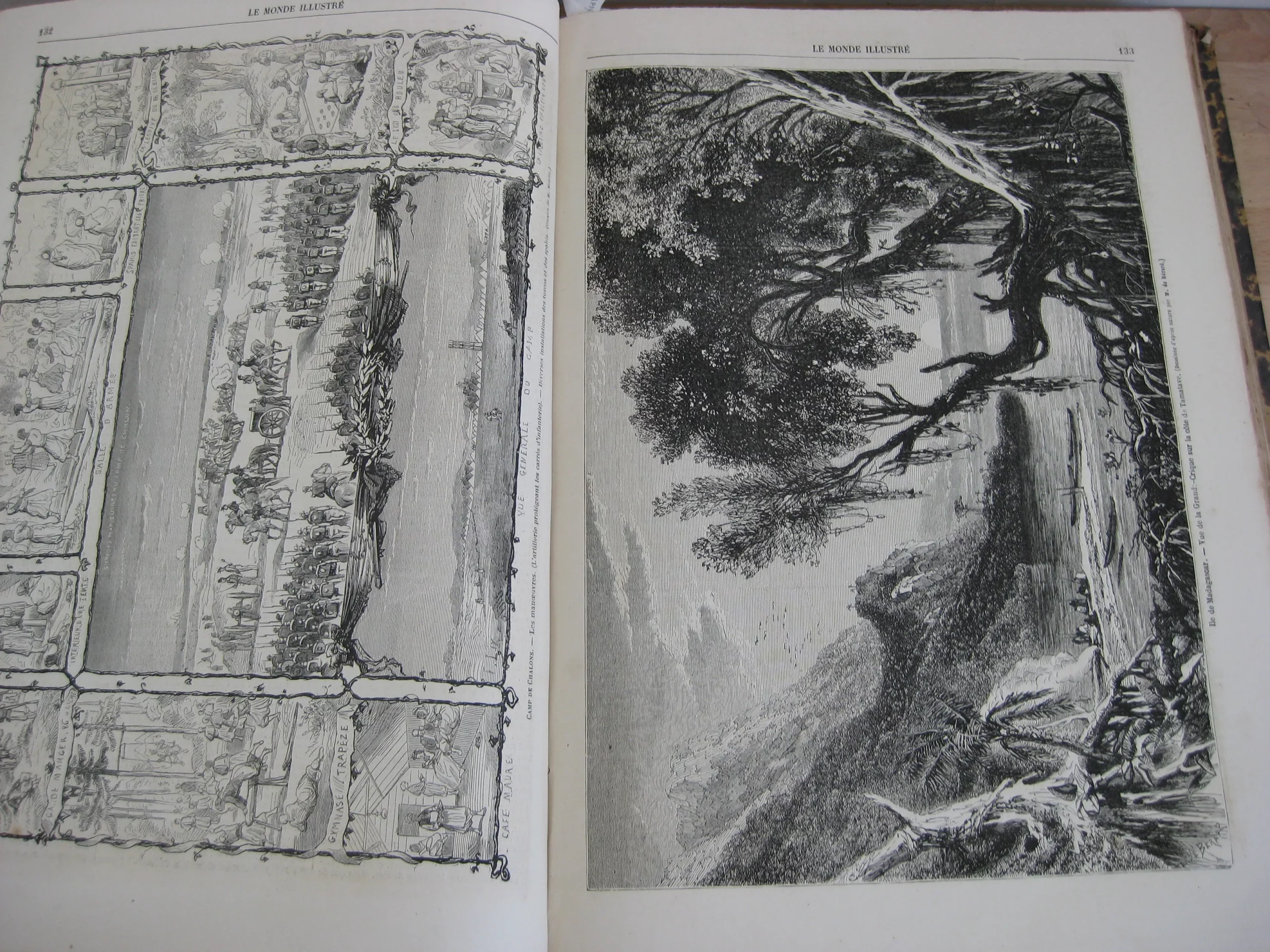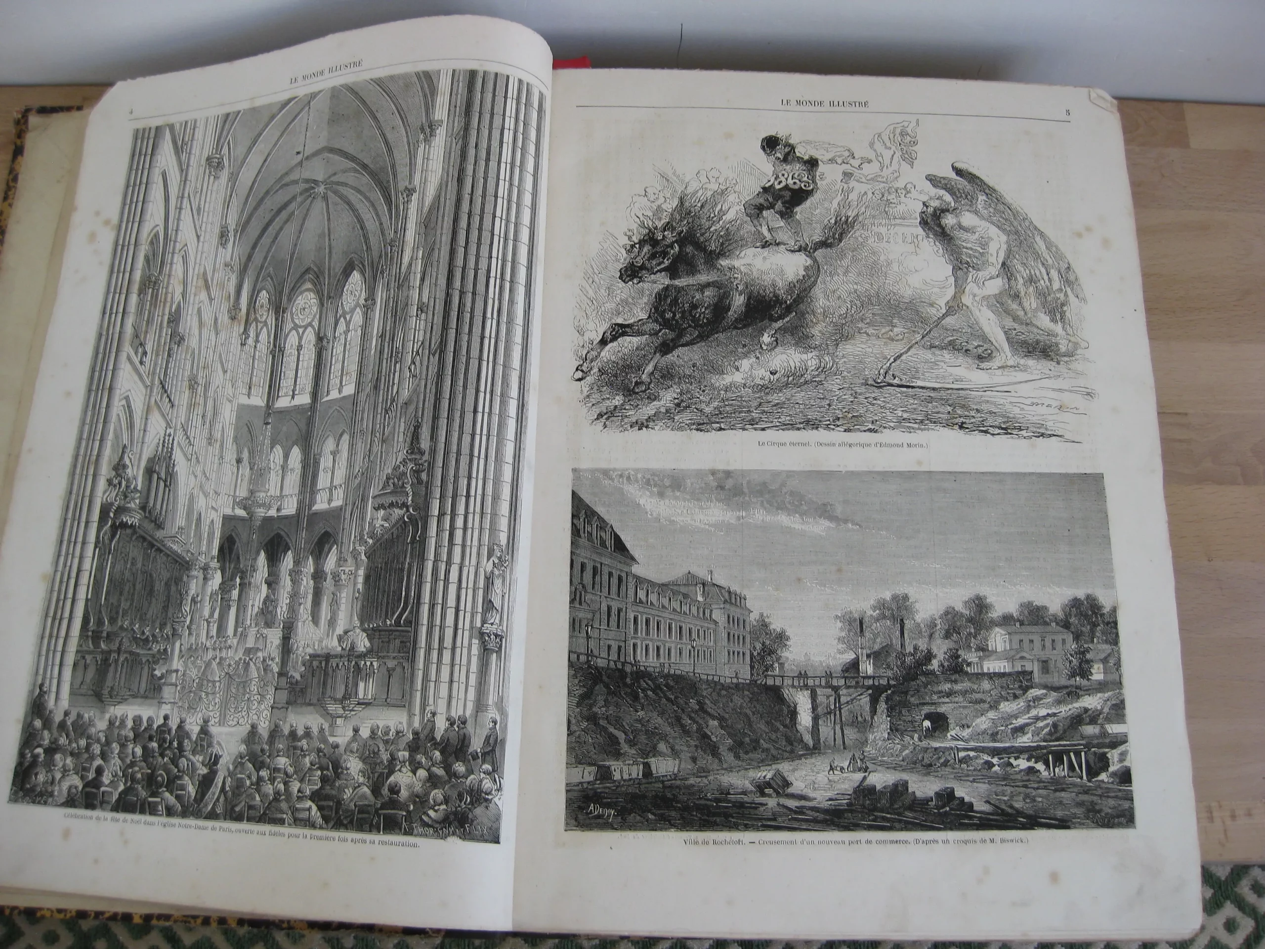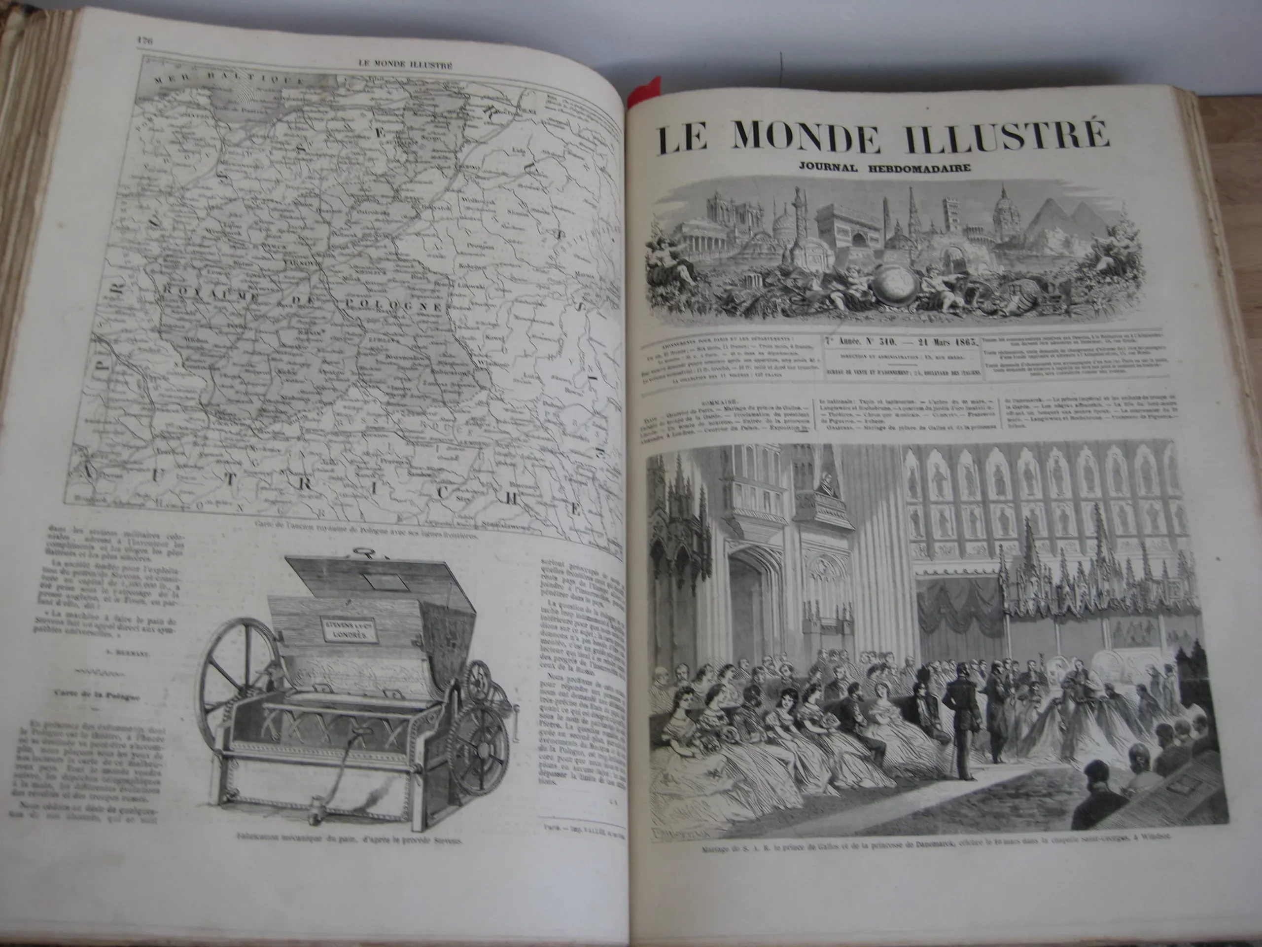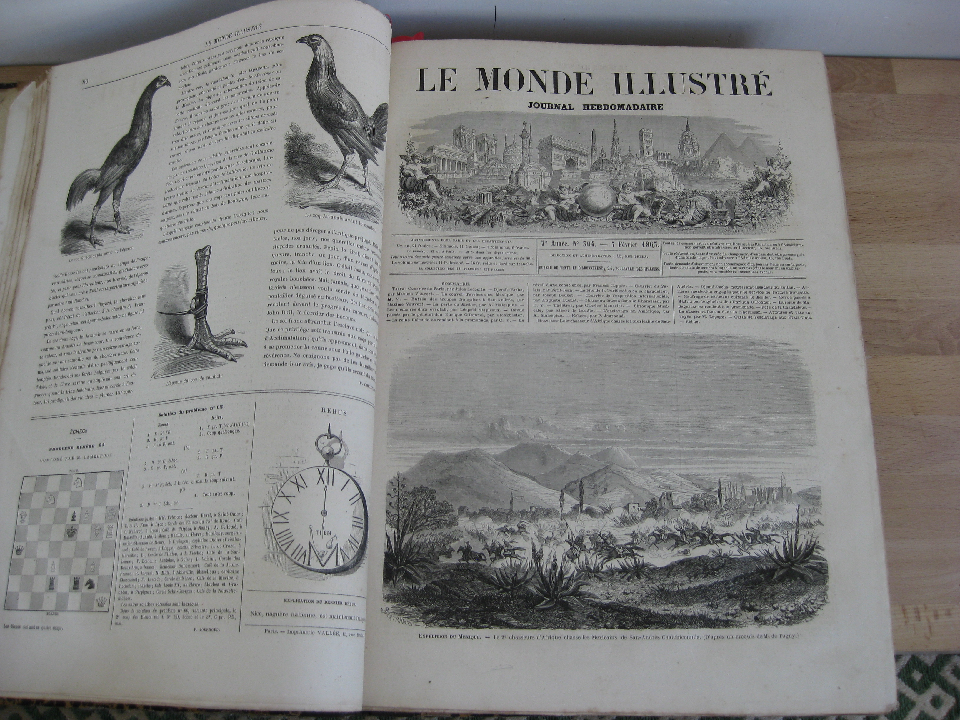 Demi-toilé à dos long orné d’une pièce de titre rouge, 393 x 265, 415p. Complet des numéros de 1865, 7ème année, du n°299 du 03/01 au 350 du 26/12. Avec nombreuses gravures dont 2 cartes et 1 gravure de Doré., Rousseurs intérieures, une page déchirée sans manque, reliure en bon état. Egalement en stock, dans la même reliure : les années 1857, 1858, 1859, 1860, 1861, 1862, 1864, 1865, 1866 et 1867.