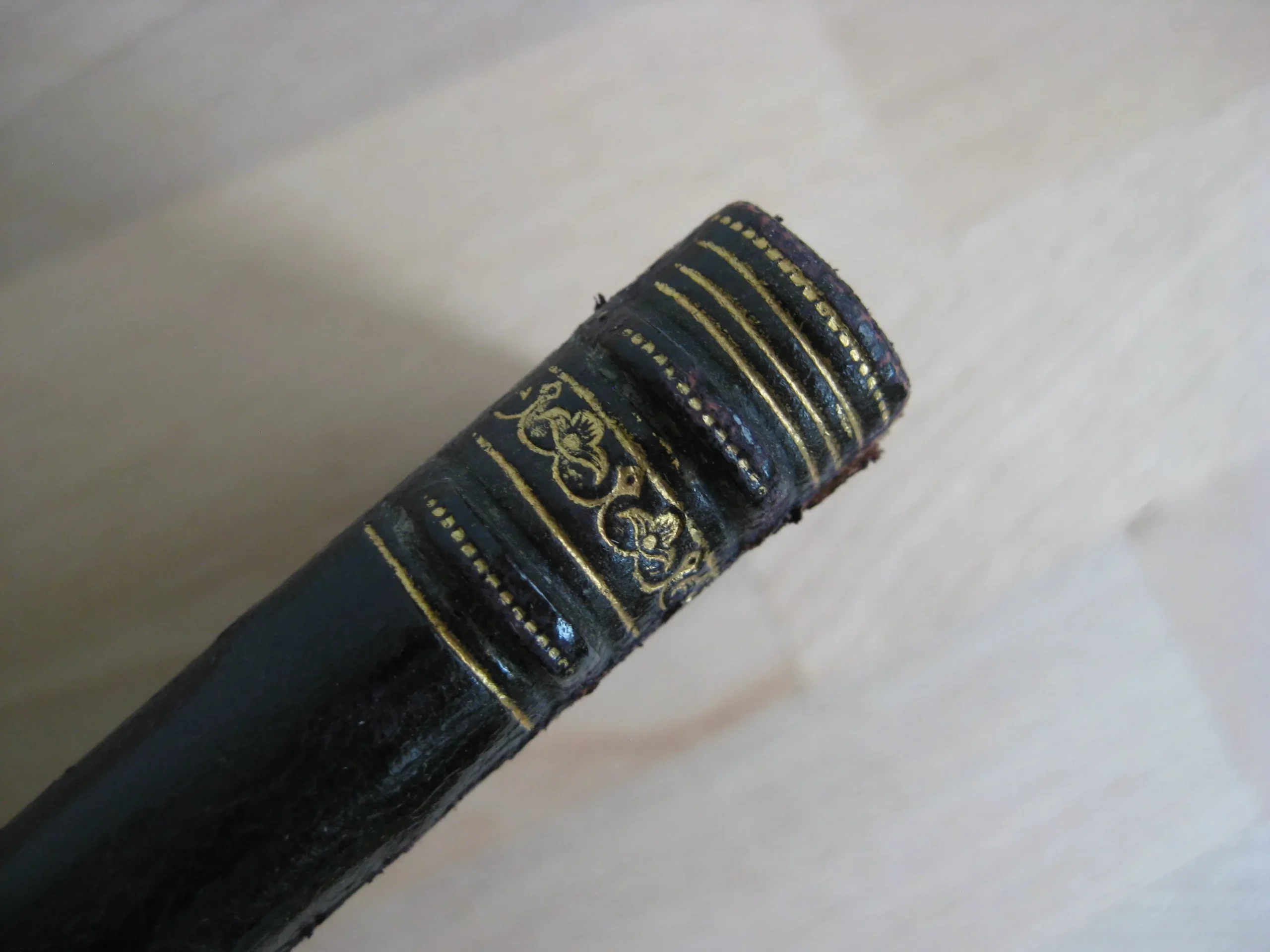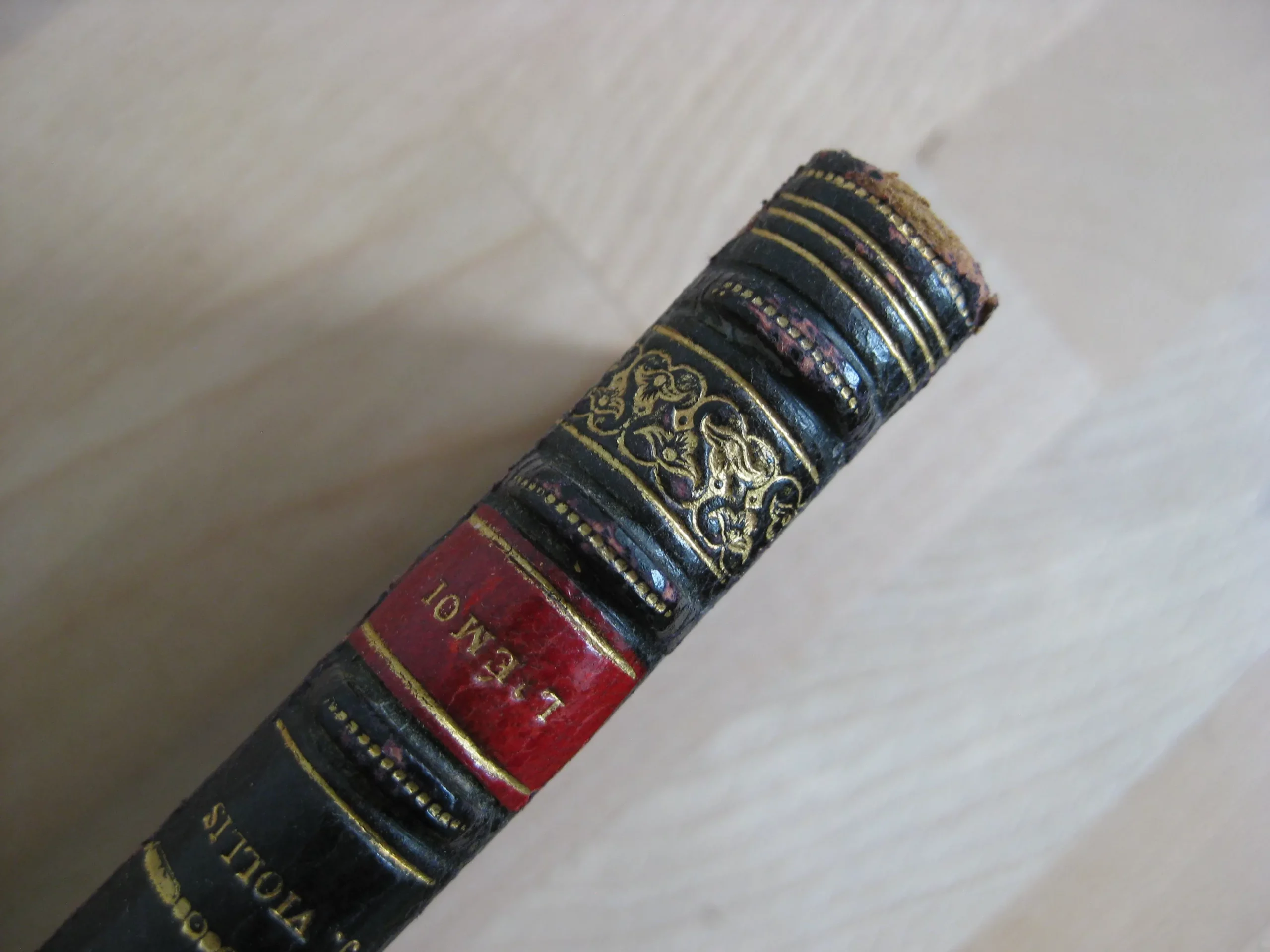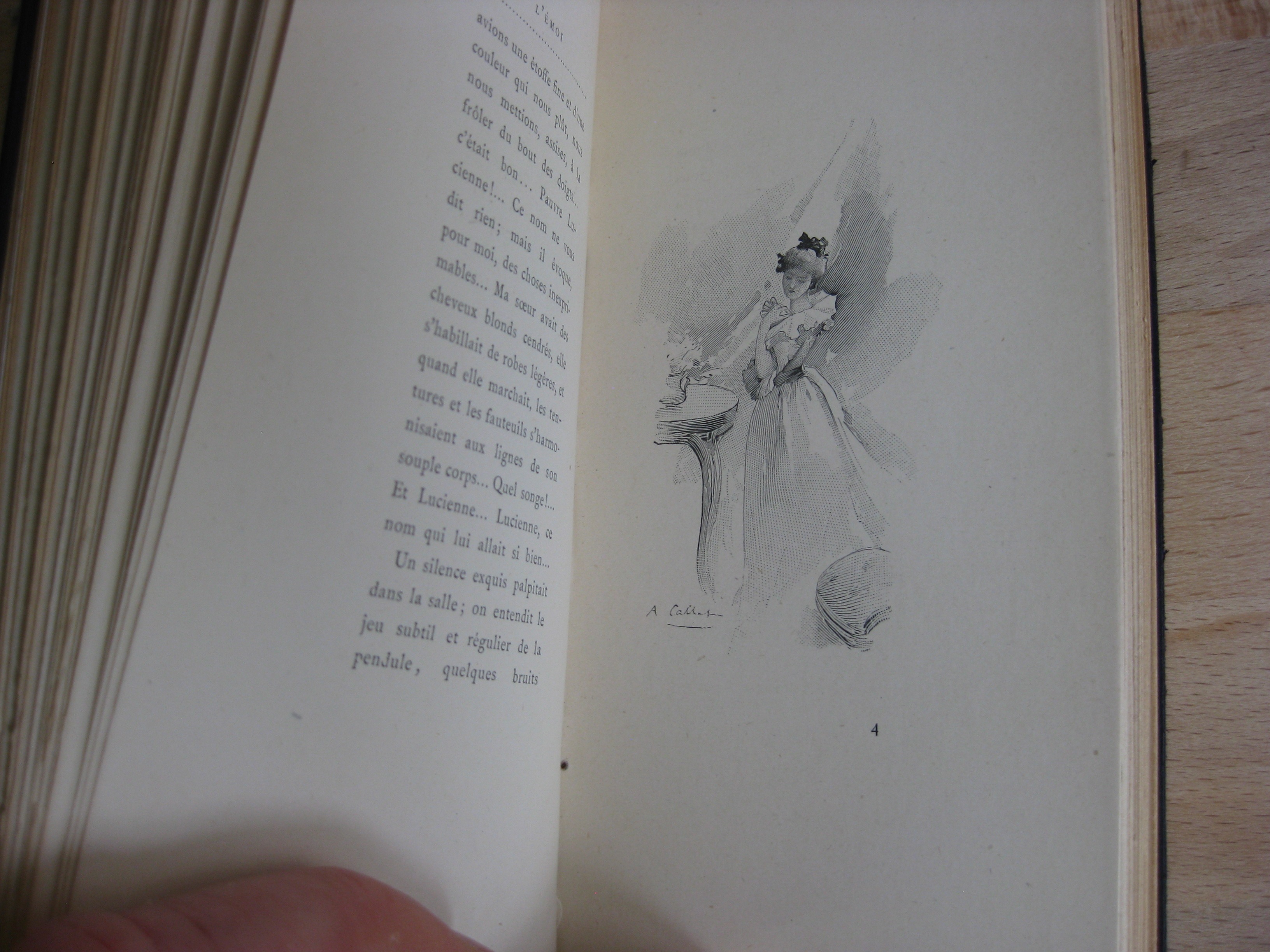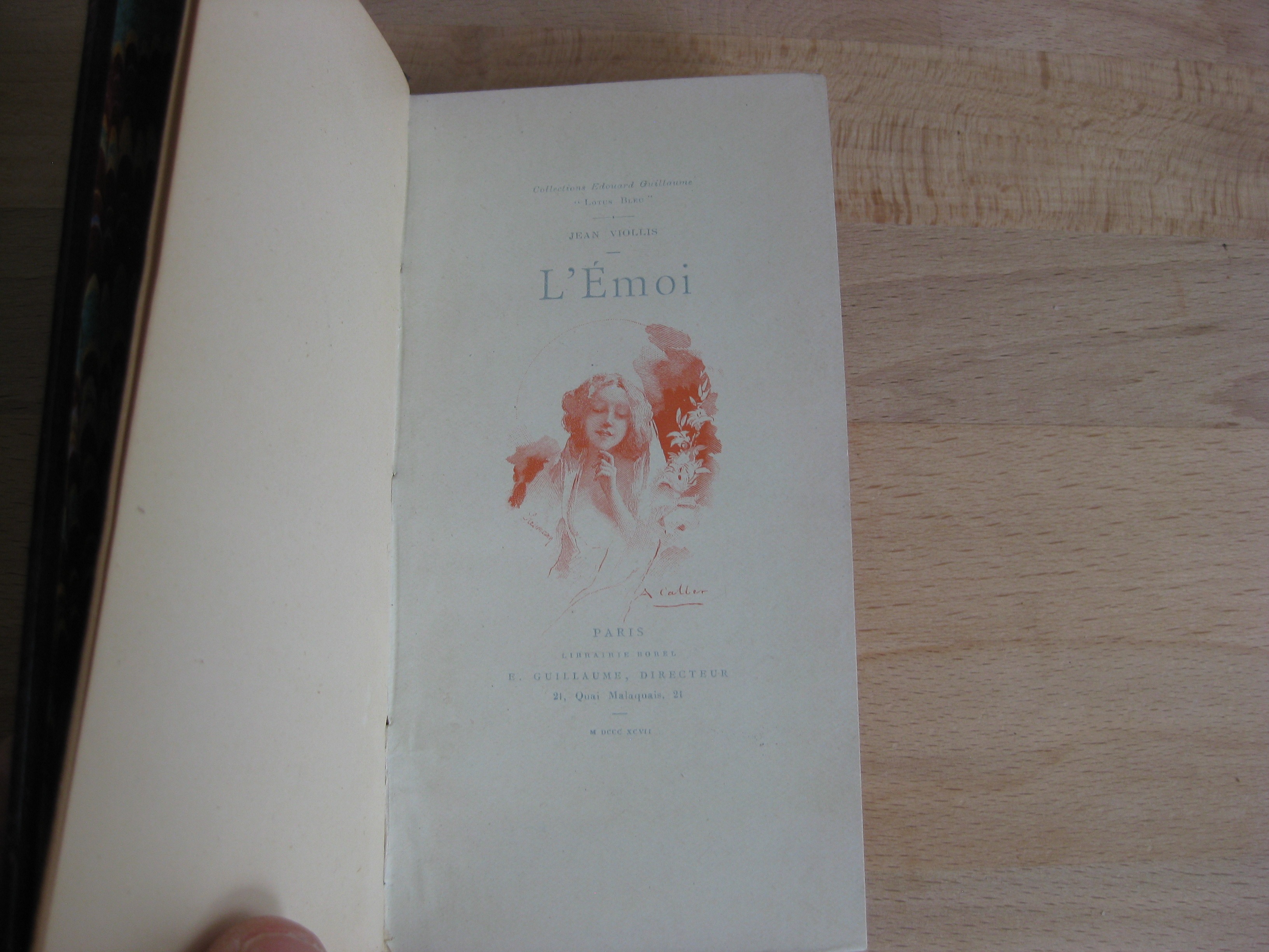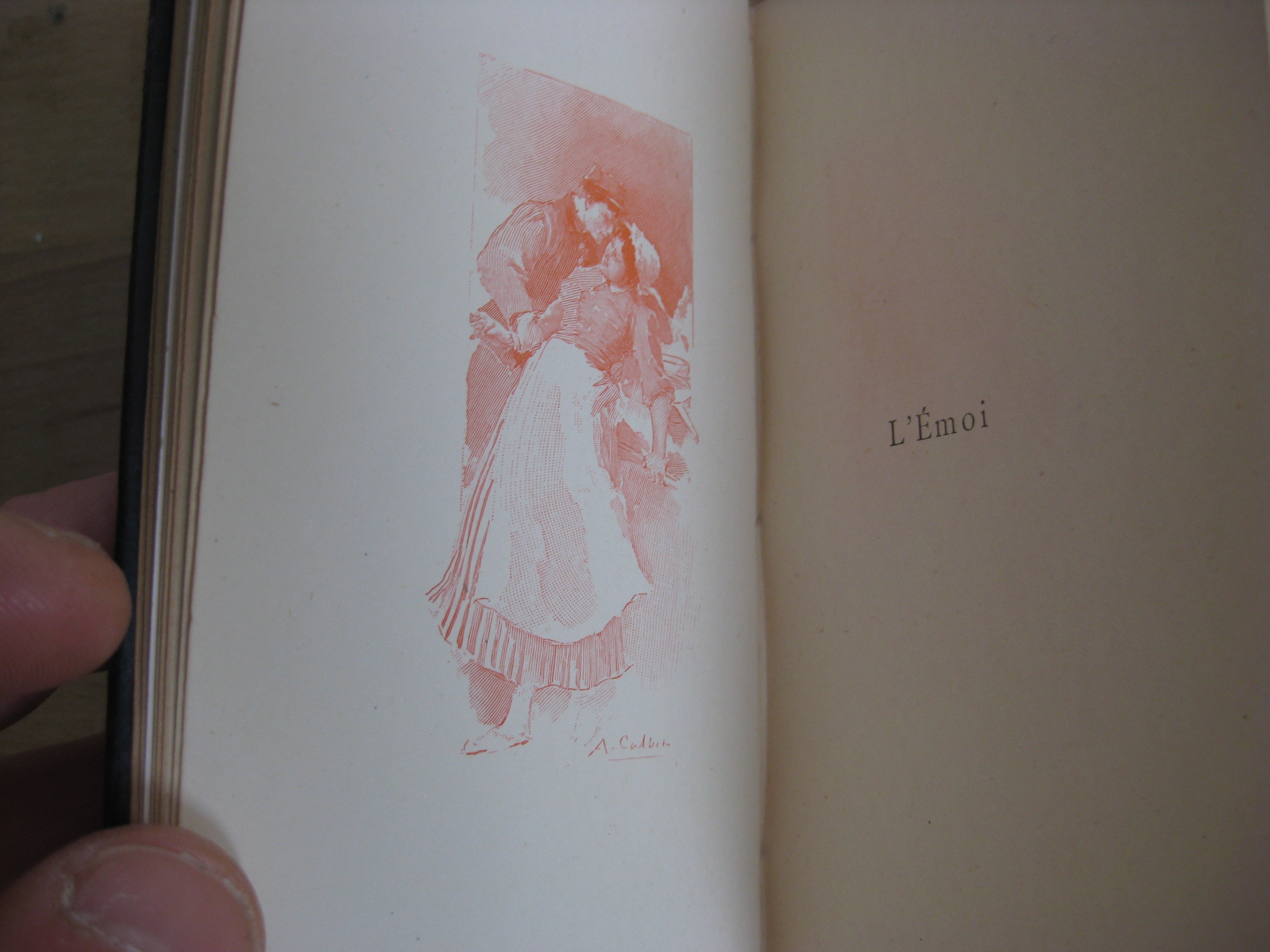 Librairie Borel – Pleine basane marine à dos romantique orné de 5 faux-nerfs, de liserés, frises et pièce de titre rouge, et de l’auteur estampé doré, tranche de tête dorée, couverture couleur conservée, signet rouge, 140 x 77, 80p. 1897. Collection Edouard Guillaume « Lotus Alba ». Illustrations de Calbet. Page de titre illustrée. Avant la lettre : 4 sanguines pleine page en guide de suite des ill. noires à pleine page ; frontispice et illustrations à pleine page et en entête. In fine : extrait du catalogue. Intérieur très bon, propre et intègre. Des frottements et épidermures à la reliure, queue très frottée. . Bel exemplaire bien ferme.