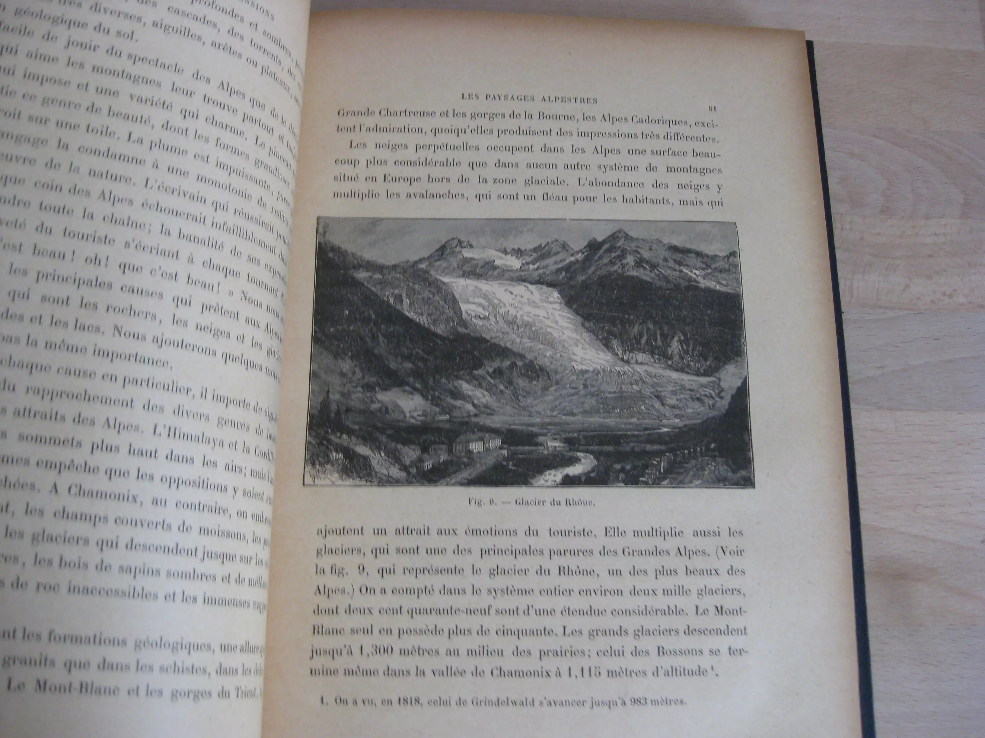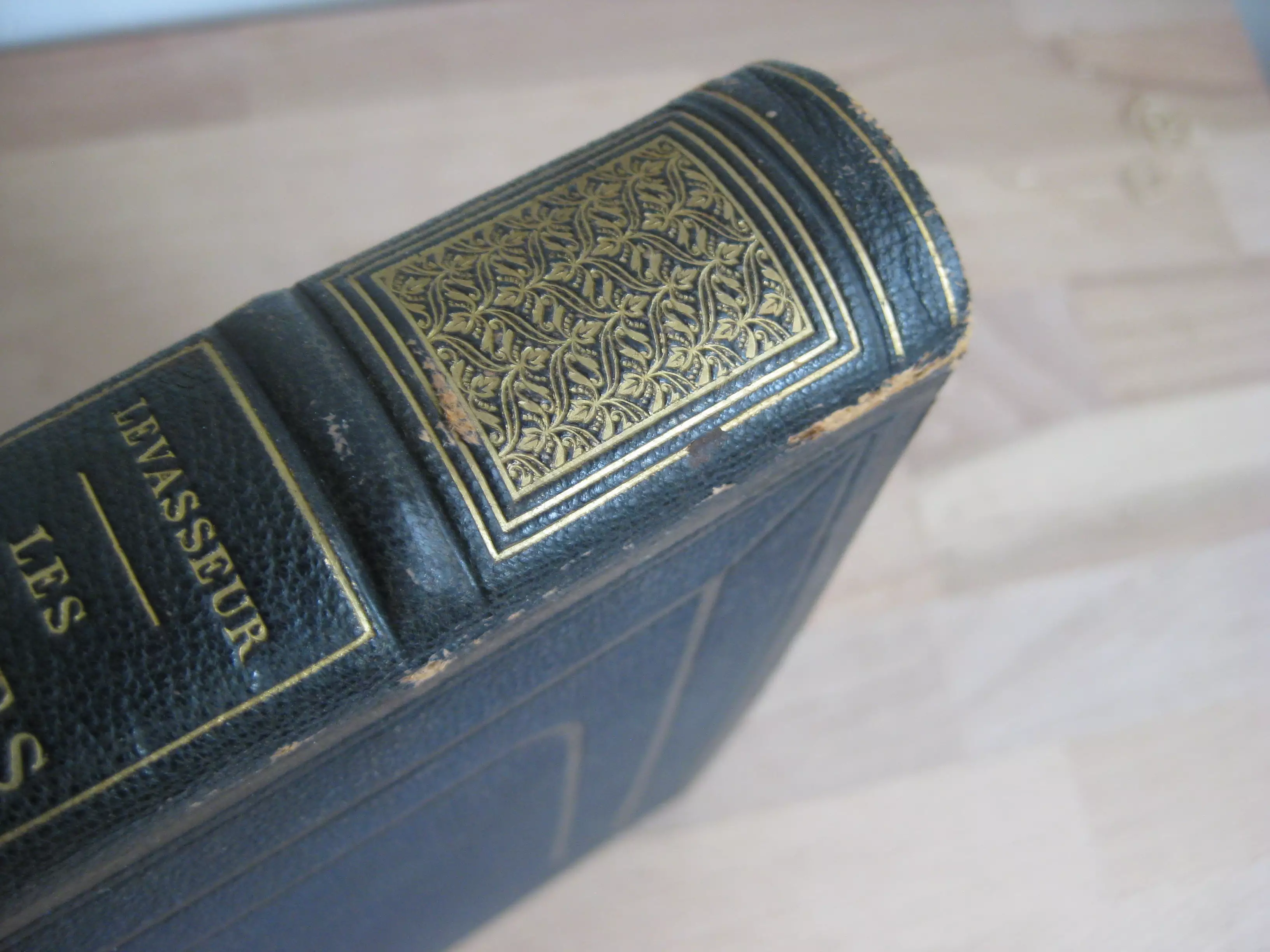DescriptionLibrairie Ch. Delagrave – Plein chagrin noir, dos à faux-nerfs orné aux caissons et des titre et auteur, plats estampés d’un triple encadrement et plat supérieur aux armes de Paris filigrané, 285 x 202, 392p. Avec table. 1890. Deuxième édition. Exemplaire « Prix municipal » avec l’étiquette volante « Ecoles communales de Paris – Ecole de garçons, rue de l’arbalète » in fine nominative « Ménard Louis », 1891. Nombreuses vignettes et cartes dans le texte. Intérieur insolé mais propre et intègre. Coins frottés. Mors frottés avec épidermures. Coiffe et queue frottés, avec épidermures, dos en bel état. Bel exemplaire bien ferme.