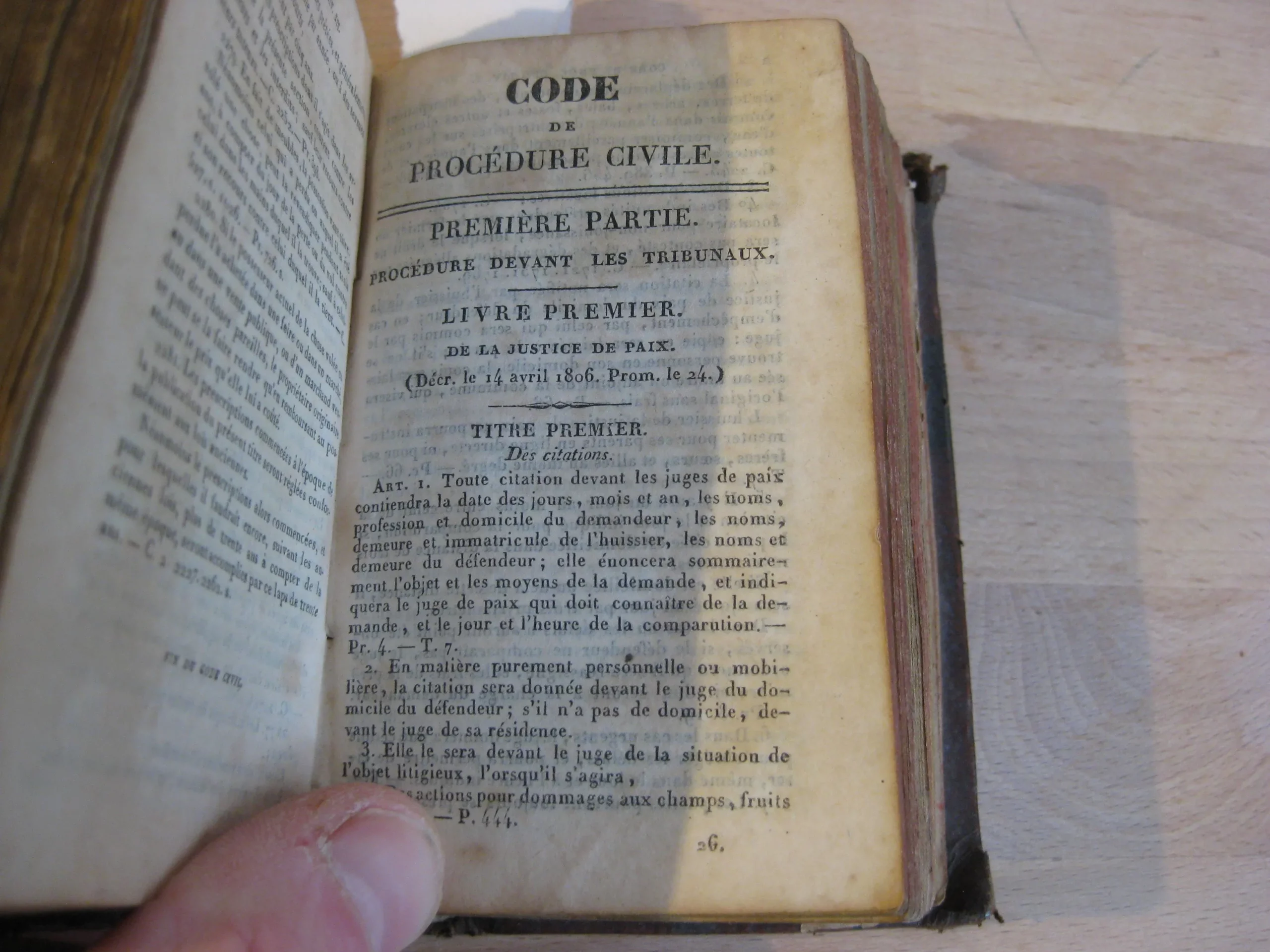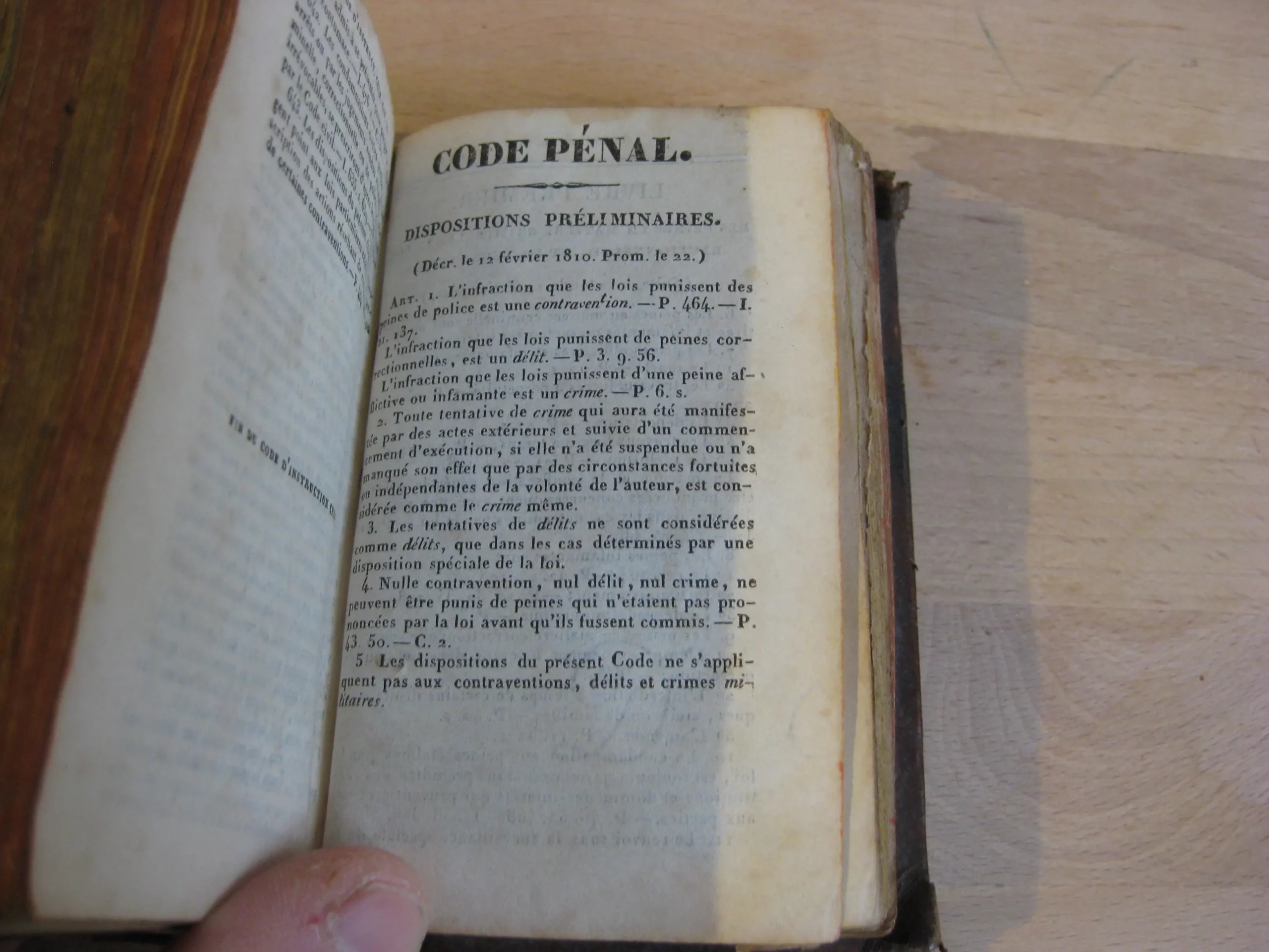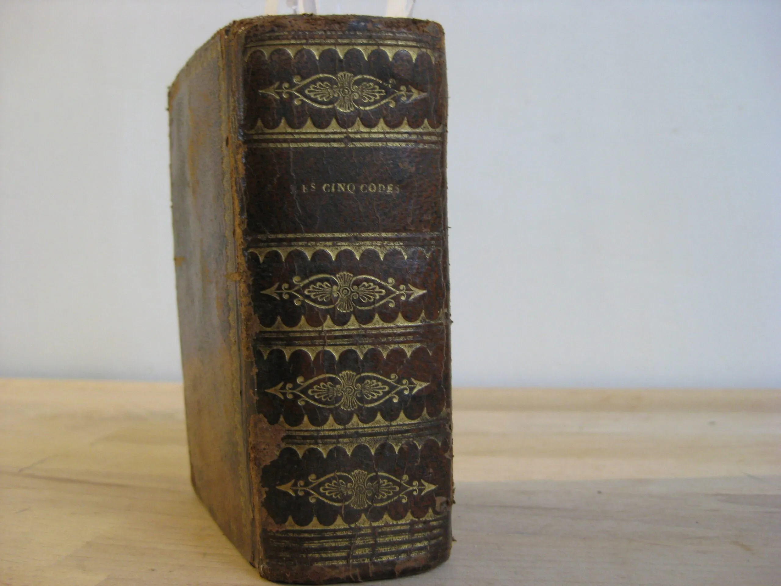 Plein veau marbré à dos long orné du titre et joliment décoré, plats ornés d’une frise, 105 x 66, 404p. 196p. 125p. 140p. et 113p. Suivis de : Appendice aux cinq codes, paginé 2-55 ; Table du : Code civil / Code de procédure civile / Code de commerce / Code pénal / Des frais et depens, 9p. In fine : Appendice ; Loi sur les délits de la presse, 1p. Avant la lettre : Table des frais et dépens pour le ressort de la Cour royale de Paris, paginé 2-63 ; Charte constitutionnelle du 04 juin 1814. ij-x (suivi de 1p. De notes). Sans date [ca 1822 date figurant sur une loi dans l’appendice aux cinq codes ; année correspondant à une édition]. Page de titre manquante. Intérieur insolé mais propre, rousseurs marginales. Coins et champs frottés, trois coins émoussés et un champ avec un petit manque. Plats frottés avec épidermures et petit manque en bordure de plat supérieur. Mors frottés avec épidermures, plus marquées en mors inférieur ; dos frotté mais bon, avec épidermures en coiffe et queue.